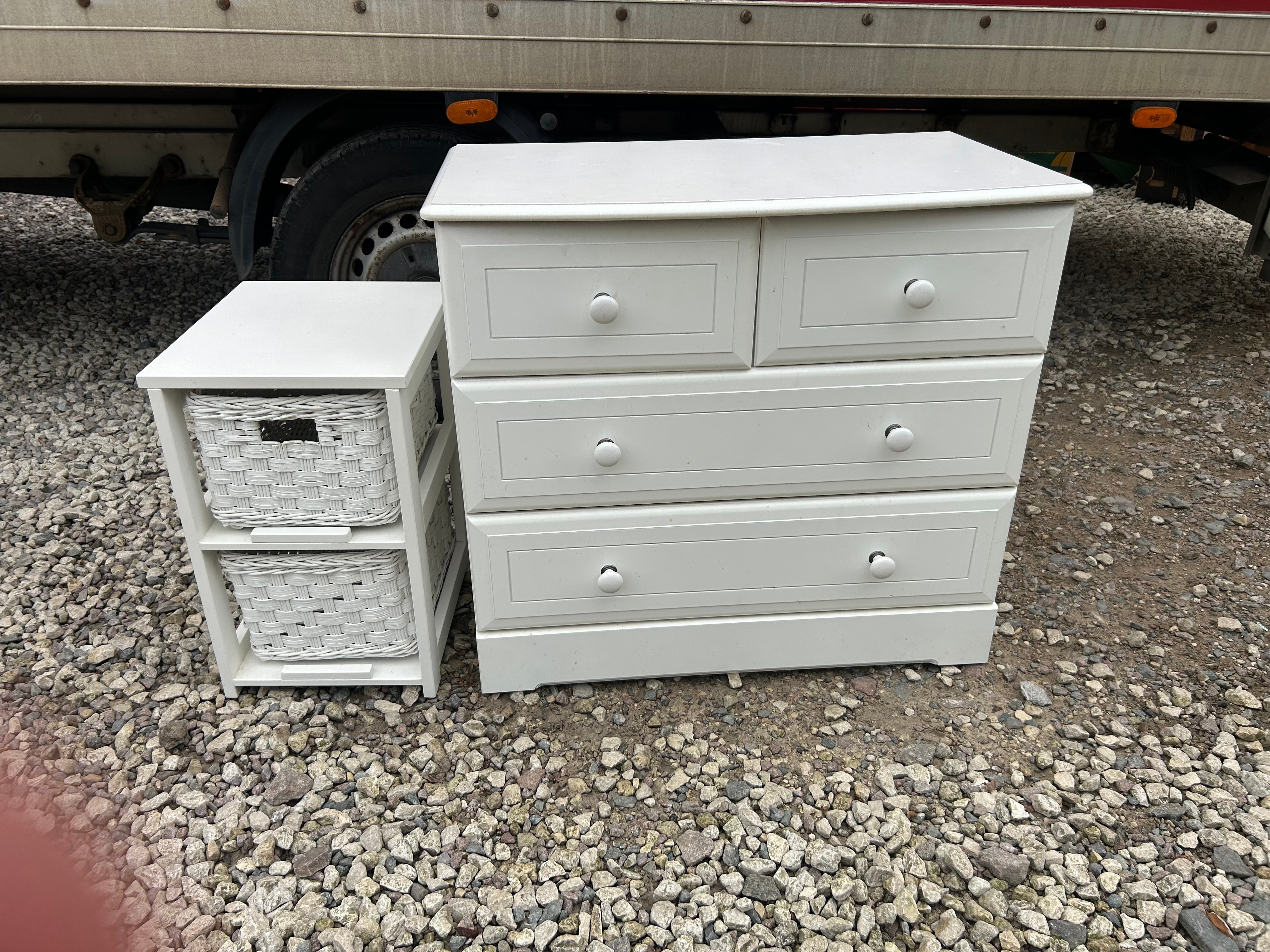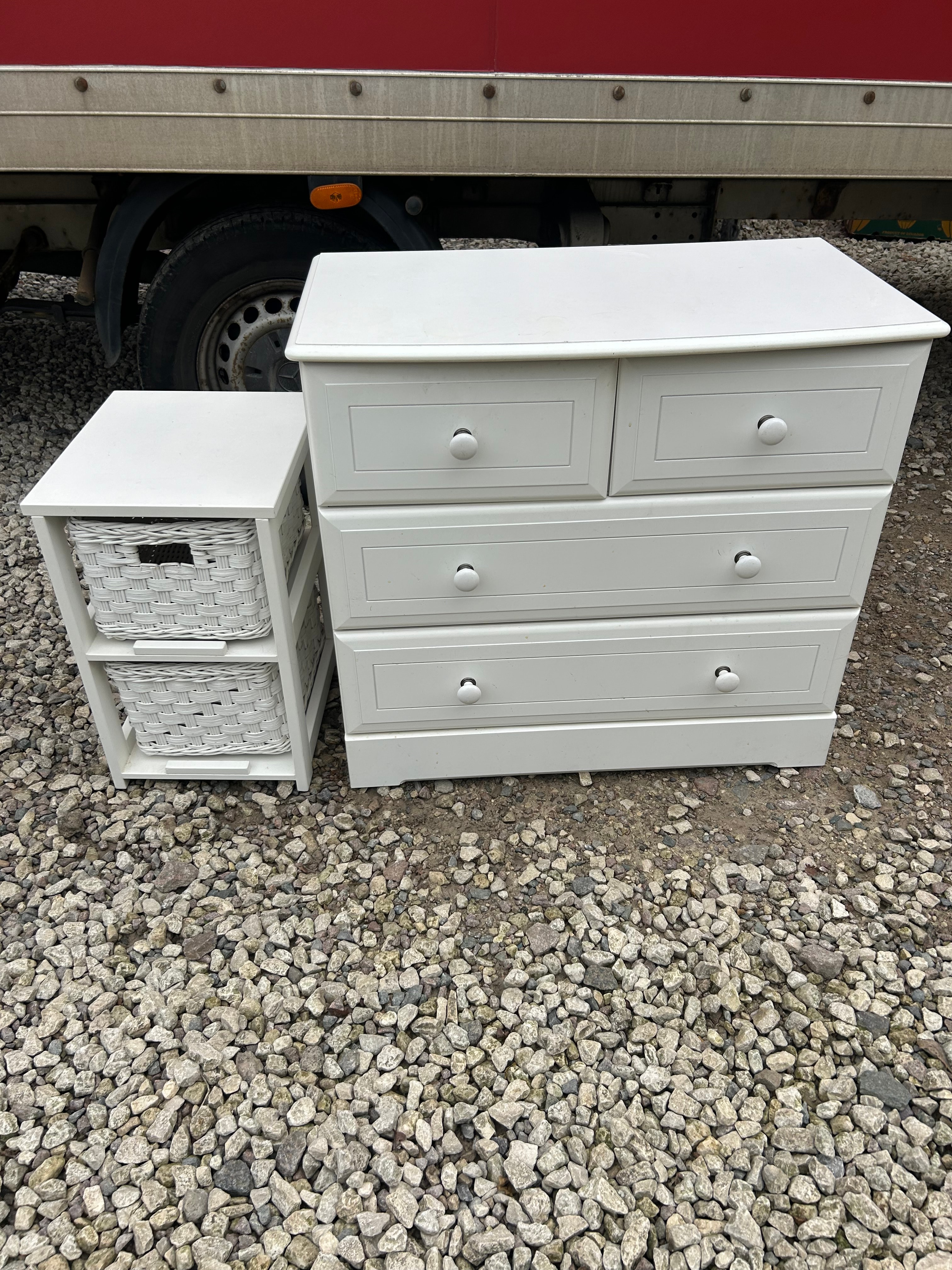 A pair of white painted furniture items, likely constructed from wood or a wood-composite material, in a modern, functional style. The larger item is a four-drawer chest, featuring two narrower drawers positioned above two wider, full-width drawers, all fitted with small circular white knobs. The accompanying smaller piece is a two-tier open storage unit, housing two white woven baskets, appearing to be wicker or a similar material, each fitted with a small dark handle. No visible text or manufacturer markings are discernible.