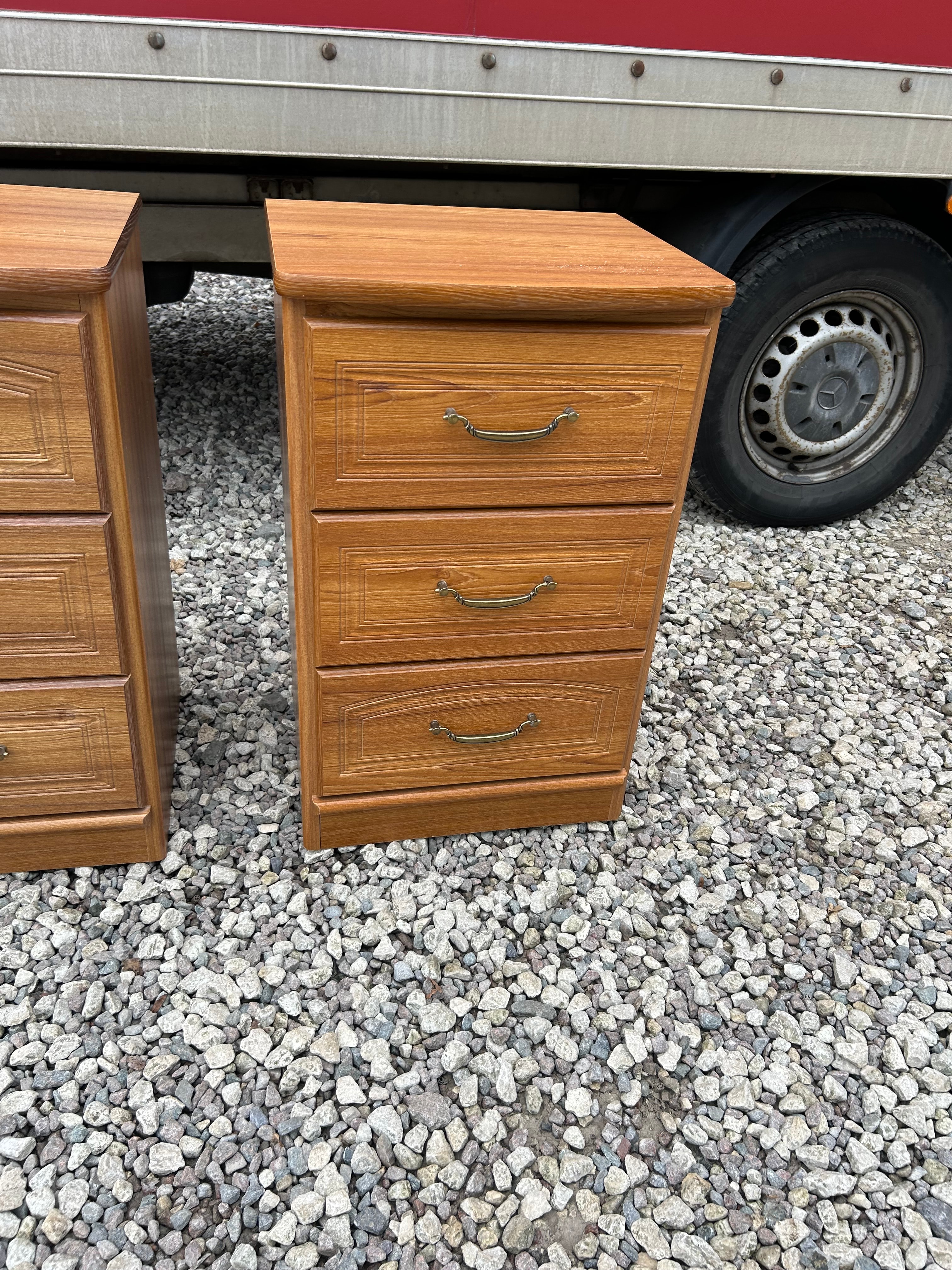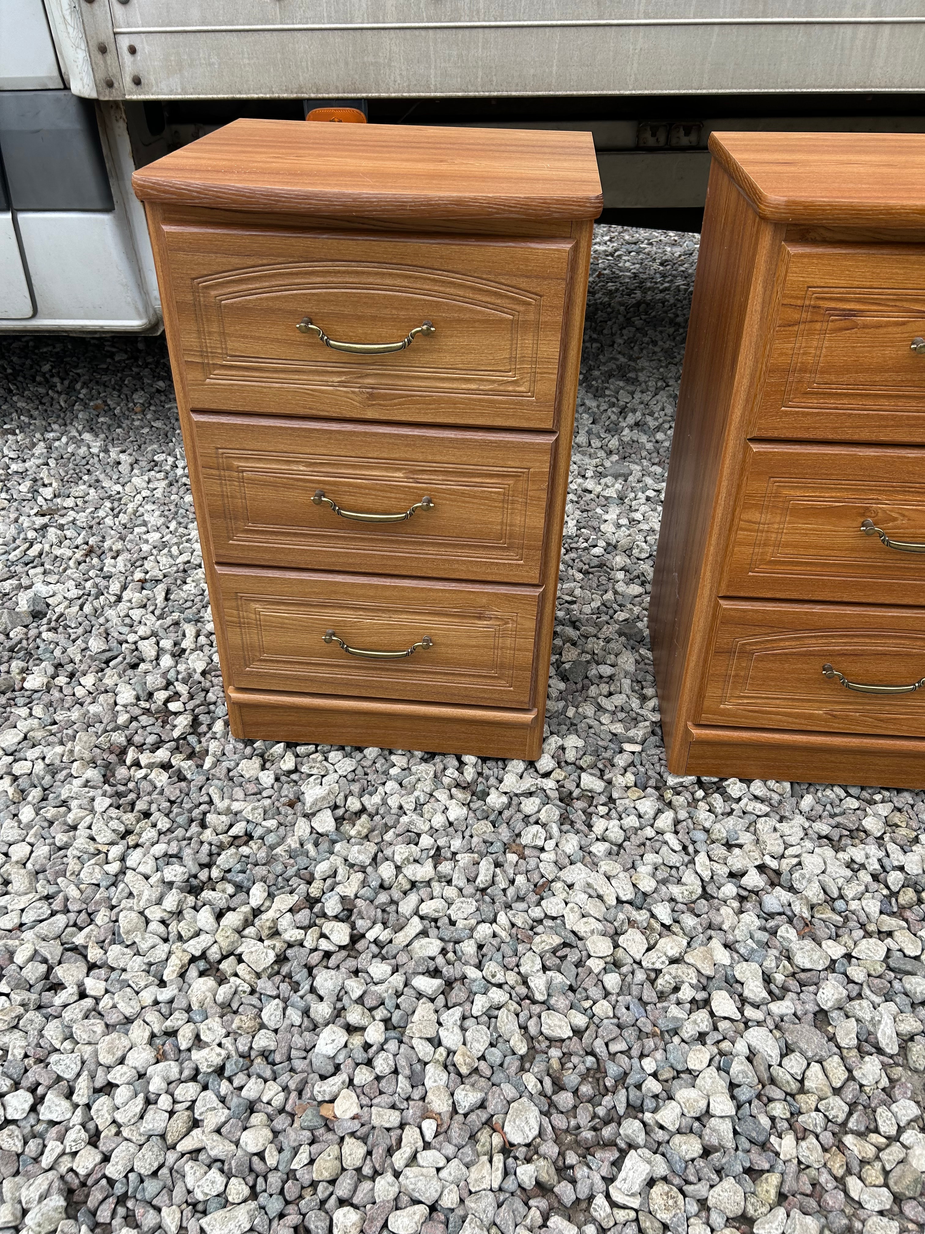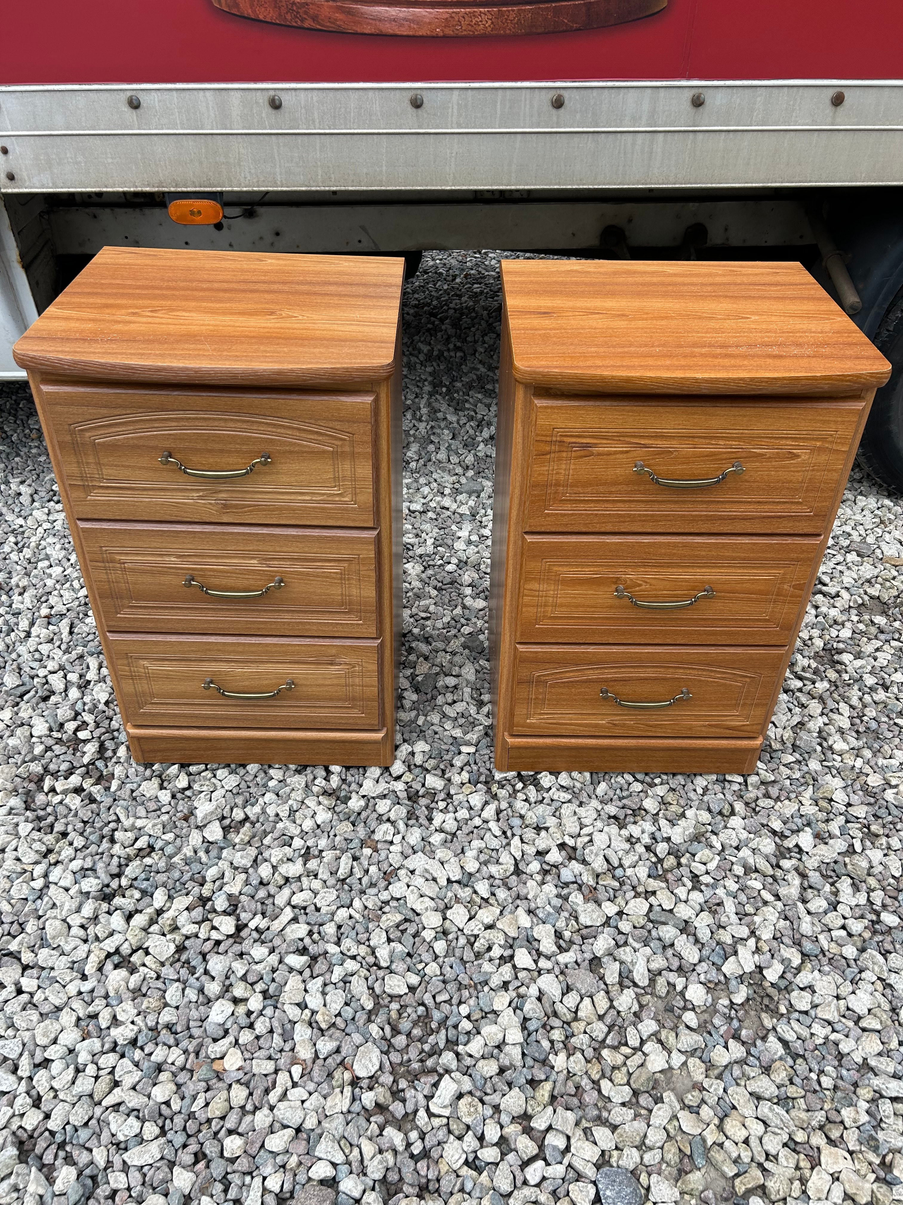 A matching pair of three-drawer bedside tables or nightstands, featuring a traditional-inspired design. These units are likely from the late 20th or early 21st century and are constructed from a wood-composite material with a medium reddish-brown, possibly veneered or laminated, wood-grain finish. Each table is fitted with three drawers, which have molded fronts, with the top drawer exhibiting an arched panel. The drawers are equipped with brass-toned bail-pull hardware.