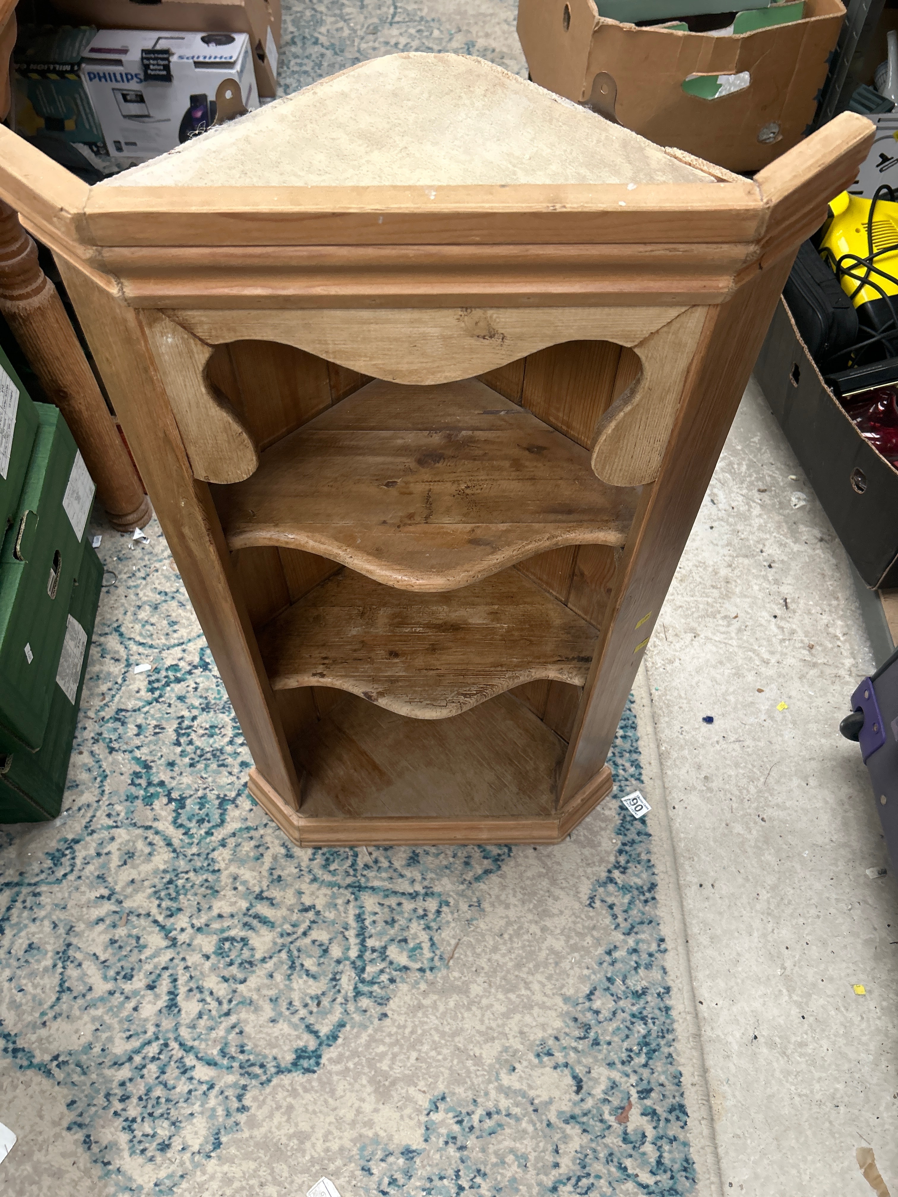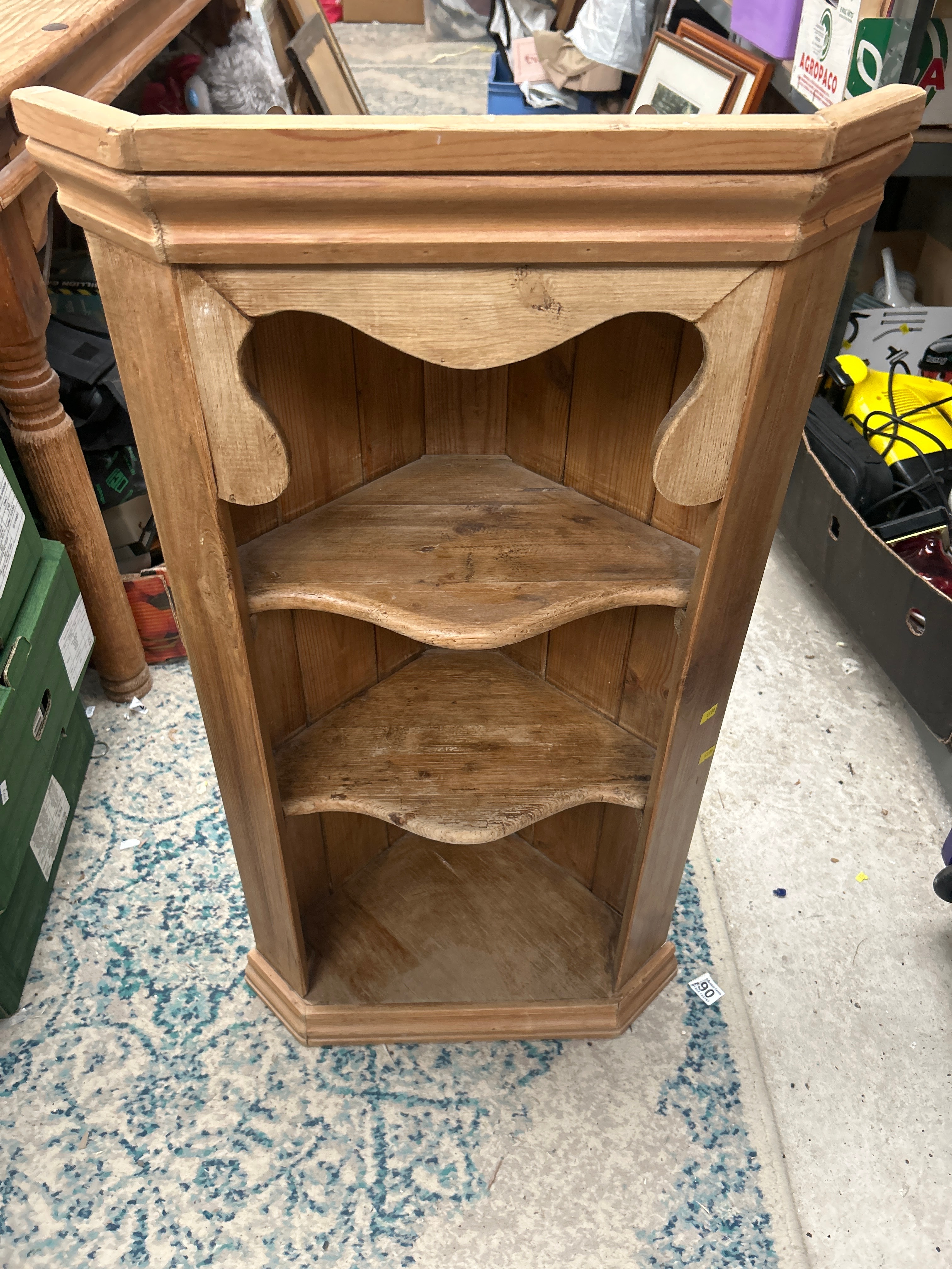 A pine corner display cabinet, crafted from light-colored wood, exhibiting a traditional or rustic style. The unit features a shaped top cornice and a scalloped cutout at the top of the open front, leading to three fixed, similarly scalloped shelves. The wood shows visible grain and a light, possibly aged, natural or stained finish.