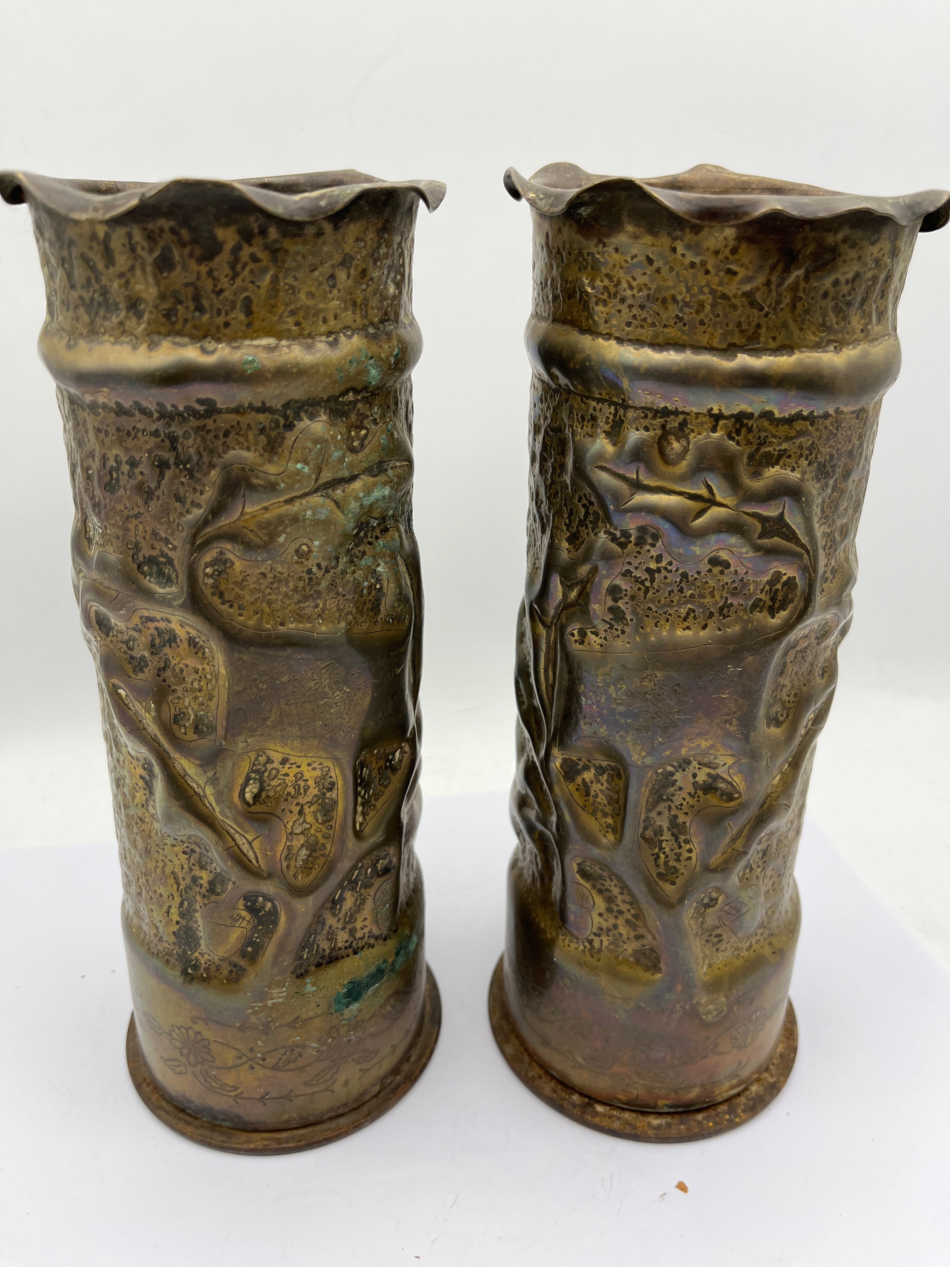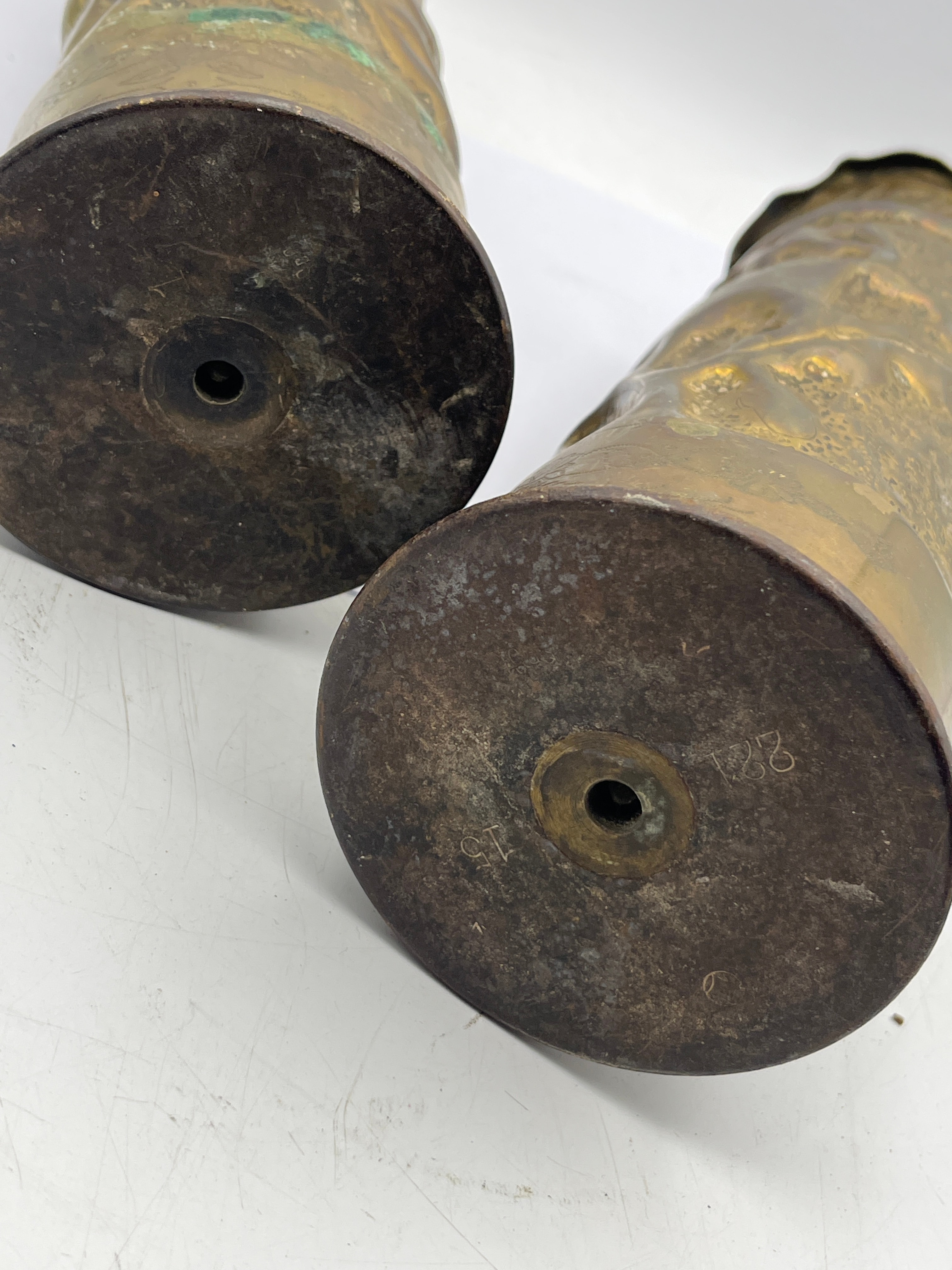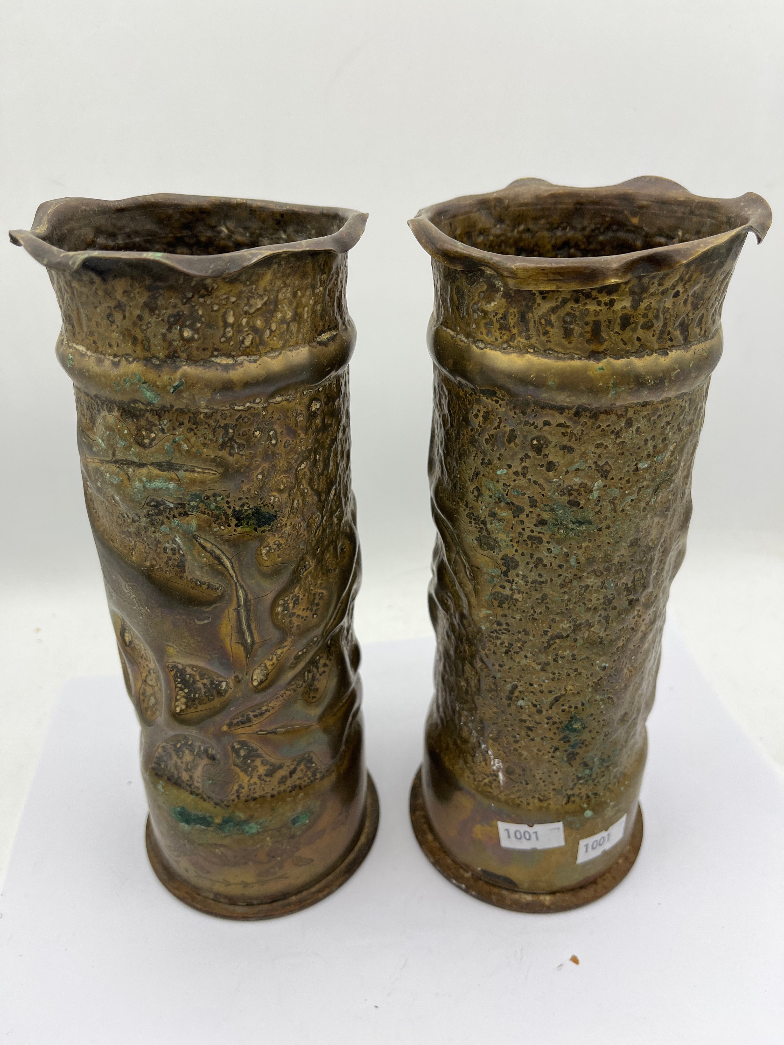 A pair of WW1 Trench Art brass artillery shell casings. Each cylindrical, open-top casing is extensively decorated with textured repoussé or chased work, depicting stylized naturalistic motifs. One features what appears to be a deer or similar animal, alongside foliage, while the other displays similar foliate designs. The top edges are irregularly shaped, suggesting a crimped or fluted finish. The bases feature central primer holes and stamped markings, including “15” and “128” visible on separate items, alongside other fainter numerals. One item also bears a modern white label with “1001.”