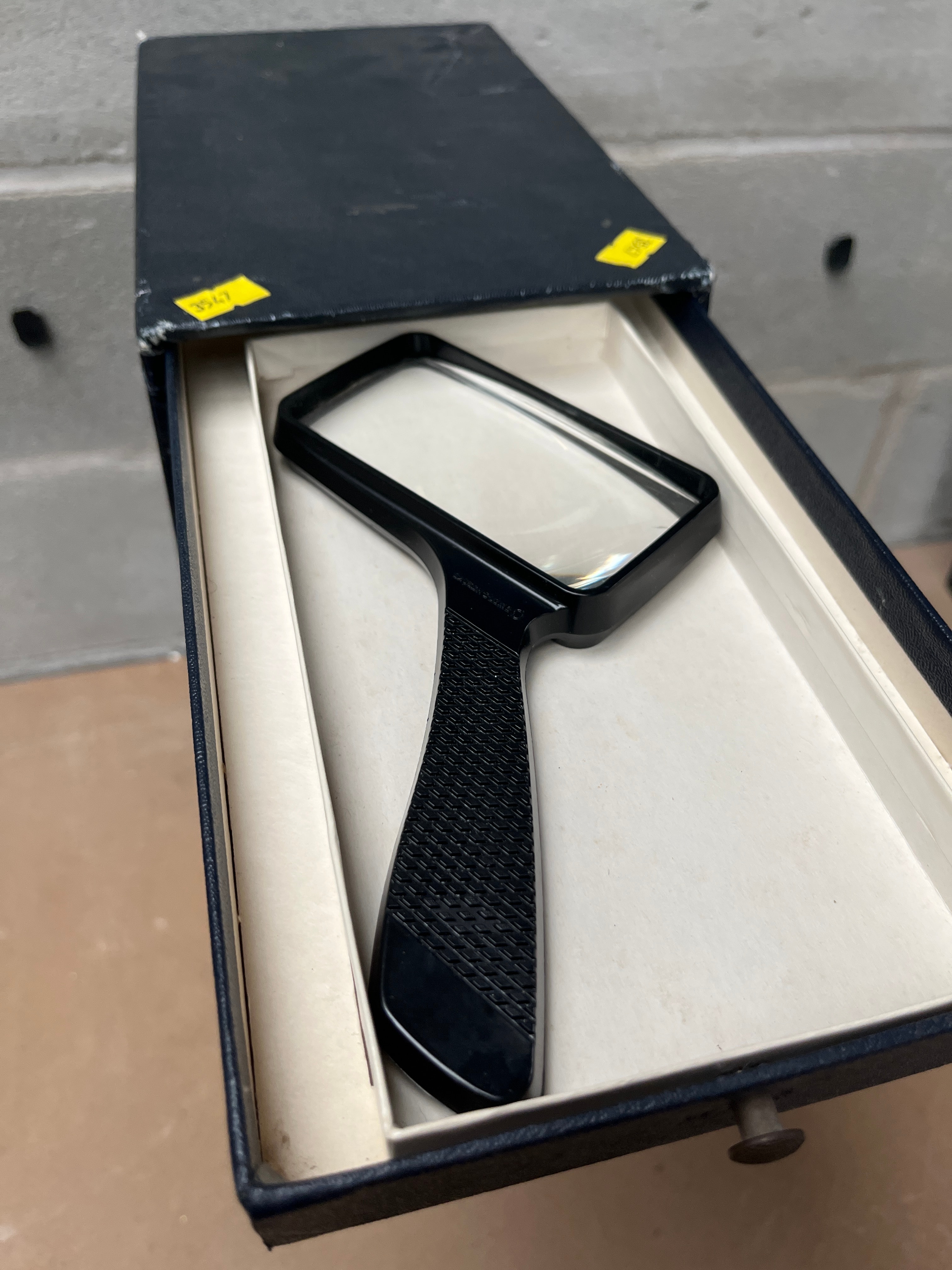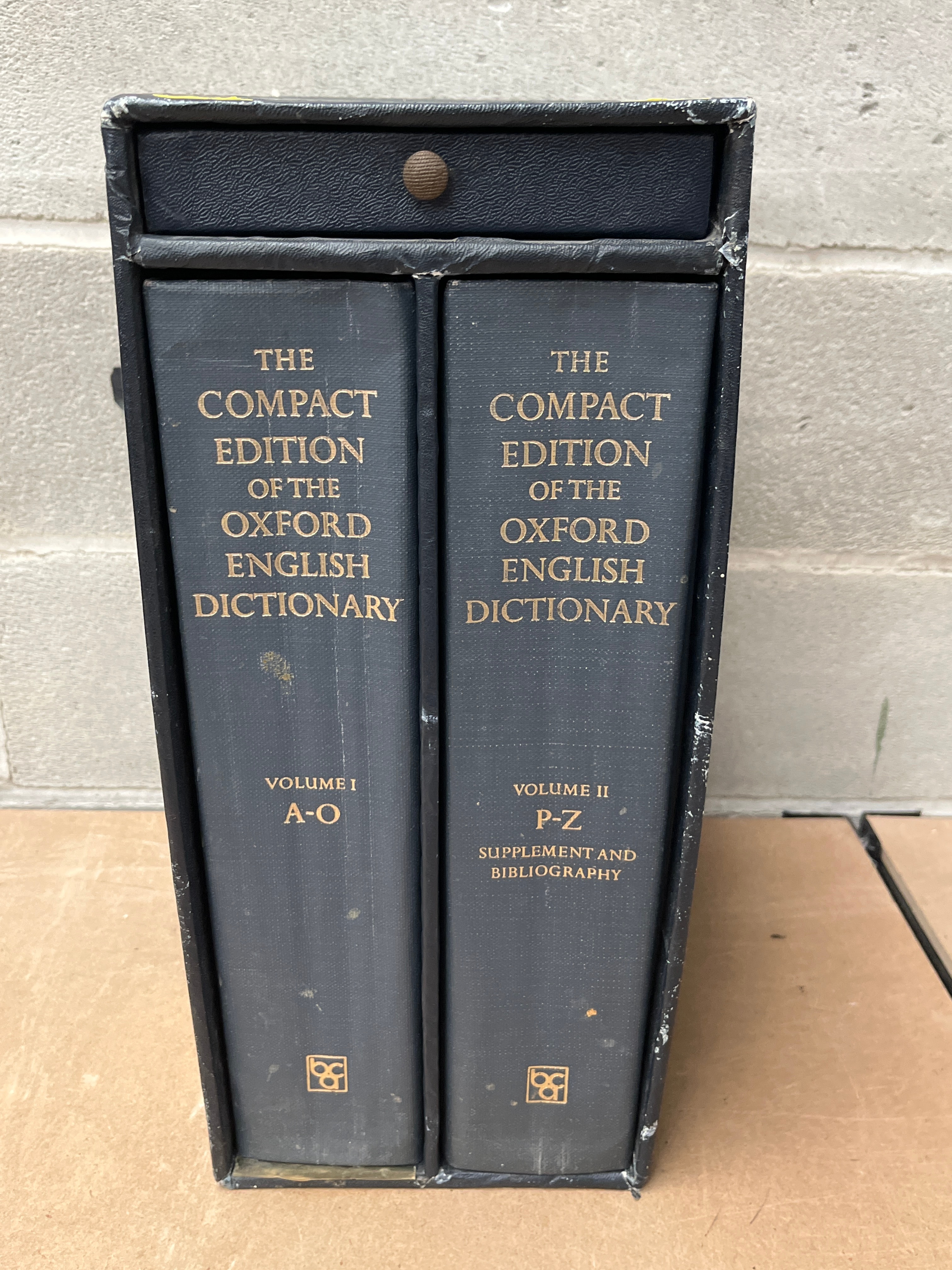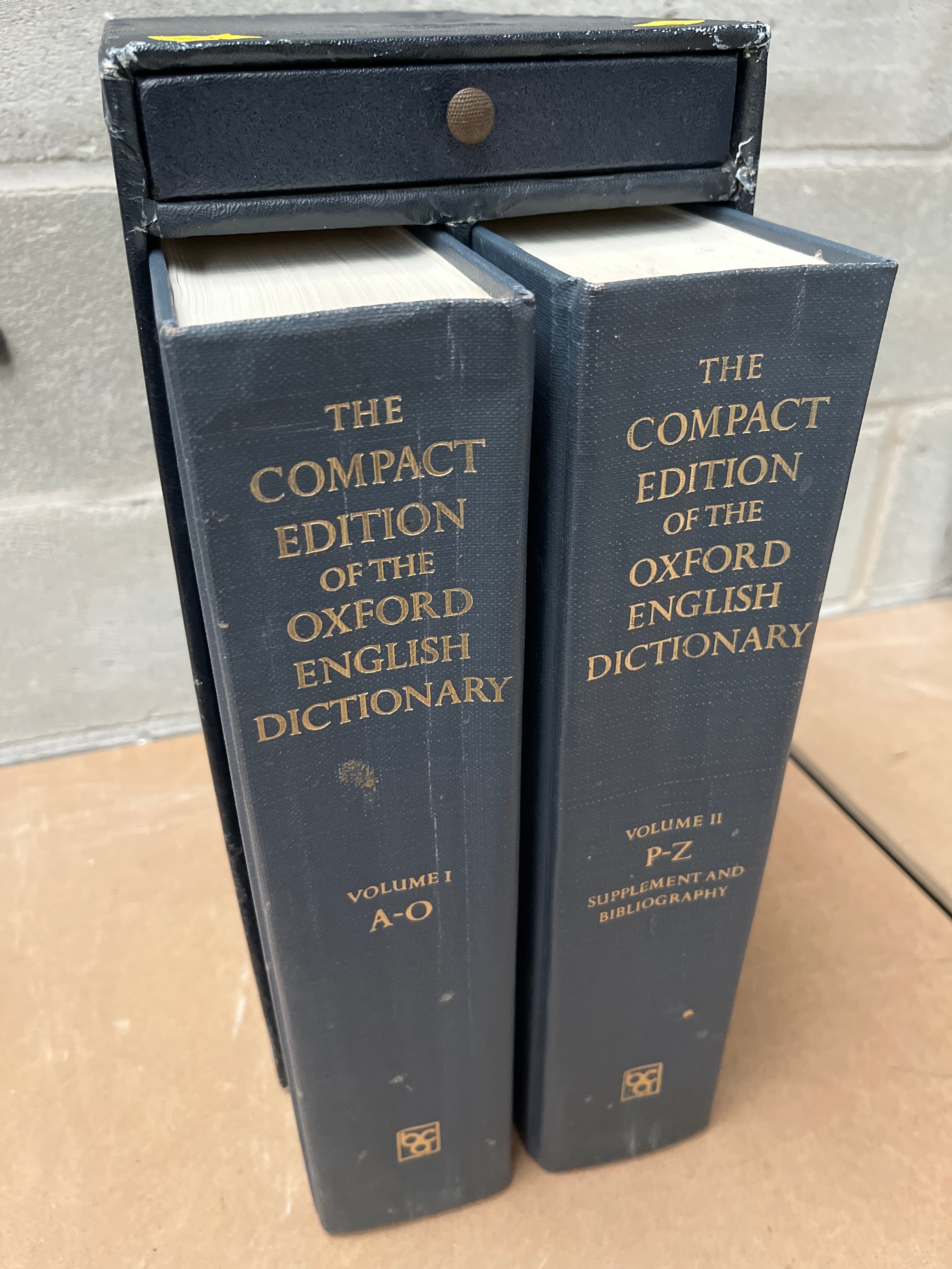A two-volume set of ‘The Compact Edition of the Oxford English Dictionary’. The set is housed in a dark blue, textured slipcase with an integrated compartment at the top. This compartment contains a black plastic-handled magnifying glass with a rectangular lens. Volume I is titled ‘A-O’ and Volume II ‘P-Z SUPPLEMENT AND BIBLIOGRAPHY’. Both volumes feature gold-colored text and a distinct stylized logo on their cloth-bound spines.