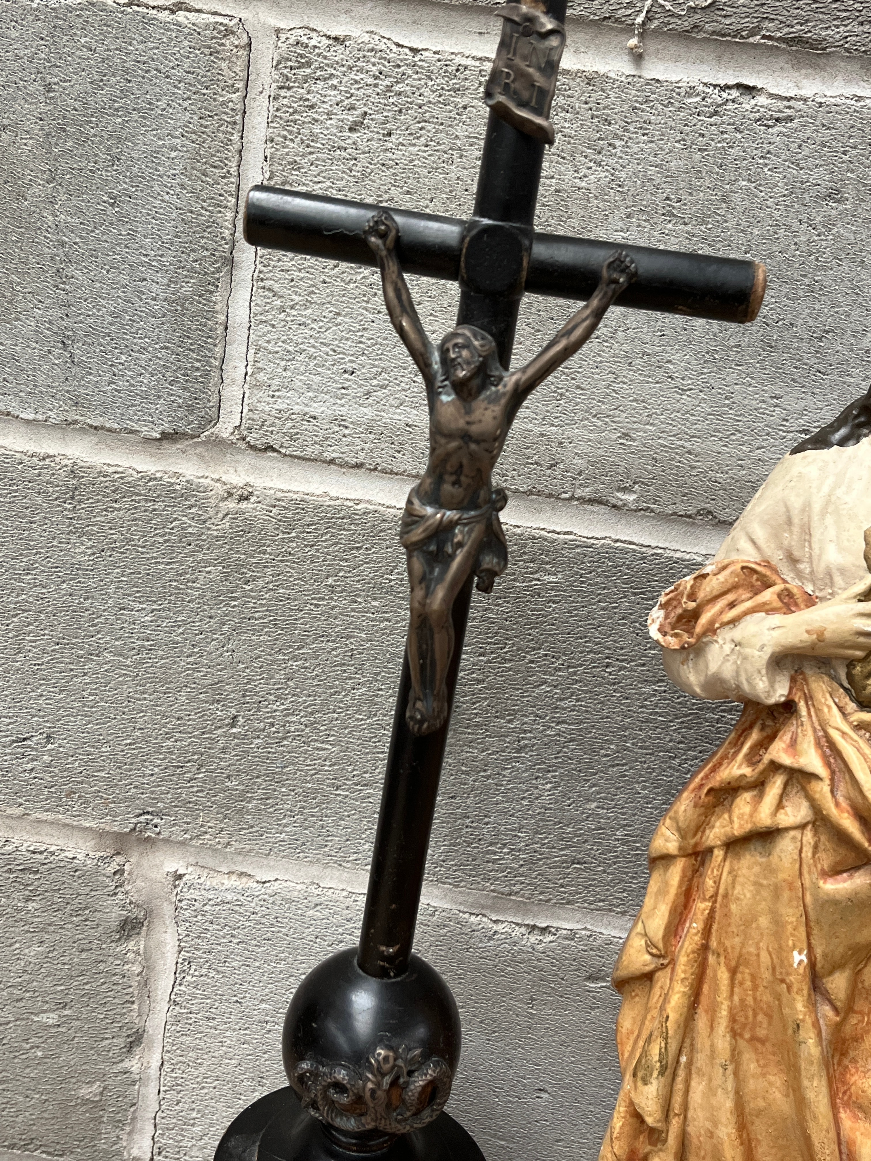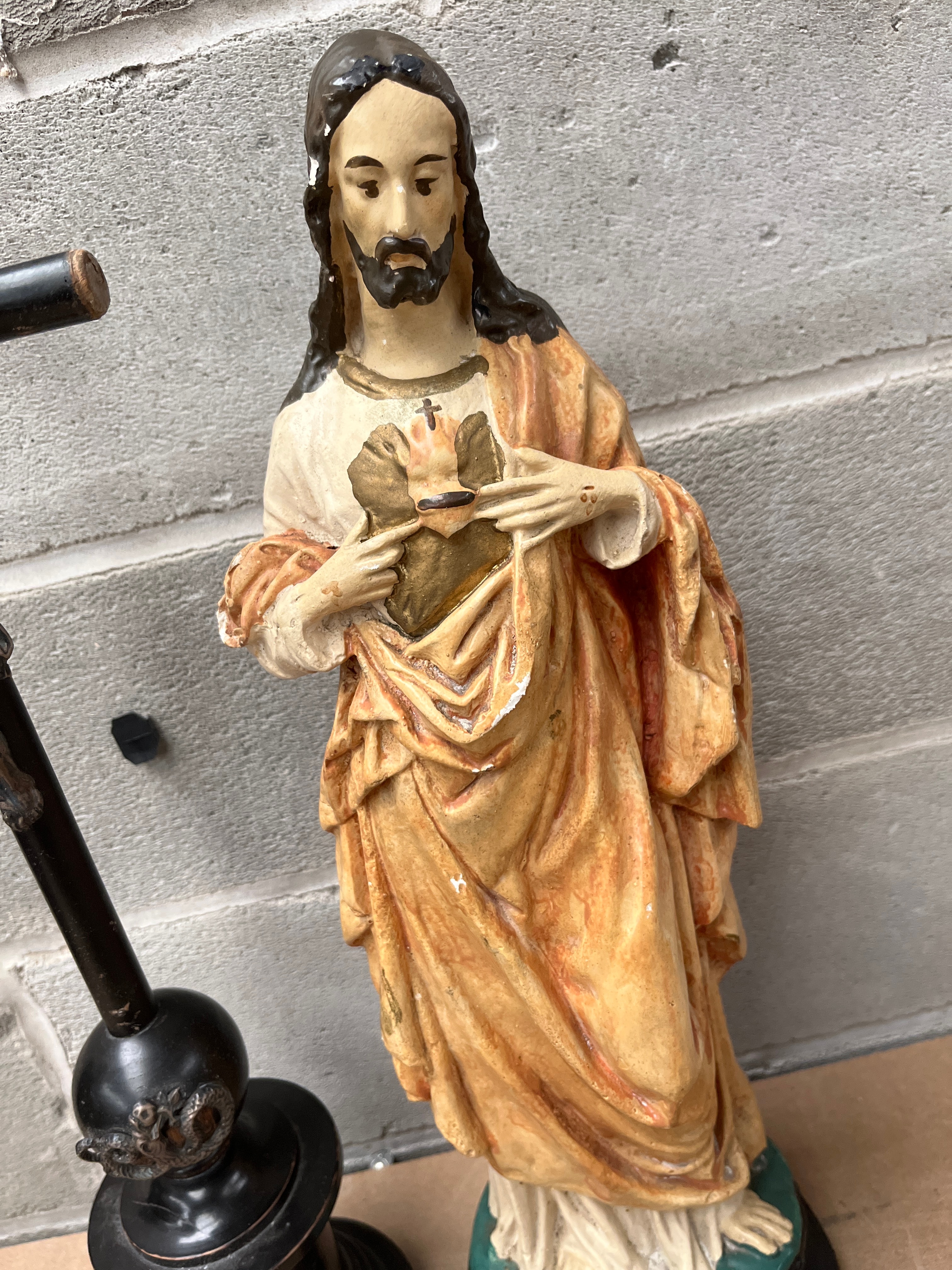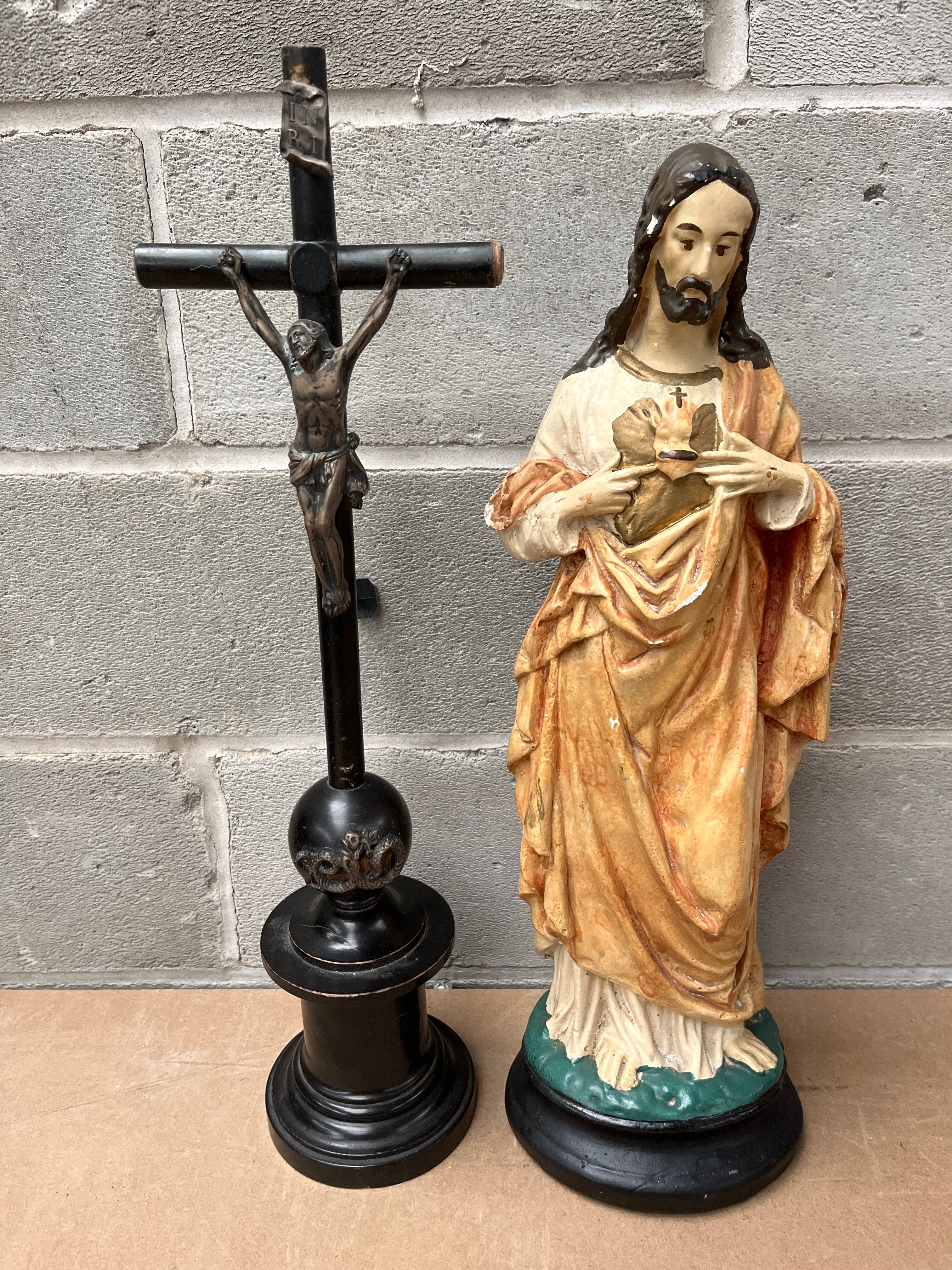 The lot comprises two religious devotional objects. The first is a polychrome painted statue of Jesus depicting the Sacred Heart, which is adorned with flames and a cross. Jesus is shown wearing a white tunic beneath an orange-ochre robe and stands on a dark-painted base. The statue is crafted from plaster or composition material. The second object is a standing crucifix featuring a dark-stained or painted wooden cross with a bronze or brass corpus of Christ, surmounted by a scroll inscribed “INRI” (Iesus Nazarenus Rex Iudaeorum – Jesus of Nazareth, King of the Jews). It is mounted on a turned, dark-finished wooden base.