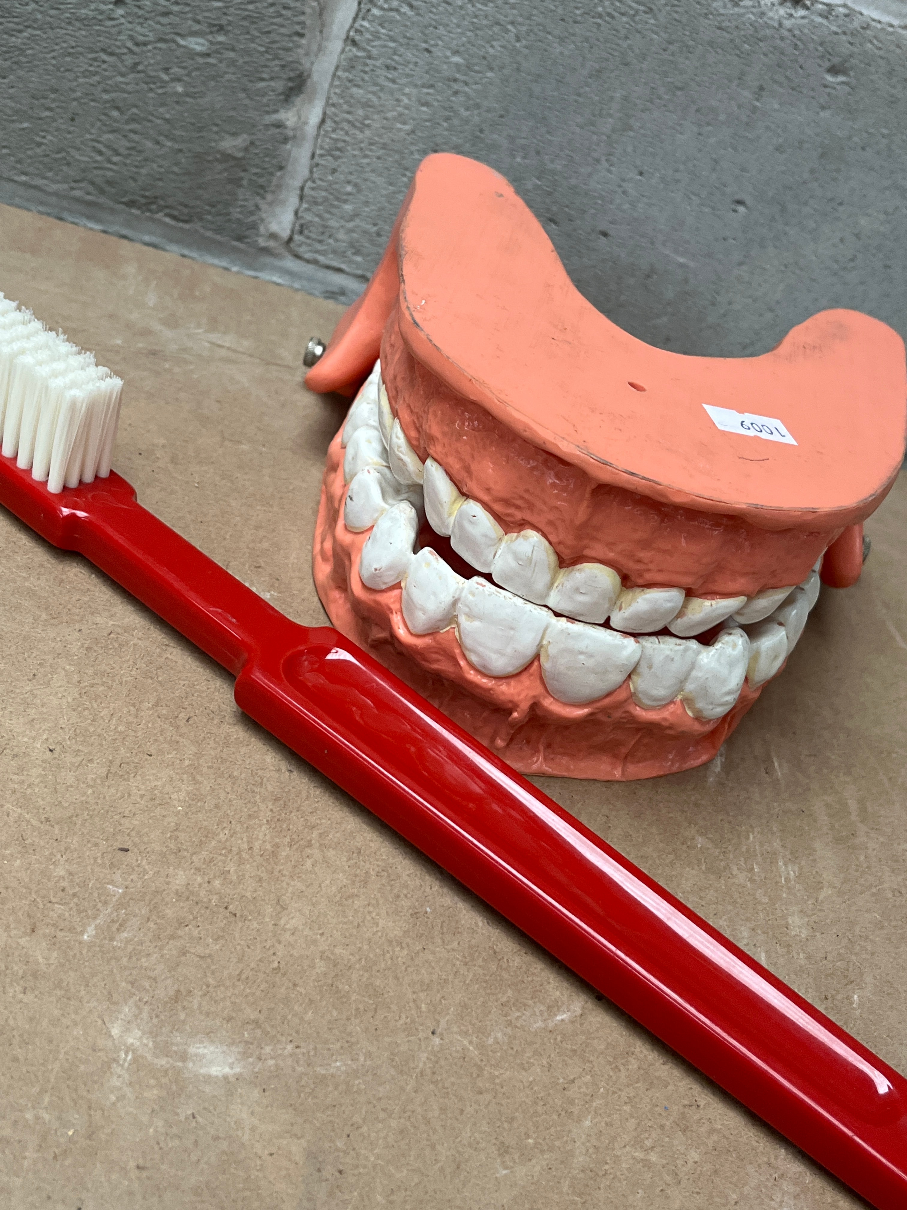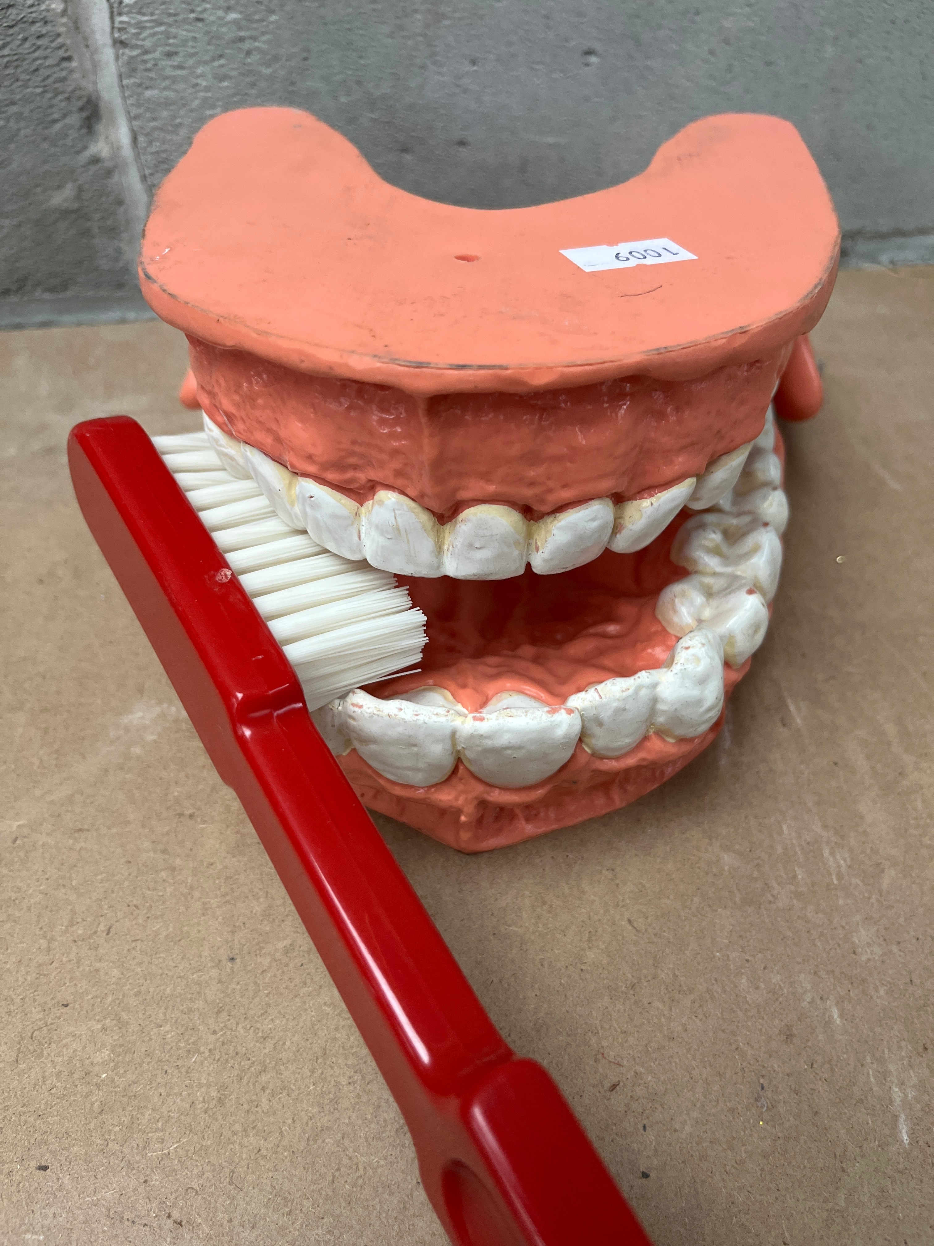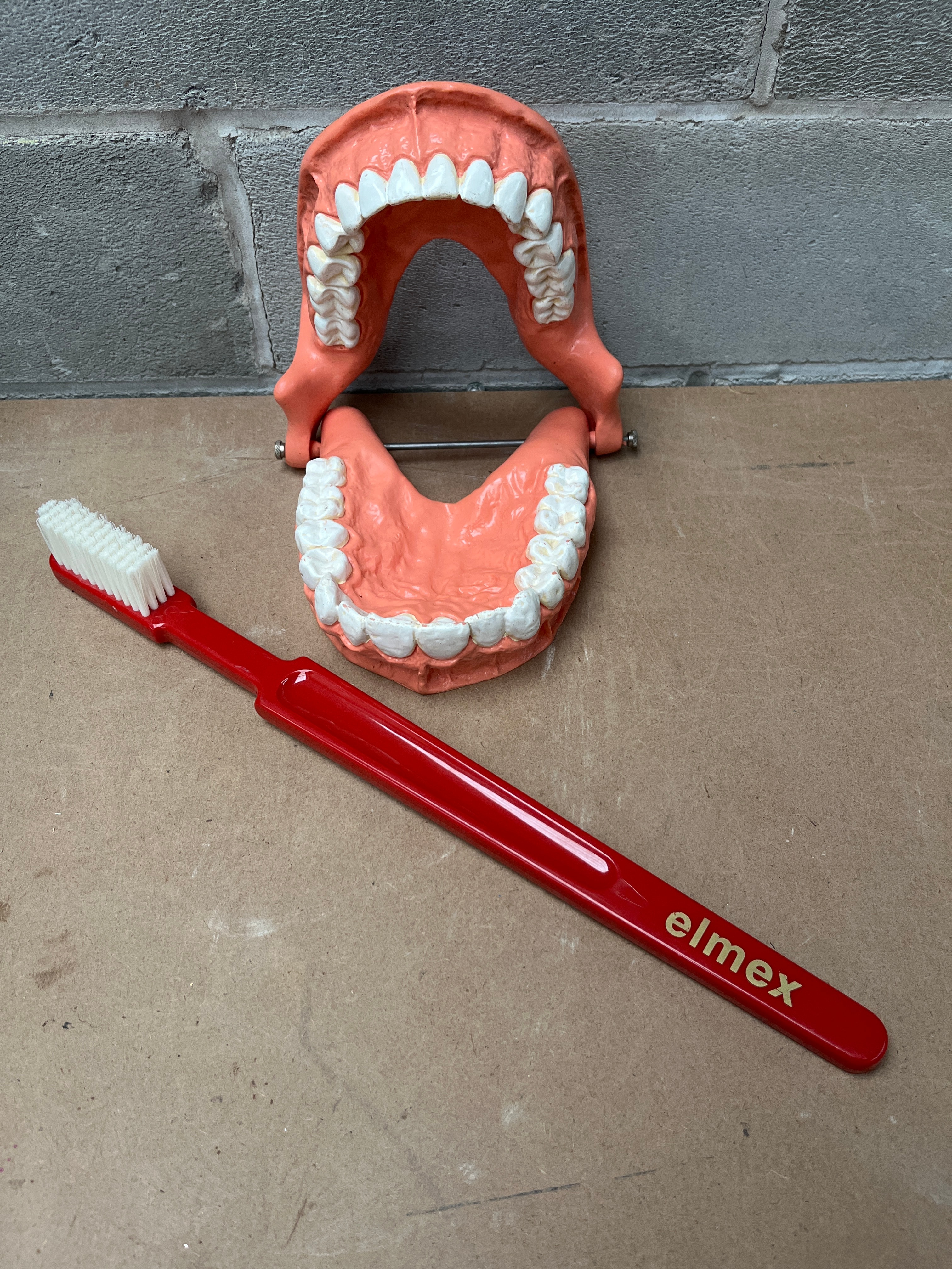 An educational dental demonstration model featuring articulated upper and lower jaws with white teeth set in peach-colored gums, connected by metal hinge hardware. A white sticker bearing the inscription “L 600” is affixed to the upper jaw. Accompanying this is an oversized demonstration toothbrush with a red plastic handle and white synthetic bristles, the handle marked with “elmex” in gold lettering. Both items are constructed from plastic or resin materials.