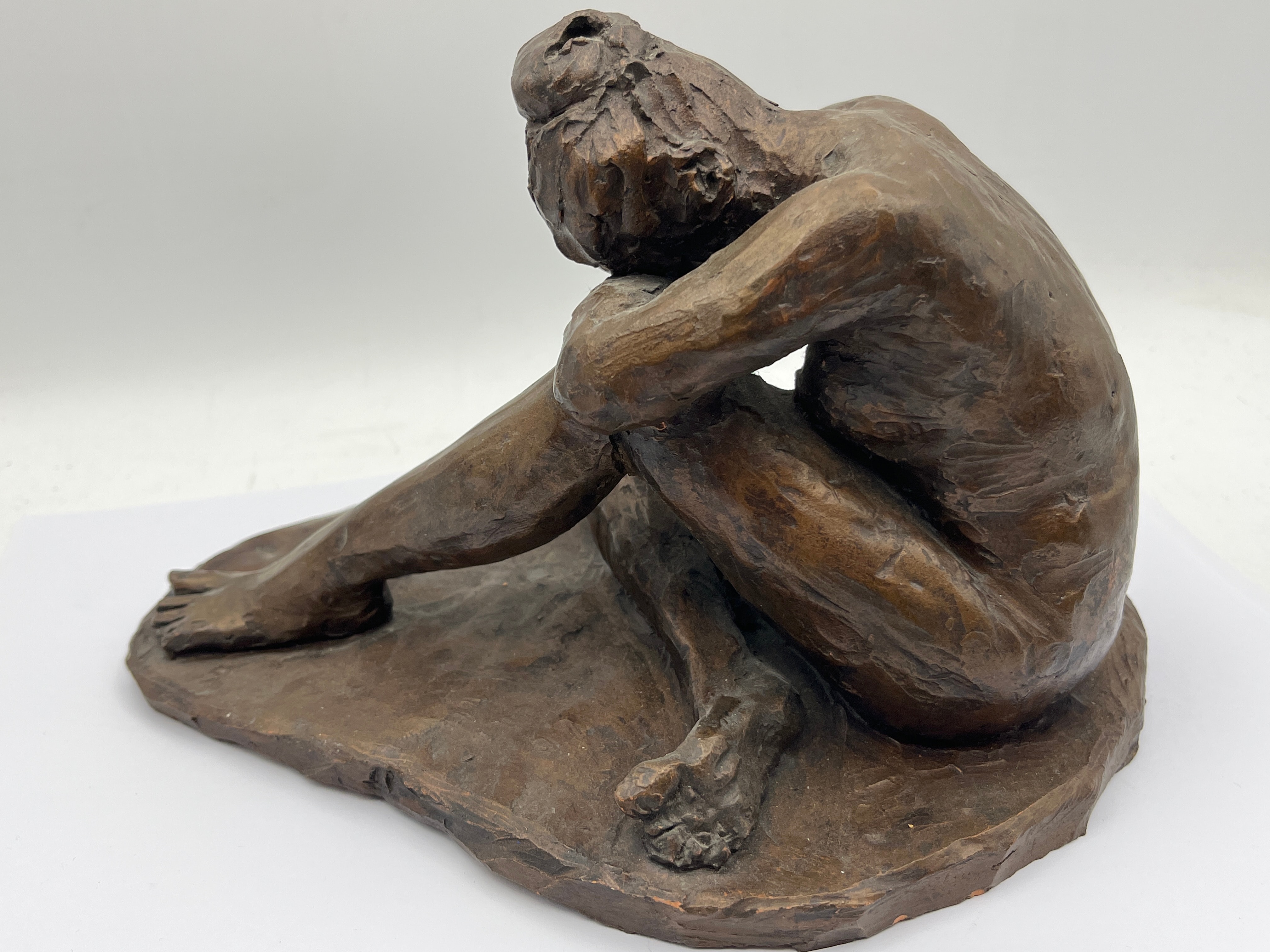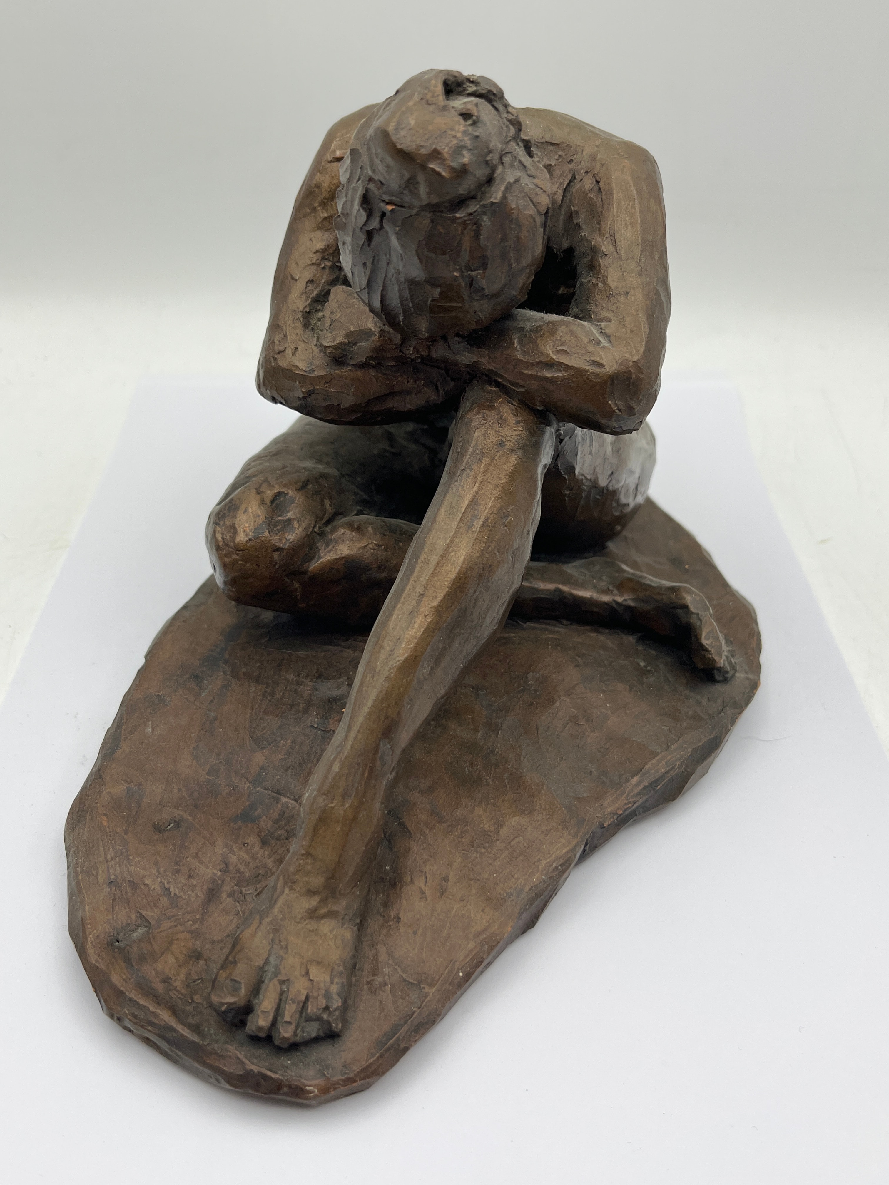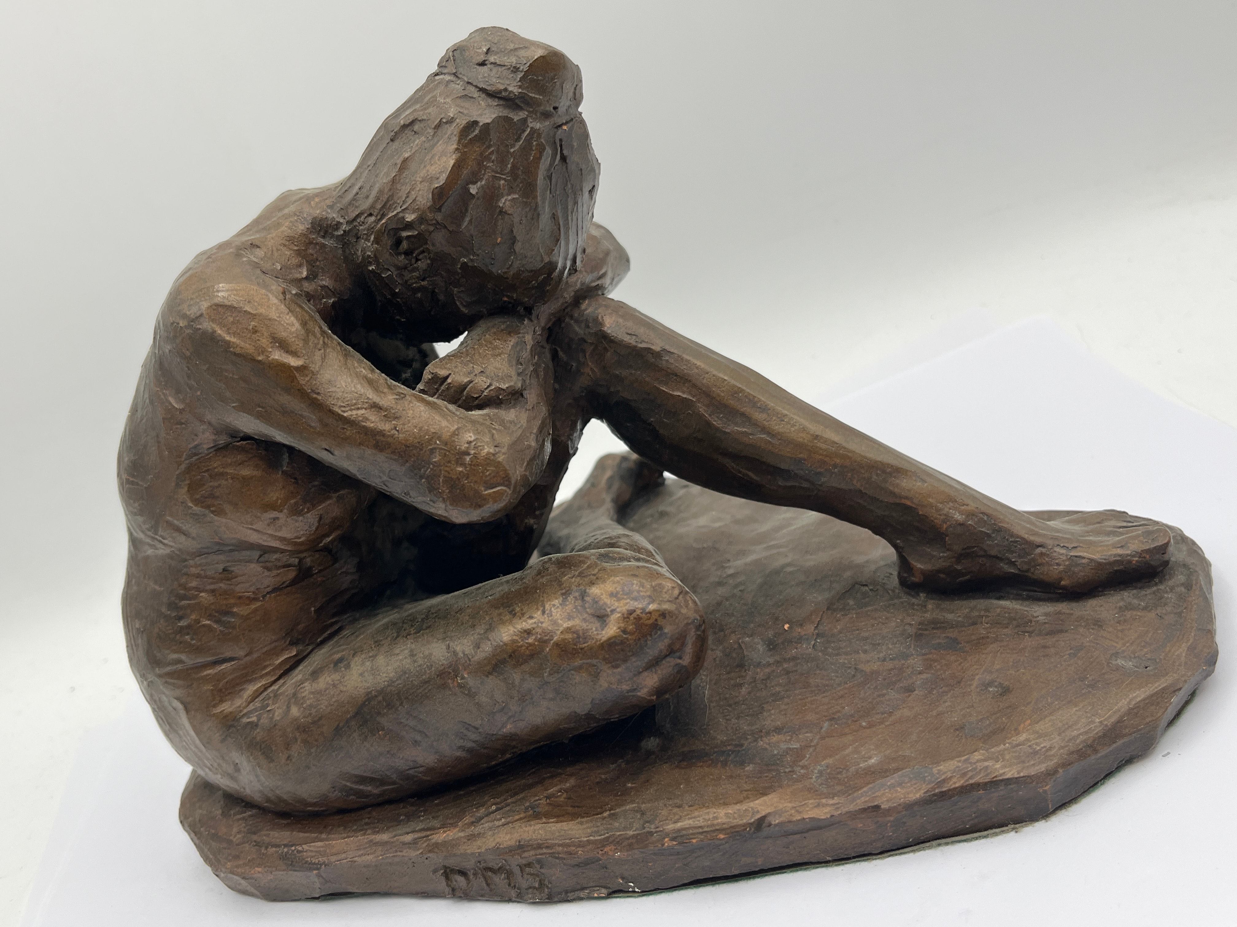 A bronze figural sculpture depicting a seated, nude figure in a contemplative or distressed posture, with arms wrapped around drawn-up knees and head resting on its arms. The piece exhibits an expressive, textured modernist style with a dark reddish-brown patination, and rests on an integral, irregularly shaped base. The initials ‘PMS’ or ‘P.M.S.’ are visibly inscribed on the base.