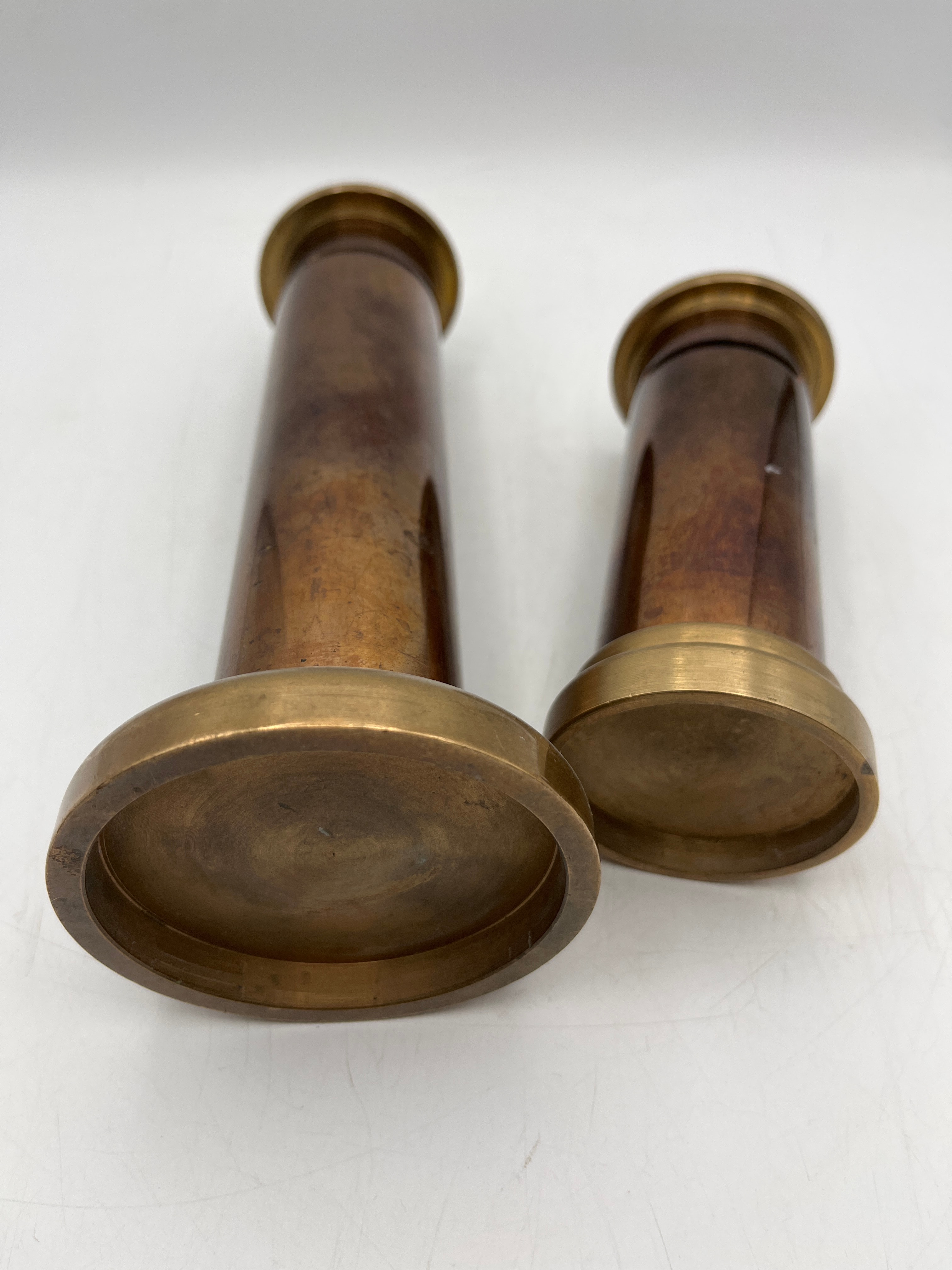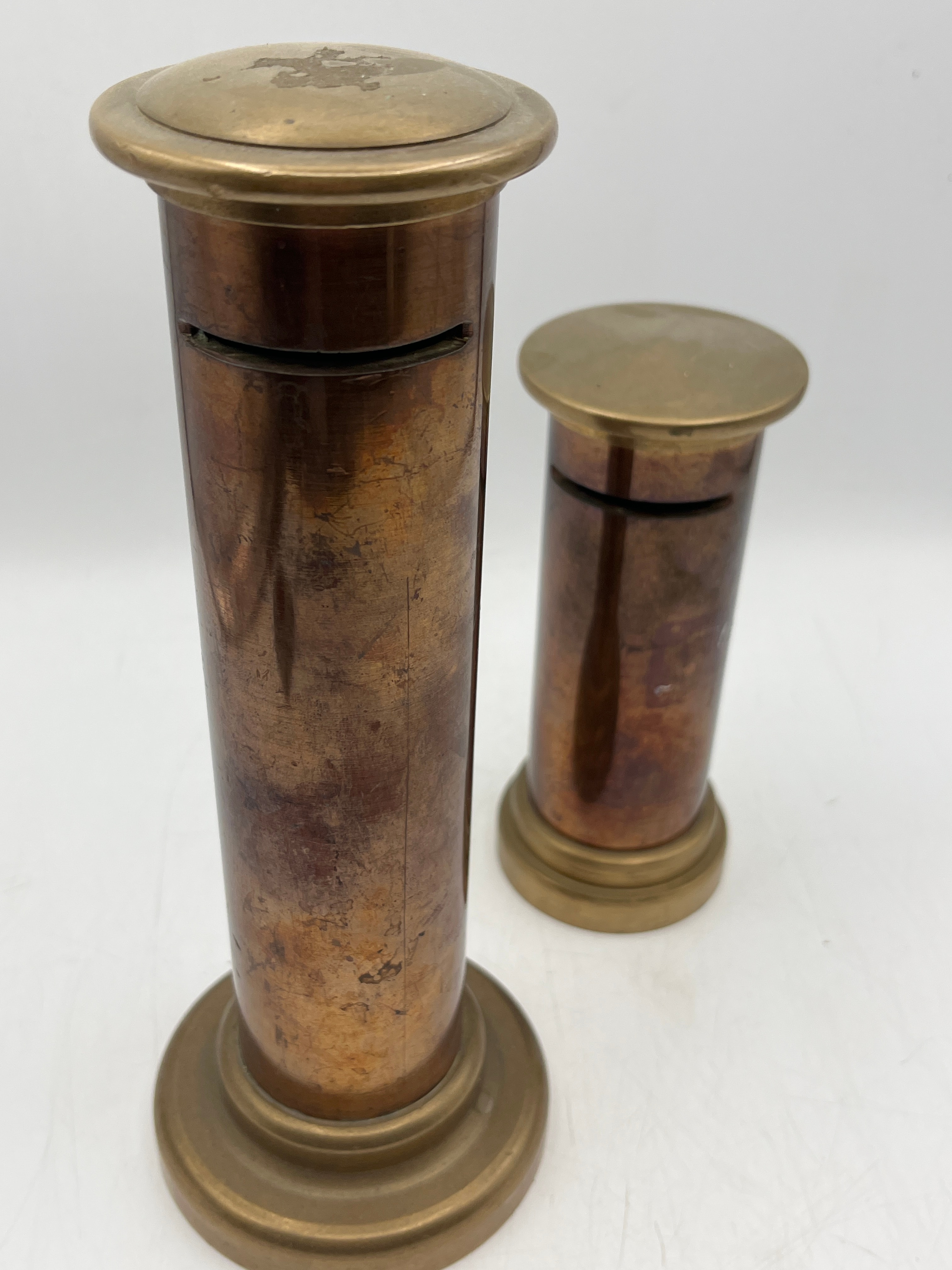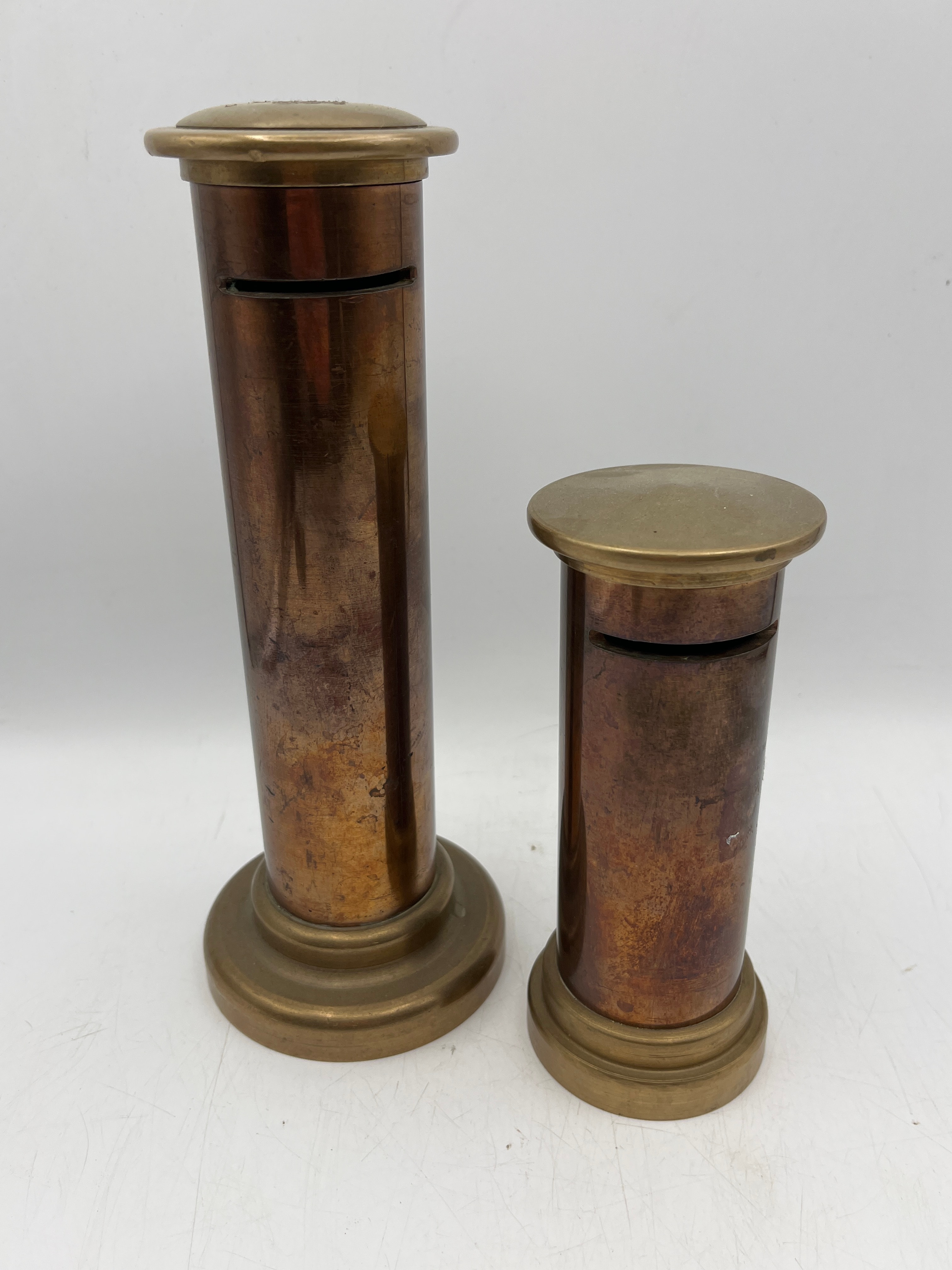 A pair of brass artillery shell trench art coin banks. Each cylindrical bank features a design reminiscent of miniature pillar boxes. They are constructed from metal, with the main body appearing to be patinated copper or bronze, and the stepped bases and domed lids made of a lighter, polished brass. Each features a single horizontal slot near the top for coin insertion.