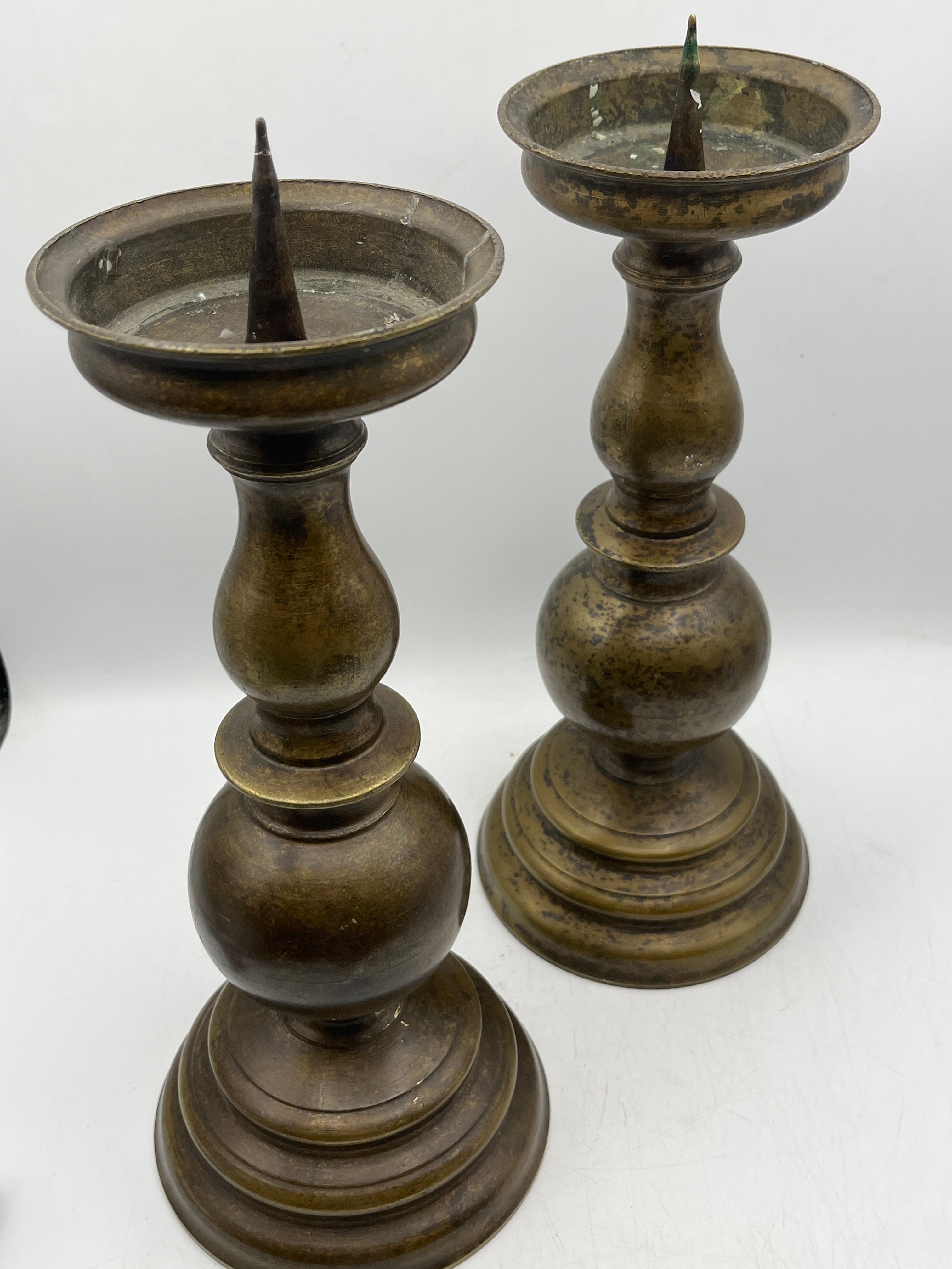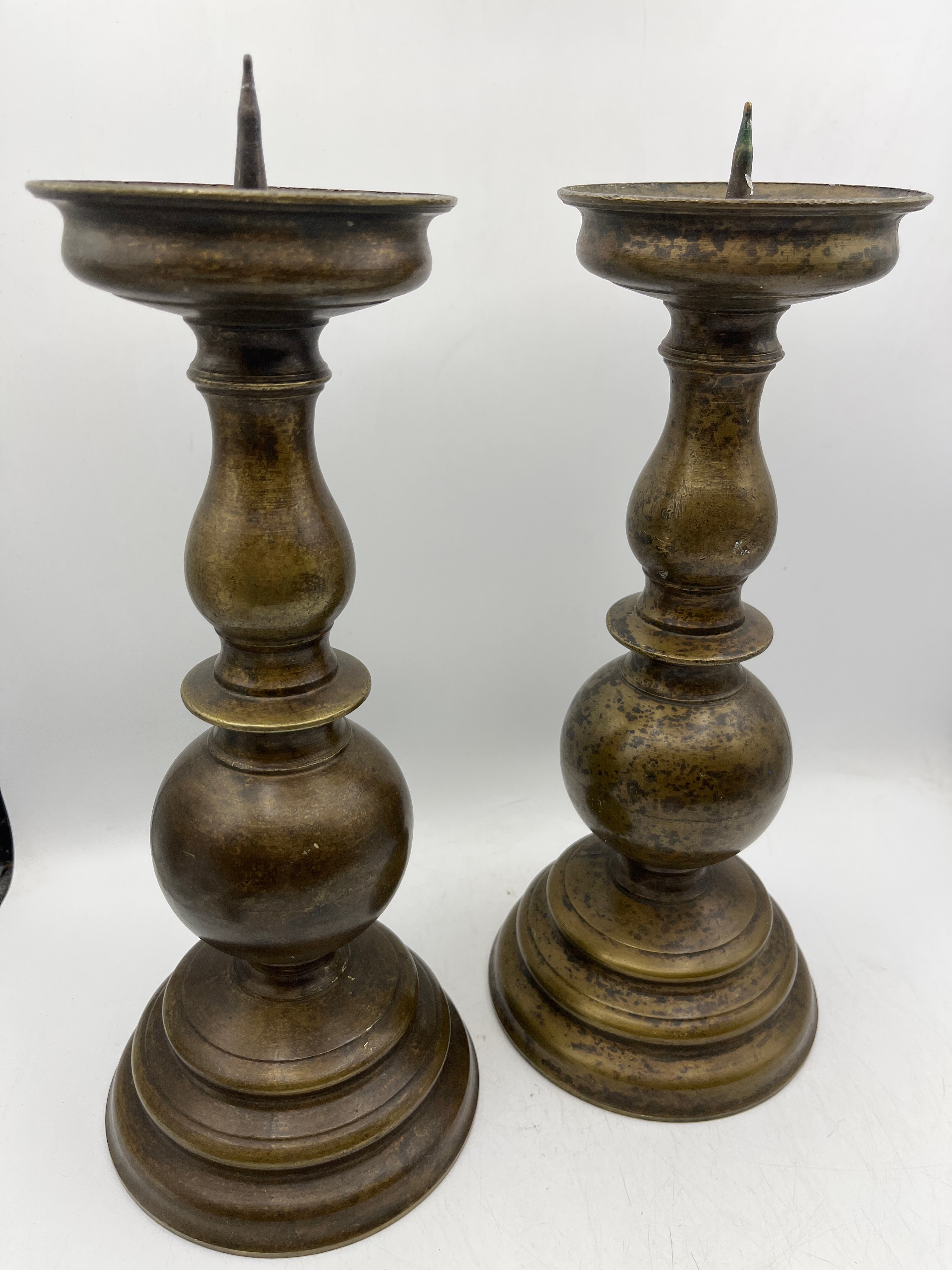 This pair of substantial pricket candlesticks is crafted from patinated brass. Each features a traditional baluster-turned standard rising from a tiered circular base, supporting a wide, shallow bobeche with a central spike for impaling candles. The design evokes Baroque or Renaissance forms, consistent with traditional Shabbat candlesticks. No visible manufacturer’s marks or textual inscriptions are discernible.