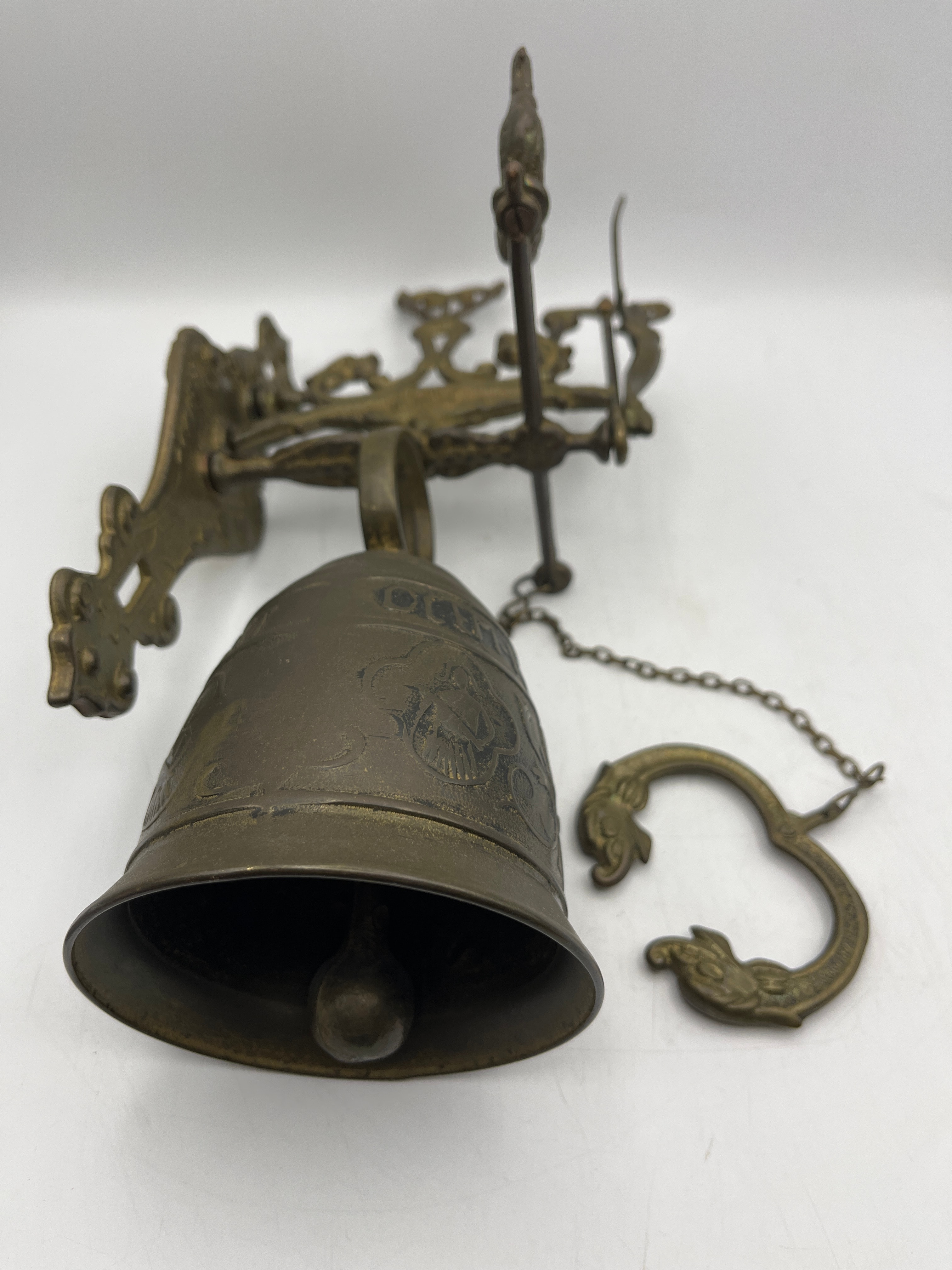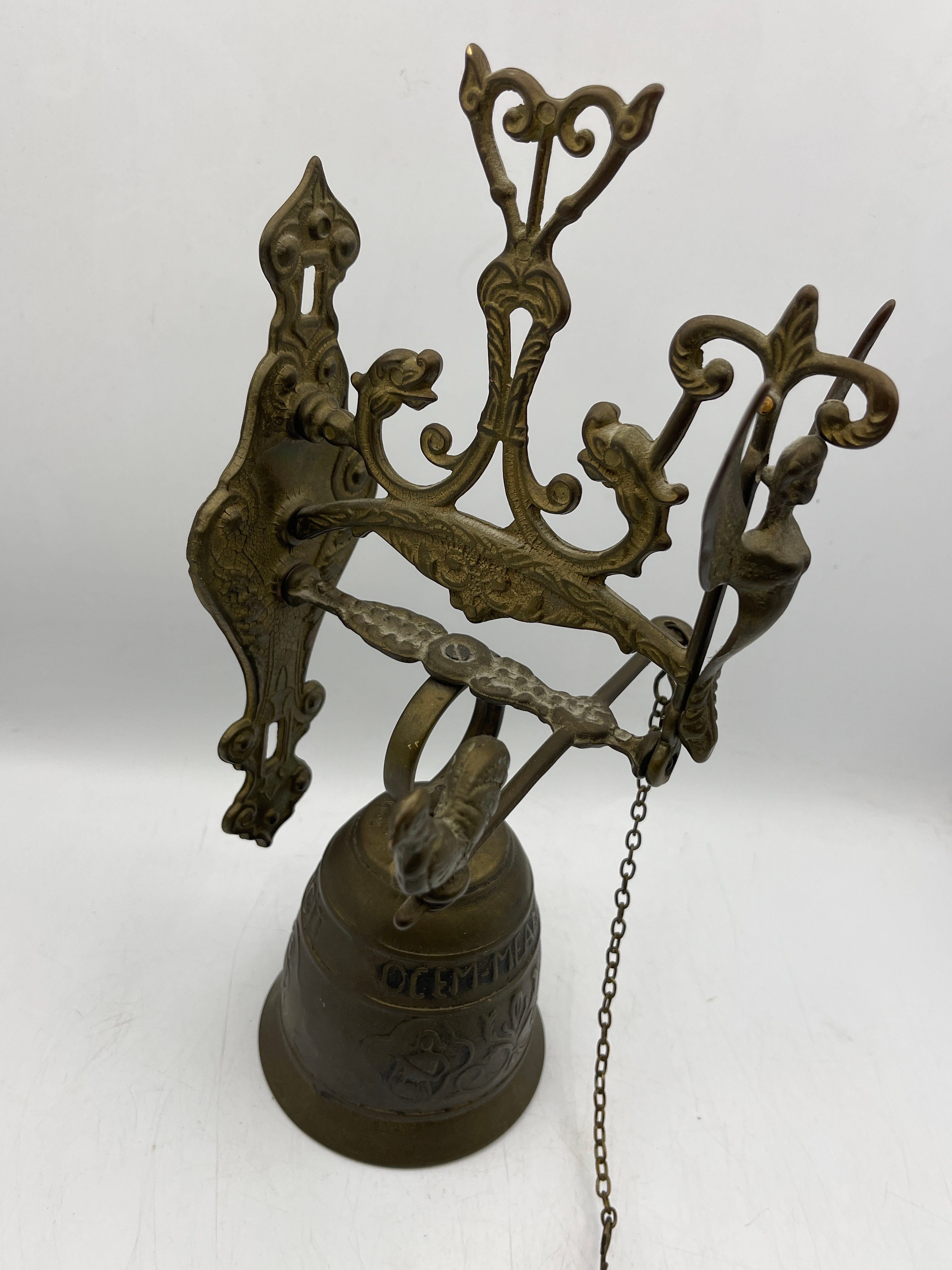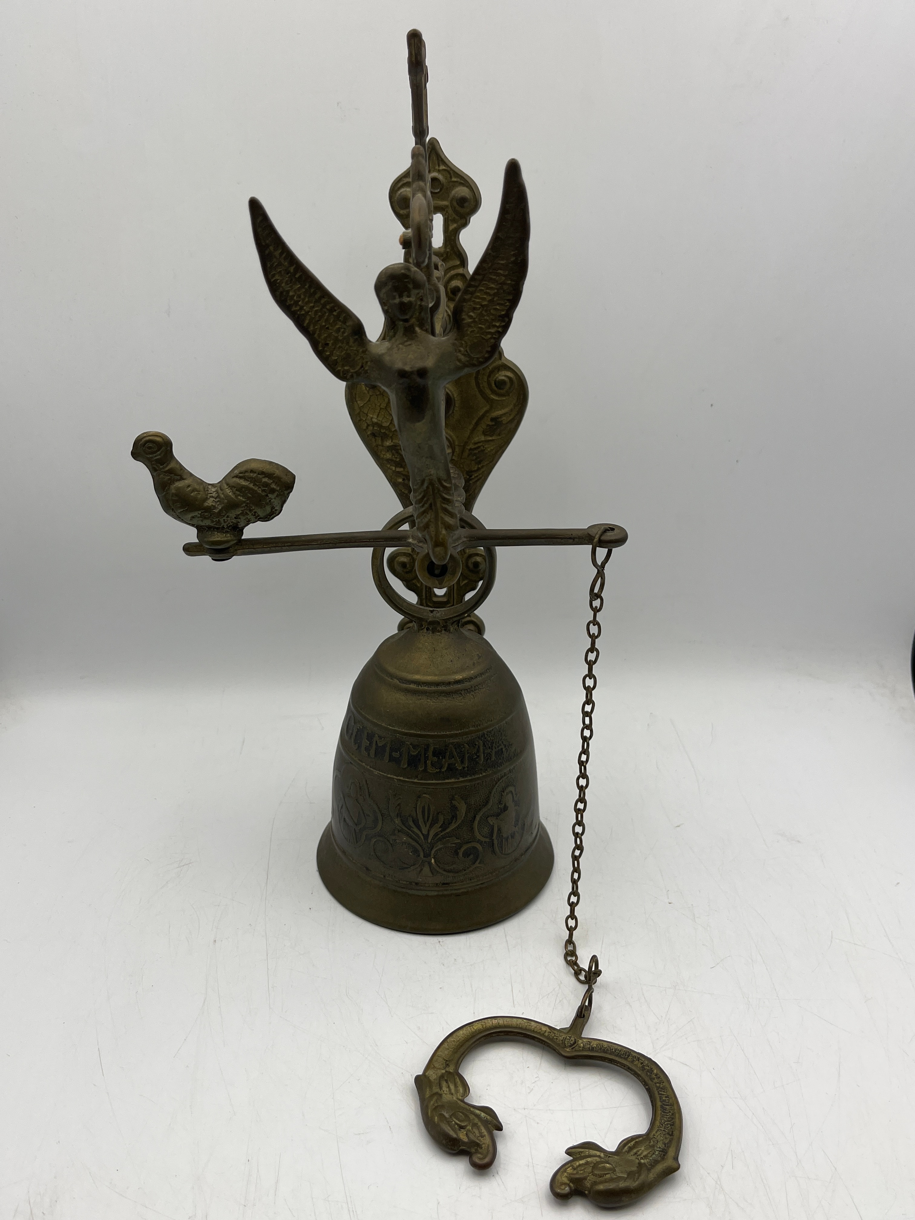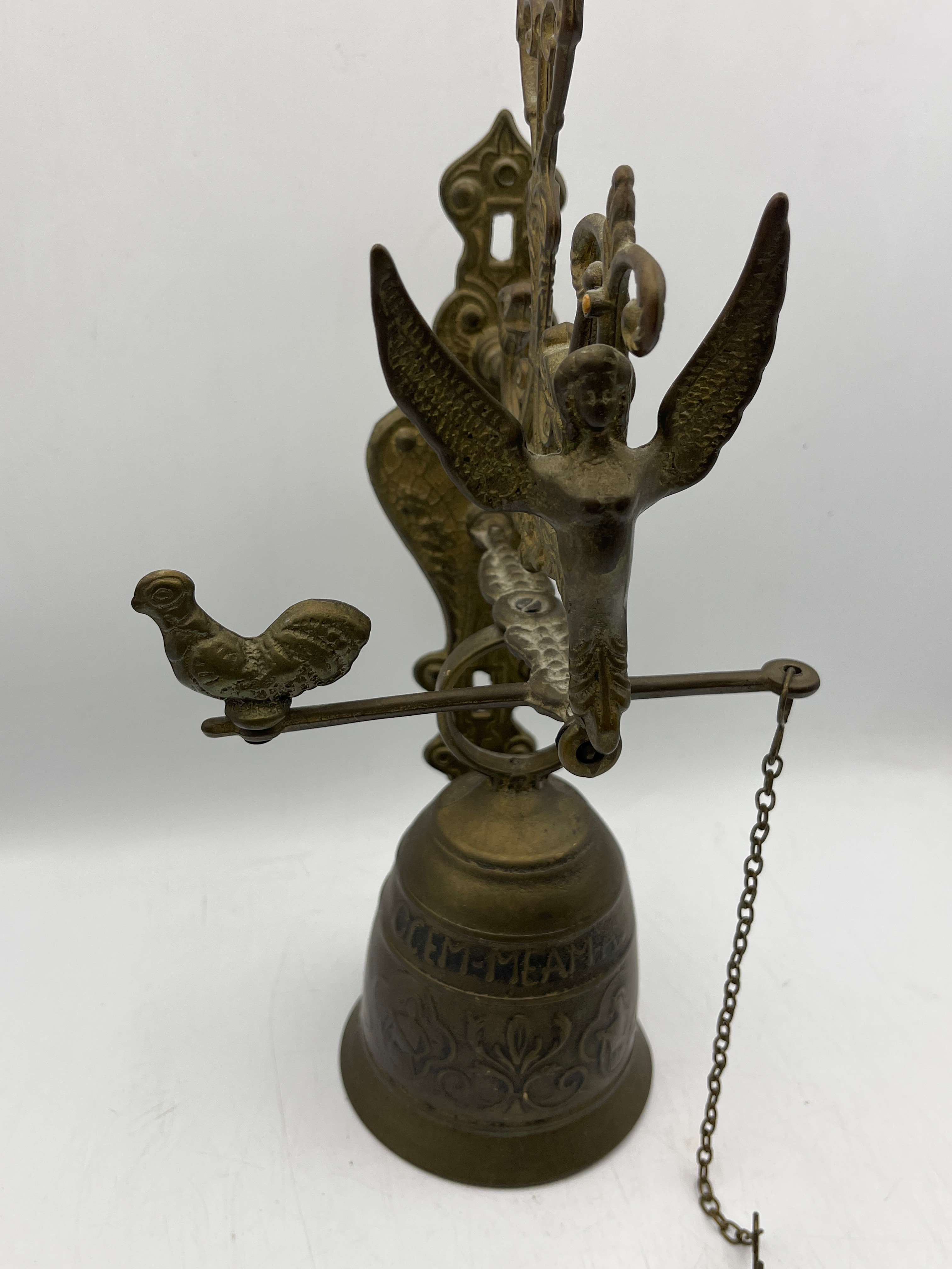 An antique-style wall-mounted bell, constructed from patinated brass or bronze. The ornate bracket features scrolling motifs, a central winged figural element resembling an angel or putto, and a small bird figure, likely a rooster, perched on a crossbar. The bell itself is decorated with a band of classical-style relief ornamentation and bears visible Greek text reading “ΠΕΜΠΕ ΝΕΥΜΑ,” which translates to “Send a signal” or “Send a sign.” A chain is attached to the bell’s clapper mechanism, leading to a decorative pull handle shaped like stylized serpent or dragon heads.