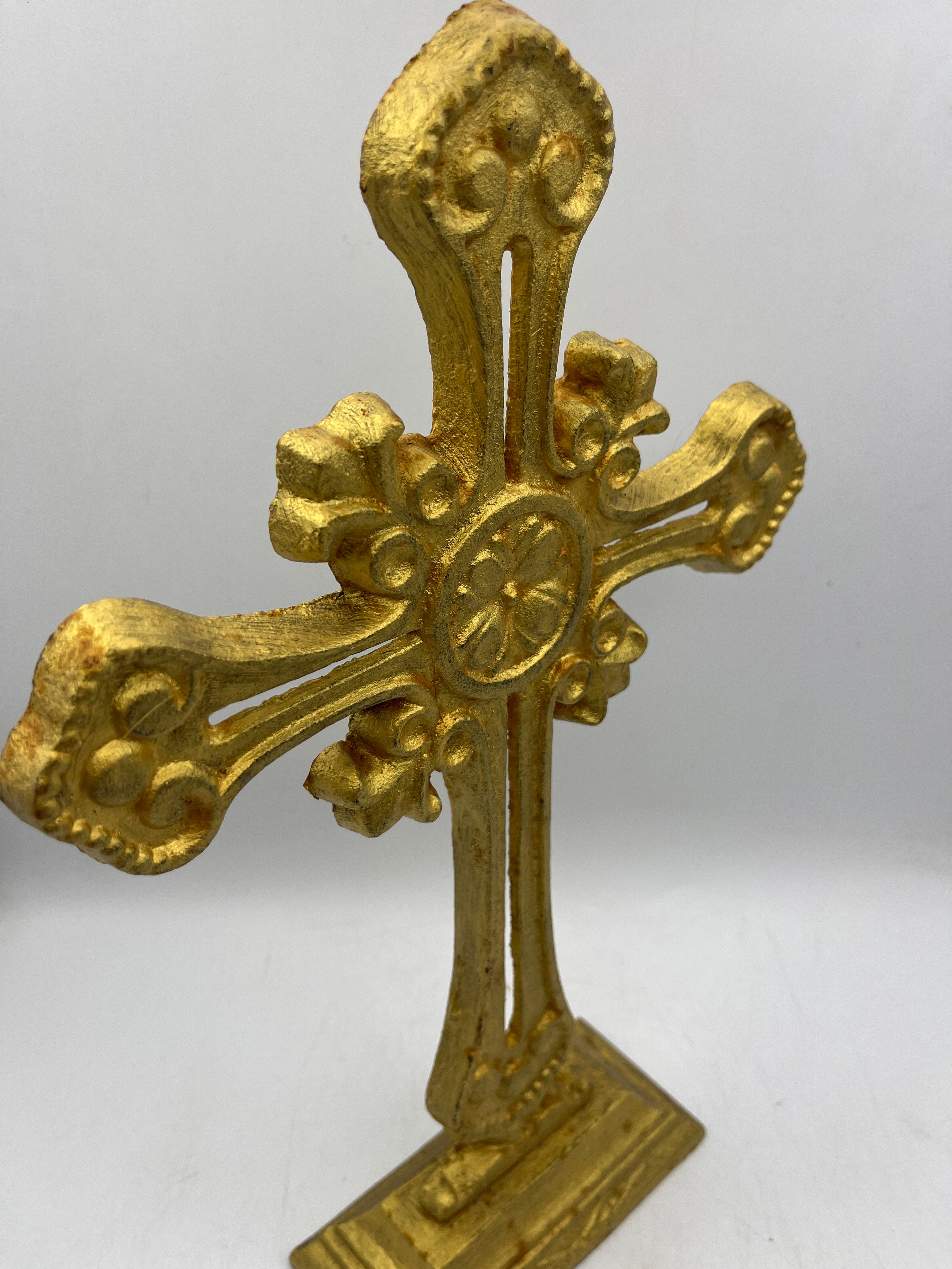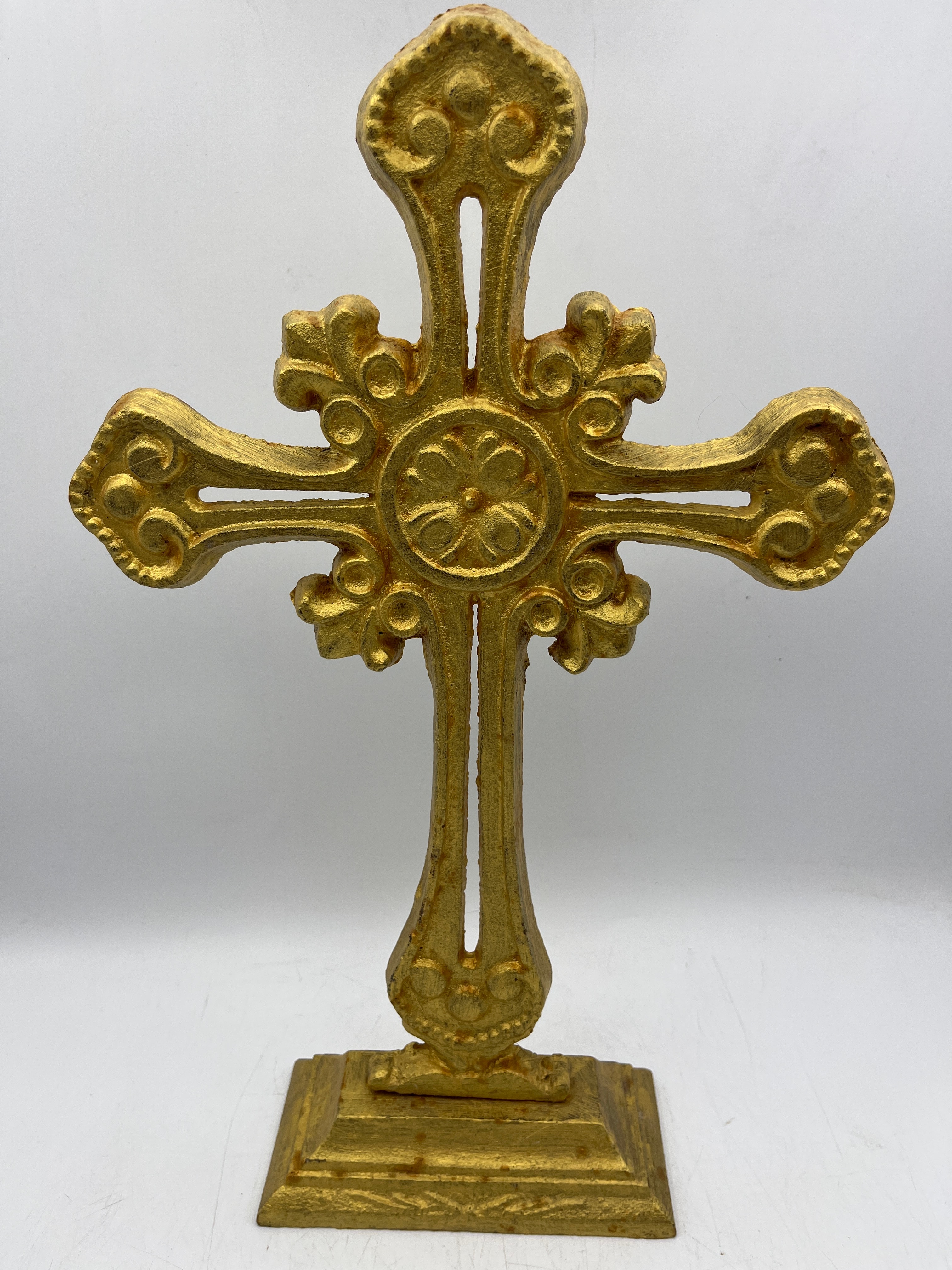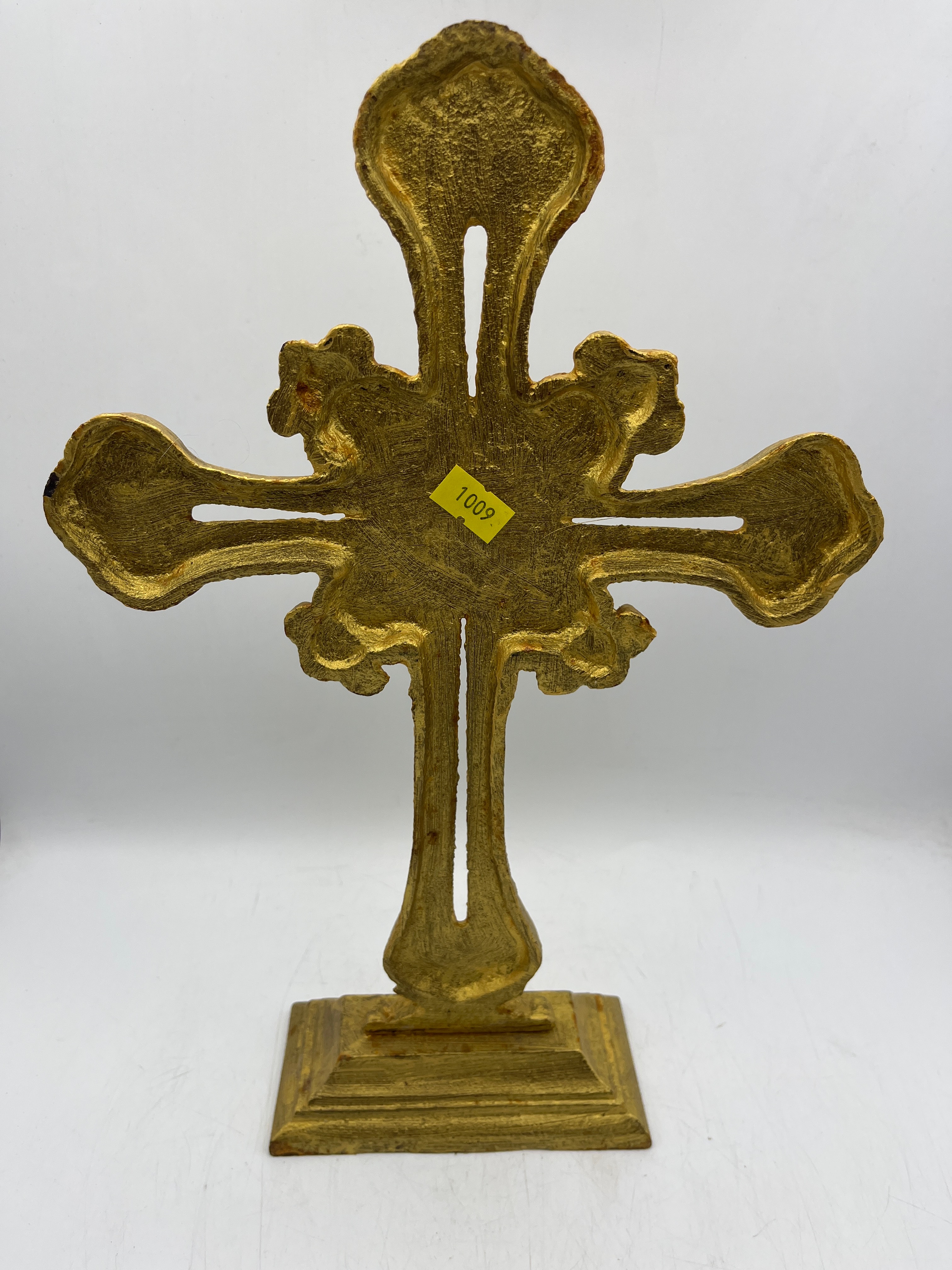 An ornate brass standing cross, featuring flared and scrolled arm terminals and a central circular medallion with a stylized quatrefoil design. It is mounted on a stepped rectangular base. The brass has a textured gold-colored finish. A yellow sticker bearing the number “1002” is affixed to the reverse side.