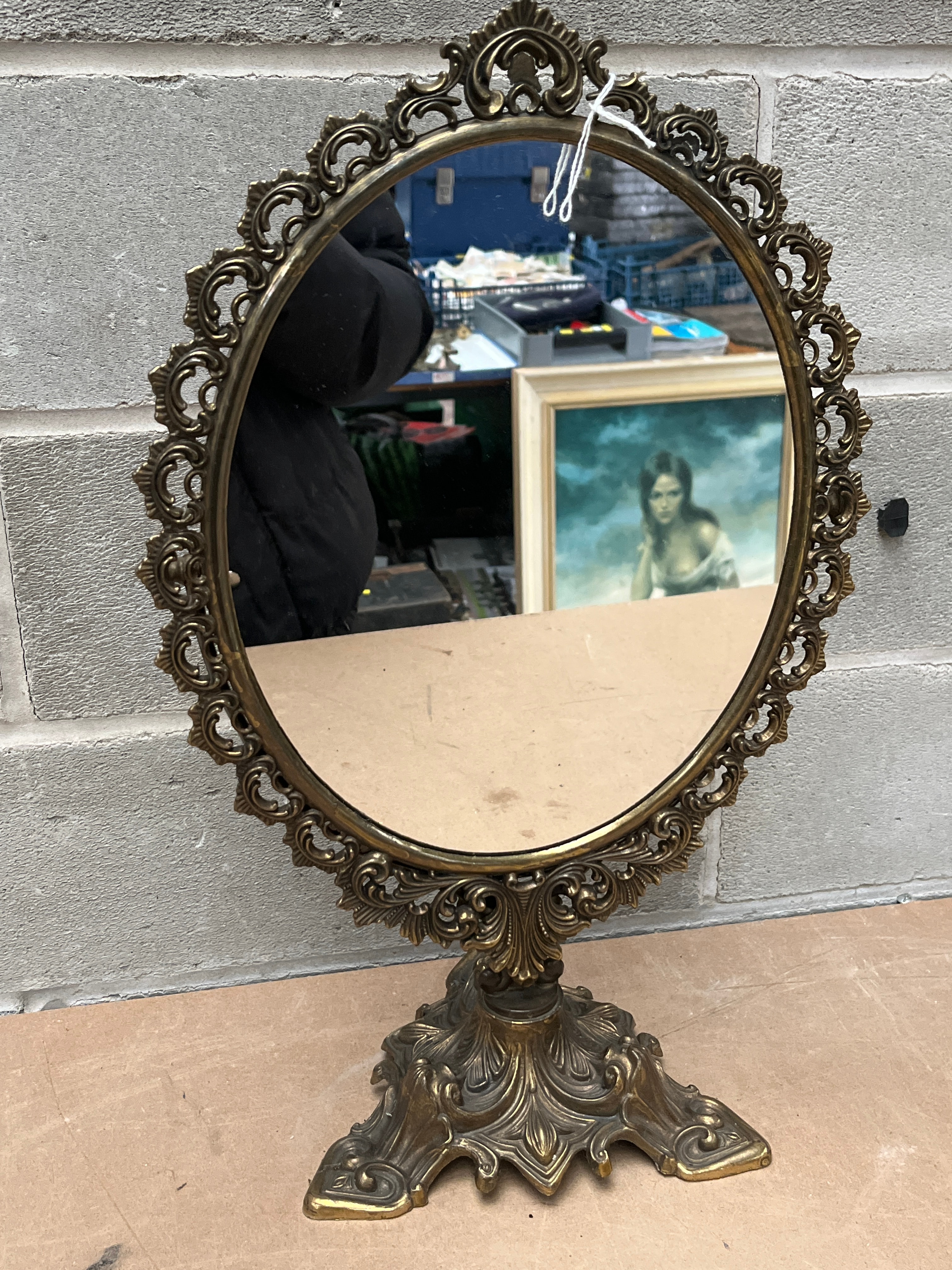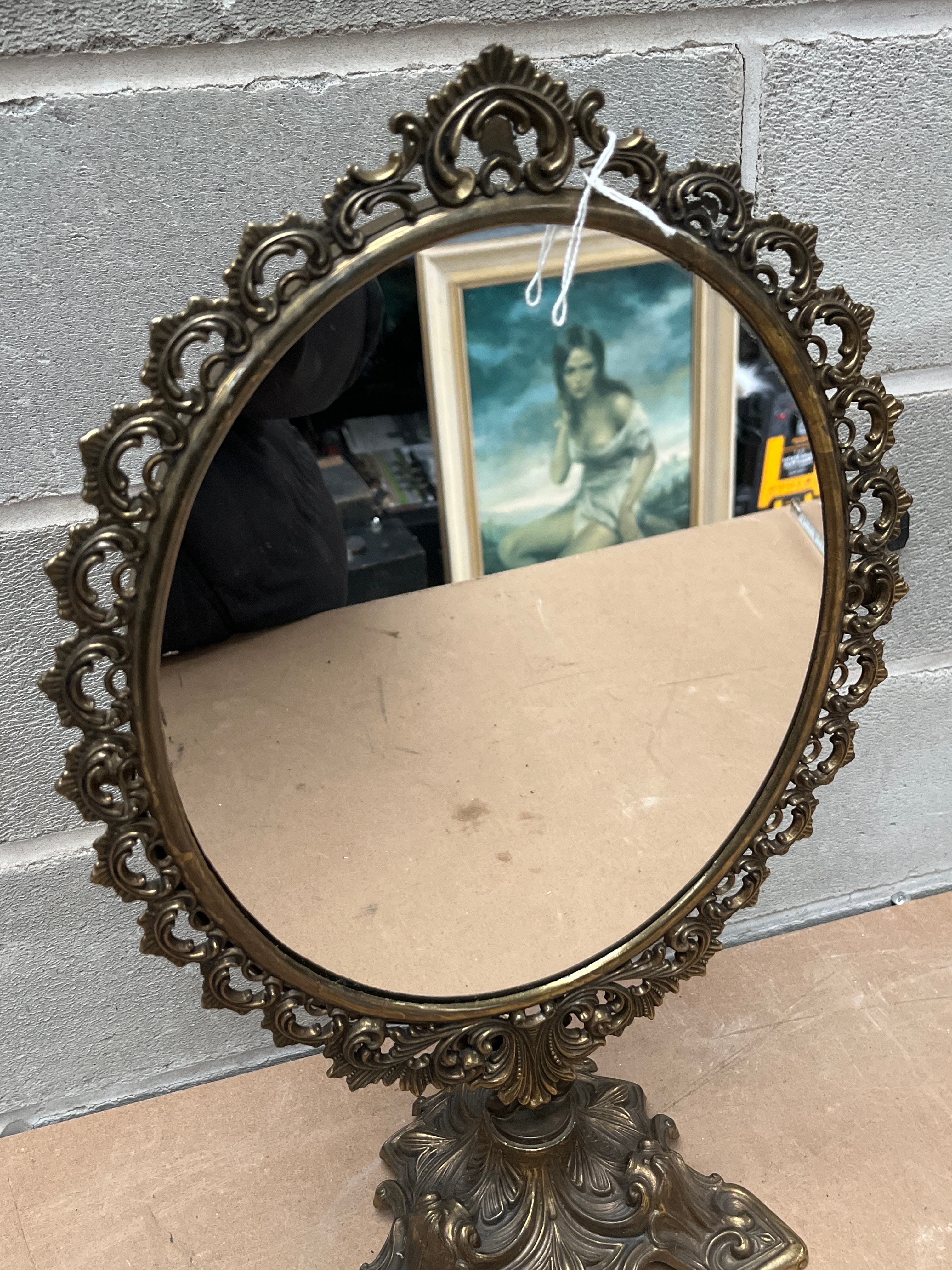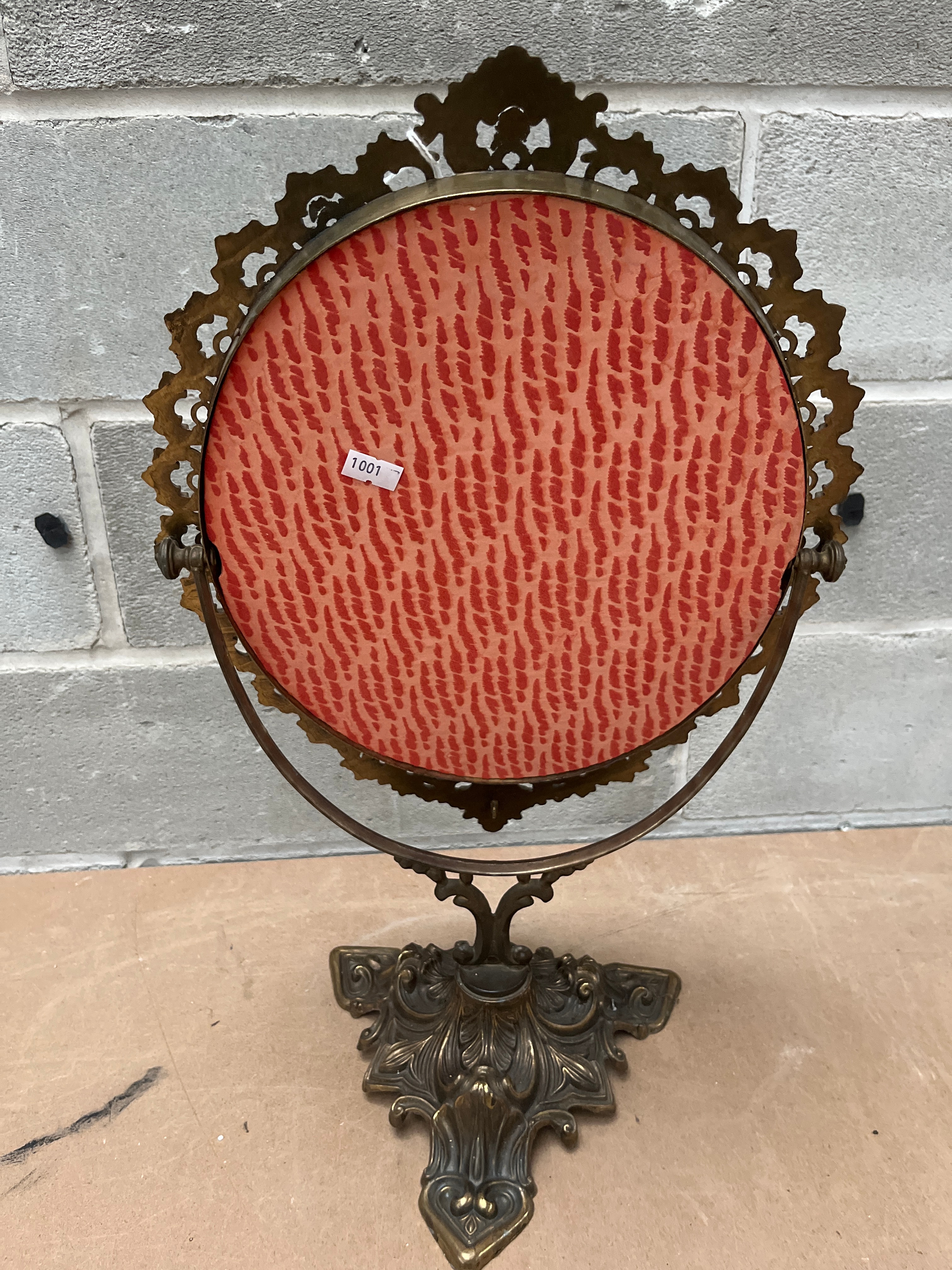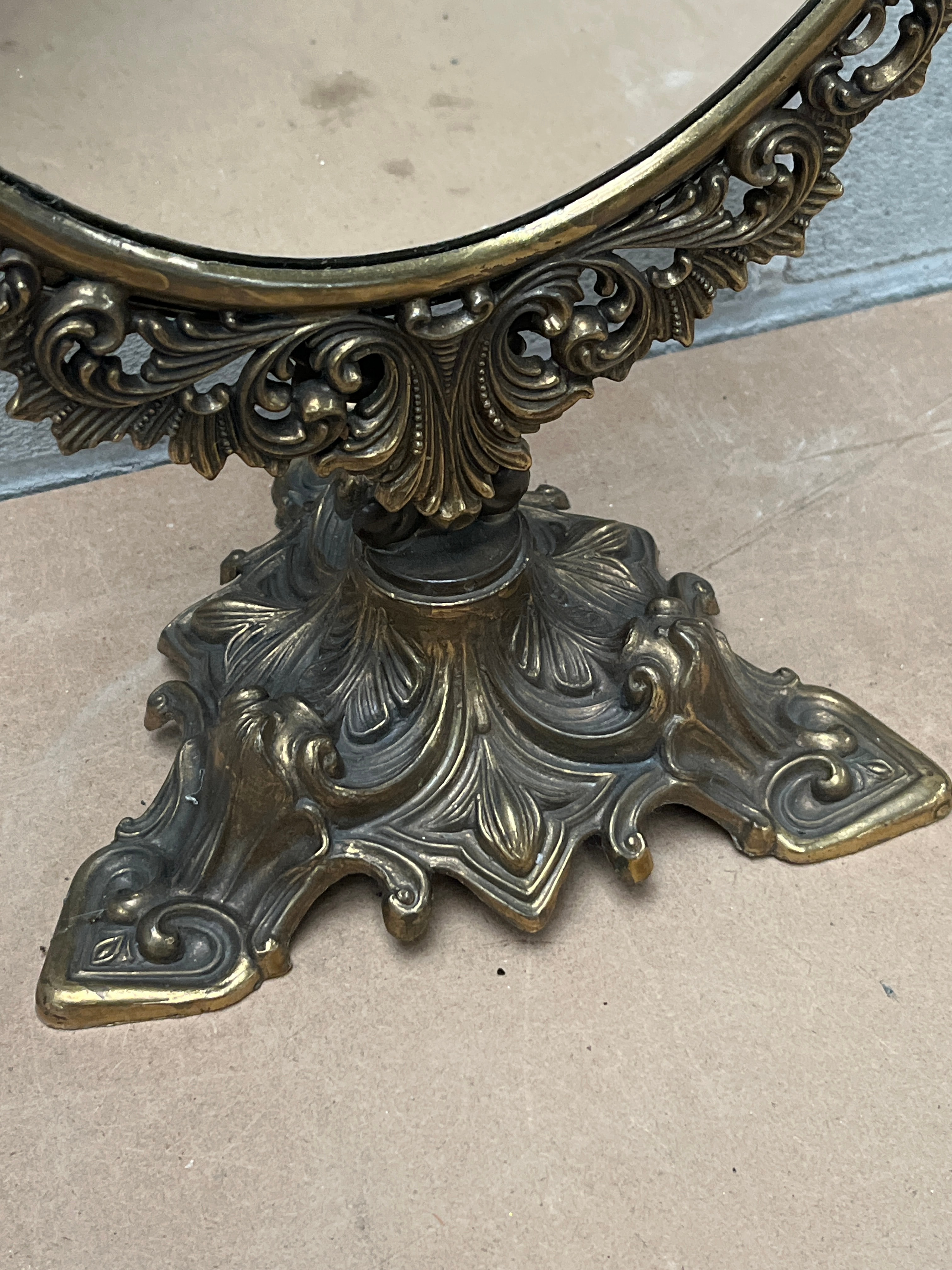 This ornate, vintage-style table mirror features an oval mirror set within a highly decorative, scrolled cast metal frame, appearing to be a gilt-metal alloy with an aged patina. The frame and its substantial, tripartite base exhibit intricate Rococo-inspired flourishes and naturalistic motifs, consistent with Victorian-era reproductions. A small white label with the number “1001” is affixed to the reverse side.