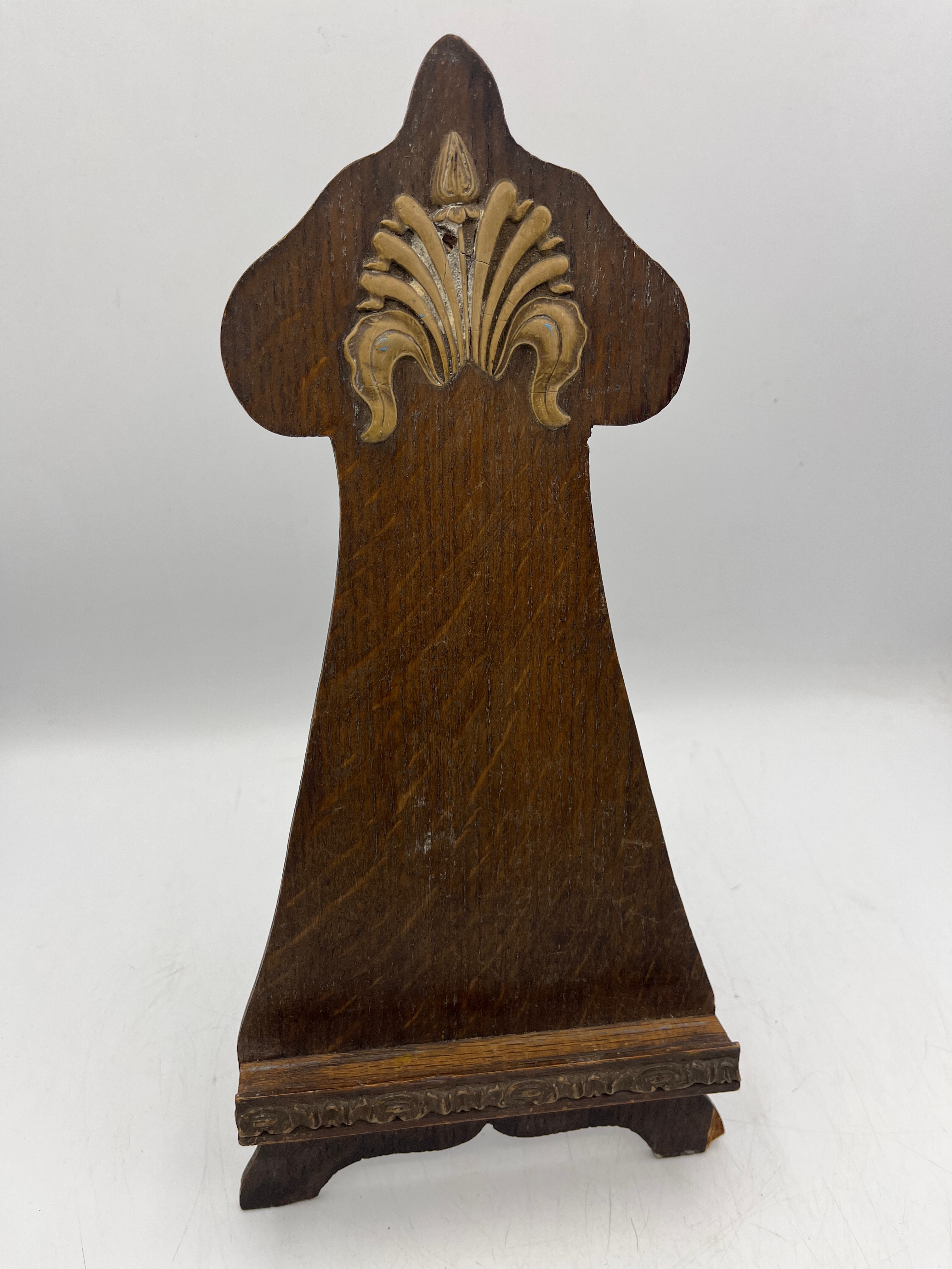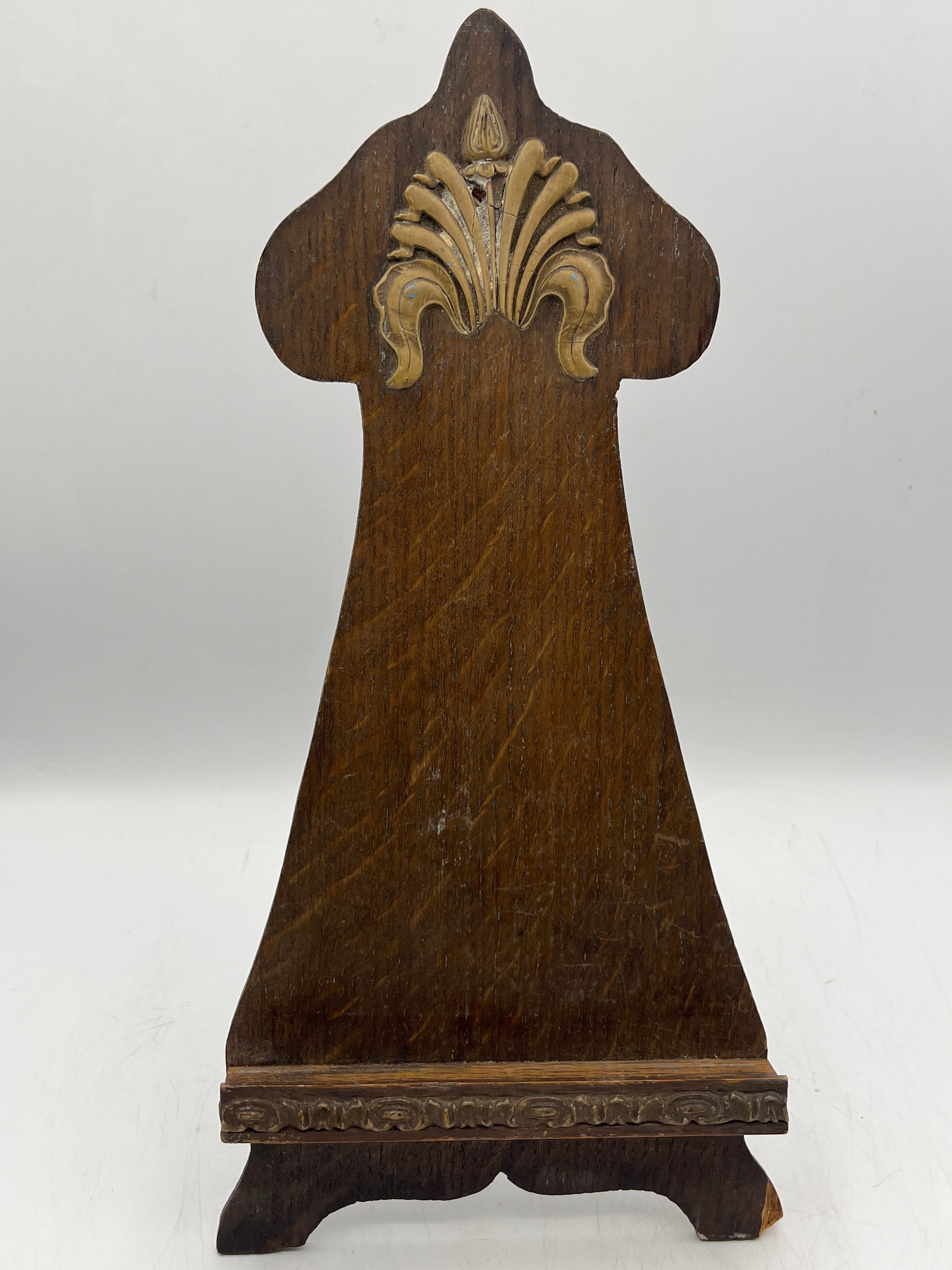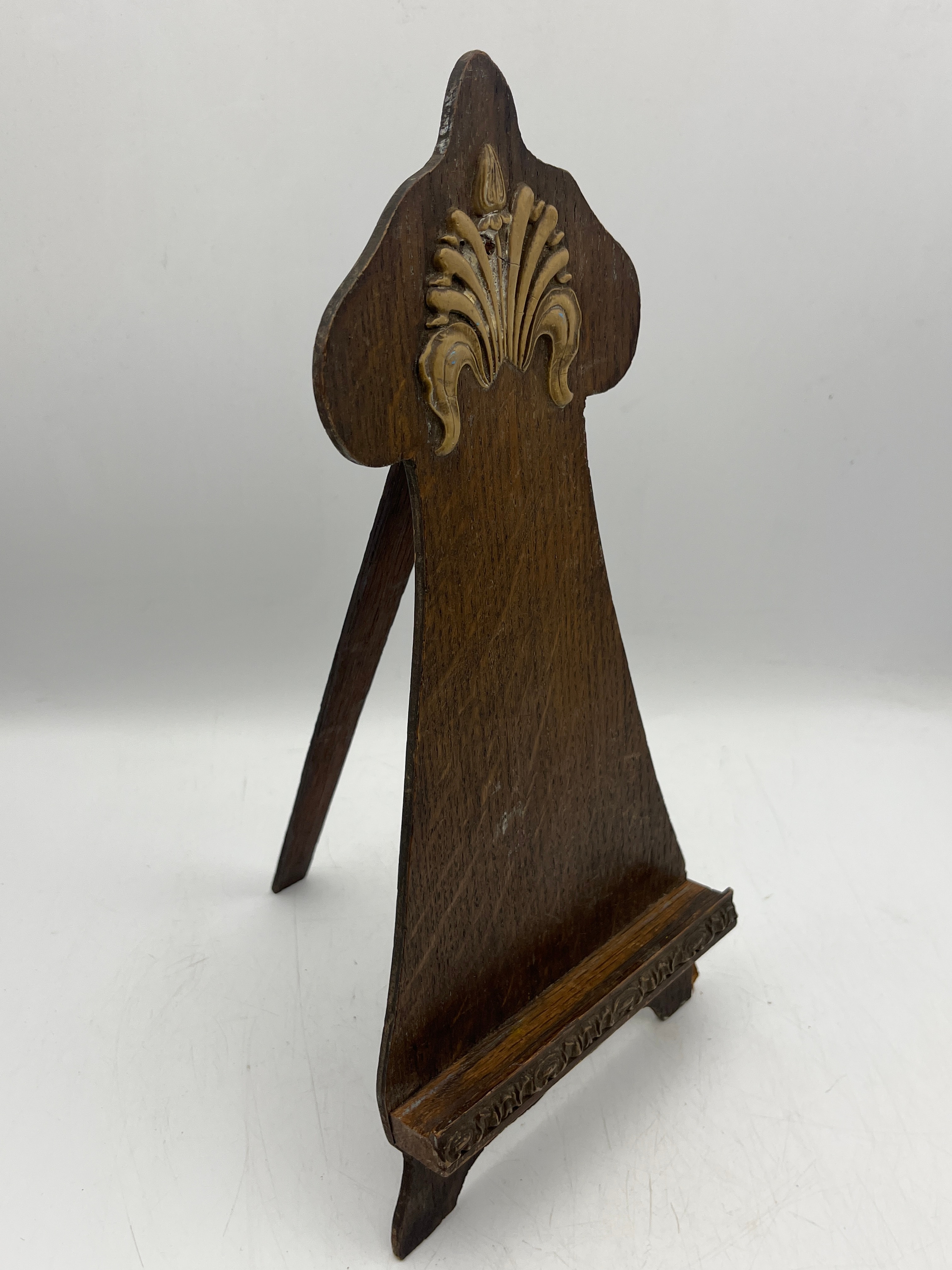 A late 19th/early 20th century Arts and Crafts carved oak napkin or letter holder. This collapsible wooden item is constructed primarily of dark-stained, possibly quarter-sawn oak, and features an upright panel with a simple rectilinear base and a shelf. The top of the panel is adorned with a lighter-toned, decorative carved wood or gesso appliqué featuring a stylized floral or shell motif. While identified by market consensus as a napkin or letter holder, its form also allows for use as a small display easel or plate stand.