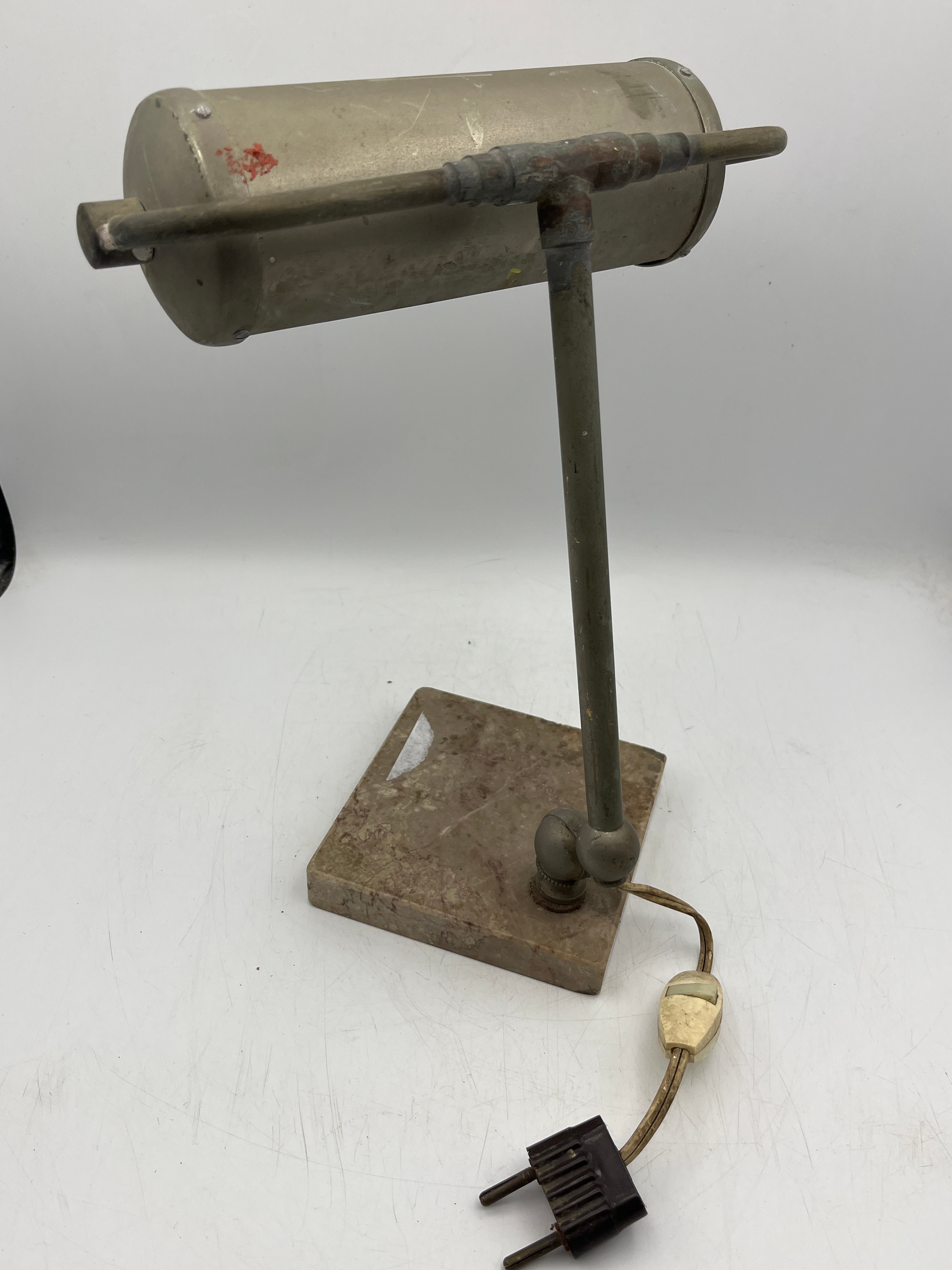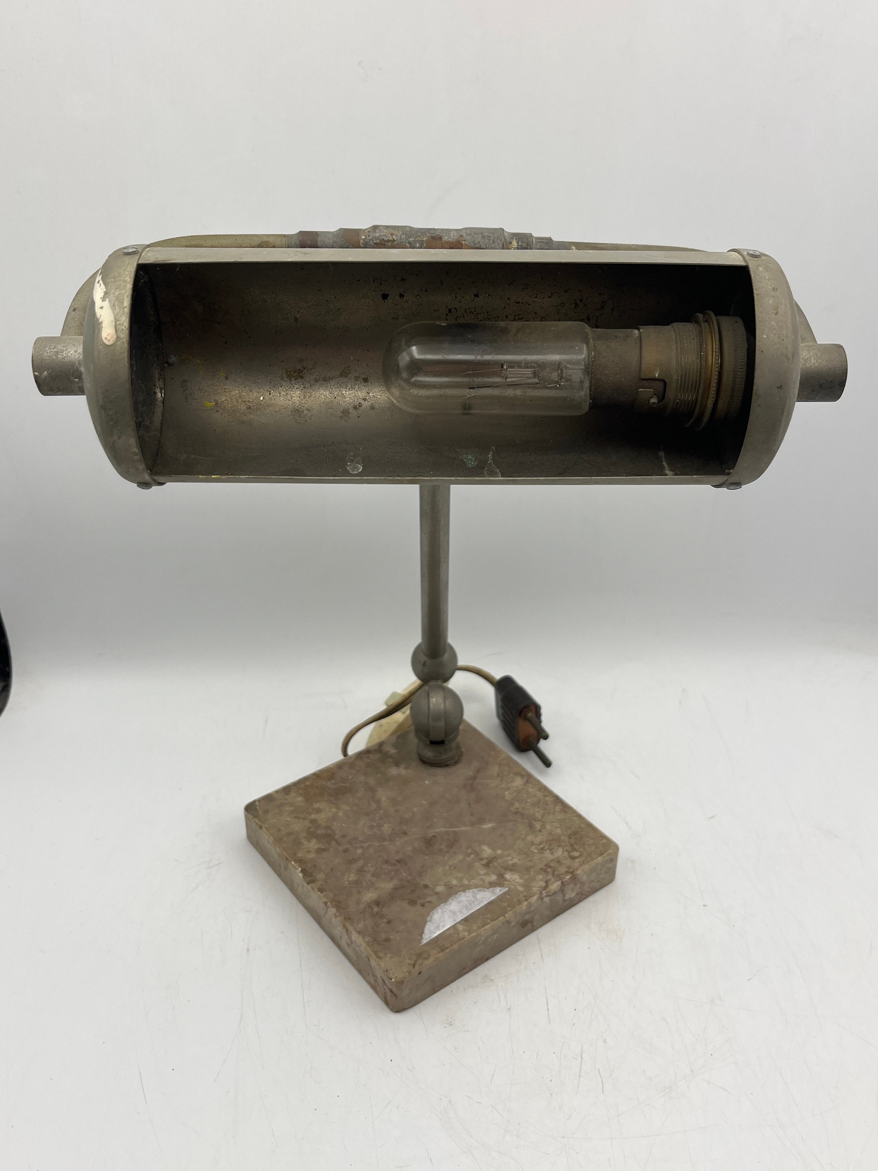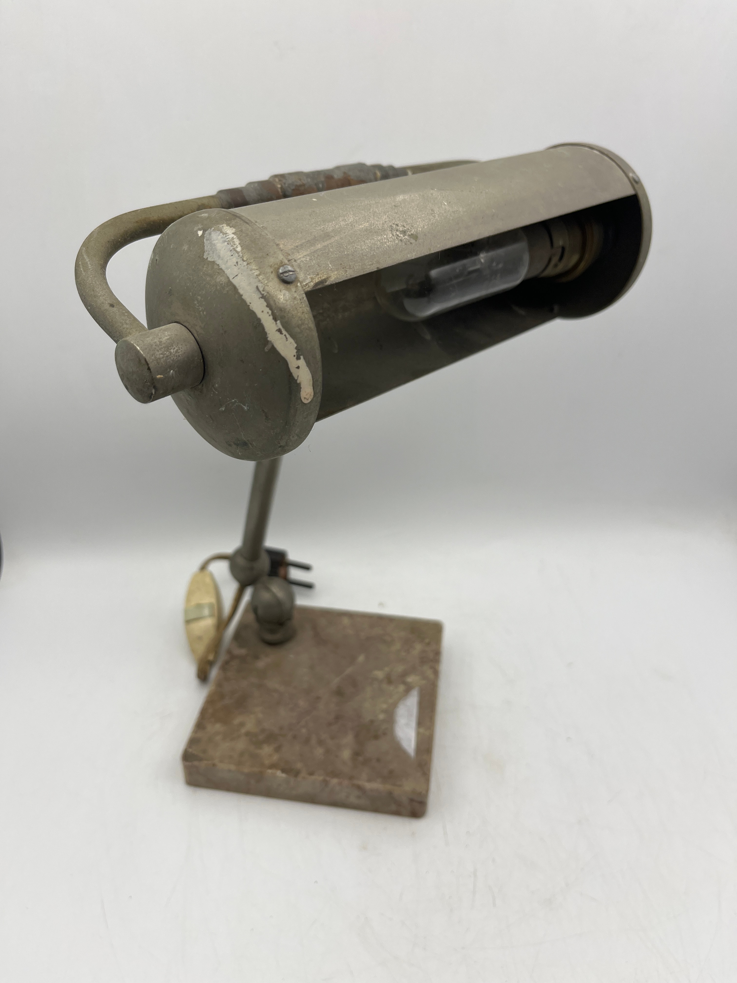 This early to mid-20th century utilitarian or industrial-style desk lamp features an elongated, cylindrical metal shade housing an internal tubular incandescent bulb. The shade is supported by a metal stem and an articulating arm, set into a rectangular, mottled brown stone base, likely marble or granite. The lamp is fitted with a textile-covered electrical cord, an inline off-white plastic or bakelite switch, and a dark brown European two-prong plug. A light-colored rectangular patch, possibly old label residue, is visible on the base.