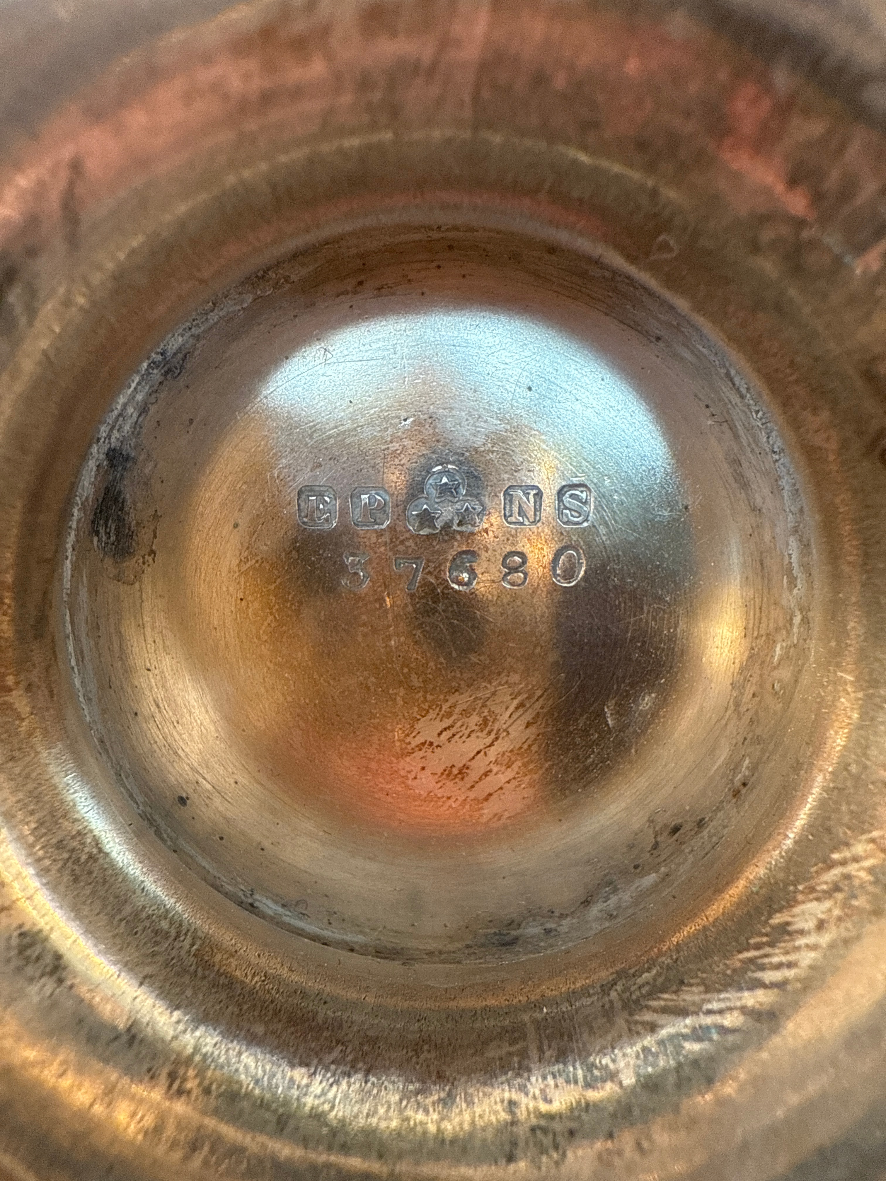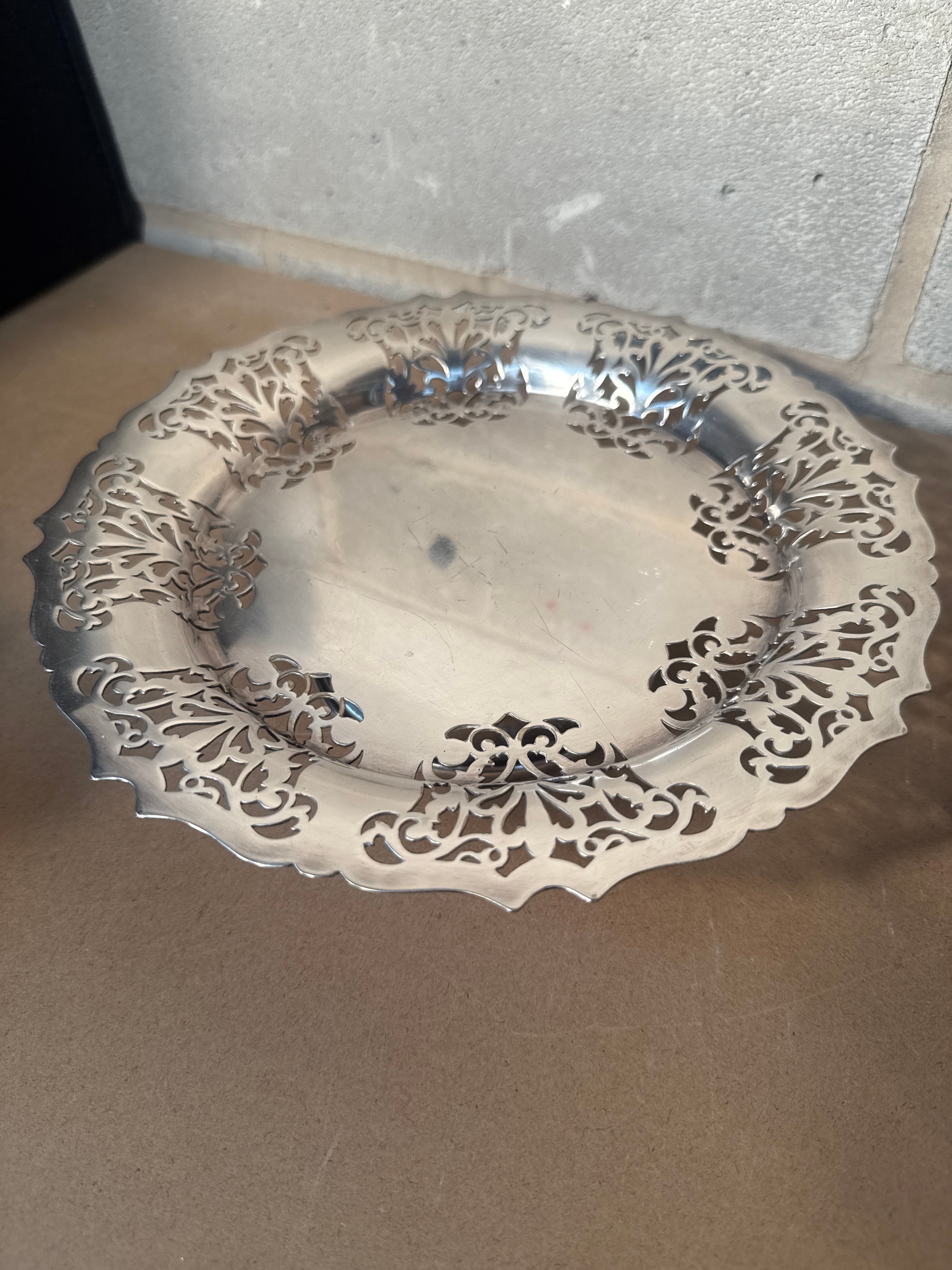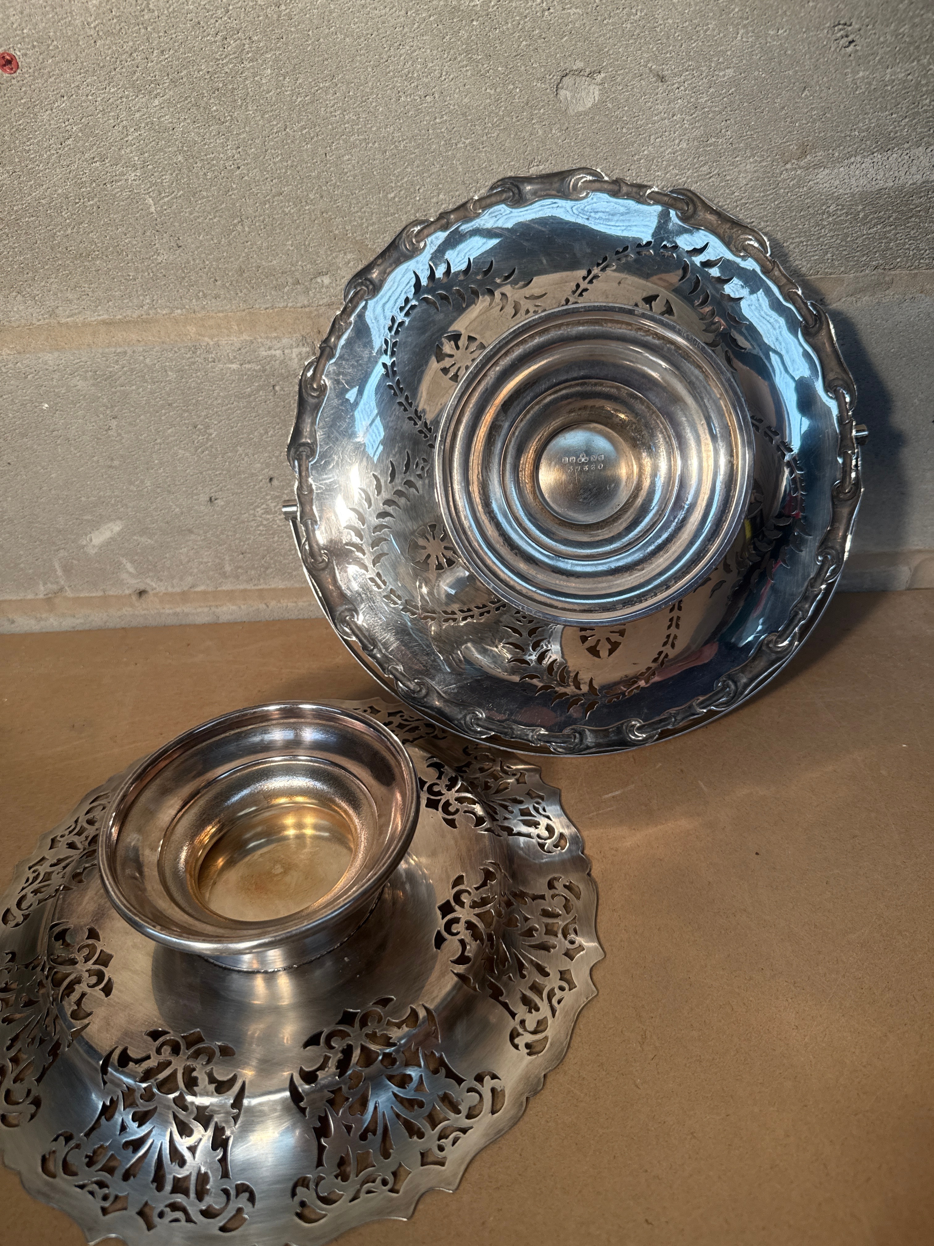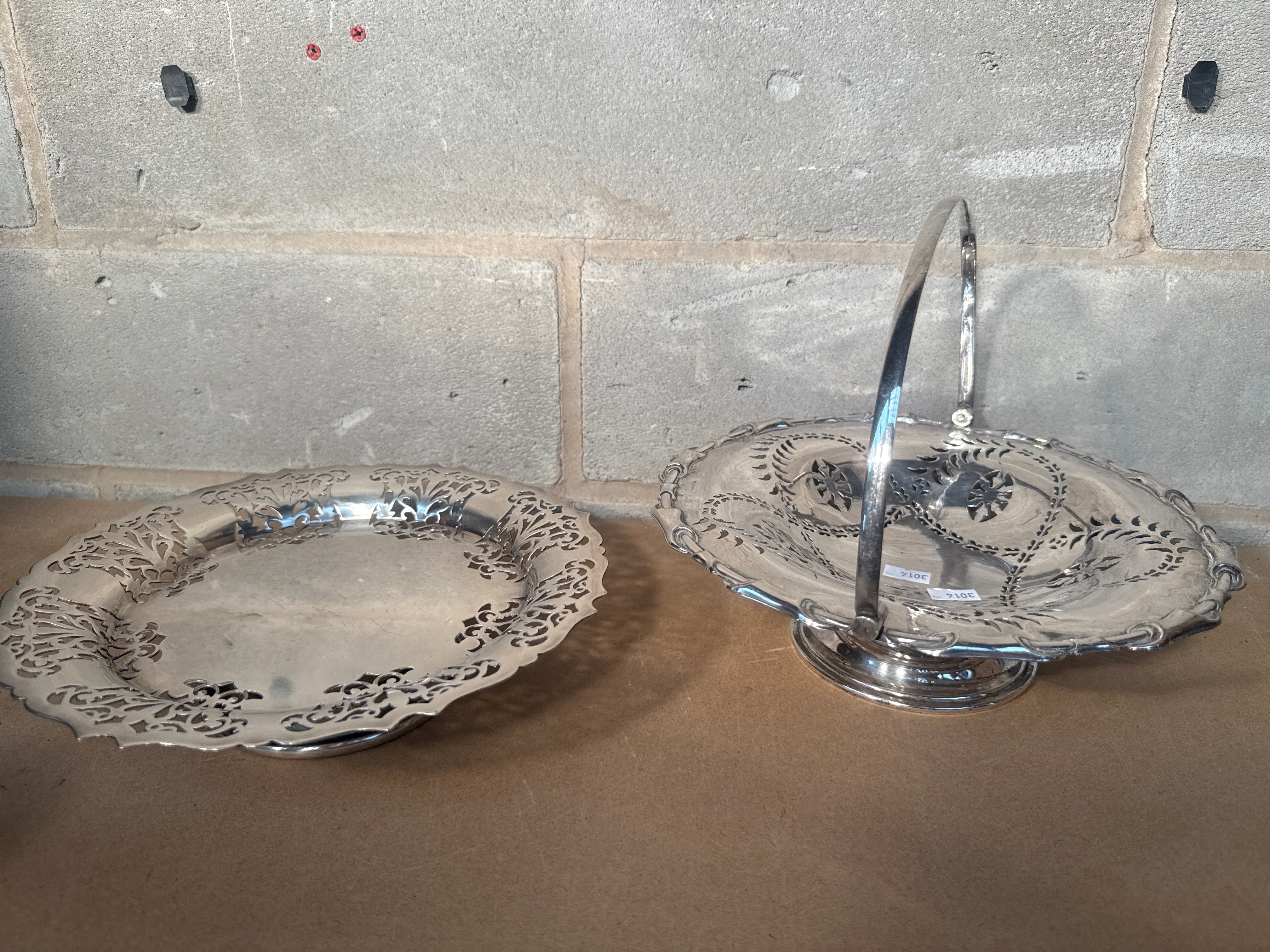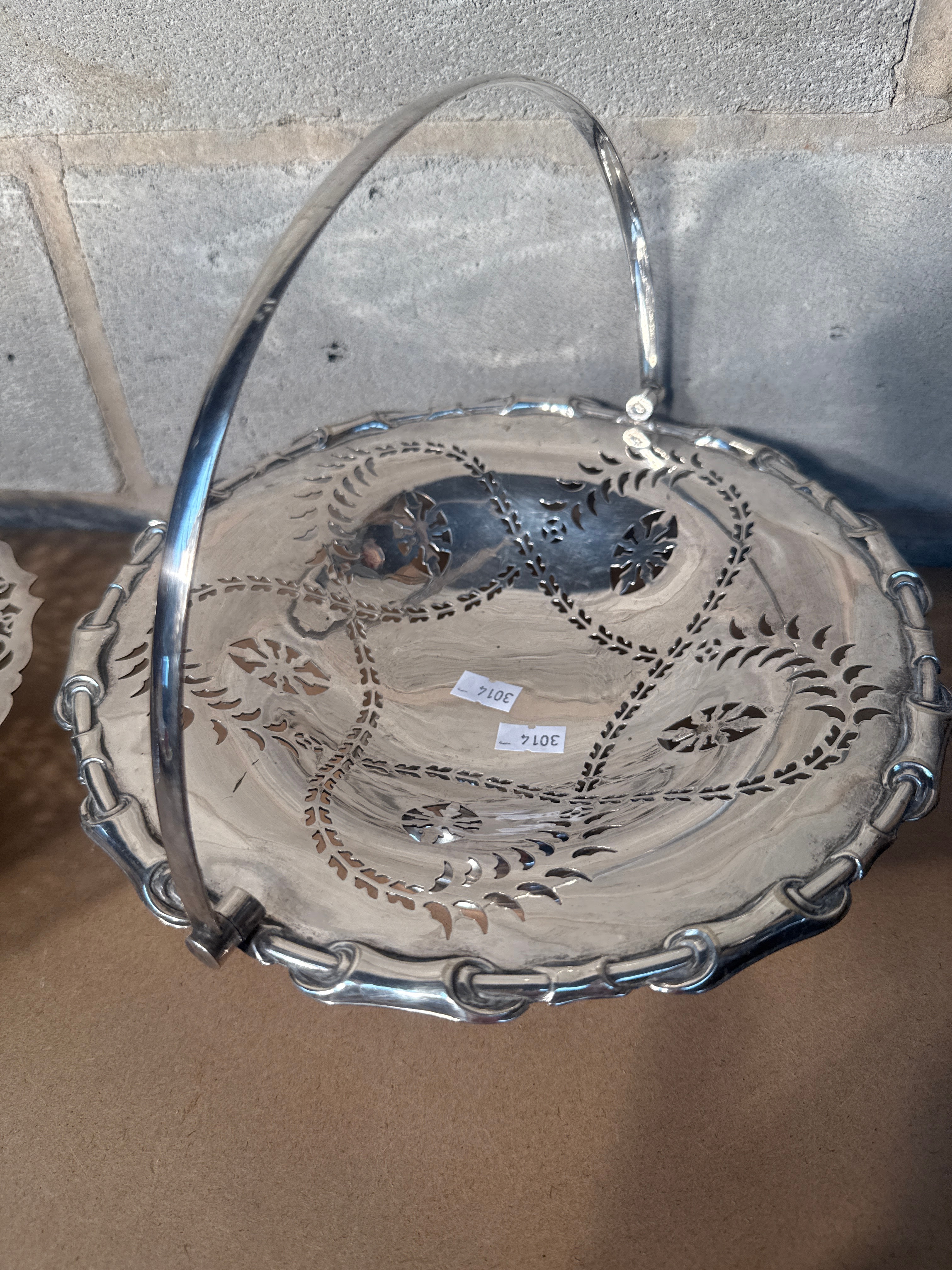 A pair of matching electroplated Britannia new silver (EPBNS) decorative serving pieces, comprising a pierced swing-handle basket on a footed base and a complementary pierced footed dish. Both items are circular with scalloped edges and feature intricate pierced scrollwork and floral motifs adorning the rim and central area. A clear hallmark on the underside of the basket reads “EPBNS”, followed by the serial number “37680”. White adhesive labels marked “3014” are affixed to the interior of the basket.