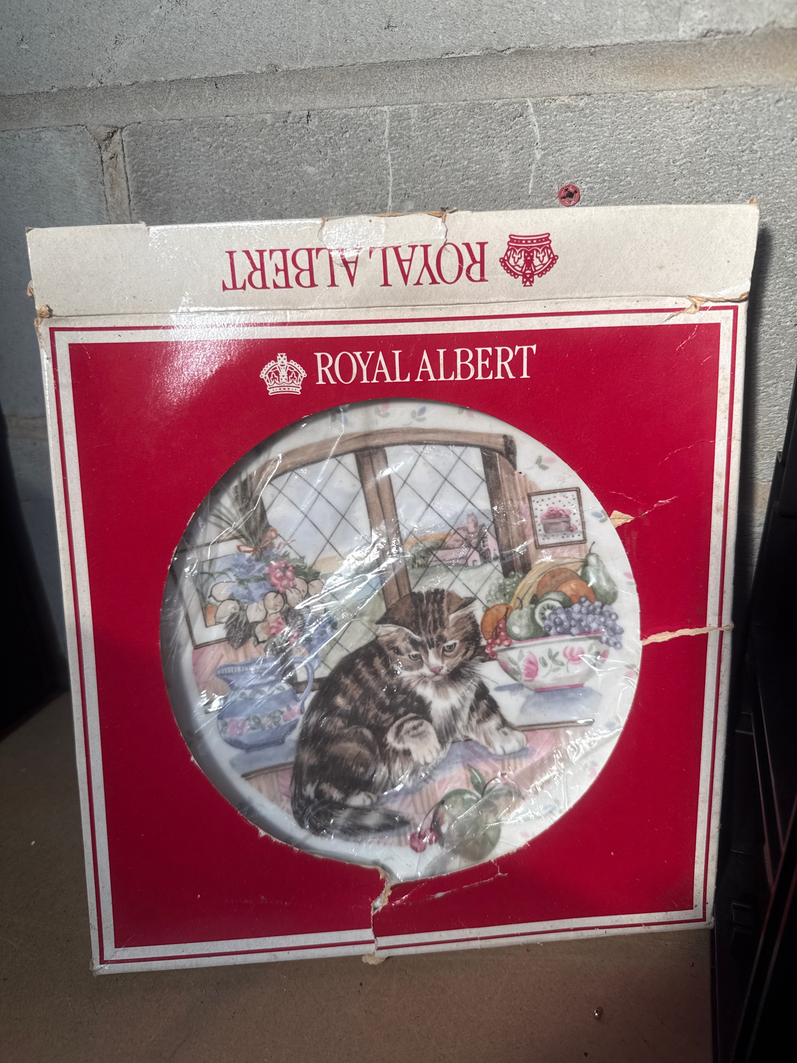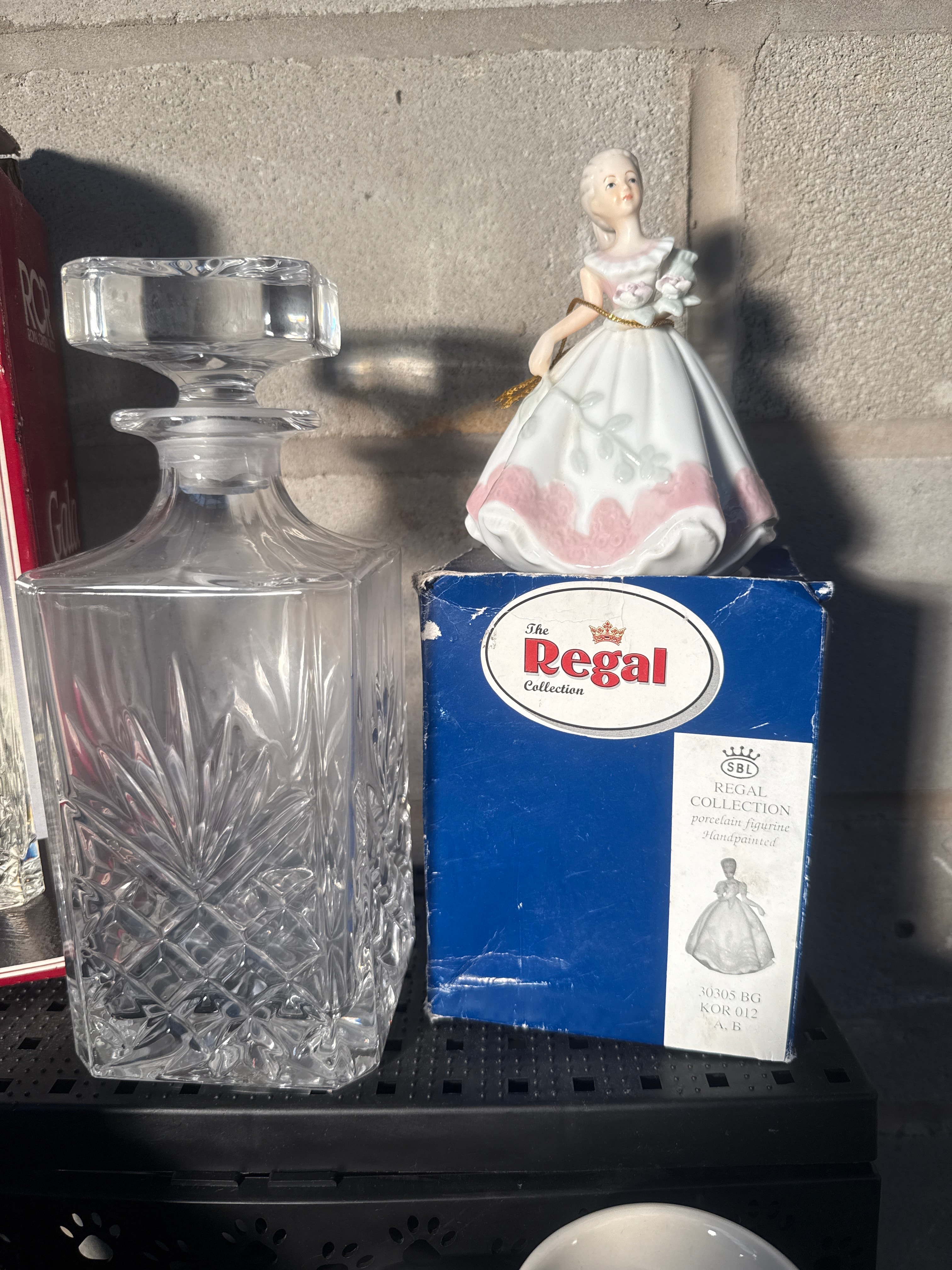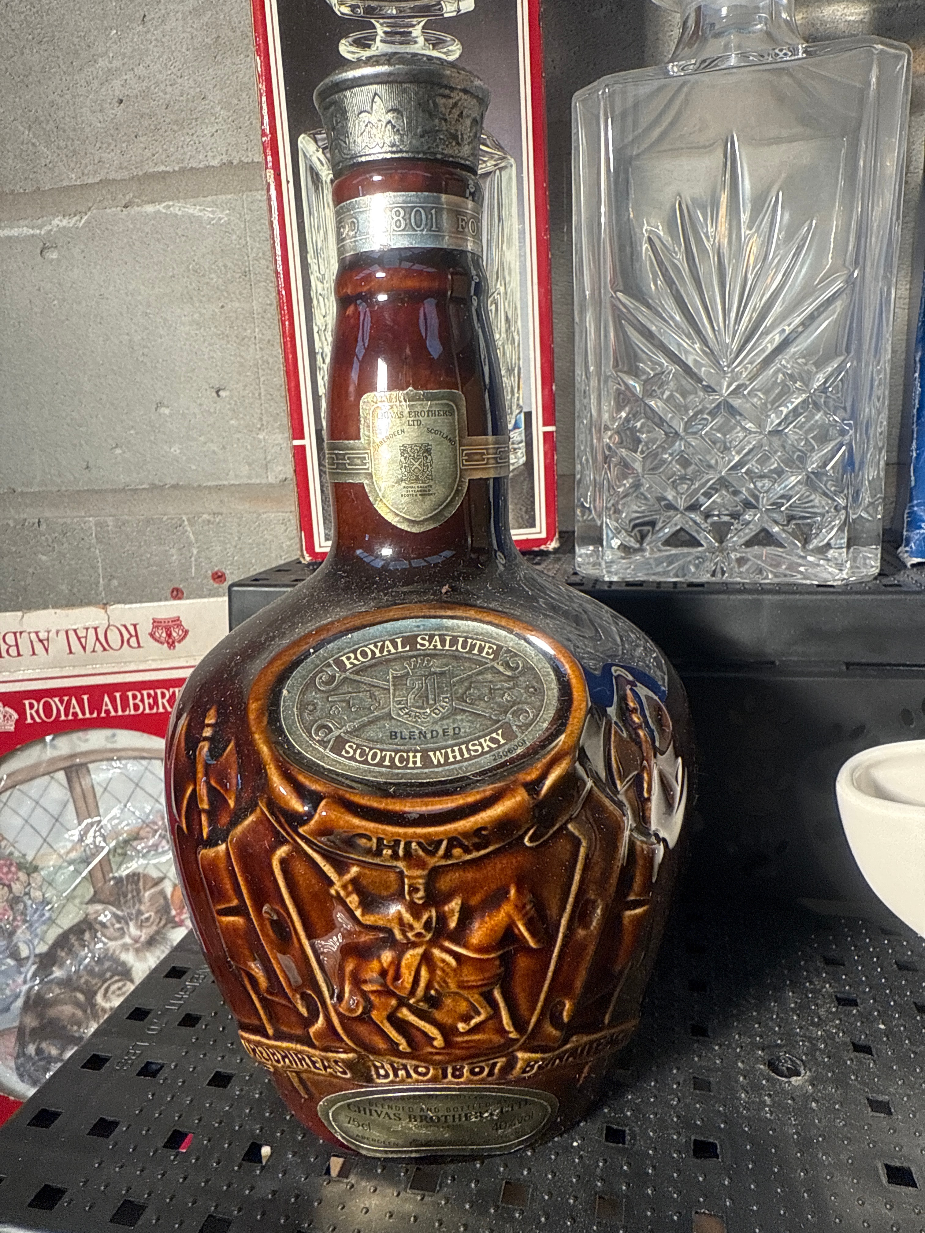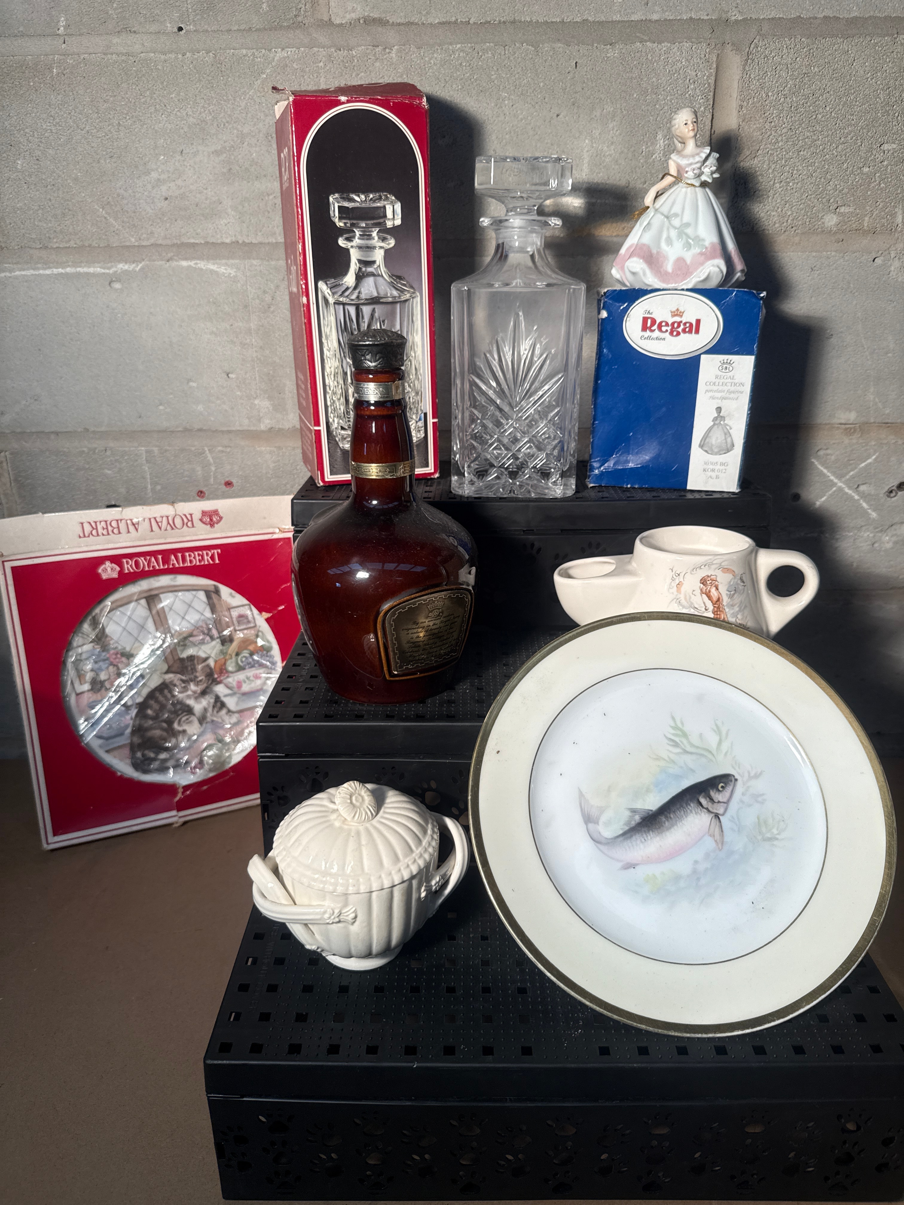 A collection of decorative and functional items, led by a white ceramic plate adorned with a hand-painted fish motif, identified through web intelligence as Minton. The collection also includes a prominent dark brown stoneware bottle, embossed with equestrian scenes and visible text including “ROYAL SALUTE BLENDED SCOTCH WHISKY”, “CHIVAS REGAL”, “CHINA”, and “21 YEARS OLD”. Two clear glass decanters are present: one features a cut crystal pattern with a square stopper, and another, less ornate, is partially visible within a red presentation box. A porcelain figurine depicting a woman in a white and pink dress holding flowers stands beside a blue box marked “The Regal Collection” and “porcelain figurine handpainted”. Additionally, a boxed ceramic collector’s plate, marked “ROYAL ALBERT” and featuring a tabby kitten, is included. Completing the grouping are a smaller white ceramic lidded vessel, a white ceramic item with a handle and two compartments, and the aforementioned Minton fish plate.