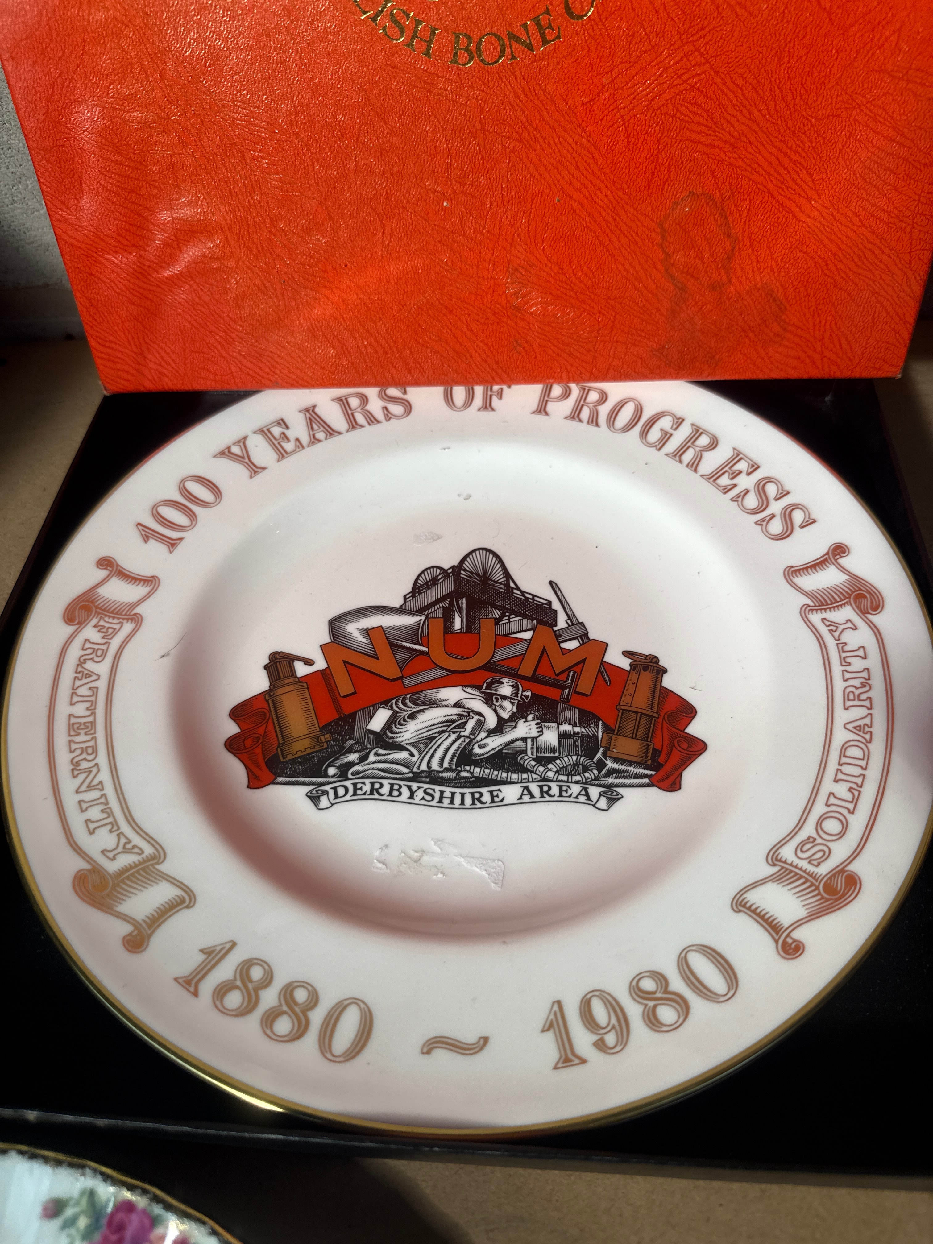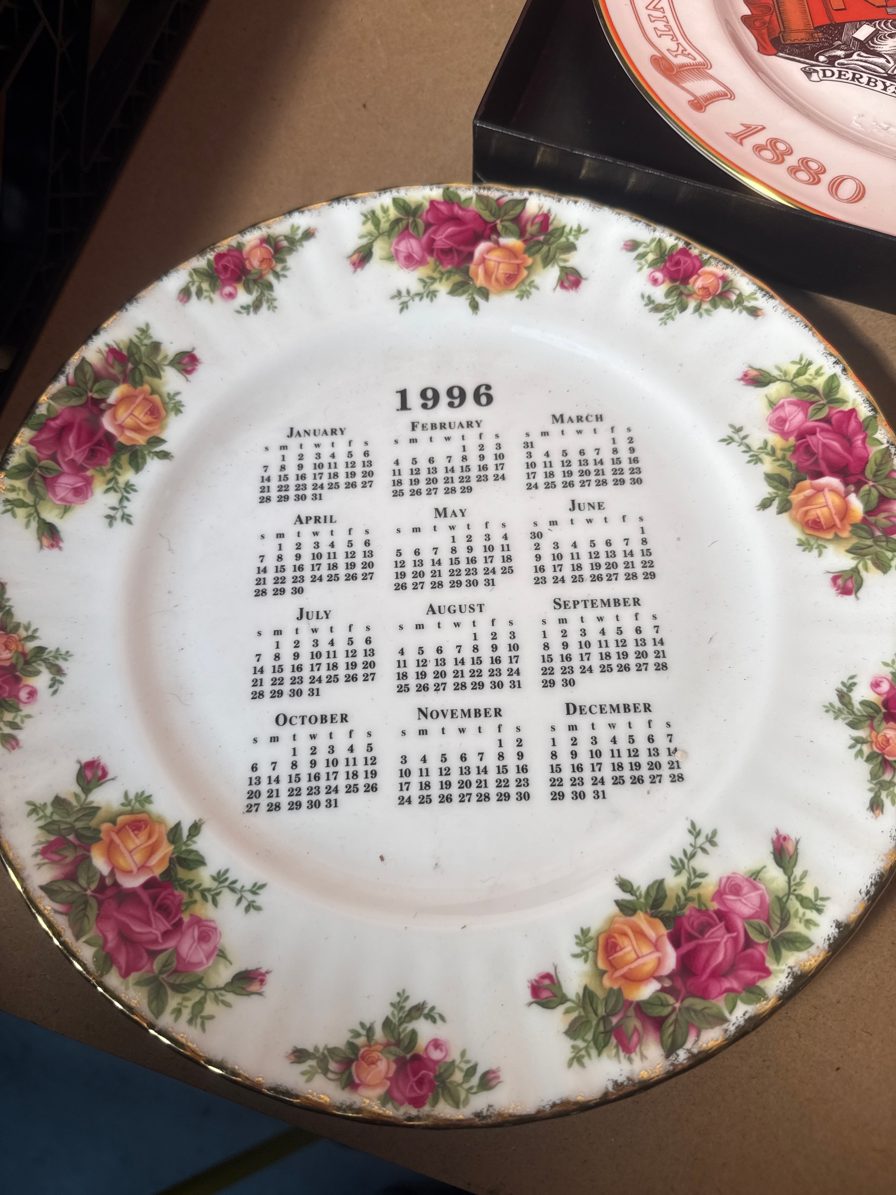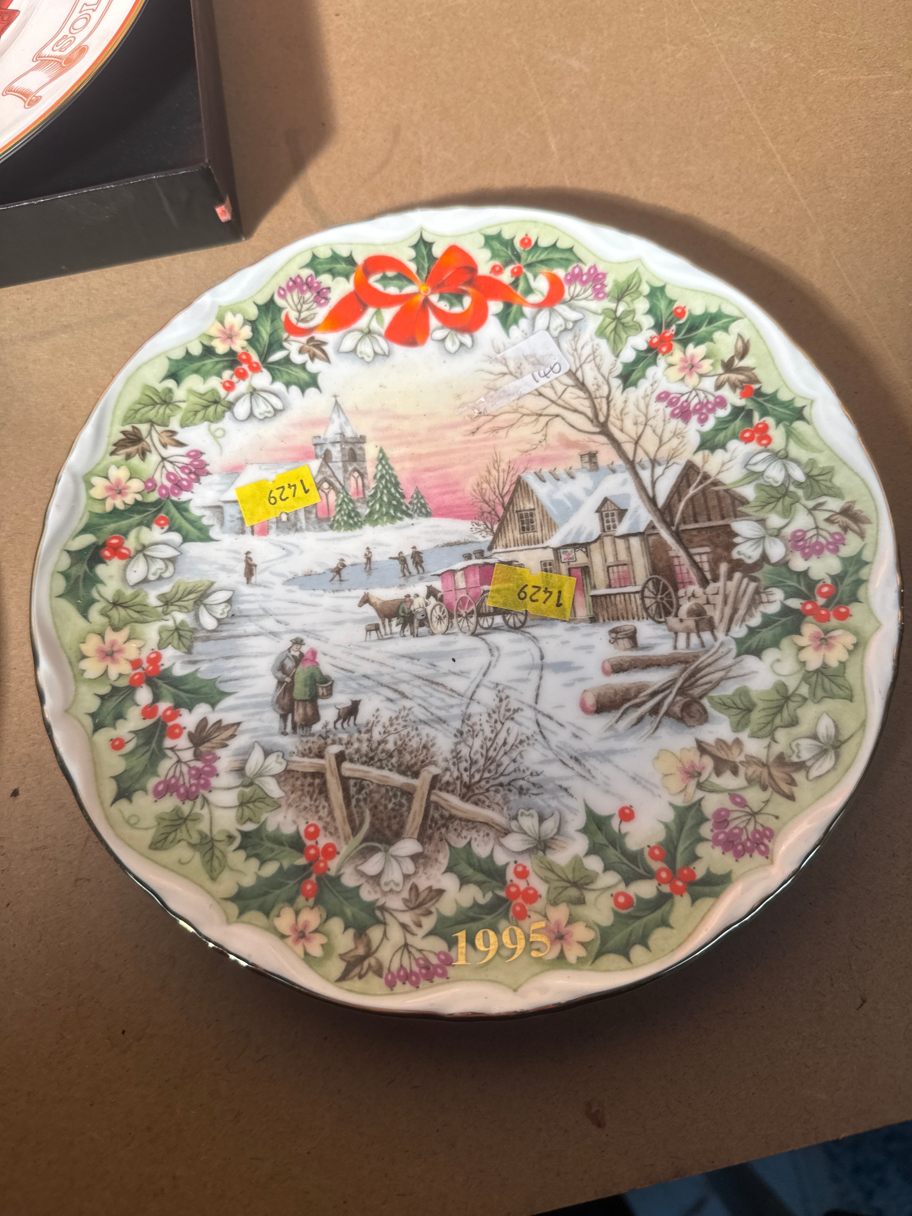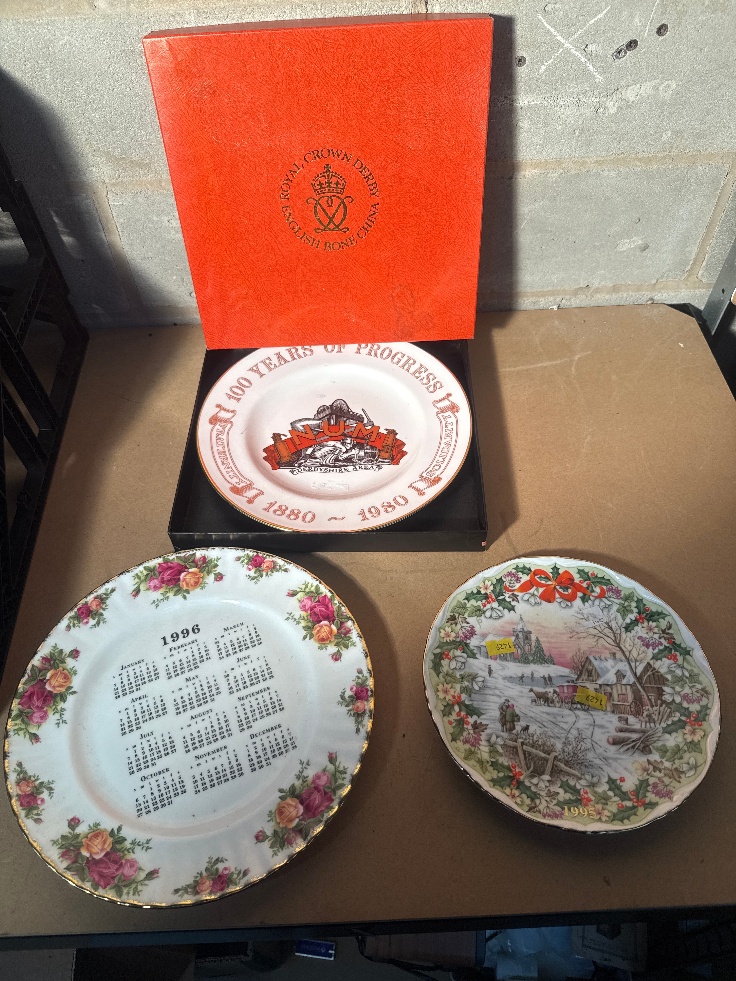 A group of three decorative ceramic plates. The first, housed in its original red “ROYAL CROWN DERBY ENGLISH BONE CHINA” box with a royal crest, is a commemorative plate marked “100 YEARS OF PROGRESS” from “1880 ~ 1980.” It features “NUM DERBYSHIRE AREA” centrally, bordered by “FRATERNITY” and “SOLIDARITY,” all with a gold rim. The second plate is a 1996 calendar plate adorned with a floral design of pink and yellow roses and green foliage, also featuring a gold rim. The third plate depicts a 1995 winter village scene with a church, figures, and houses, encircled by a border of holly and white flowers, and bears two yellow stickers marked “1429.”