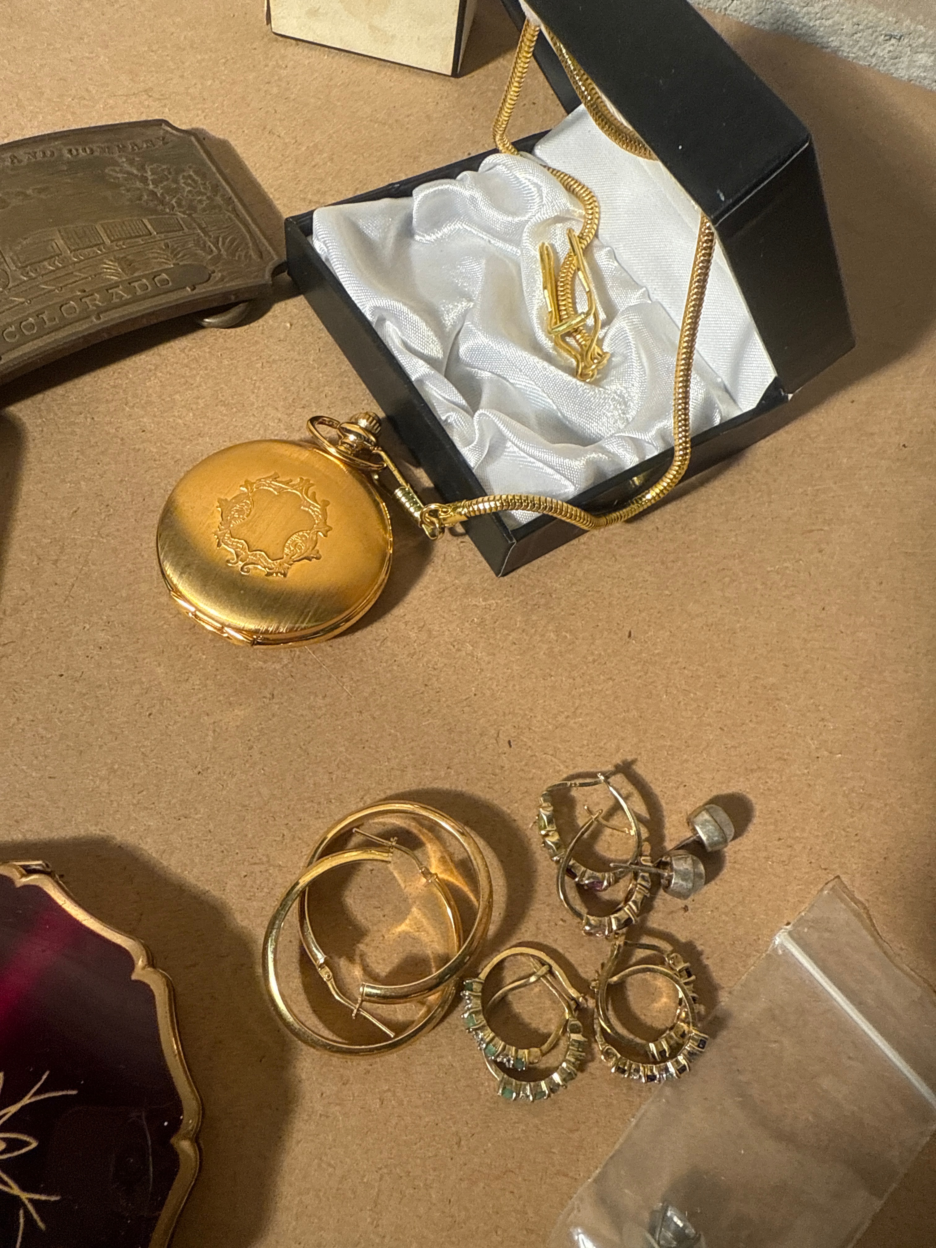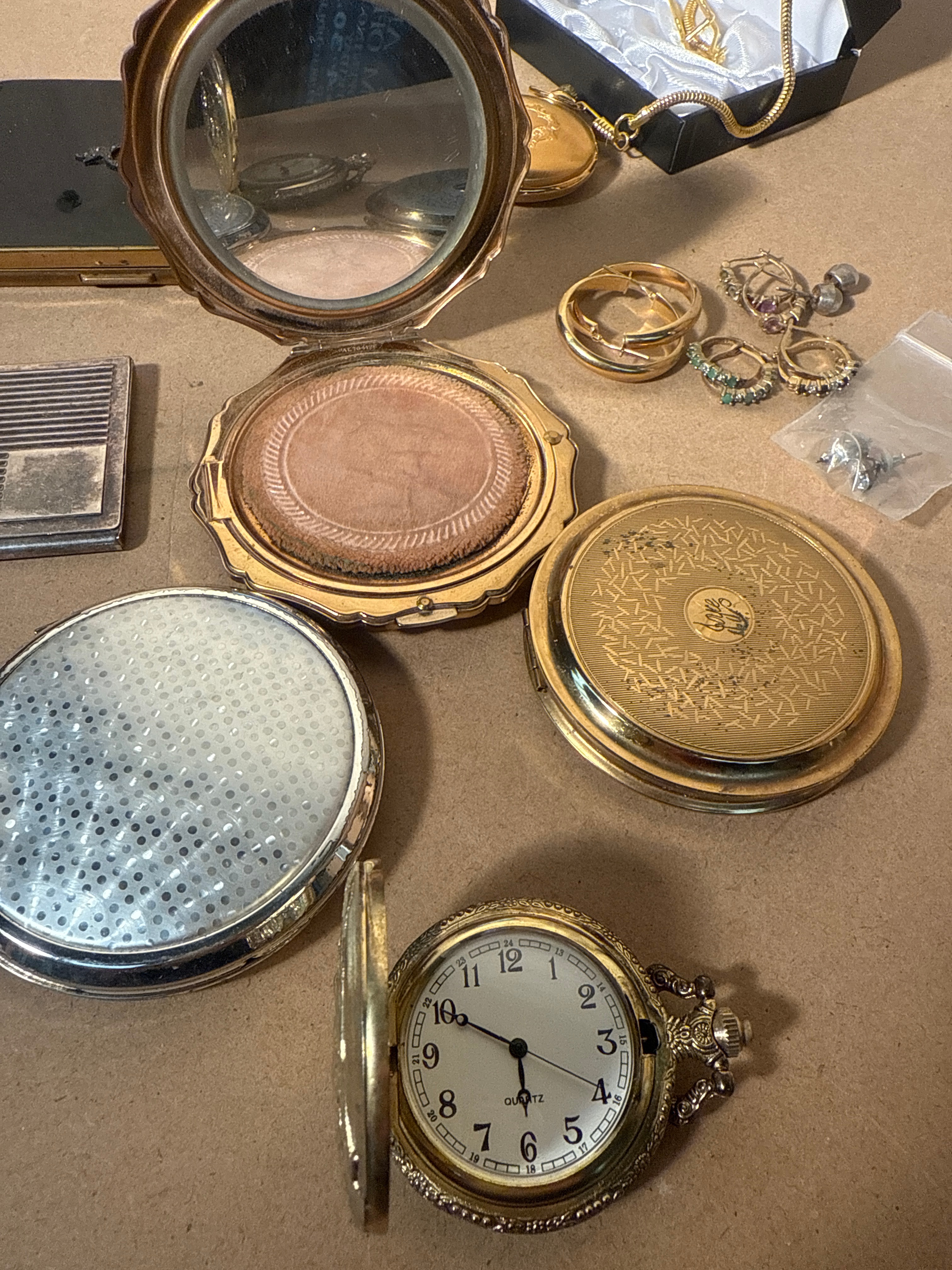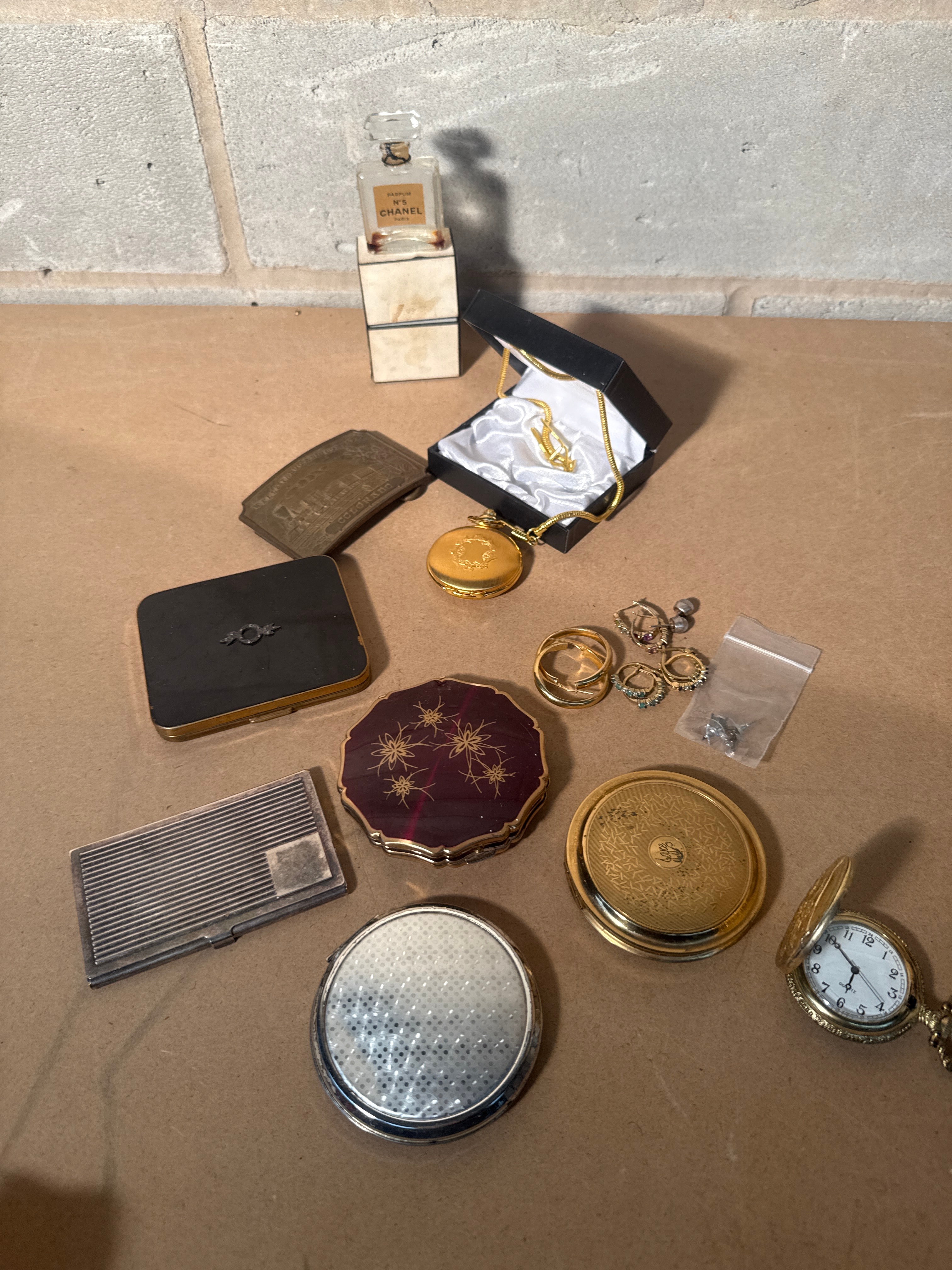 A collection of vintage and contemporary accessories, highlighted by a Stratton Floral Compact, circular in form with a maroon ground and a starburst floral design. The lot also includes a small Chanel No. 5 perfume bottle in its original box, and a rectangular brass-toned belt buckle featuring a “Colorado” landscape motif. Further compacts comprise a rectangular black example with gold-toned accents, two silver-toned examples (one ribbed, one with a textured lid), and two ornate gold-toned circular examples, one open revealing a powder puff. The collection is completed by a group of gold-toned rings and earrings, some set with small colored stones, a small bag of loose metal findings, a prominent gold-toned quartz pocket watch with a hinged, engraved case, and a gold-toned chain necklace with a stylized ‘V’-shaped pendant presented in a black box.