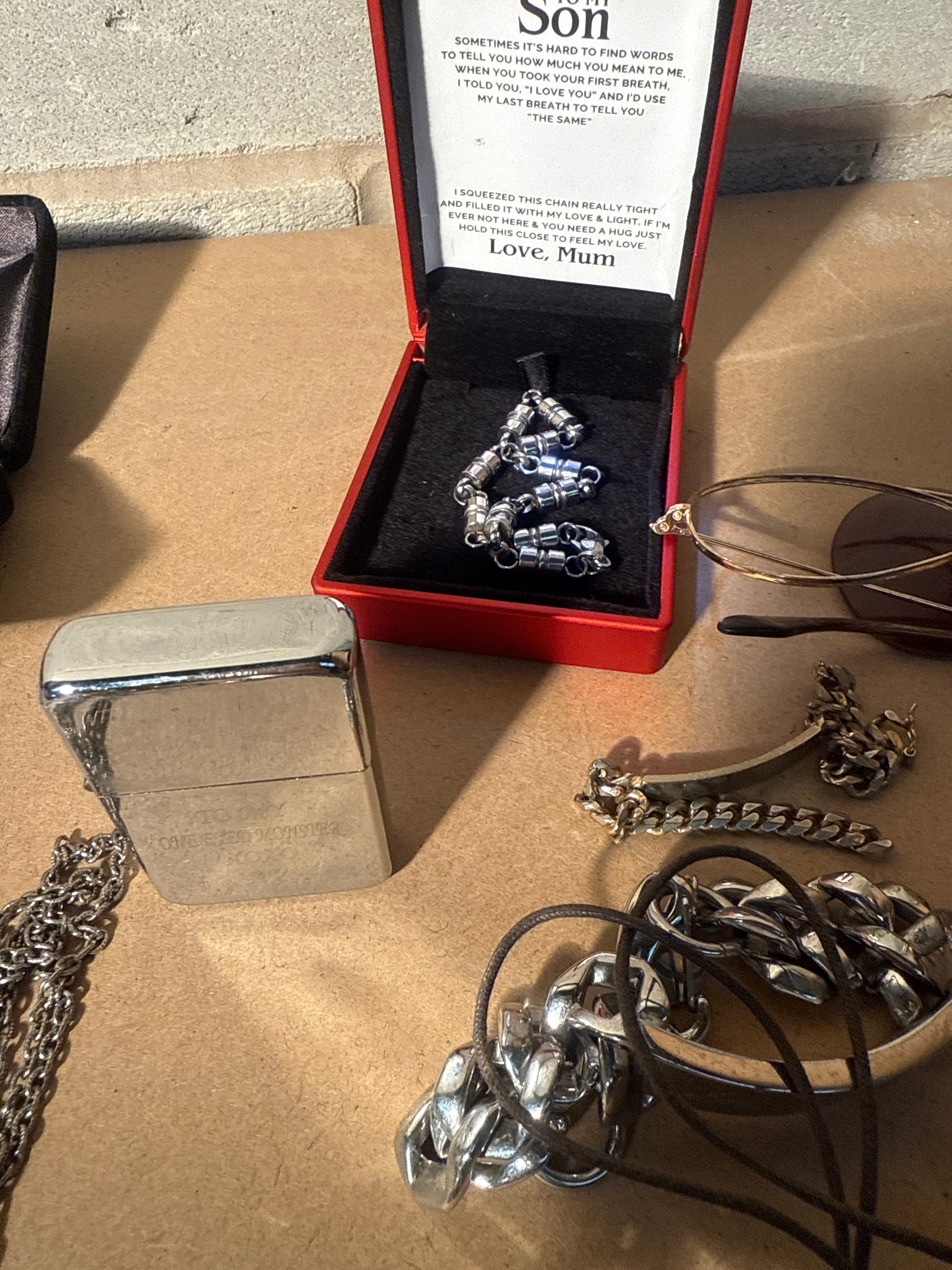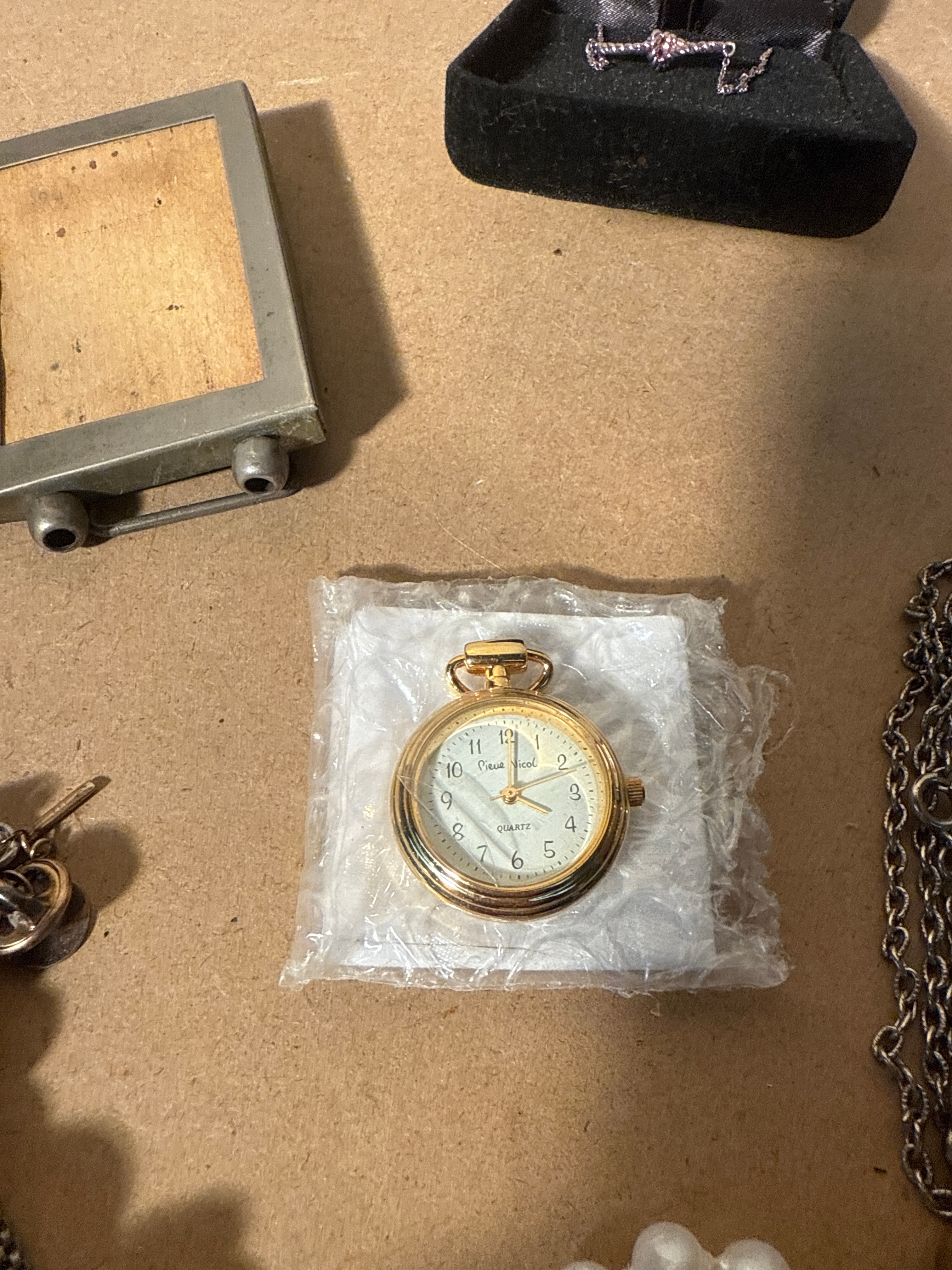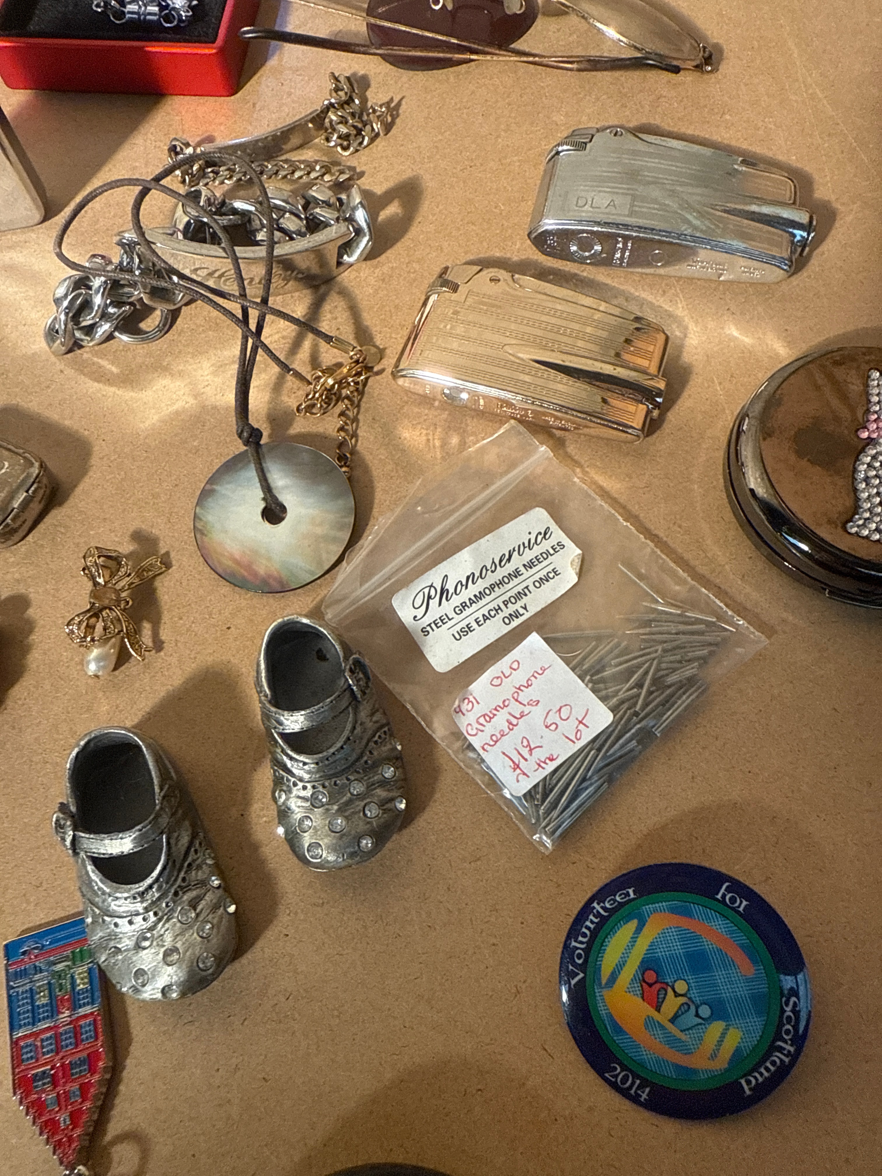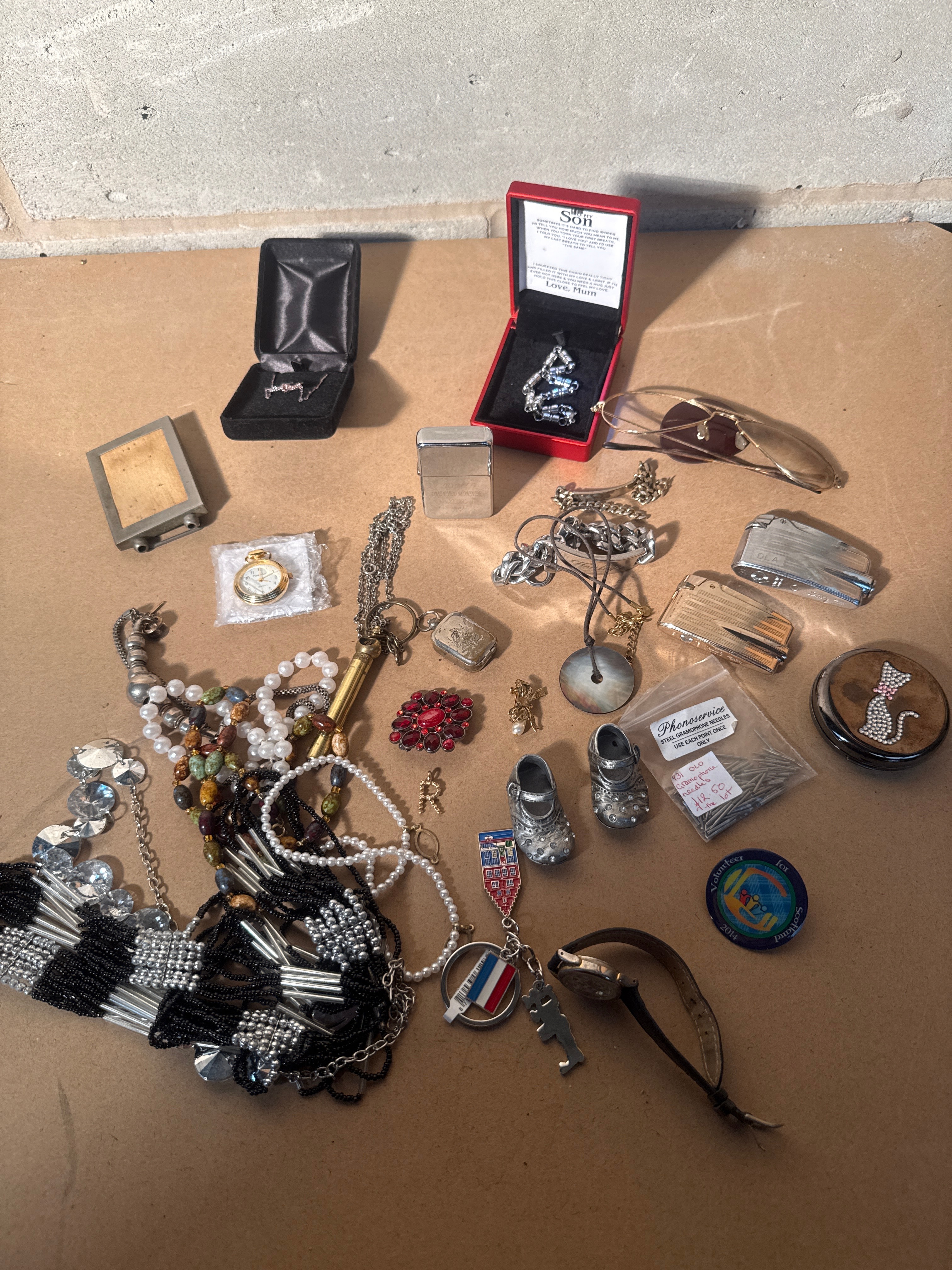 This varied collection, characteristic of a “junk drawer” lot, comprises an assortment of personal accessories and small collectibles spanning vintage to contemporary periods. Items include numerous necklaces, some beaded with pearls or multi-colored stones, others featuring metal chains. A group of bracelets is present, notably one with magnetic clasps housed in a red box inscribed “To My Son… Love, Mum.” Also included is a ring in a black box. A gold-tone “Piers & Co. QUARTZ” pocket watch is visible, alongside another watch on a leather strap. The lot further contains several metal lighters, some marked “DLA,” a small metal picture frame, a red rhinestone brooch, a pair of miniature silver-tone baby shoes, a small bird figurine with a pearl, and a round metal box with a rhinestone-decorated cat lid. Completing the collection are a clear bag of “Phonoservice Steel Gramophone Needles” and a “Volunteer for Scotland 2014” badge.