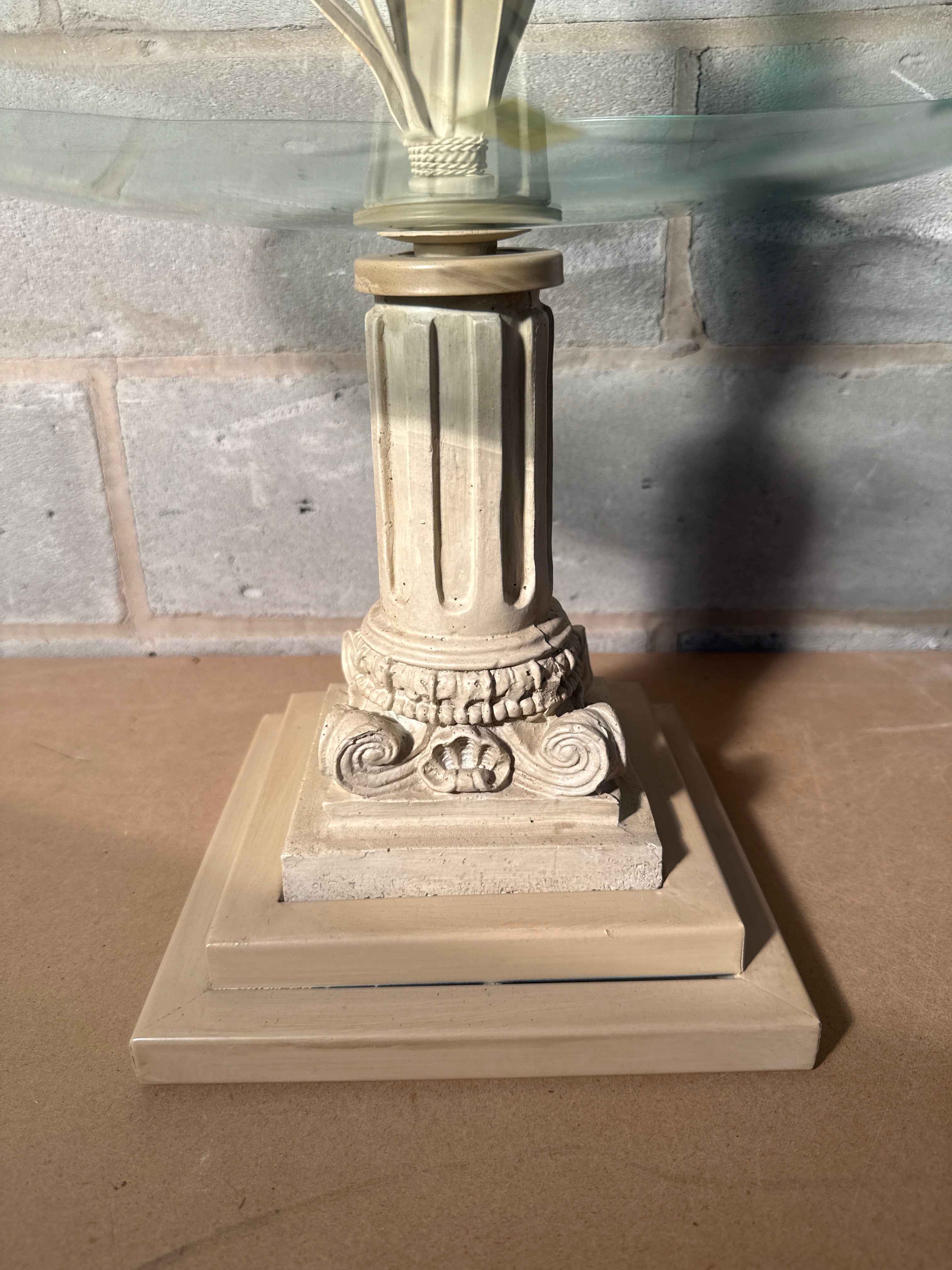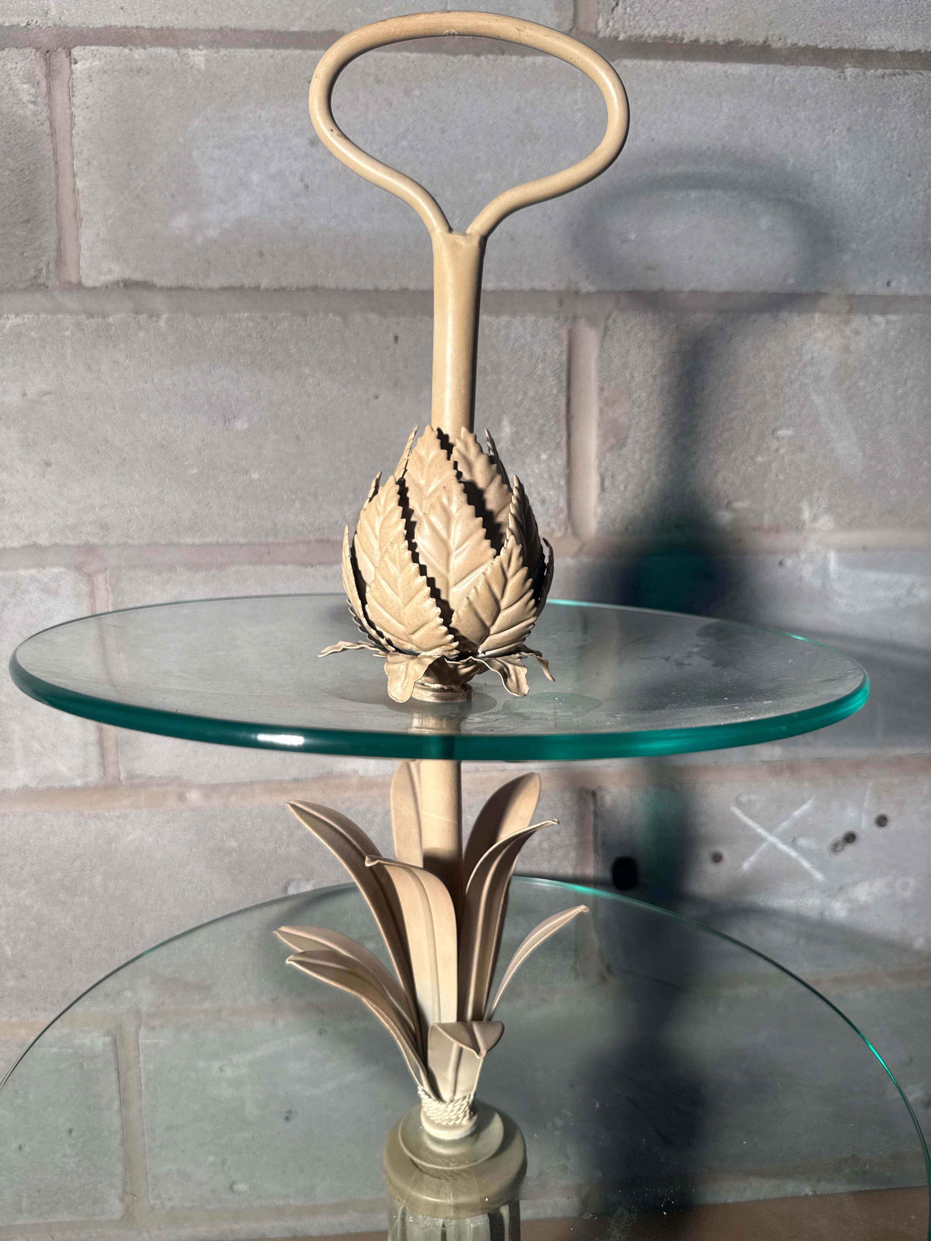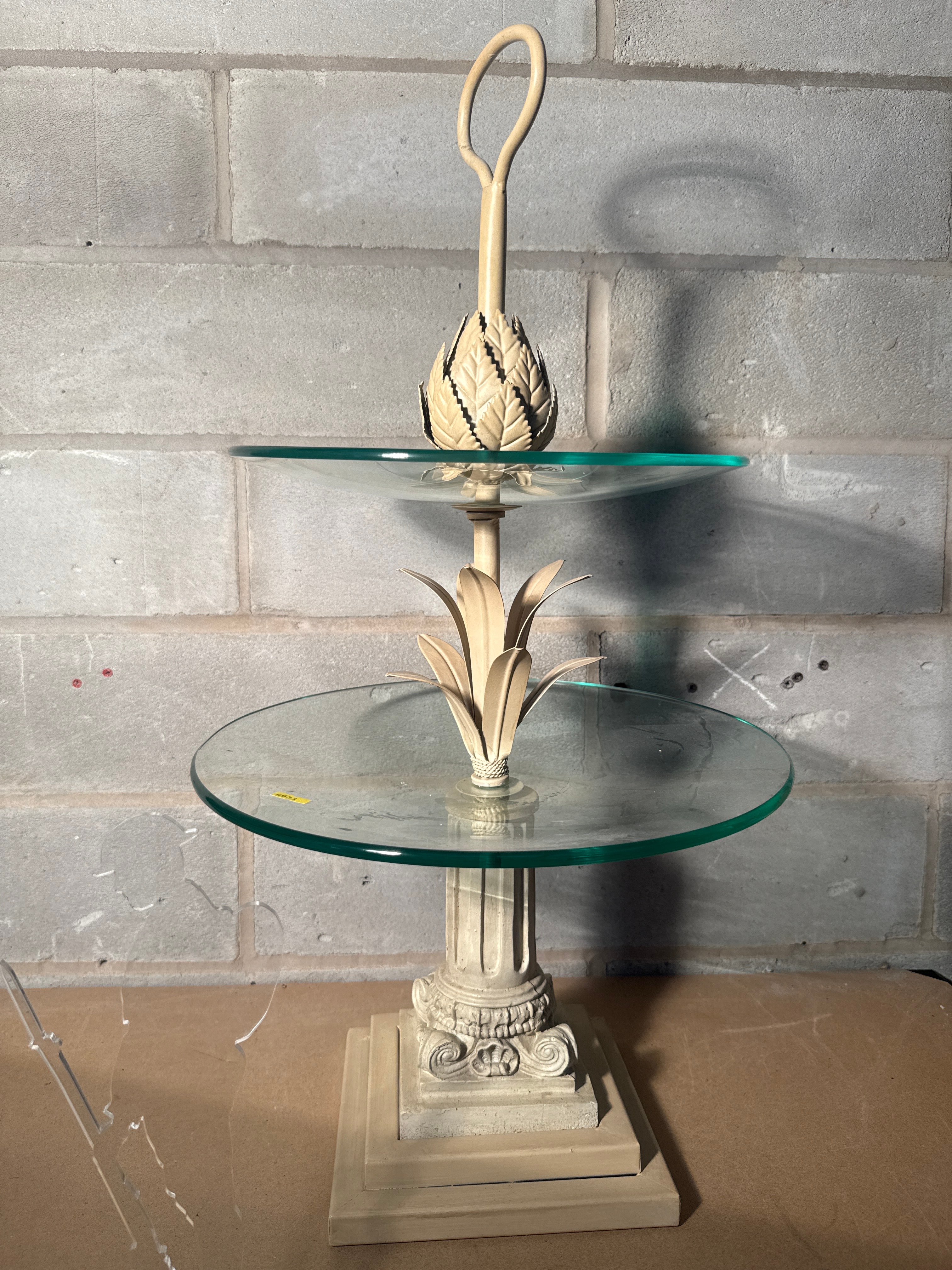 A two-tiered decorative stand, constructed from a central column and tiered base of off-white painted material, likely cast metal or resin, supporting two round clear glass shelves. The design incorporates classical-inspired elements, including a fluted column segment, acanthus leaf and scroll motifs on the square base, and stylized foliate supports beneath the upper shelf. The stand is topped with a decorative artichoke or pineapple-form finial, which also functions as a looped handle. A small, illegible white sticker is affixed to the edge of the lower glass shelf.