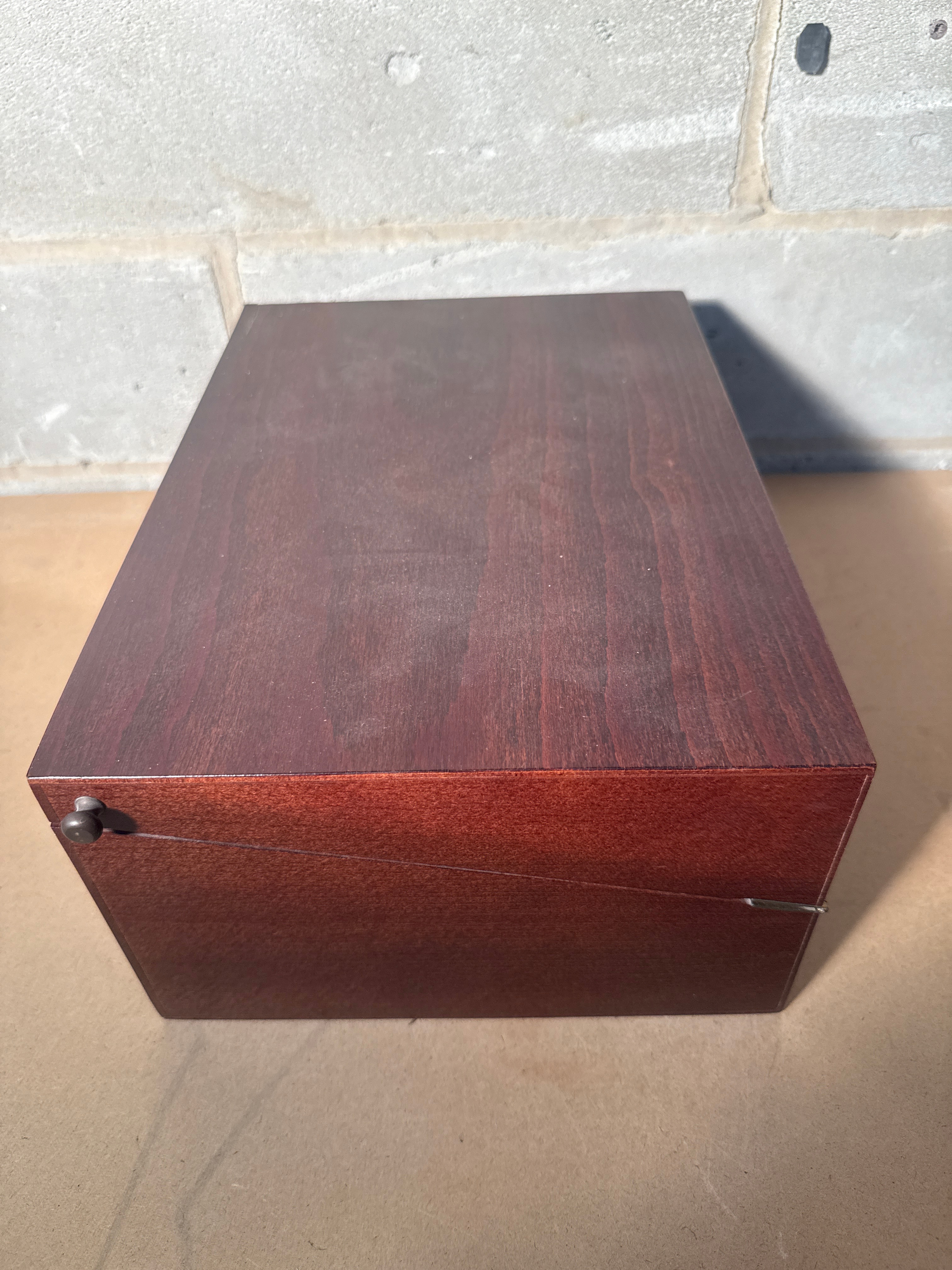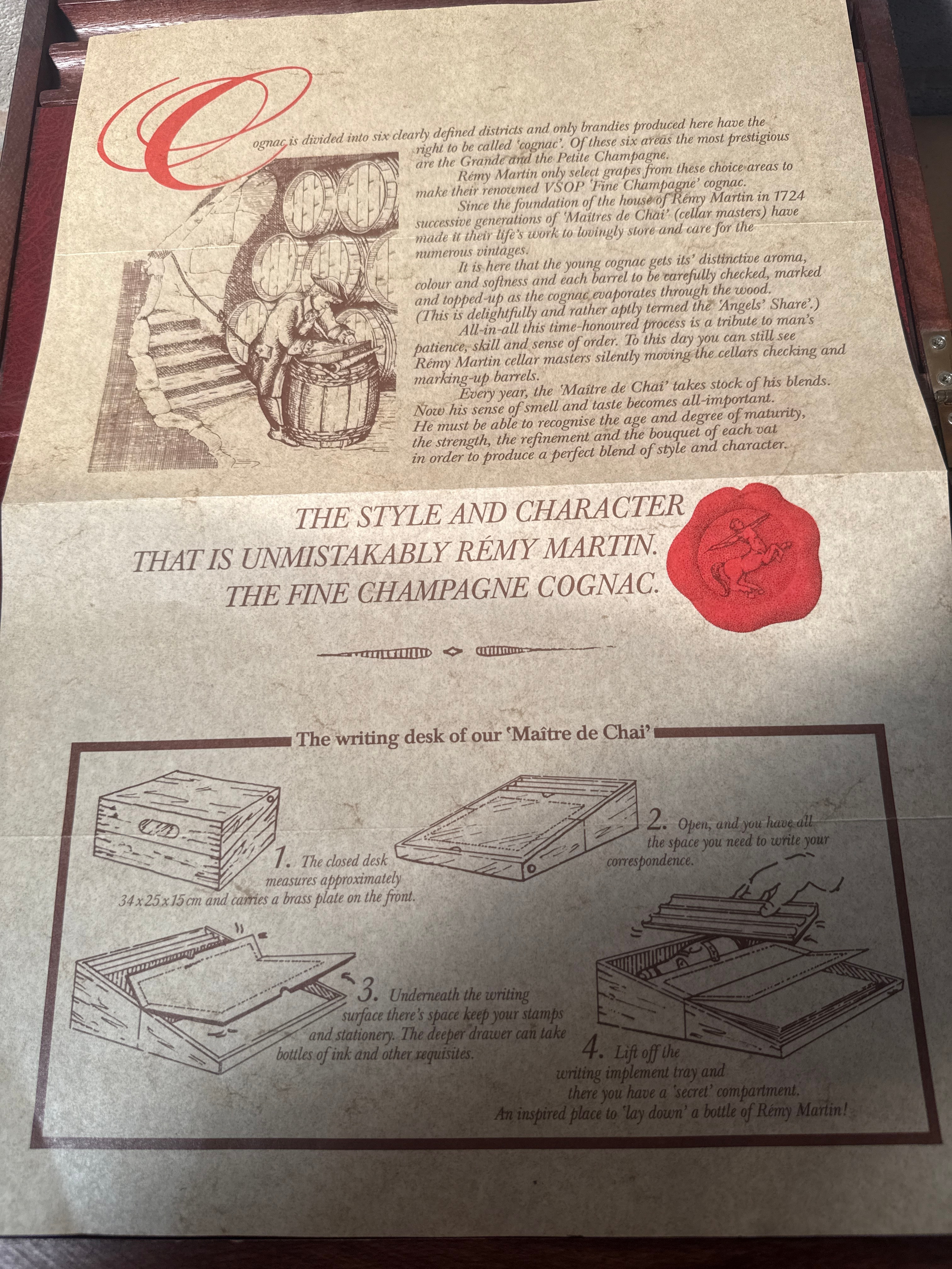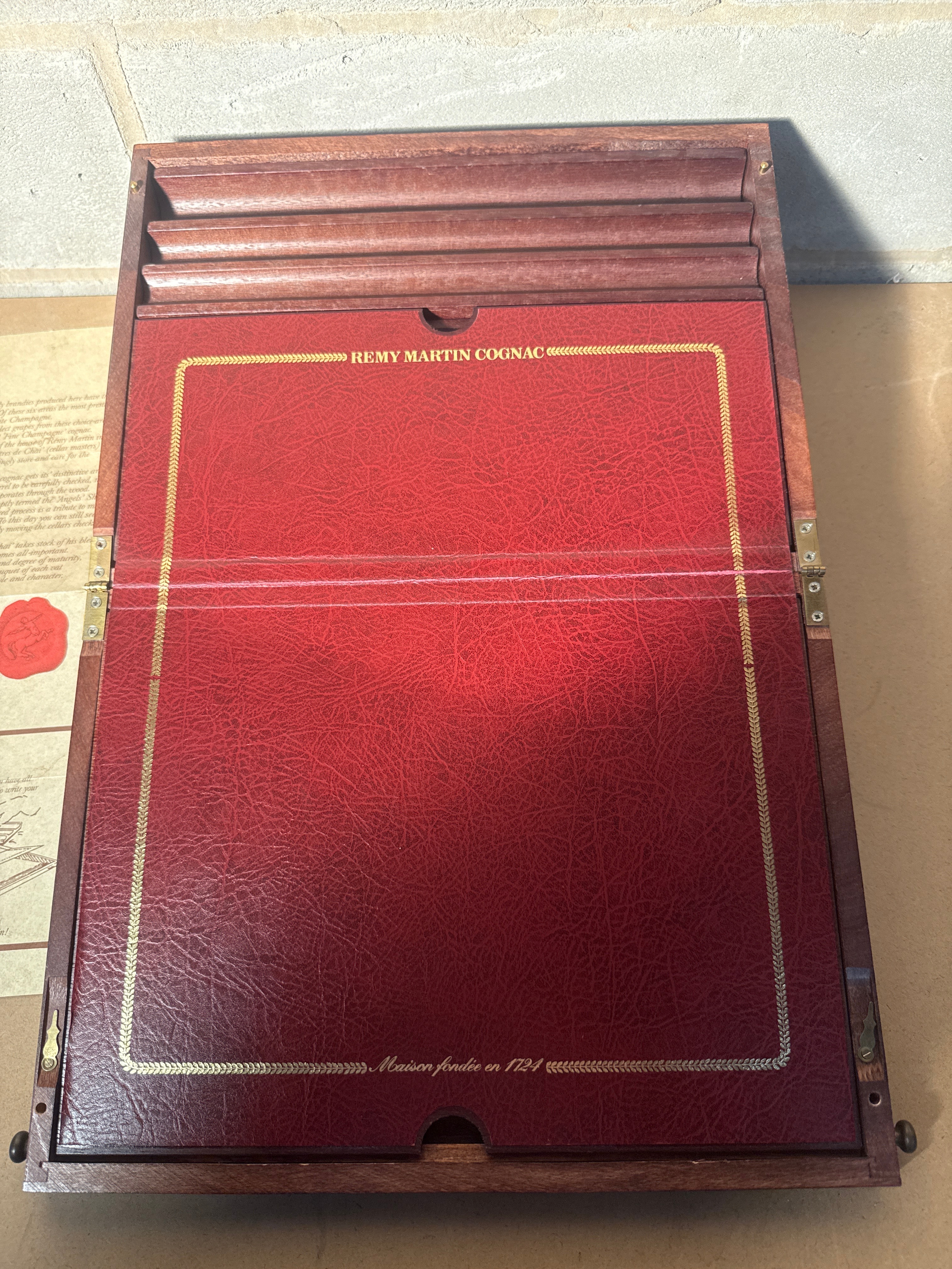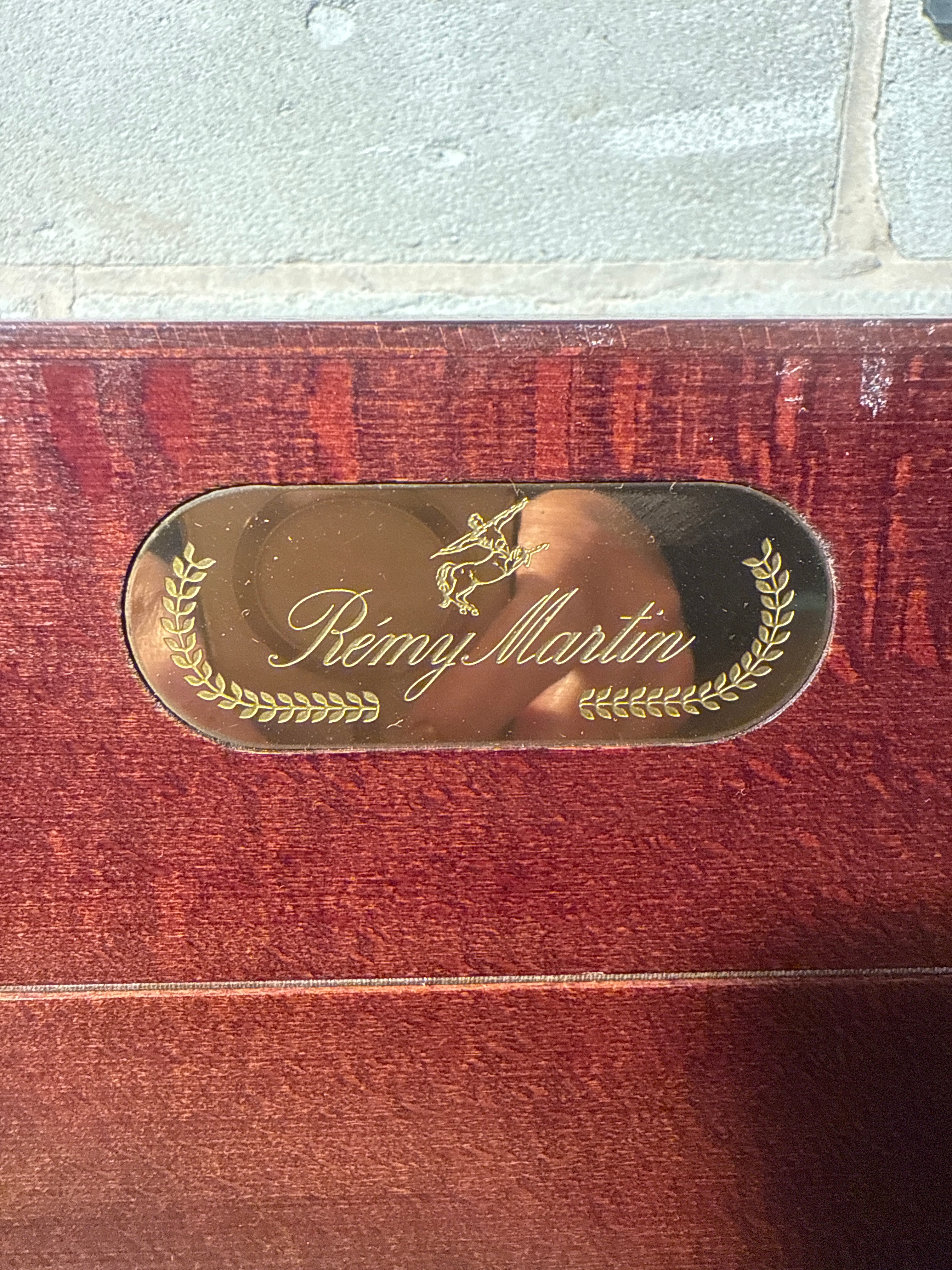 A Rémy Martin Cognac hardwood writing slope. Constructed from dark-stained wood with brass-tone metal hardware, including hinges and a decorative plaque featuring the Rémy Martin centaur logo flanked by laurel wreaths. The interior features a red, textured surface, likely faux leather or leather, beneath which paper inserts detail “THE STYLE AND CHARACTER THAT IS UNMISTAKABLY RÉMY MARTIN. THE FINE CHAMPAGNE COGNAC.” and explicitly identify the item as “The writing desk of our ‘Maître de Chai'” (Cellar Master). Prominent branding “REMY MARTIN COGNAC” and the phrase “Maison fondée en 1724” are visible, along with instructions for its use.