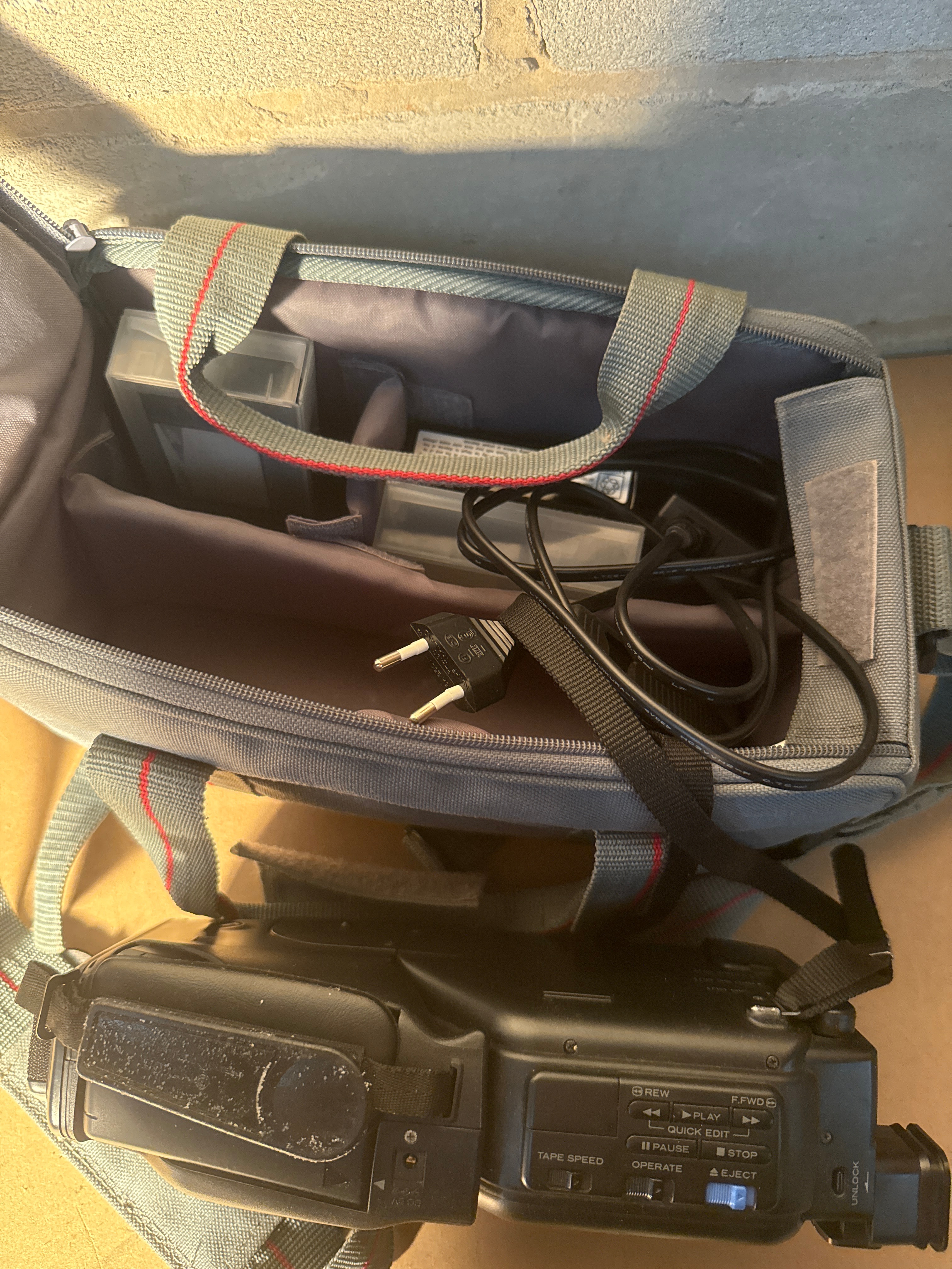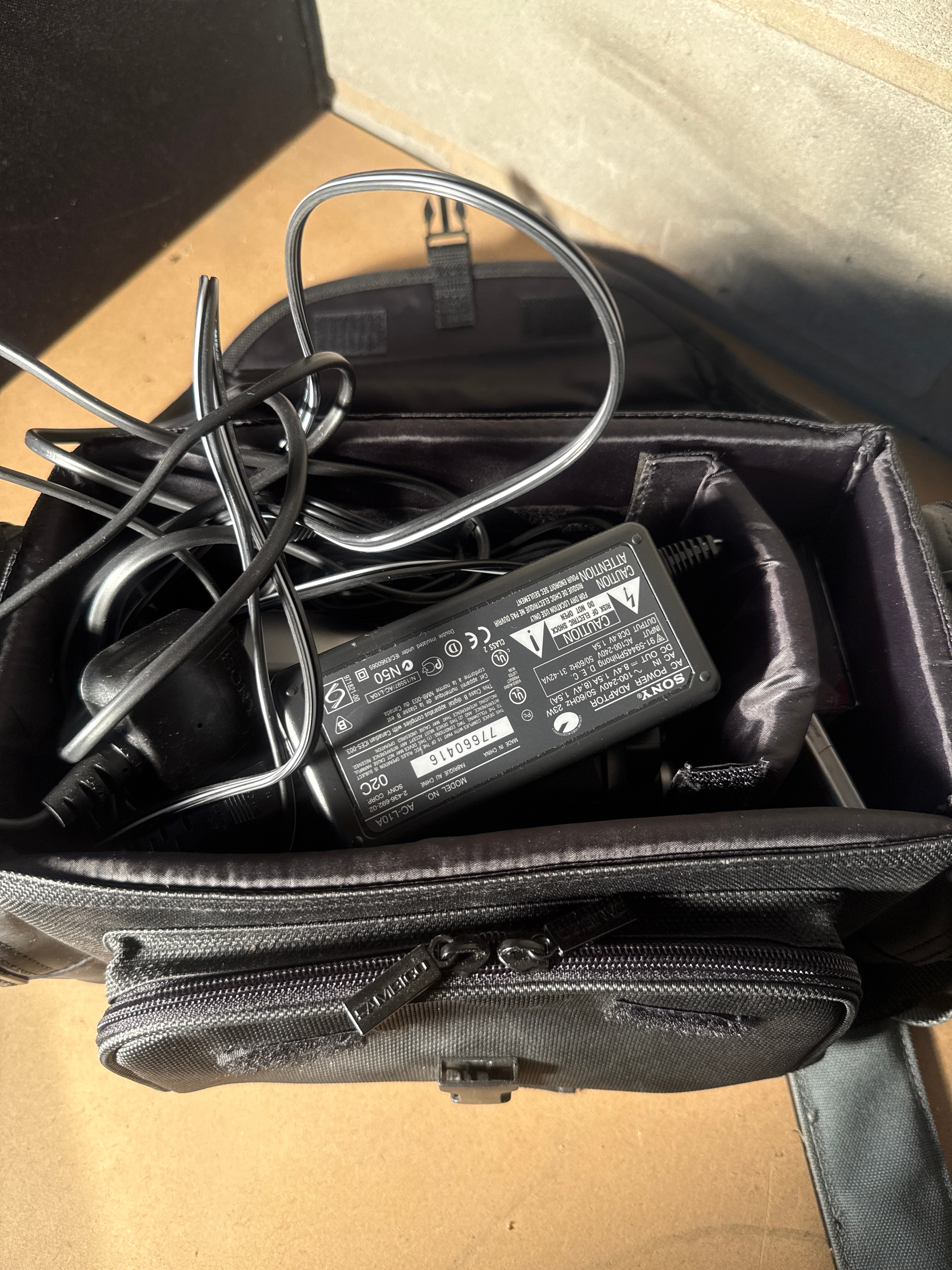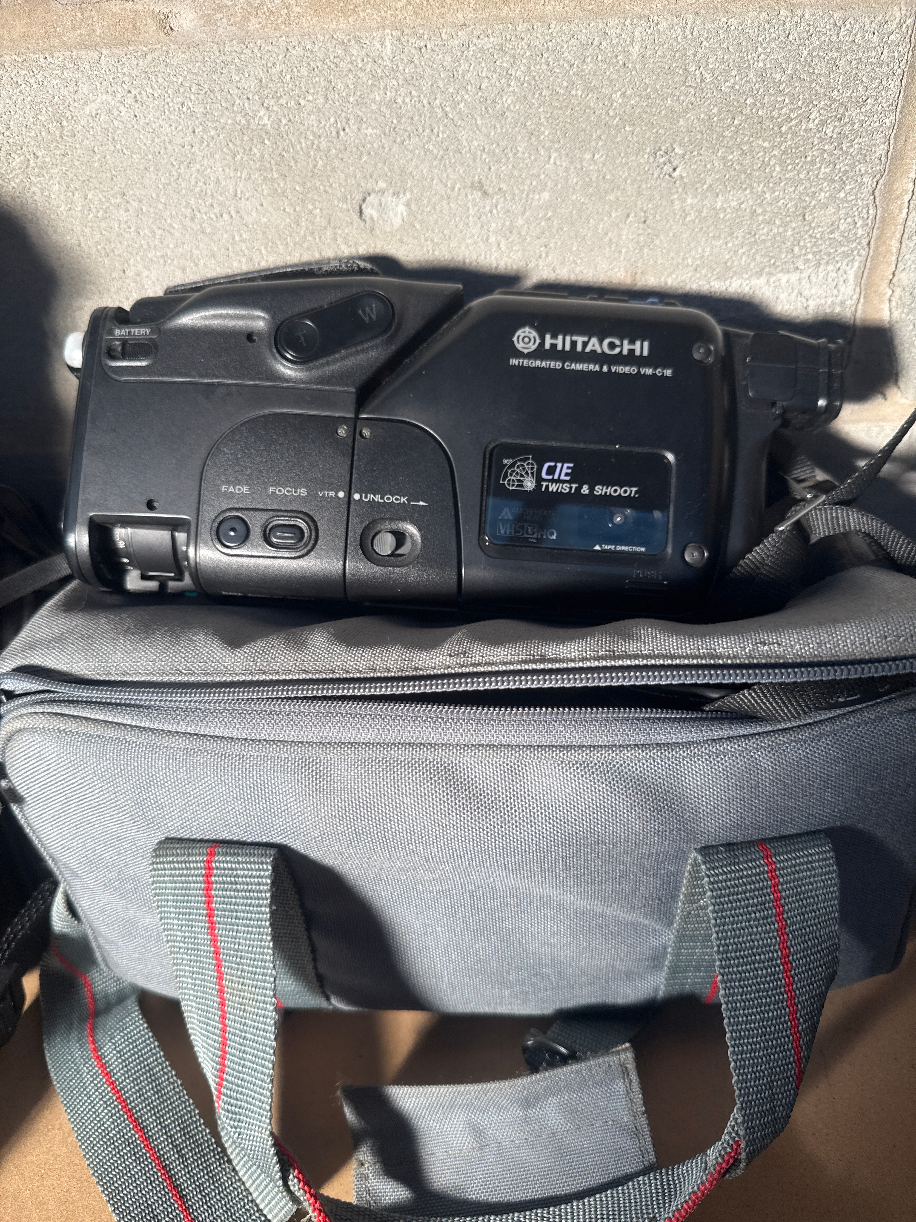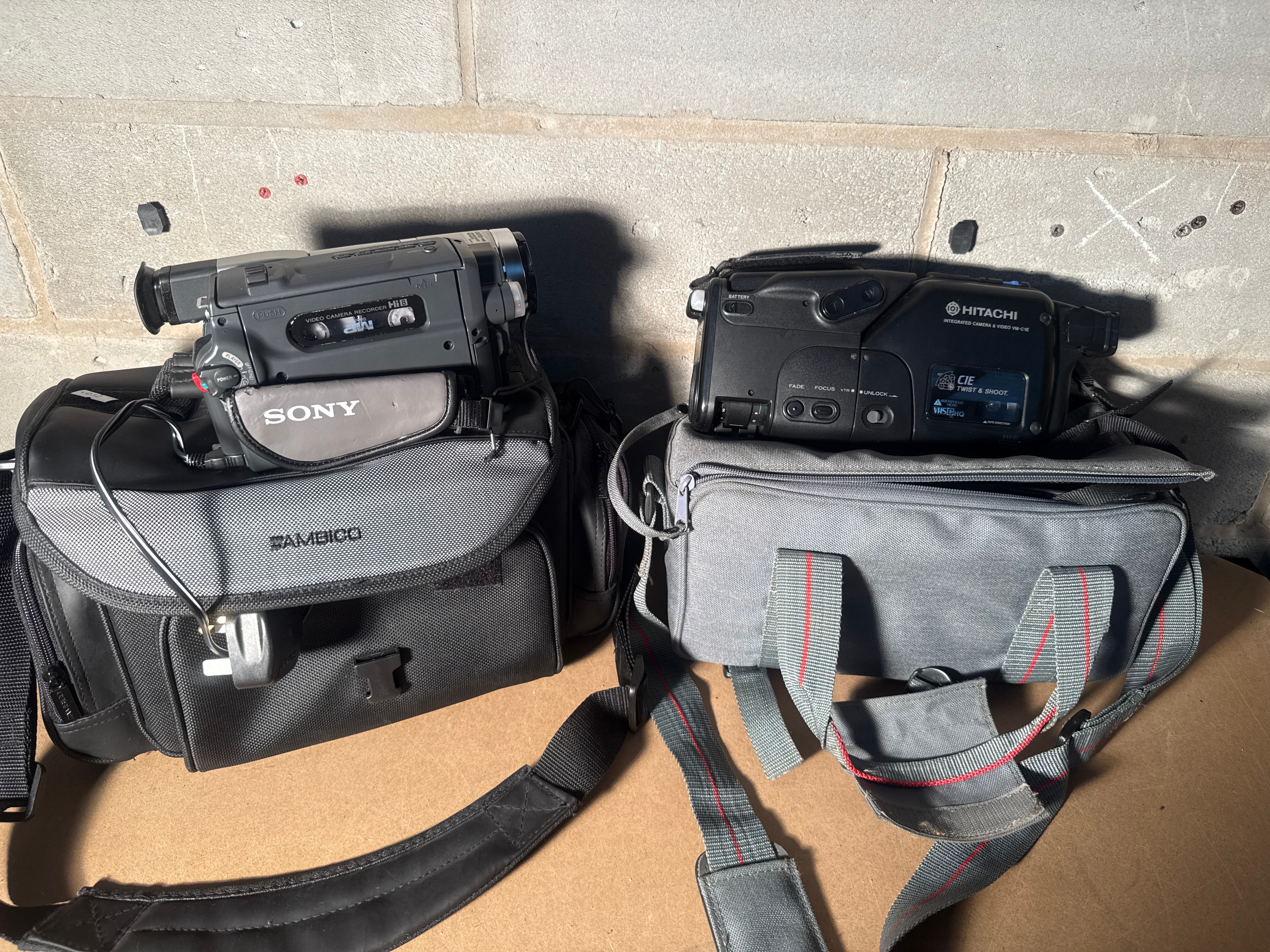 This lot comprises two vintage consumer-grade camcorder sets. The first is a black Hitachi Integrated Camera & Video, model VM-C1E, prominently marked with “CIE TWIST & SHOOT” and displaying numerous playback and shooting controls. It is presented in a gray fabric bag with red-striped handles, containing associated cables and power accessories. The second unit is a dark gray Sony Hi8 Video Camera Recorder, featuring a late 20th-century design with visible controls for power and zoom. This Sony unit is housed in a black and gray “ZAMBICO” brand fabric bag, which contains a Sony AC adaptor (model AC-V30A) with visible English and French safety warnings, along with various cables. Both camcorders are primarily constructed from plastic.