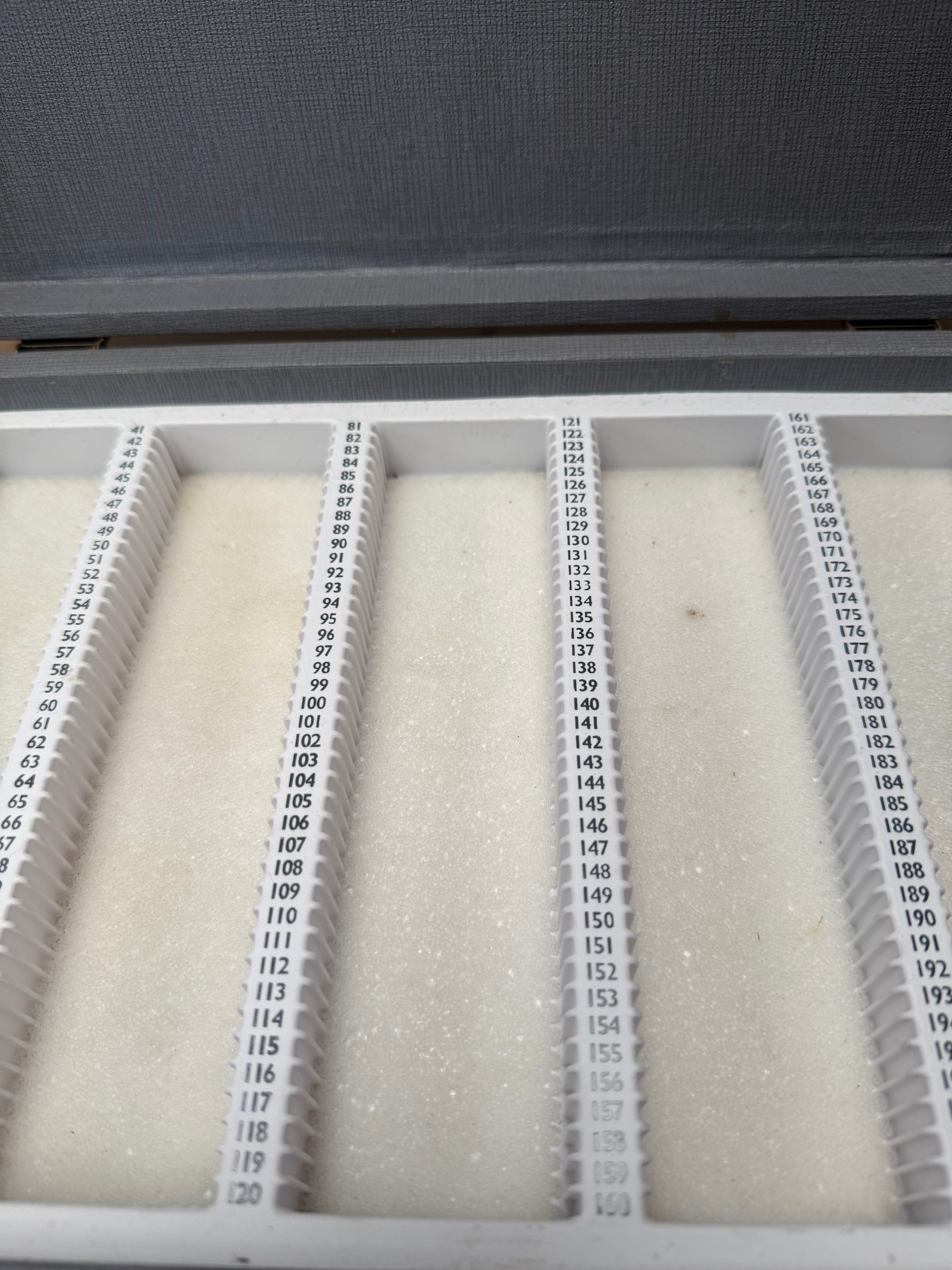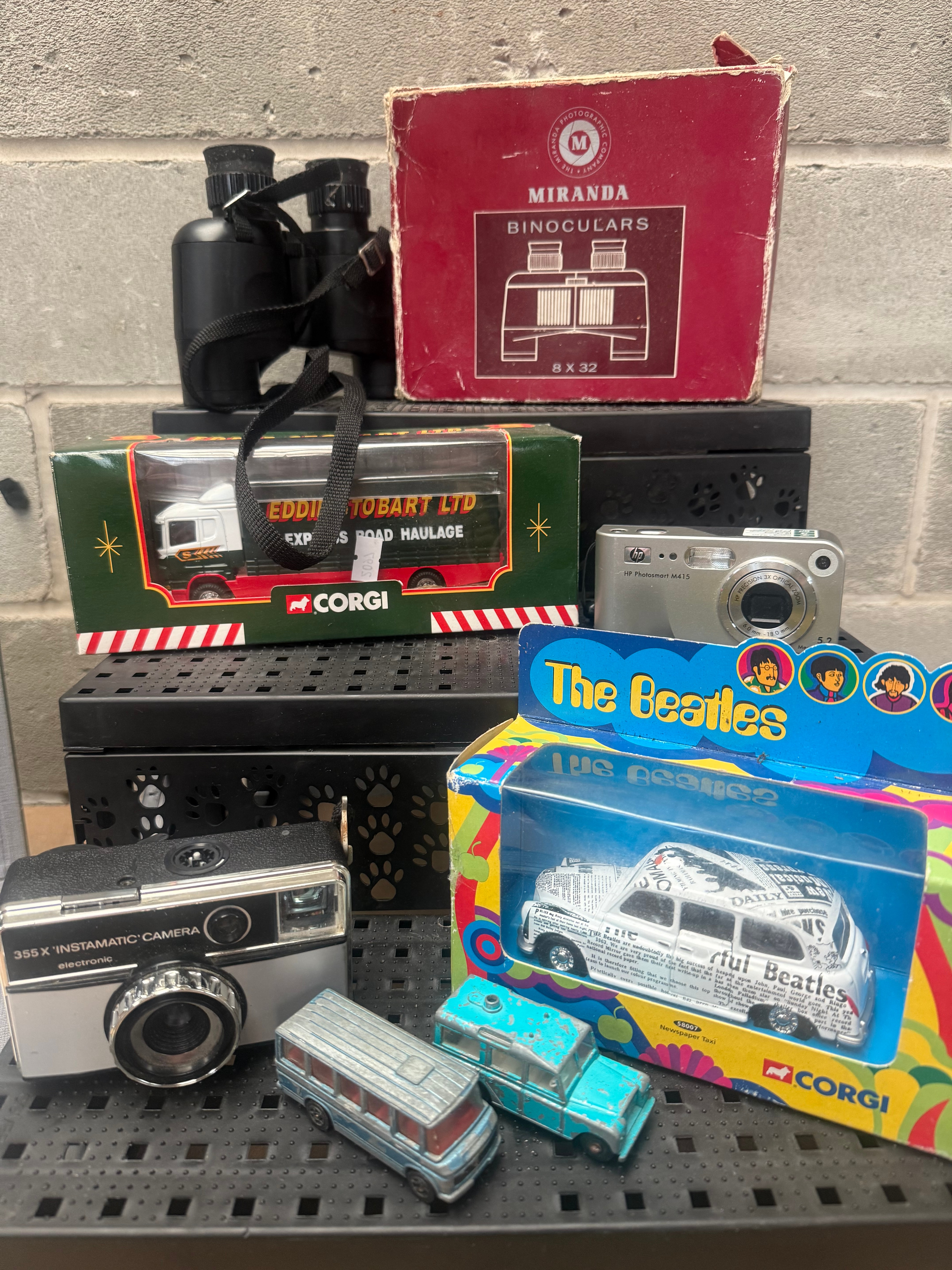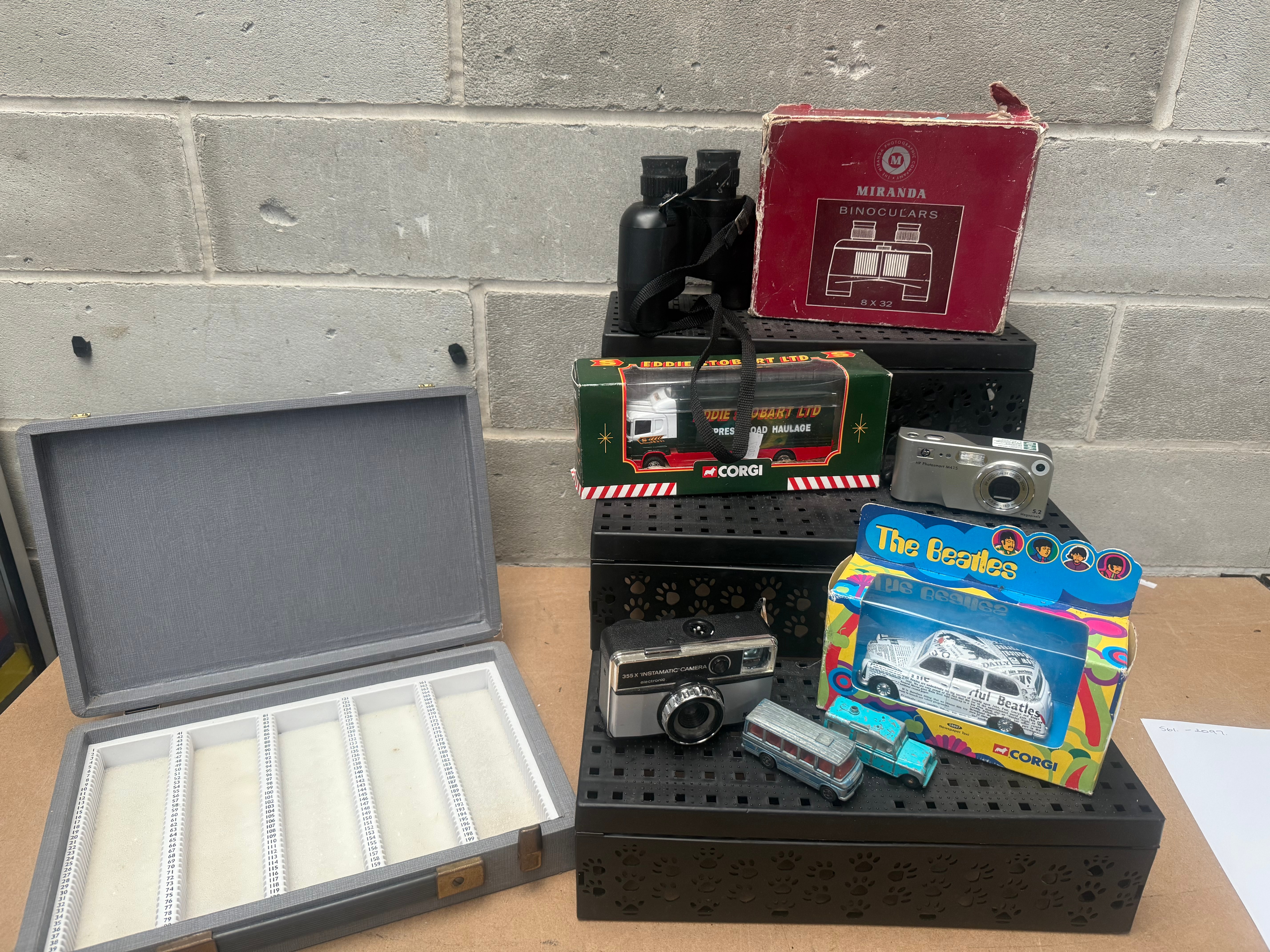 A varied collection comprising a pair of black Miranda 8×32 binoculars in their original red cardboard box, an HP Photosmart M415 digital camera, and a Kodak 355 X ‘INSTAMATIC’ CAMERA. Toy vehicles include two Corgi brand items in their original boxes: an ‘Eddie Stobart Ltd. Express Road Haulage’ truck and a ‘The Beatles’ themed Newcastle Corporation Taxi. Additionally, two loose die-cast metal toy buses are present. The grouping is completed by a grey fabric-covered hinged presentation case with a white foam interior featuring numbered slots (1-192).