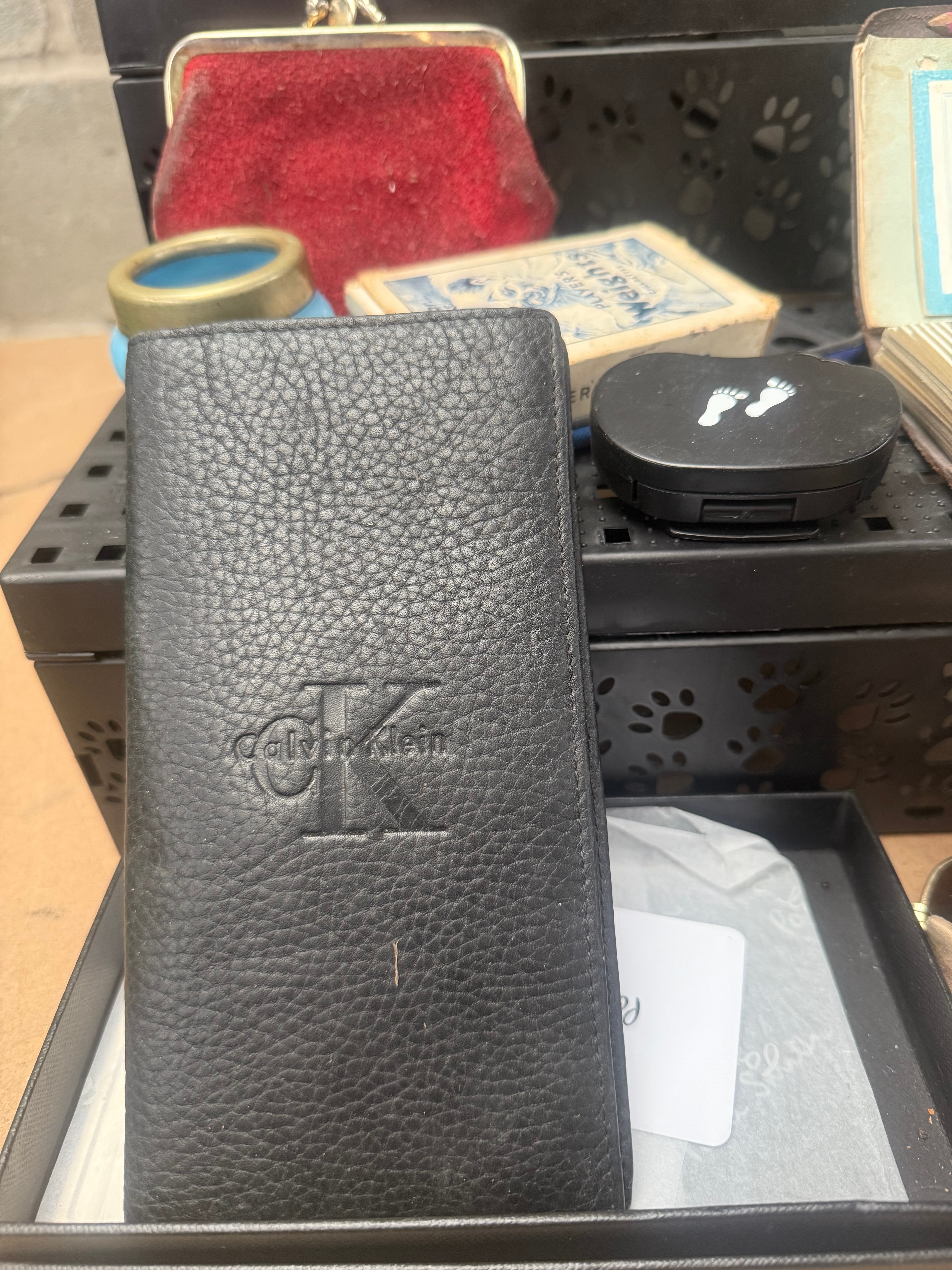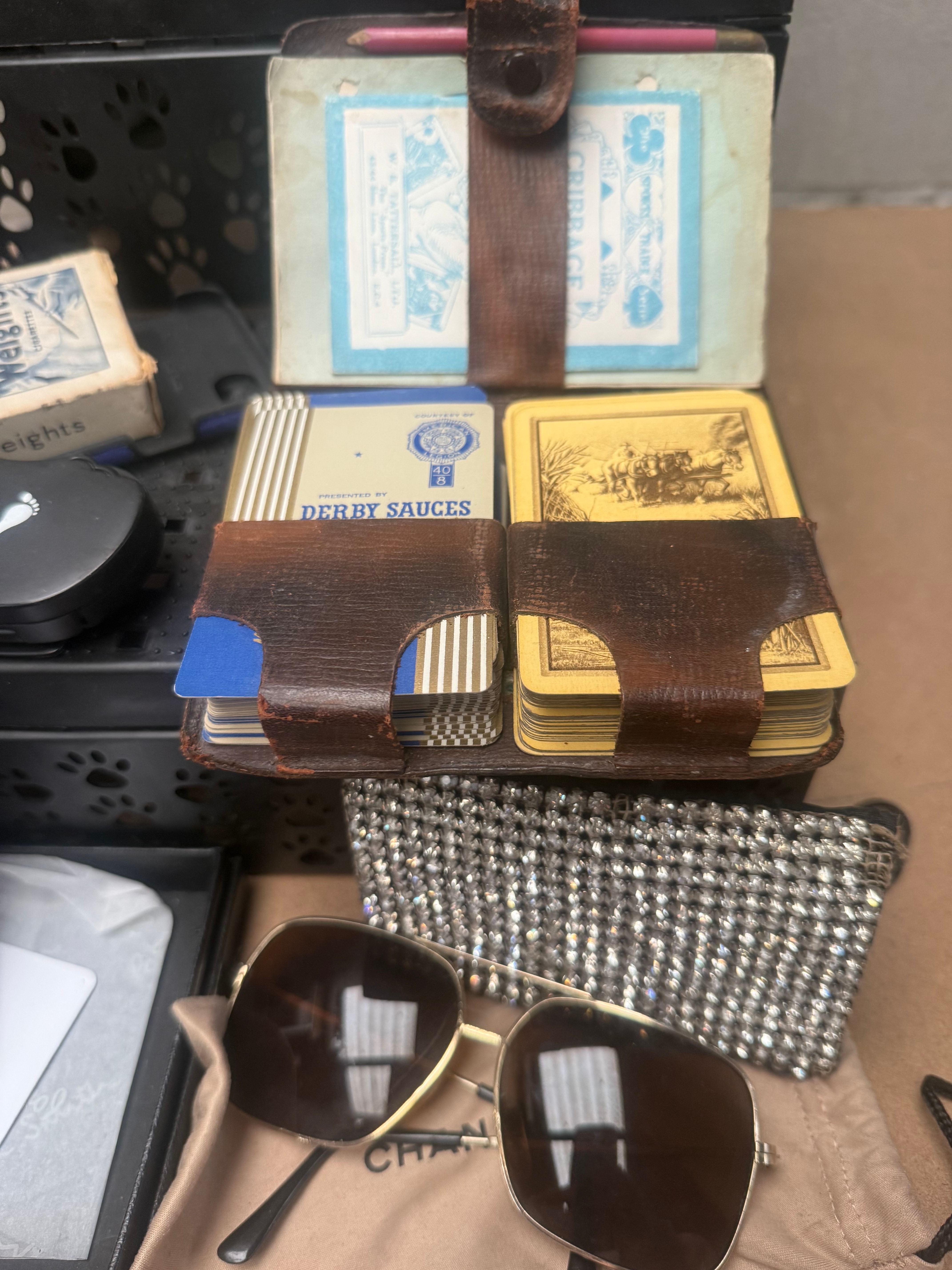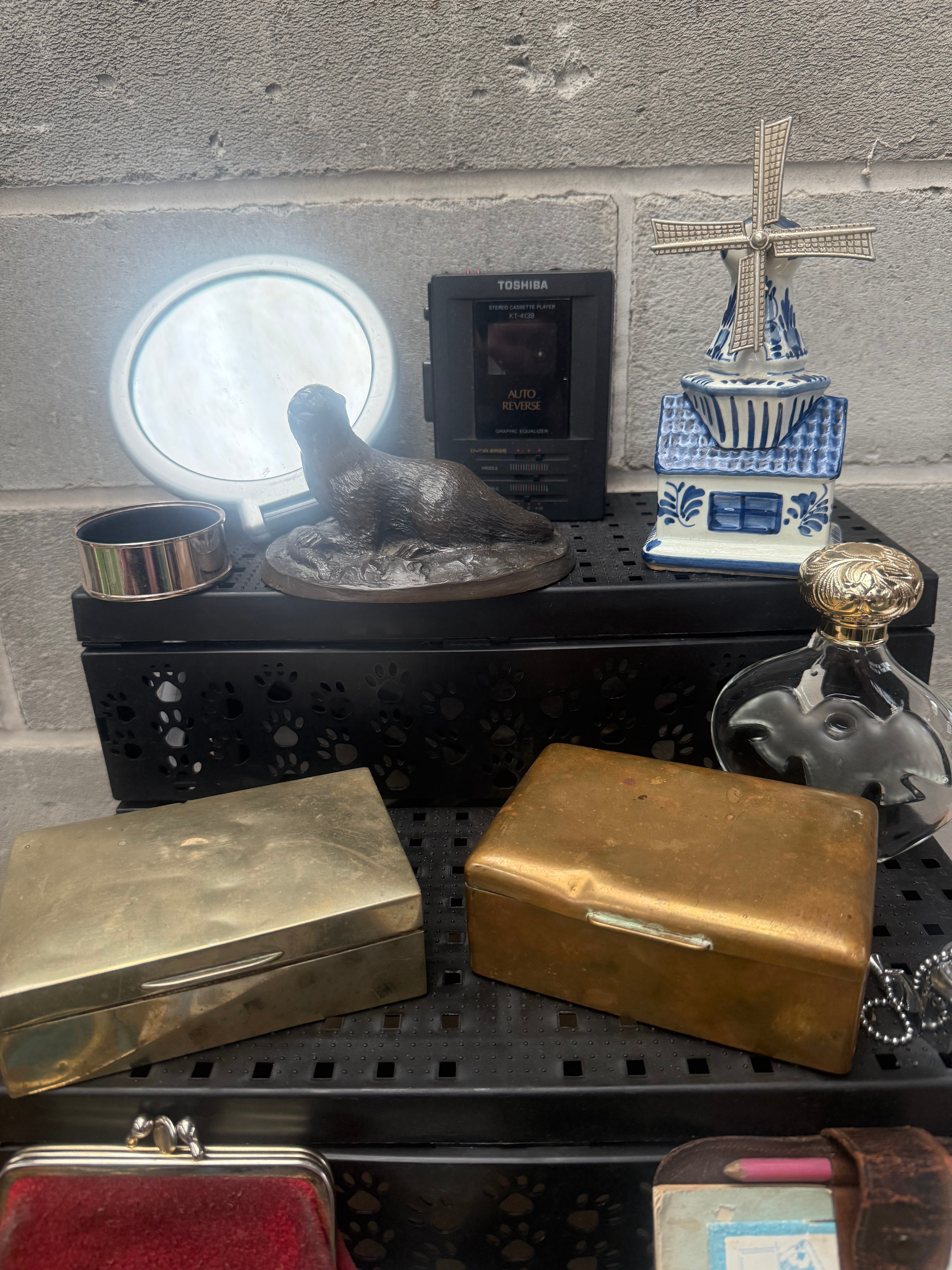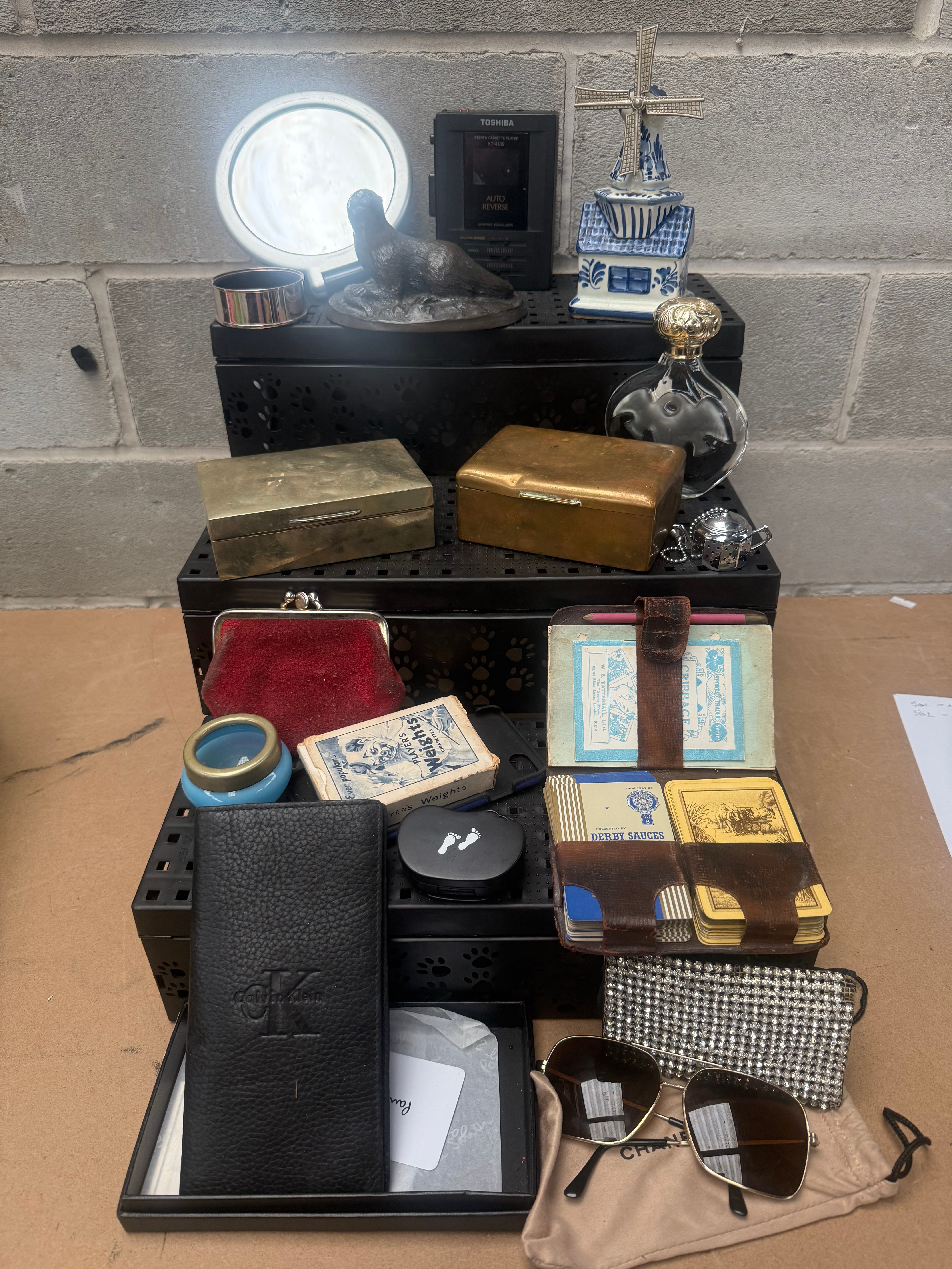 An assorted collection of decorative and functional items, primarily dating from the late 20th to early 21st century. The lot comprises a Toshiba KT-V700 stereo cassette player with “AUTO REVERSE” functionality, a round illuminated vanity mirror, a bronze-toned figurine of a seal, and a blue and white Delftware-style ceramic windmill. Further items include two brass lidded boxes, a red velvet coin purse, a small blue enameled cup, a box marked “Skat-Weights,” and a black compact featuring white footprint graphics. A brown leather-bound playing card case contains two decks, one branded “PRESENTED BY DERBY SAUCES,” along with a pencil. Contemporary accessories include a black pebbled leather Calvin Klein wallet, a small black and white beaded houndstooth clutch, and a pair of brown aviator-style sunglasses, accompanied by a partially visible “CHANEL” branded pouch. A glass perfume bottle with an ornate stopper and a silver-toned cuff complete the collection.