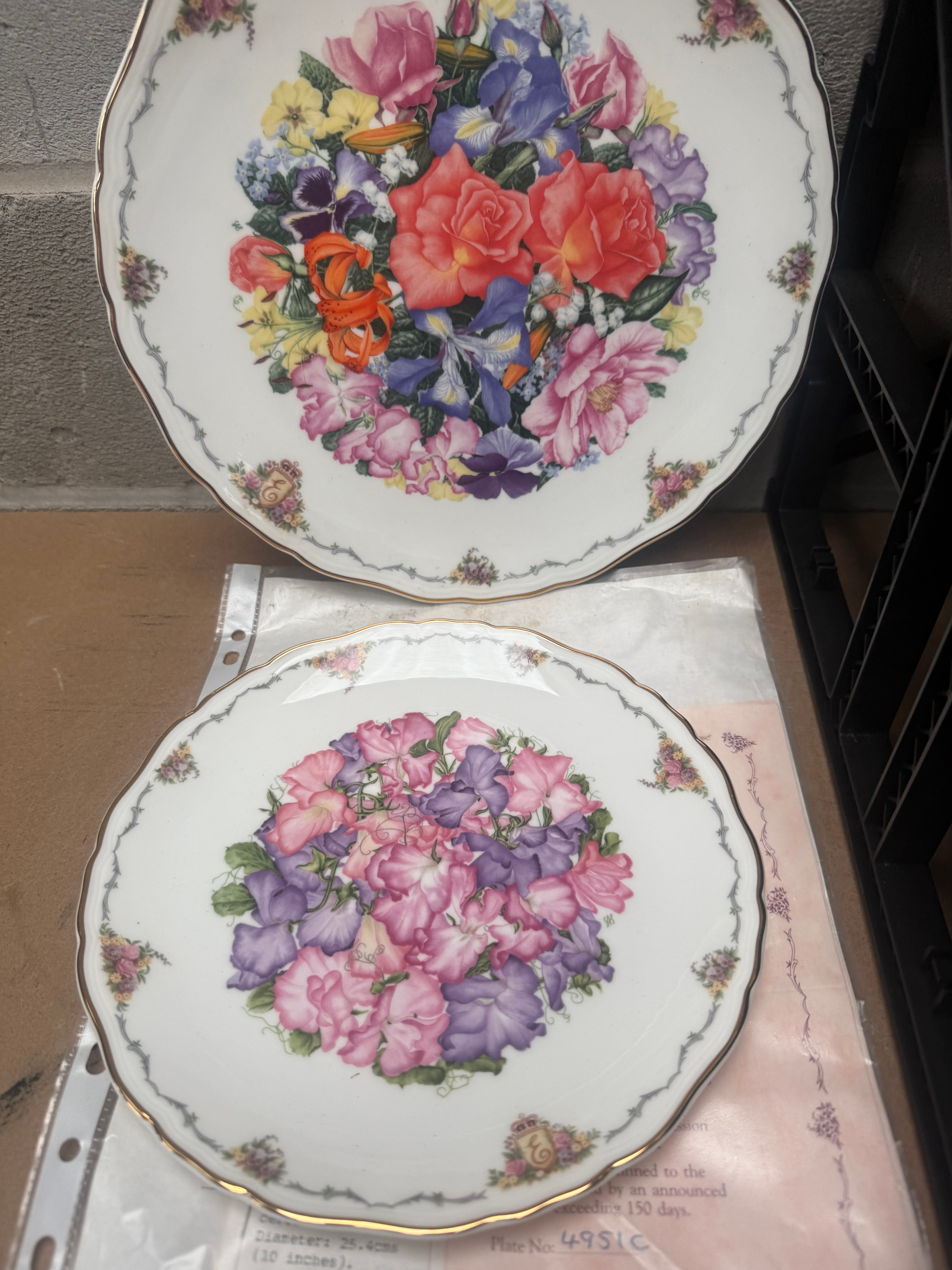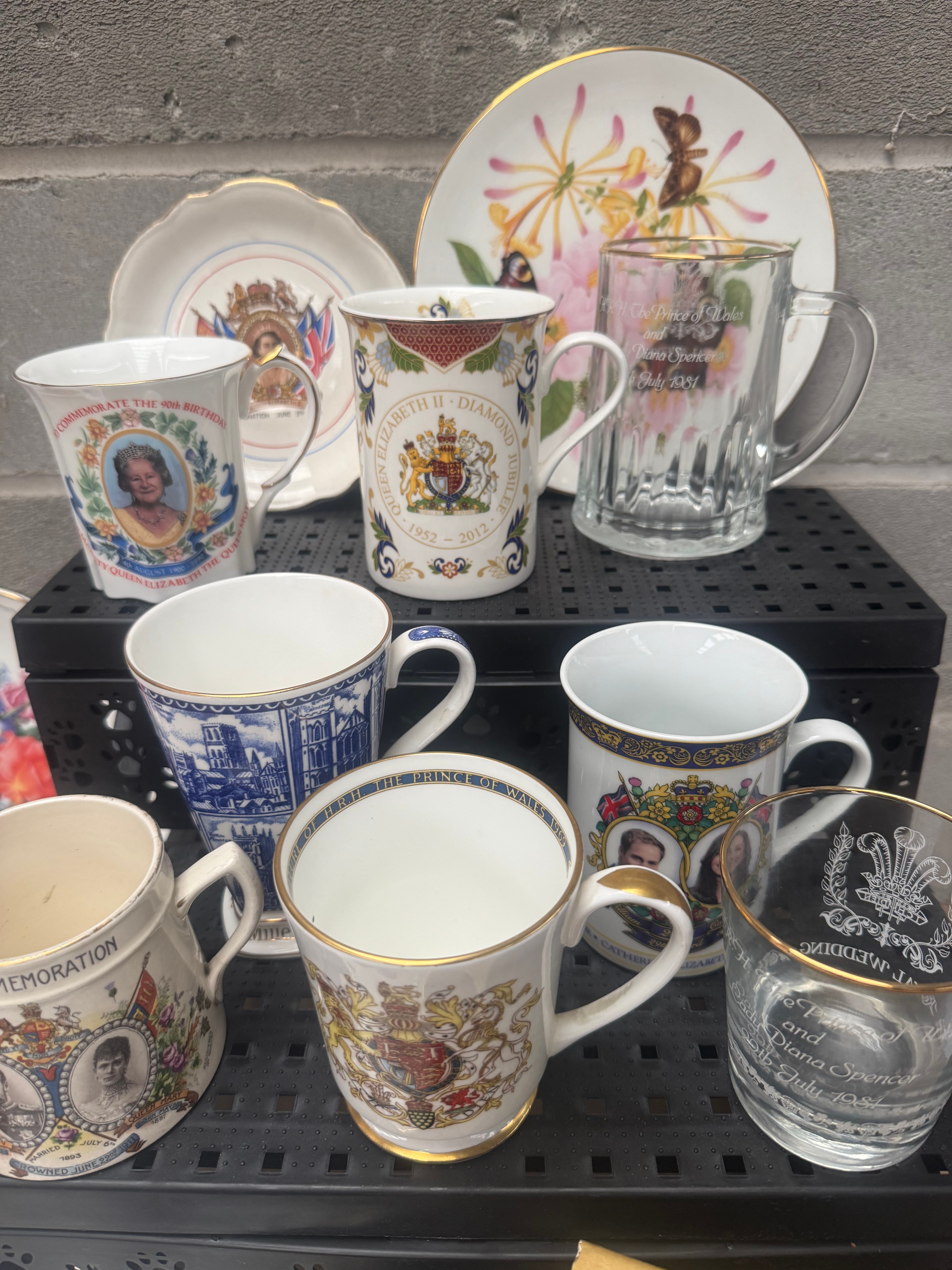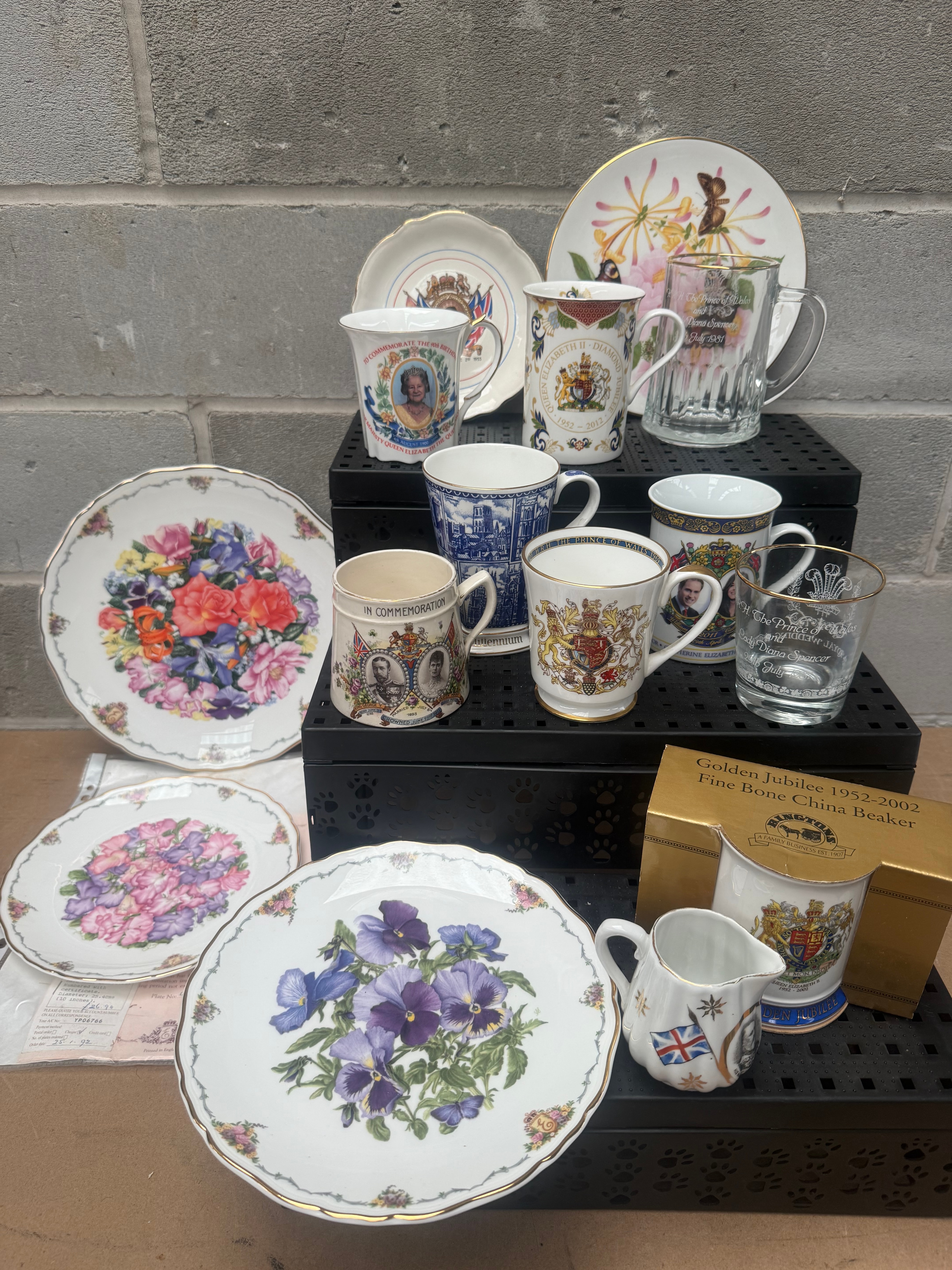 A collection of approximately eighteen commemorative items, primarily fine bone china plates, mugs, and a creamer, alongside several clear glass mugs and a beaker. The collection includes pieces by makers such as Aynsley and Royal Albert. The items predominantly celebrate British Royal Family events, including Queen Elizabeth II’s Golden Jubilee (1952-2002) and Diamond Jubilee (1952-2012), her 90th Birthday, and the wedding of H.R.H. The Prince of Wales and Lady Diana Spencer (July 29, 1981). Designs feature royal crests, portraits of the Queen, Prince Charles, and Princess Diana, and various floral patterns including roses, sweet peas, pansies, and mixed bouquets. One creamer displays the Union Jack. Many items exhibit gilt detailing. Accompanying paperwork notes one plate as “Plate No. 4951C”.