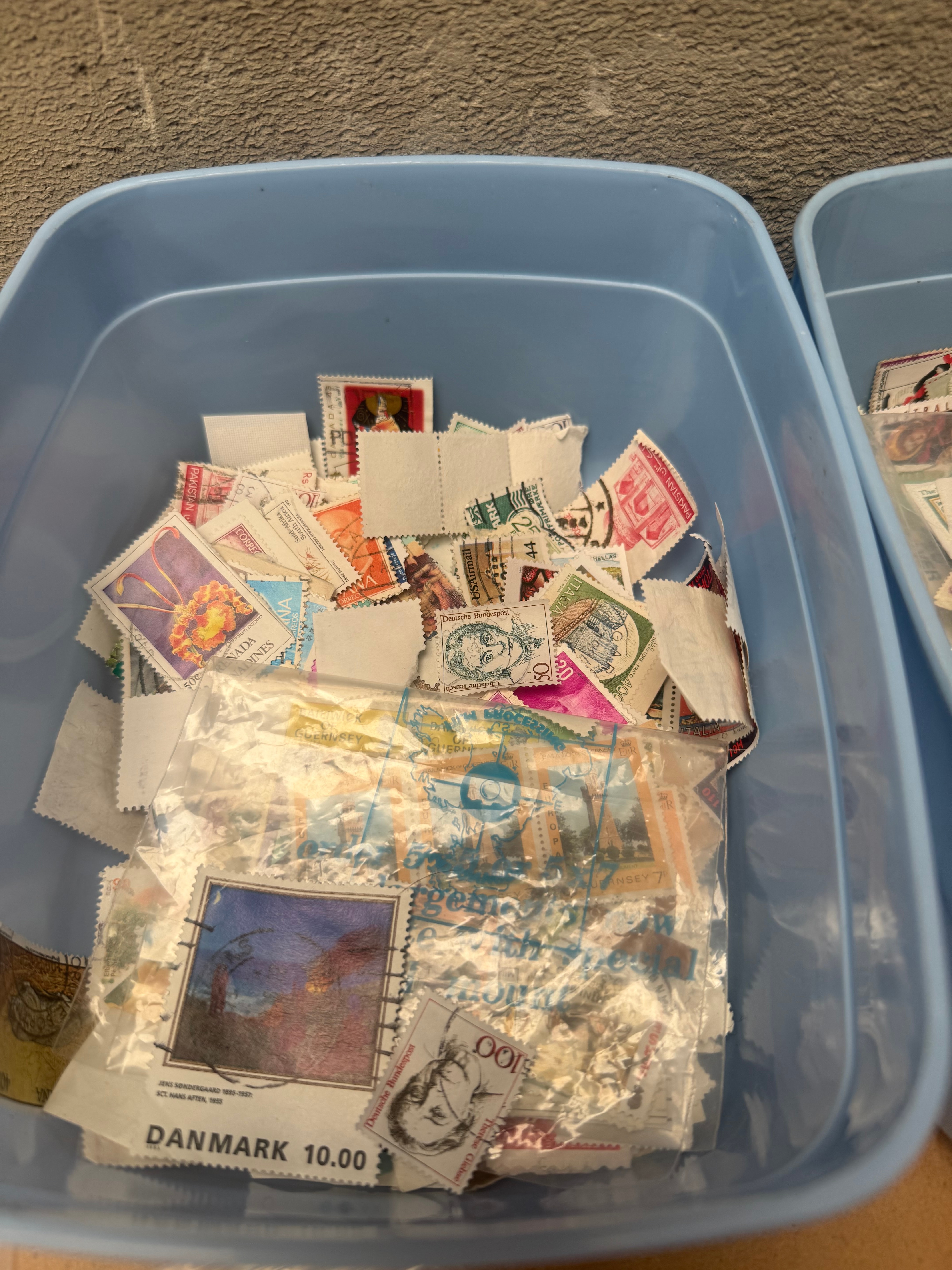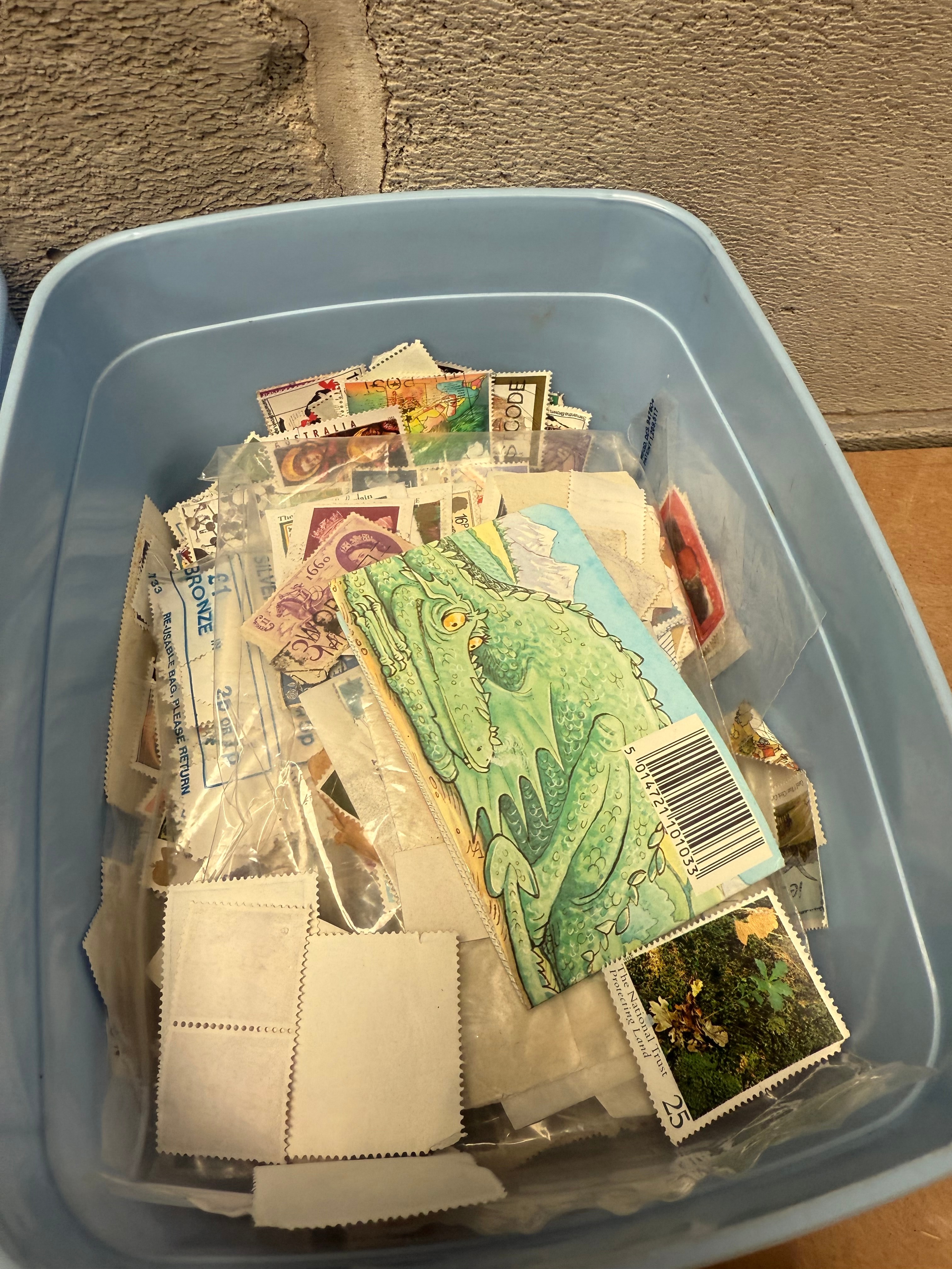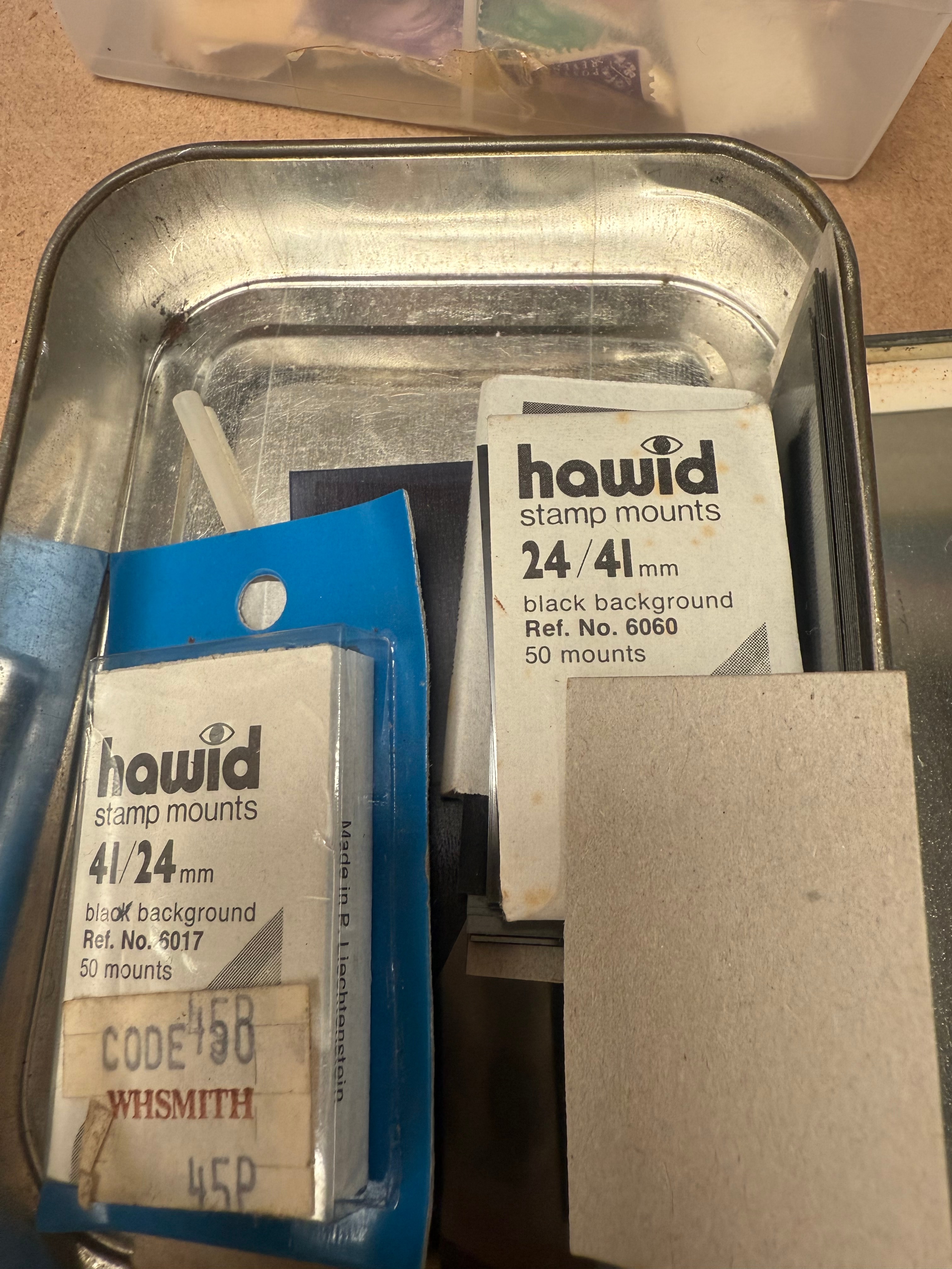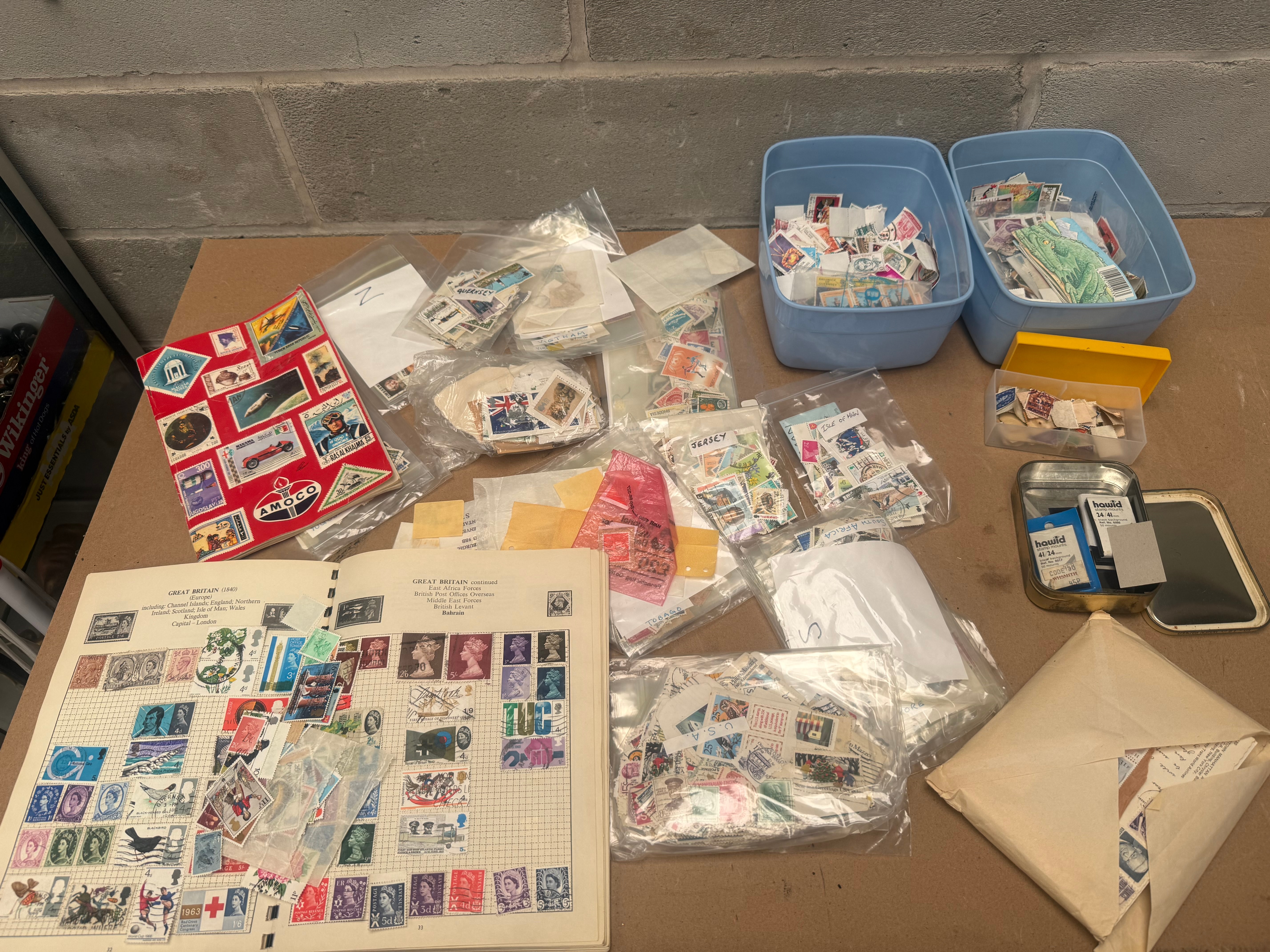 A diverse collection of postage stamps and associated philatelic supplies, identified through web intelligence as “Stamps From Around The World.” The collection includes stamps housed primarily in a spiral-bound album with designated sections for “GREAT BRITAIN” and other regions, displaying a range of styles and periods, including stamps dated 1963. Additional loose stamps are stored in various clear plastic bags, two light blue plastic bins, and a small metal tin. Notable visible countries include “DANMARK” (Denmark) and “Deutsche Bundespost” (German Federal Post), with text like “POSTAGE” and “REVENUE” appearing on some stamps, alongside an “Amoco” branded item. The collection also includes several packets of “hawid stamp mounts” of varying sizes (e.g., 24/41mm, 41/24mm) with “black background,” marked “Ref. No. 6060” or “6017,” and identified as a “WHSMITH” product, some still in their original packaging.