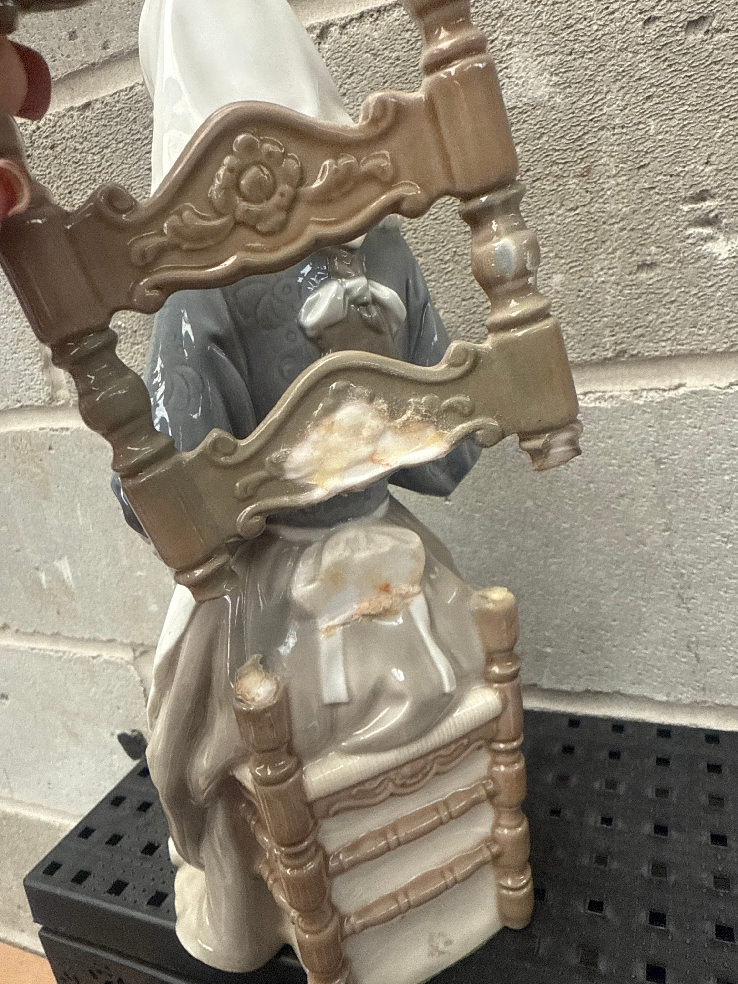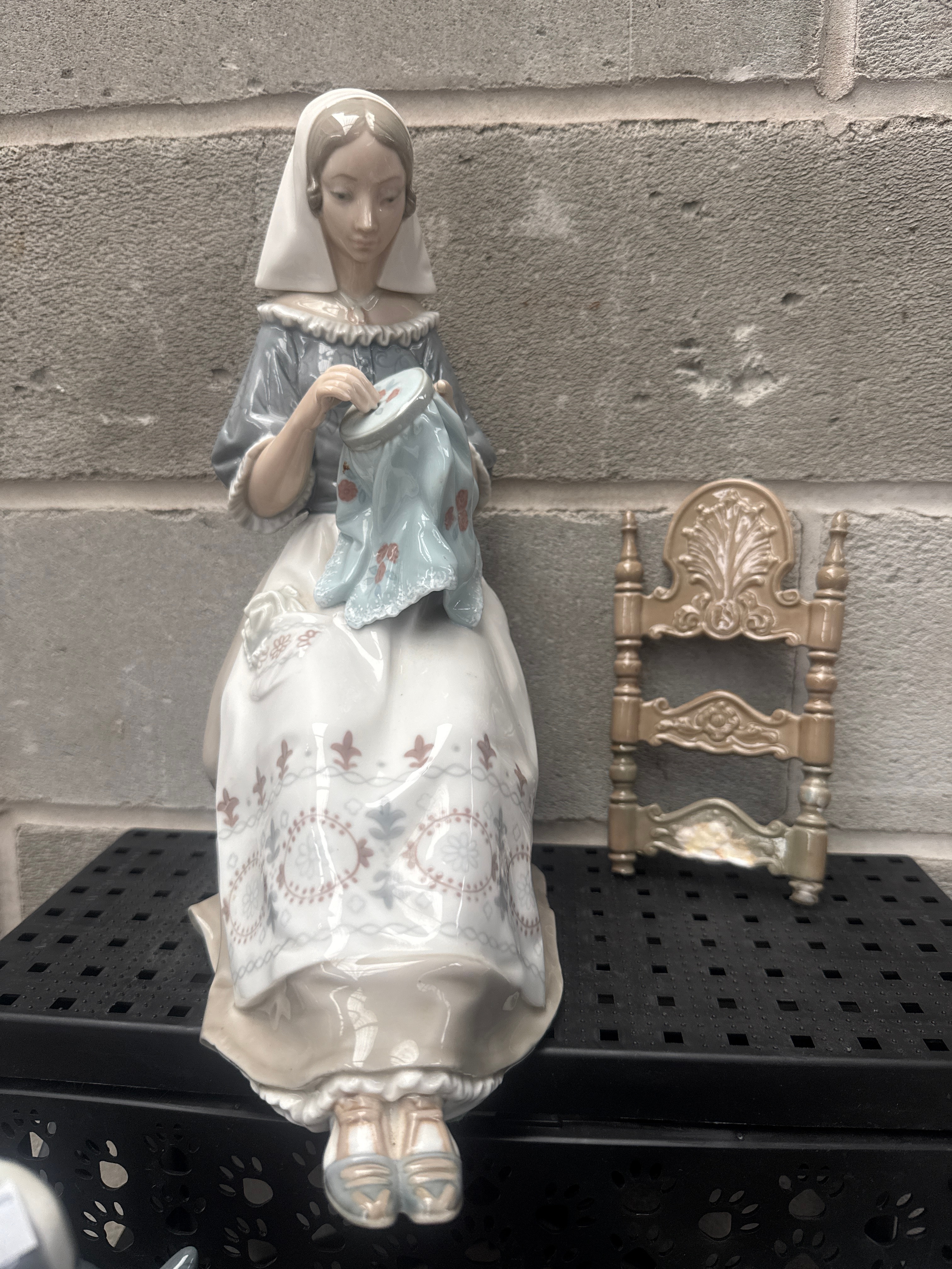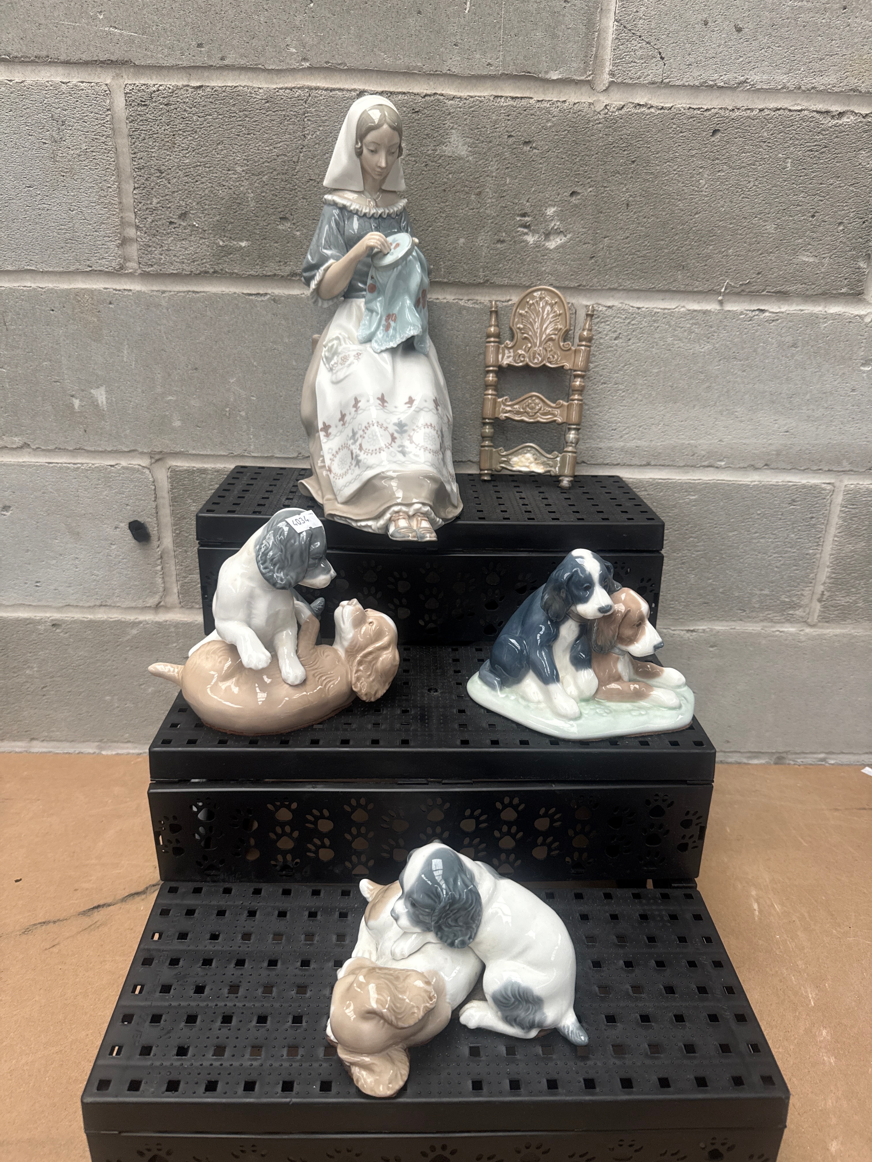 A collection of glazed porcelain figurines by Nao and Lladro. The lot features a seated female figure in period attire, dressed in a blue top, white bonnet, and a patterned white skirt, depicted as engaged in needlework. Accompanying this is a miniature decorative chair. The collection also includes three distinct groupings of two dog figurines each, rendered in various poses and featuring white, brown, and grey coloration. An indistinct blue maker’s mark is visible on the base of the woman figurine, and a lighter, indistinct mark appears on the underside of the broken chair.