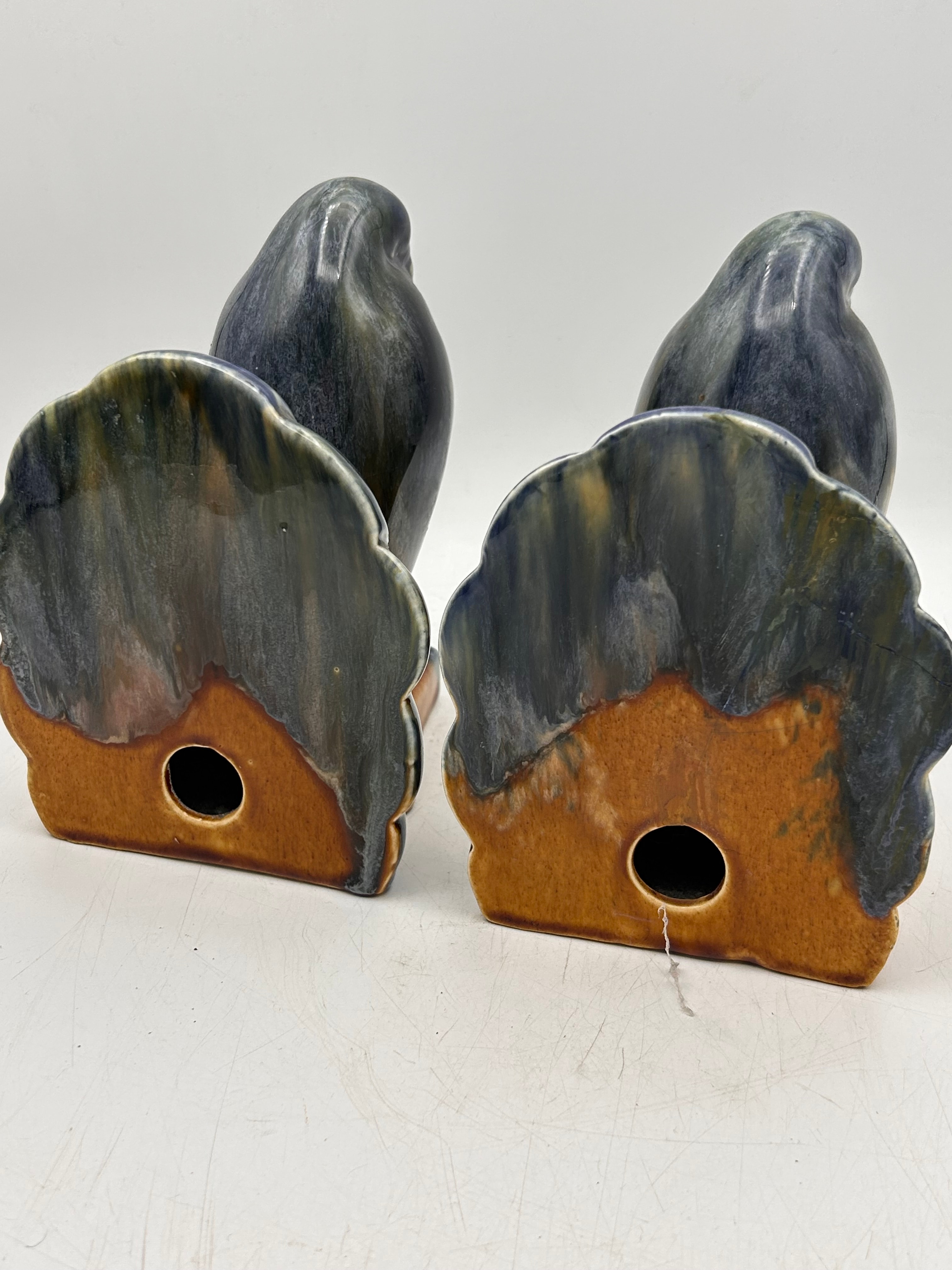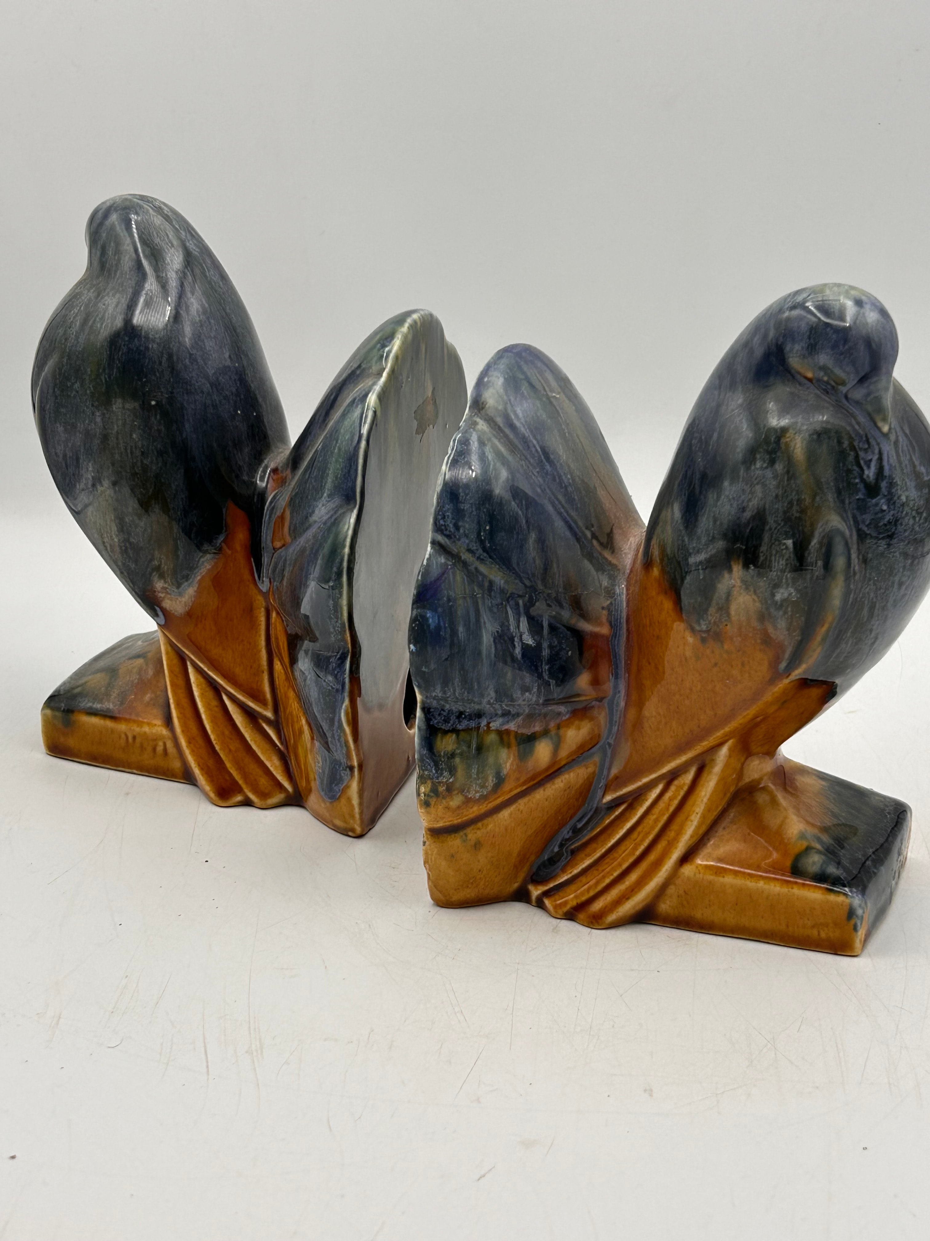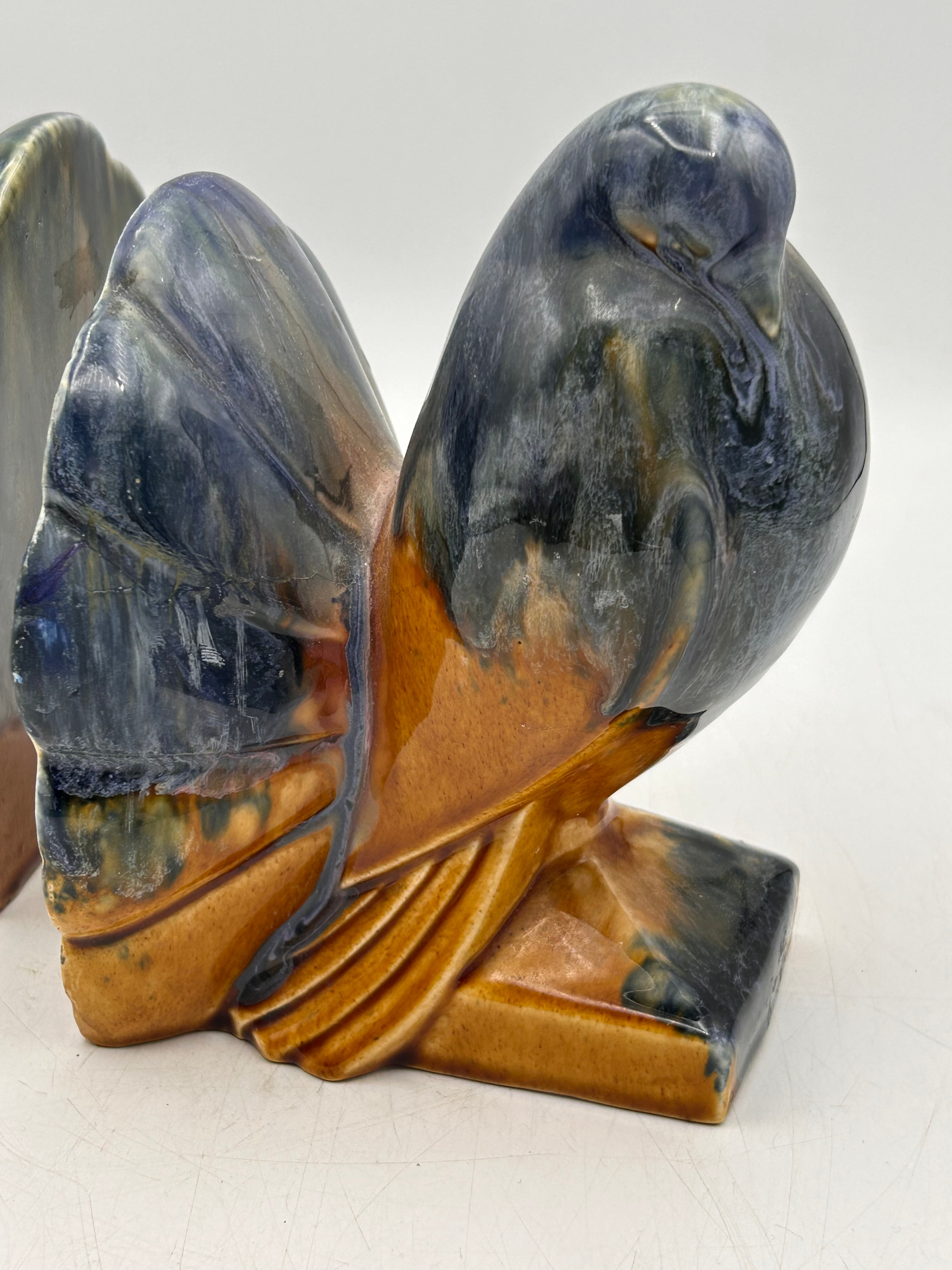 A pair of glazed ceramic bookends, each sculpted to represent a stylized bird or dove form. They feature a variegated, iridescent glaze transitioning from mottled dark blue-black and grey tones on the upper parts to rich amber and brown hues towards the base, suggesting a ‘flambé’ or ‘lava’ type finish. The unglazed undersides reveal a terracotta-colored clay body and each features a circular firing hole. Similar examples, depicting pigeons, have been attributed to Oscar Waldmann (1856-1937).