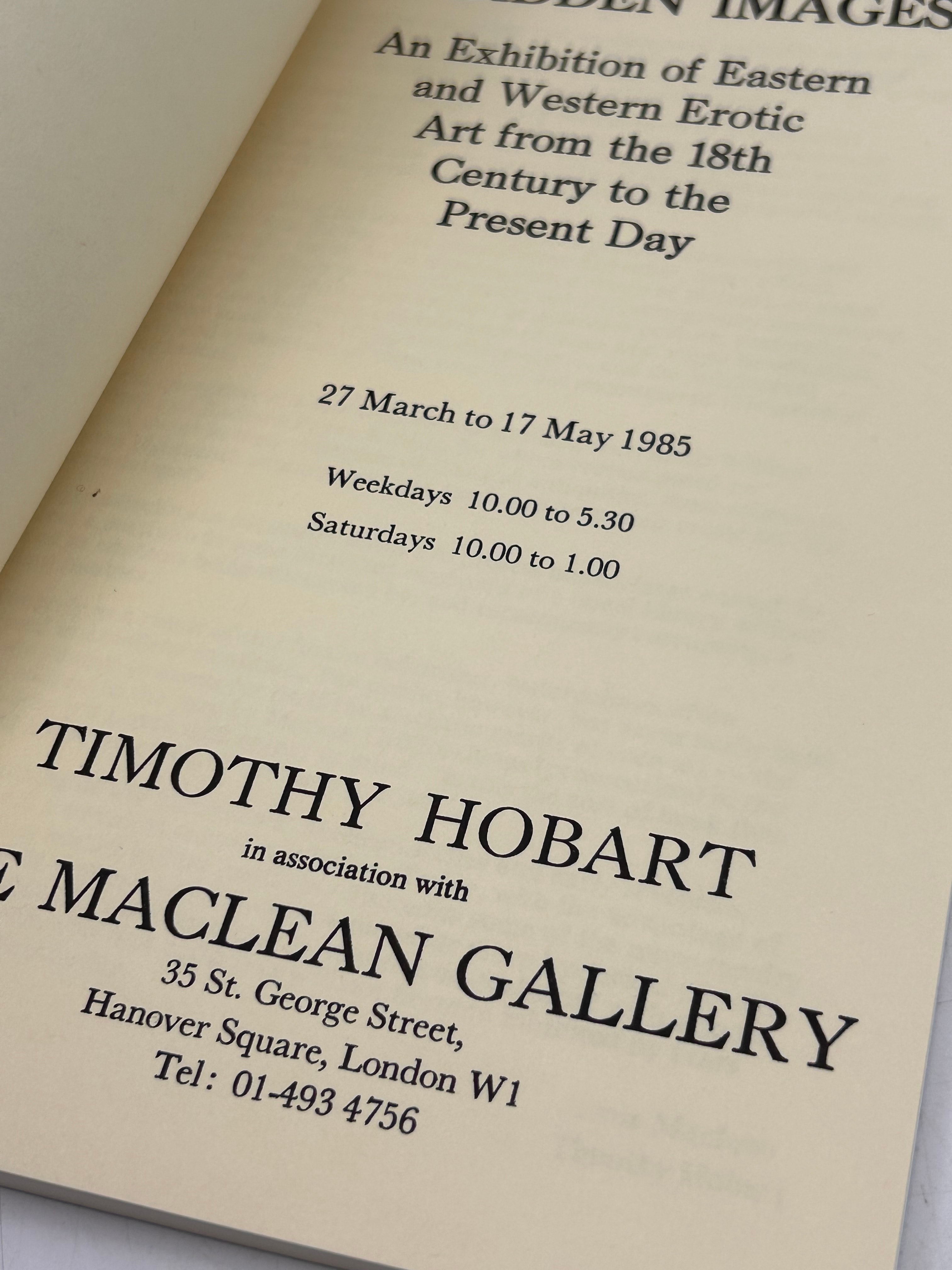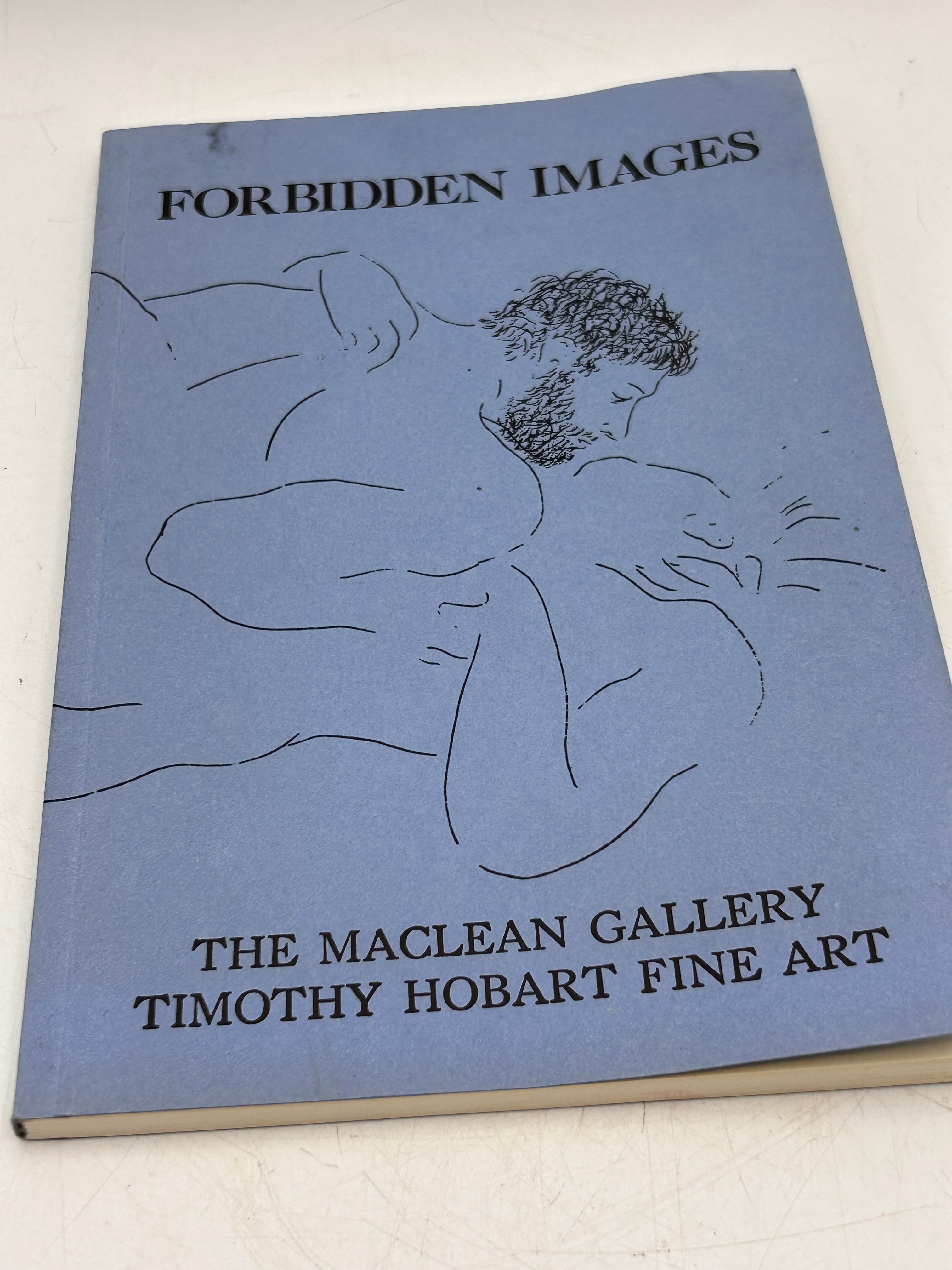 A softcover exhibition catalog titled “FORBIDDEN IMAGES,” published by The Maclean Gallery in association with Timothy Hobart Fine Art. This catalog documents “An Exhibition of Eastern and Western Erotic Art from the 18th Century to the Present Day,” held from March 27 to May 17, 1985, at 35 St. George Street, Hanover Square, London W1. The light blue paper cover features a black line drawing of a reclining nude figure. The internal pages contain both color and black-and-white reproductions of various artworks.