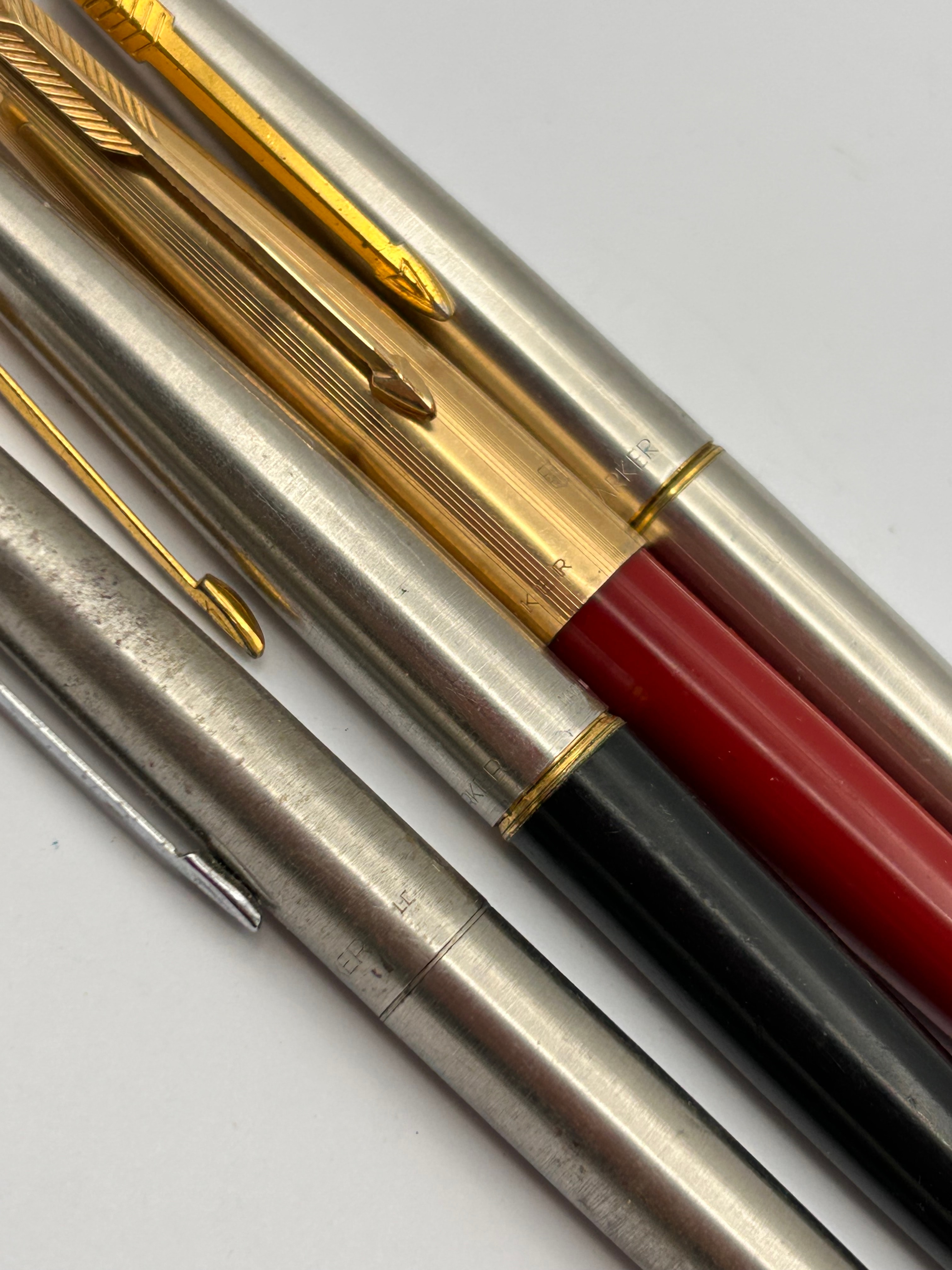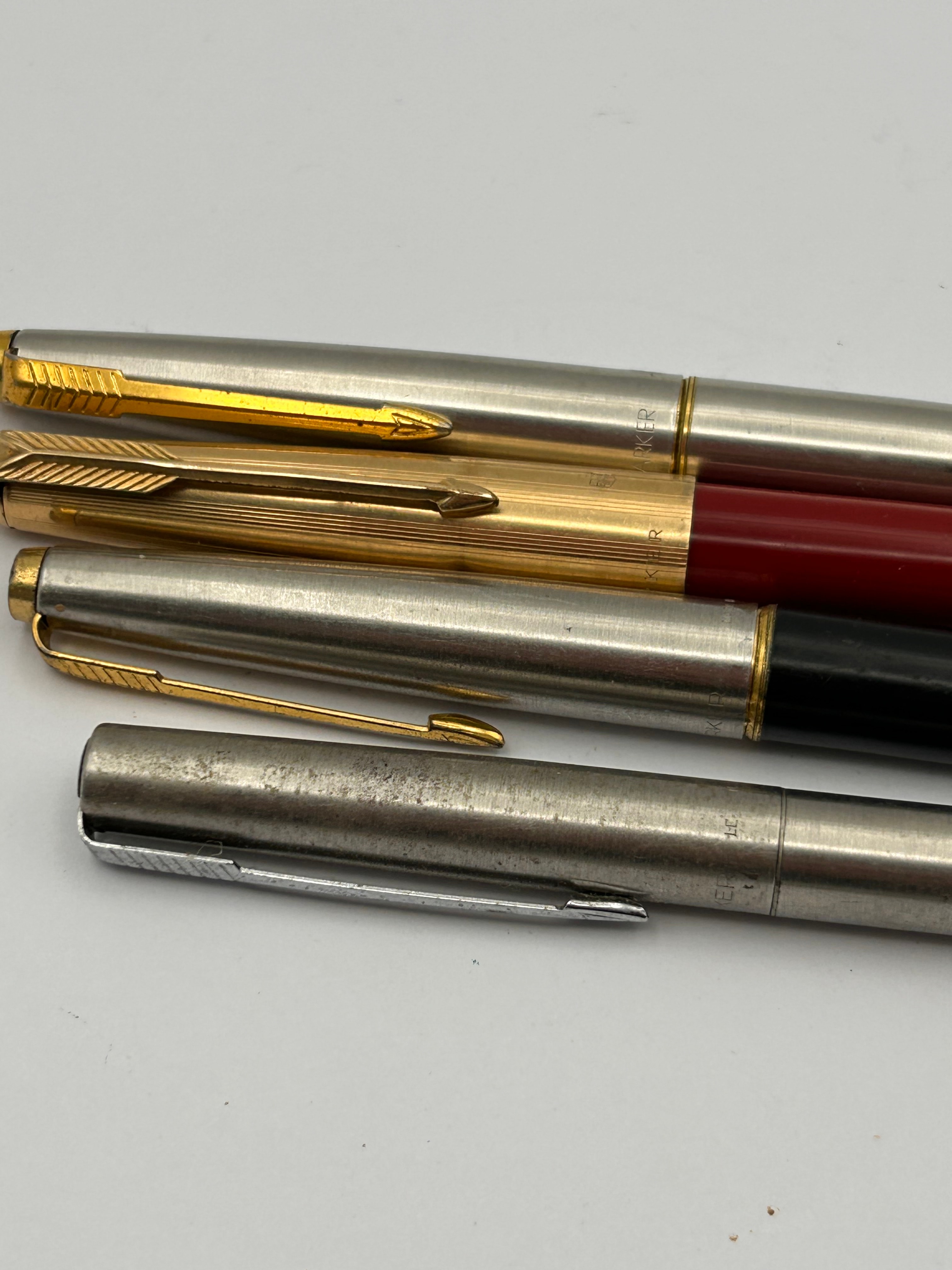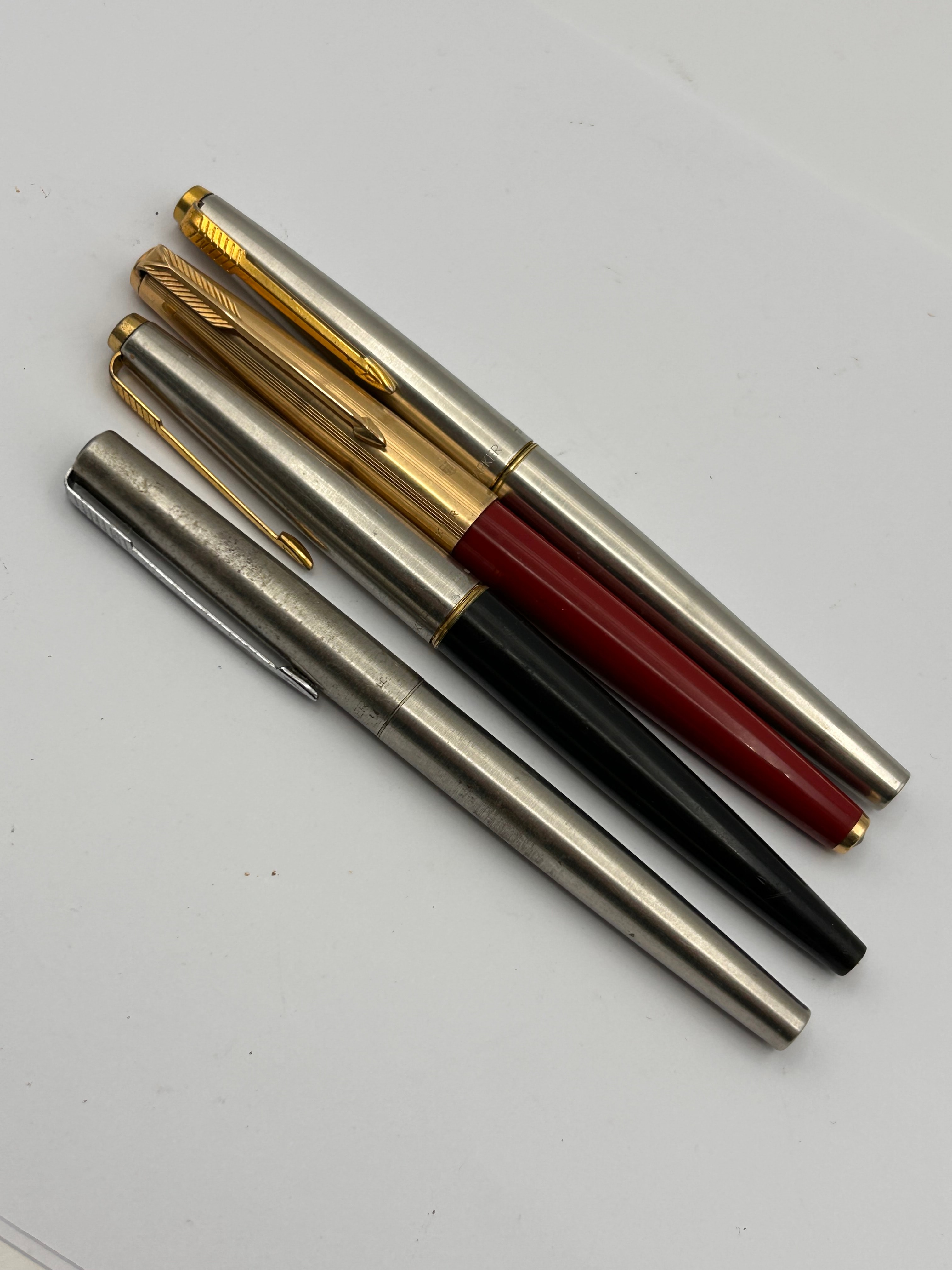 A set of four Parker 45 ‘Flighter’ fountain pens. Each pen features brushed stainless steel caps and barrels. The top two pens are accented with gold-plated clips and cap bands; the uppermost has a red barrel section, and the second a gold-colored barrel. The third pen exhibits a gold-plated clip and cap band paired with a black barrel section. The fourth pen appears entirely silver-toned, consistent with a full ‘Flighter’ model. All visible cap bands are marked ‘PARKER’ and feature the brand’s characteristic arrow-shaped clip.