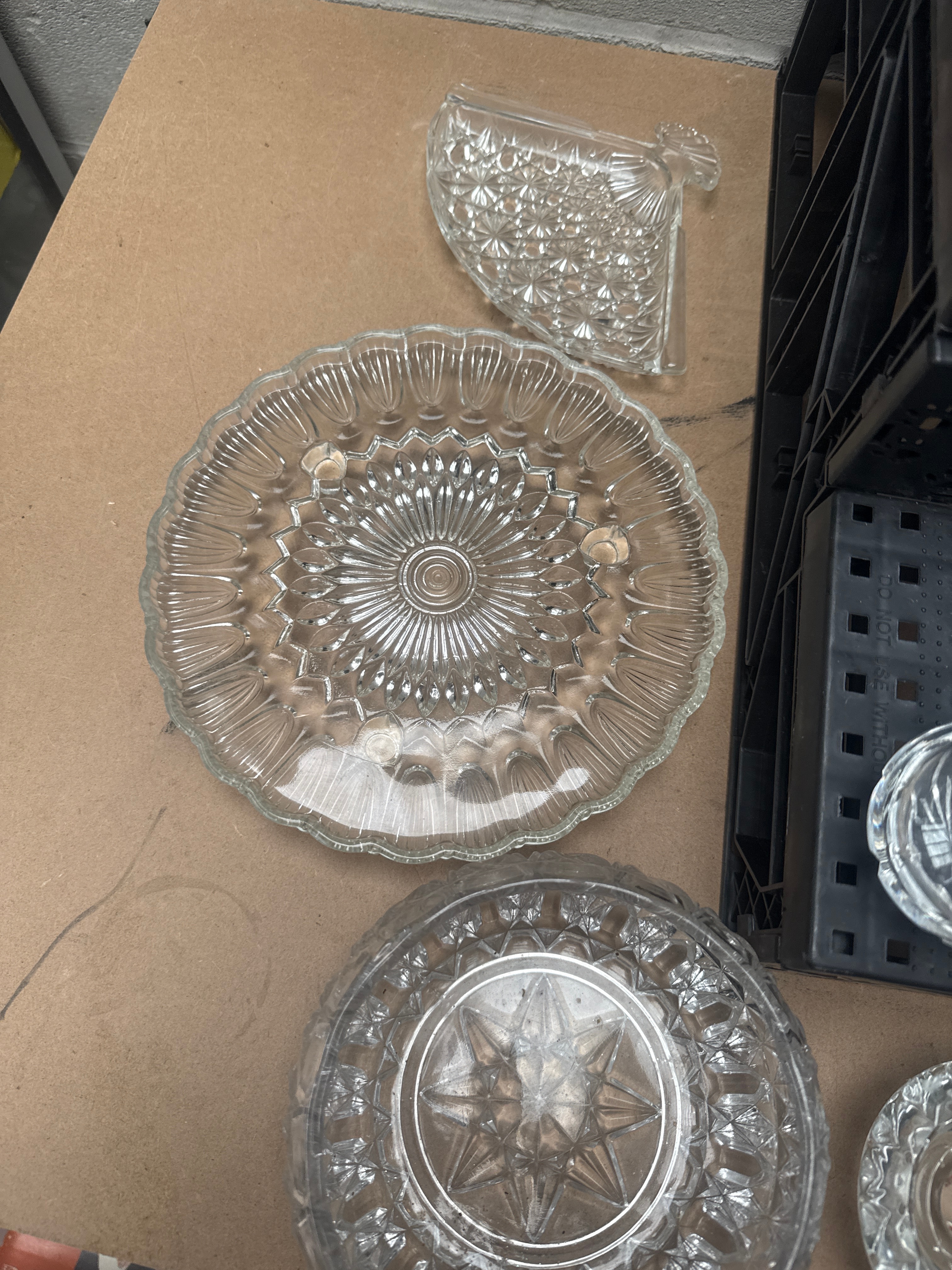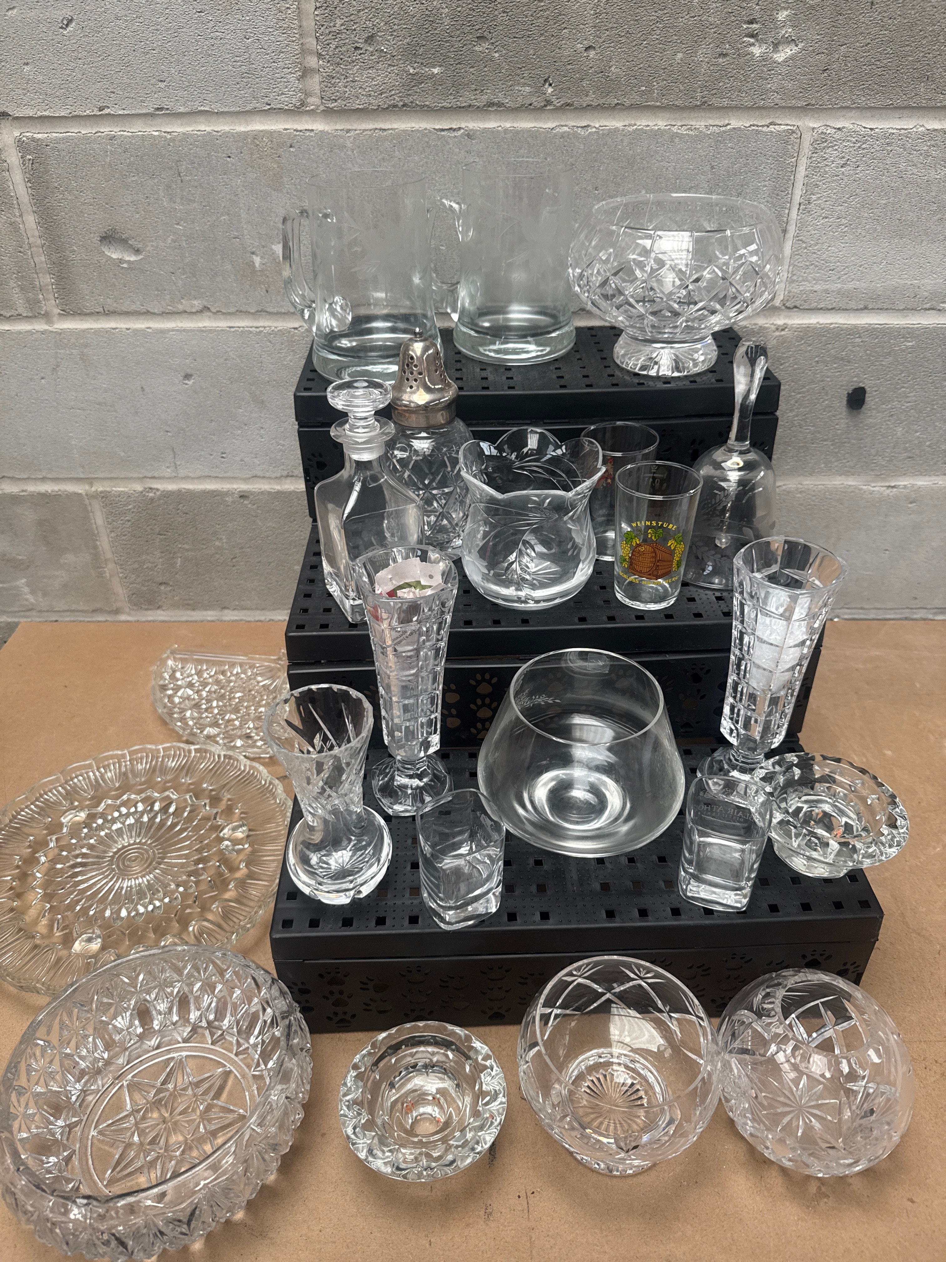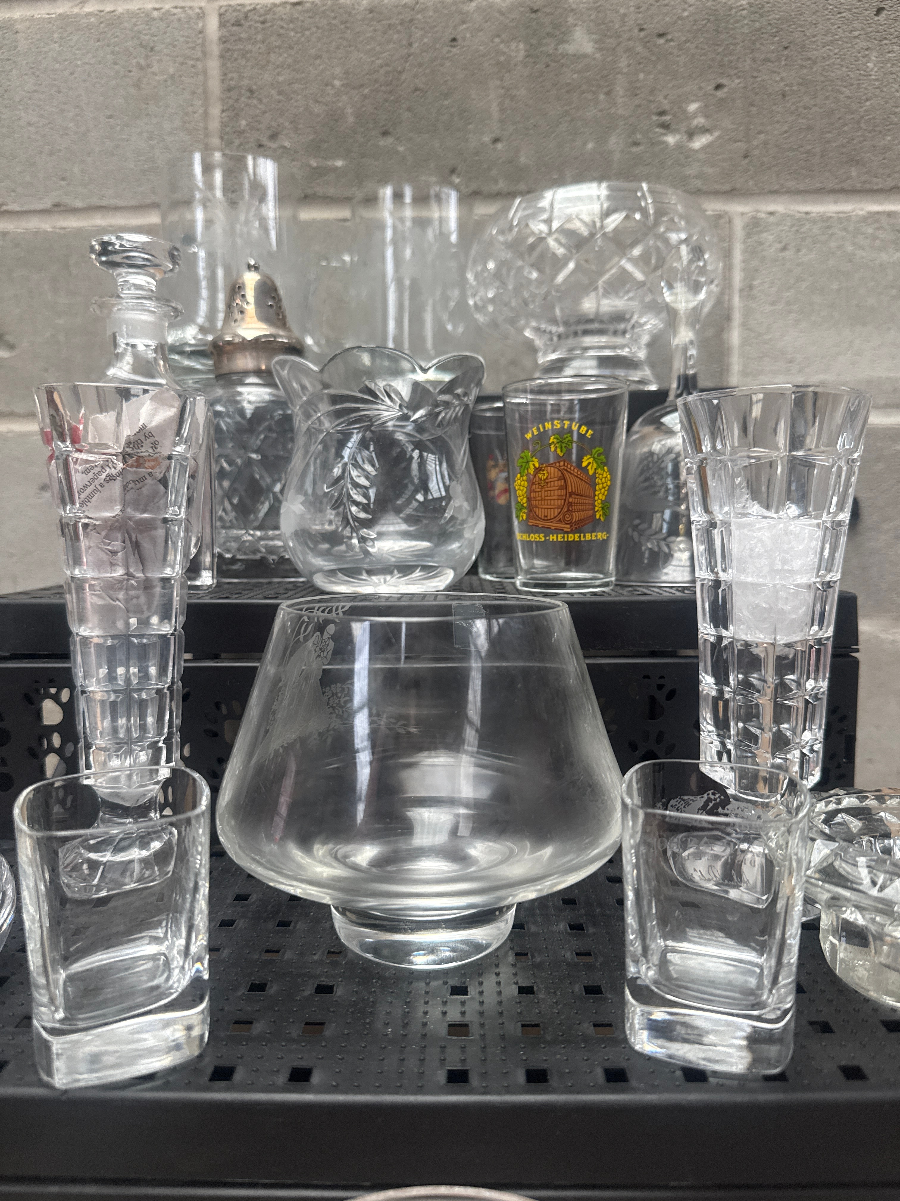 This diverse collection comprises approximately 30 pieces of clear glass and lead crystal, encompassing various drinkware and decorative serving items. The styles range from plain functional pieces to those featuring elaborate cut and pressed patterns, including starburst, diamond, and fluted designs. Specific items include multiple pitchers, various decanters (one with a silver-colored metal stopper), an assortment of bowls in different sizes and patterns, numerous tumblers and shot glasses, small vases, and decorative plates. One shot glass clearly displays the text “WEINGUT SCHLOSS-HEIDELBERG” (Winery Heidelberg Castle) alongside a barrel and grape cluster motif. The collection includes examples of cut crystal, possibly Edinburgh crystal, and pressed glass.