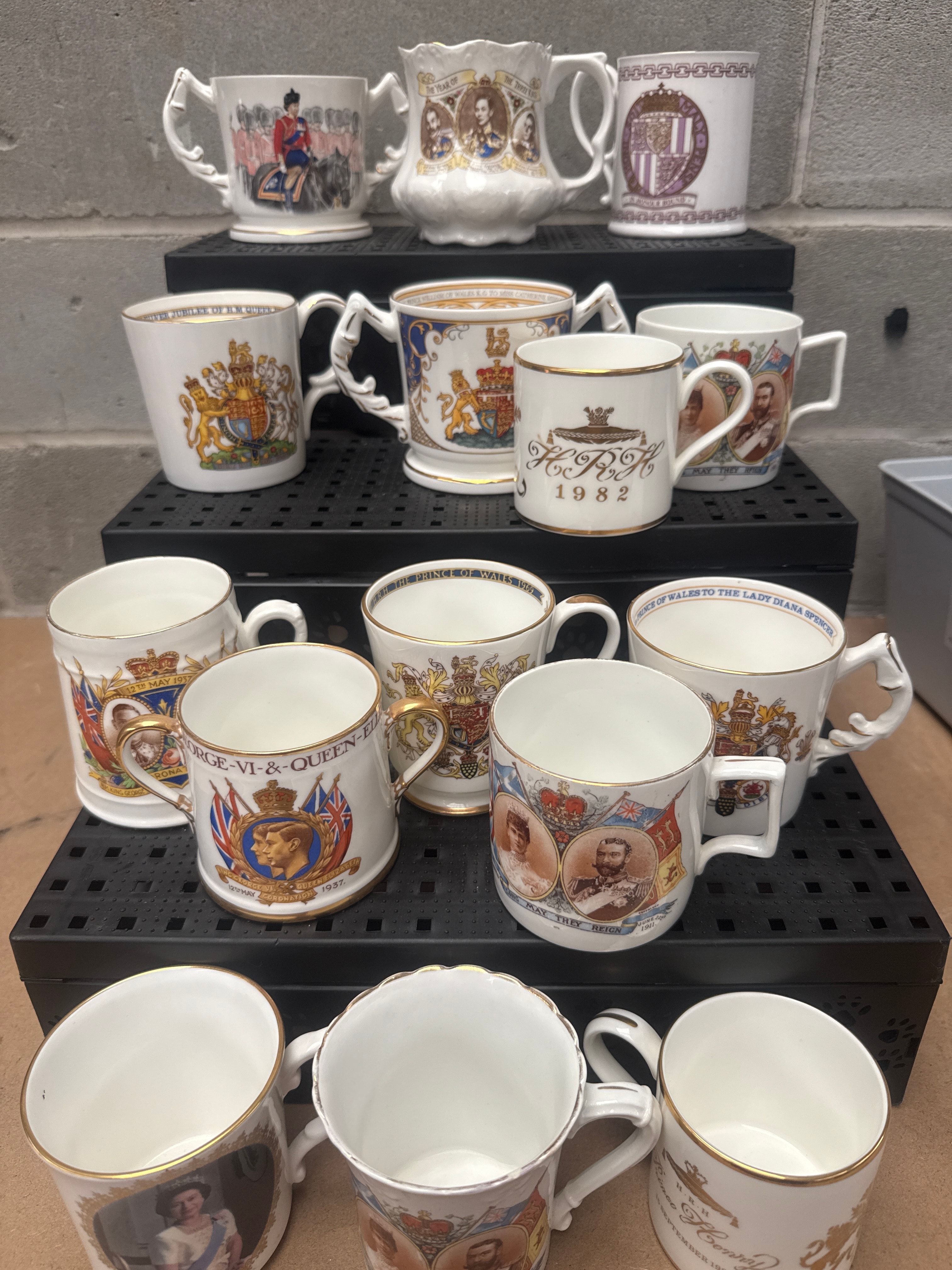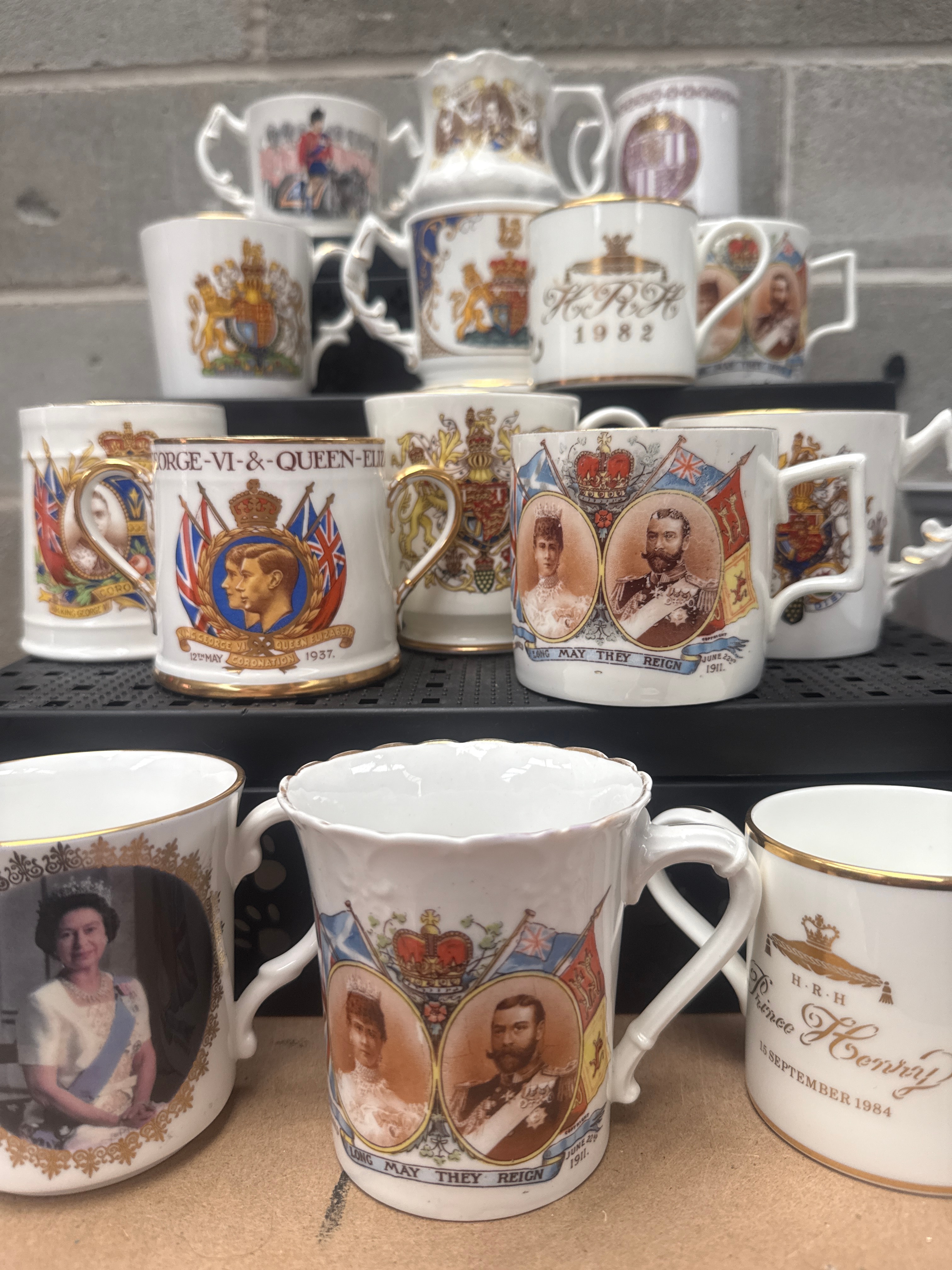 A collection of fifteen British Royal commemorative mugs, many by Aynsley, with some examples potentially from other esteemed manufacturers such as Wedgwood. The lot primarily depicts various British royal family members and significant events, including King George V, Queen Mary, King George VI, Queen Elizabeth, Queen Victoria, and Queen Elizabeth II, alongside royal coats of arms, flags, and decorative motifs. Visible text and dates include “GEORGE VI & QUEEN ELIZABETH 1937”, “MAY THEY REIGN 1911”, “1982”, and “H.R.H. PRINCE HENRY 13 SEPTEMBER 1984”. The collection presents a range of styles, from demitasse to tankard, often featuring gilt accents, and includes examples crafted from fine bone china.