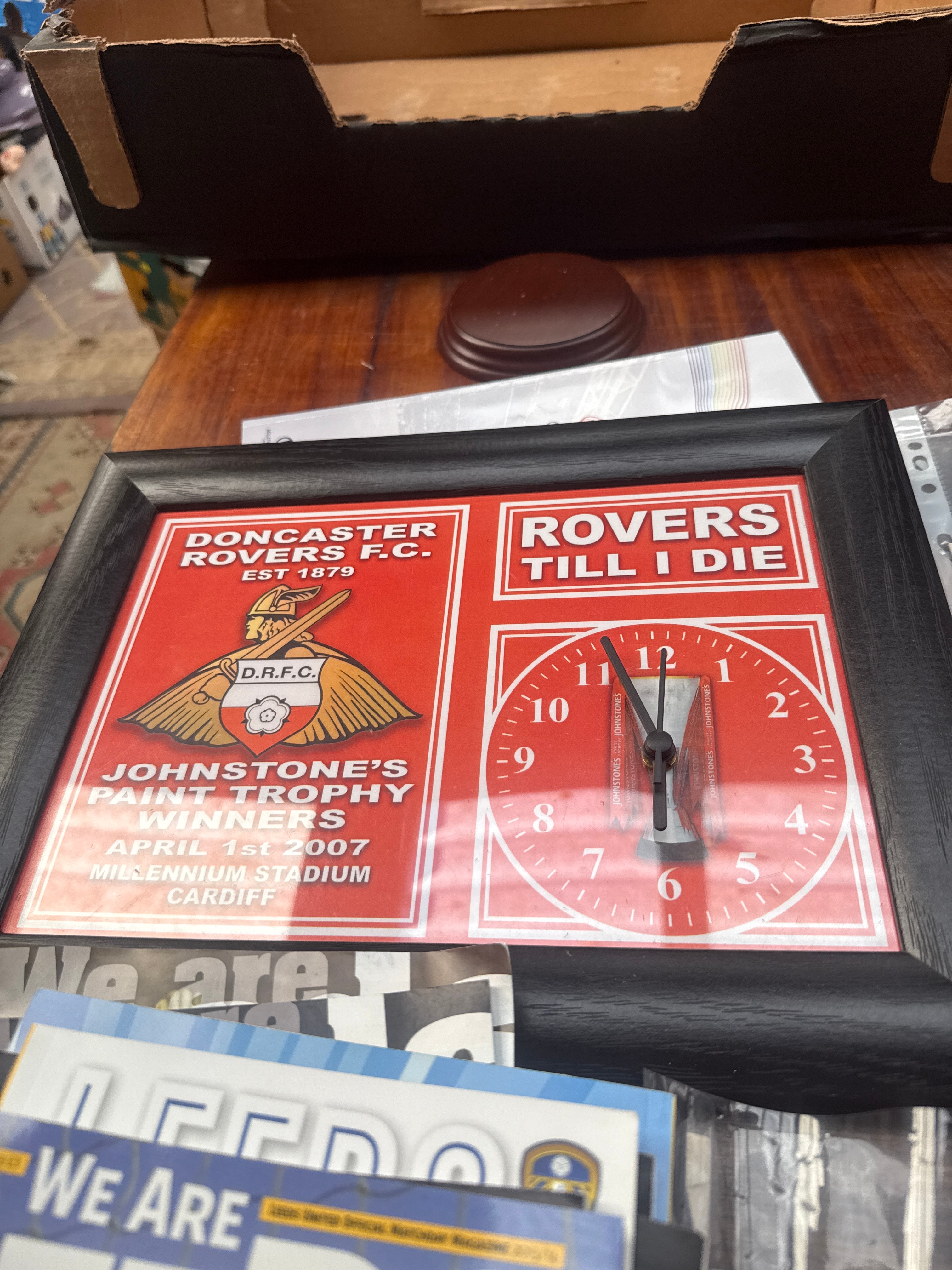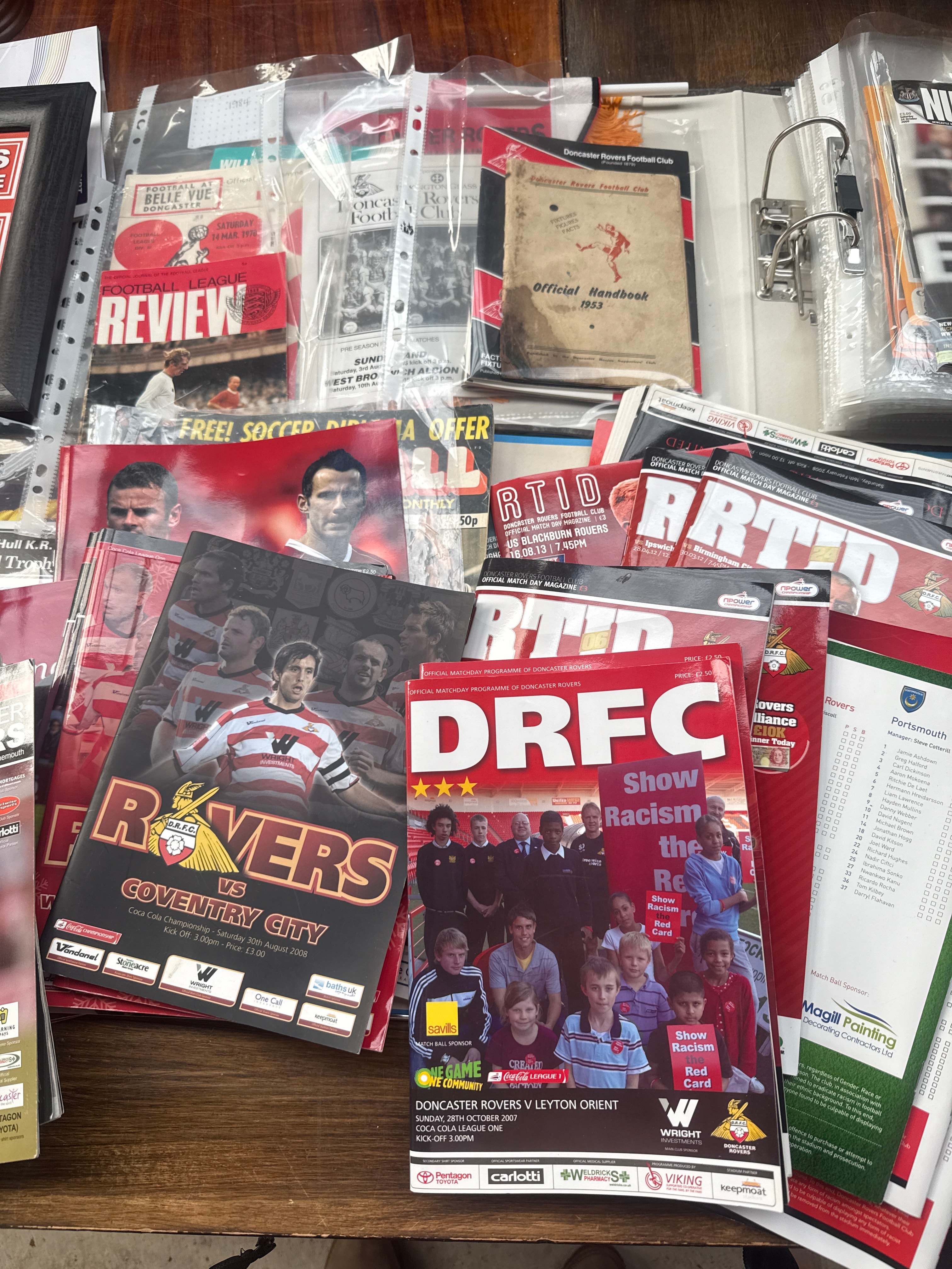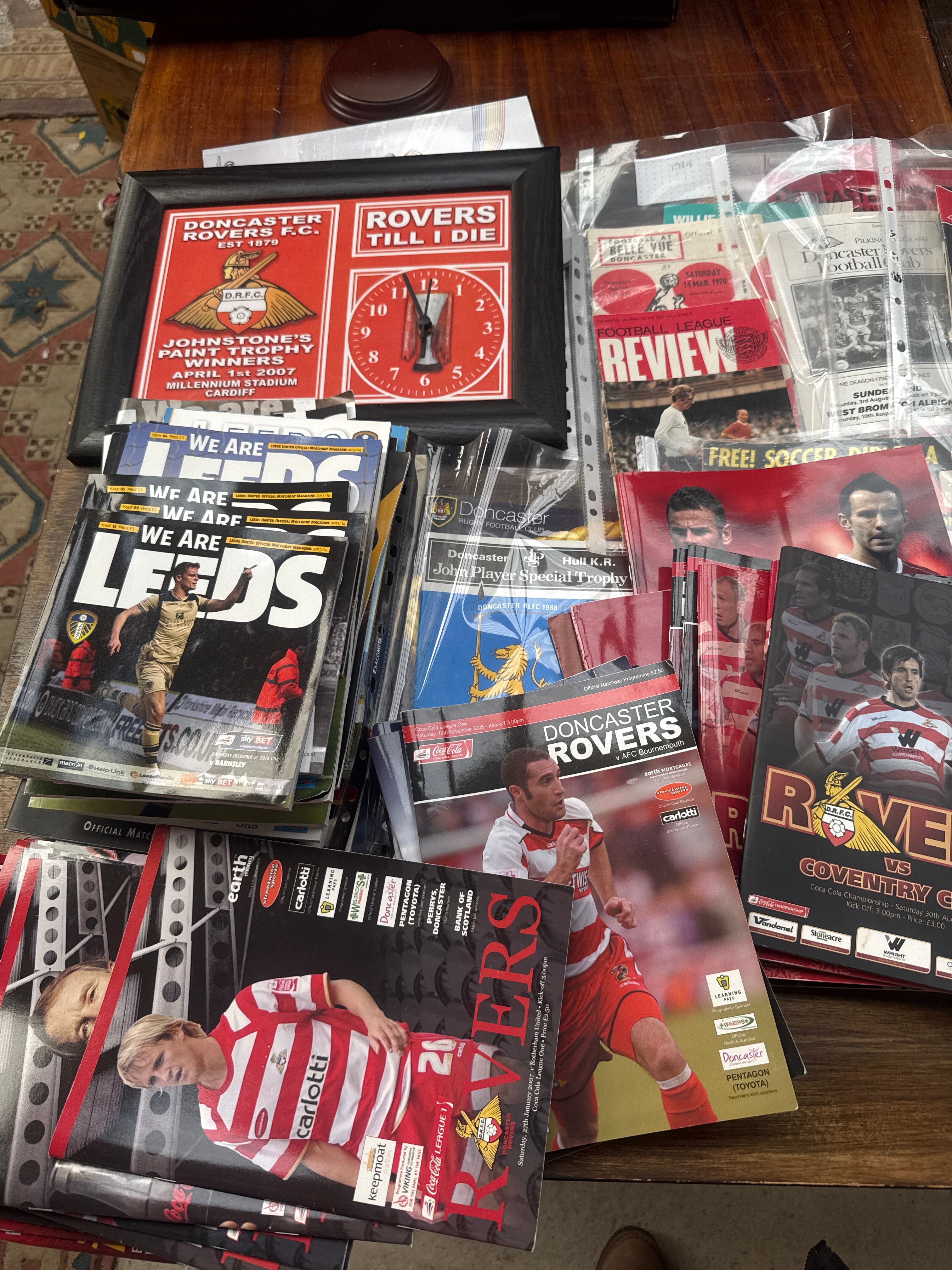 A substantial collection of football memorabilia, primarily focused on Doncaster Rovers F.C., spanning from the mid-20th century to more contemporary pieces. The collection includes a framed commemorative clock displaying “Doncaster Rovers F.C. EST 1879,” “Johnstone’s Paint Trophy Winners April 1st 2007,” and the slogan “Rovers Till I Die.” Also present is an “Official Handbook 1953” for Doncaster Rovers Football Club, featuring “Fixtures Figures Facts.” The majority of the collection comprises numerous matchday programmes, many preserved in plastic sleeves, representing matches involving Doncaster Rovers and various other clubs such as Leeds, Aldershot (dated “Tuesday, 27th September 1963”), Swindon Town, Coventry City (28th October 2006), Leyton Orient (28th October 2007), Newcastle United, Hereford United (29th August 1981), Crewe Alexandra, and Portsmouth. Some programmes promote “Show Racism the Red Card.”