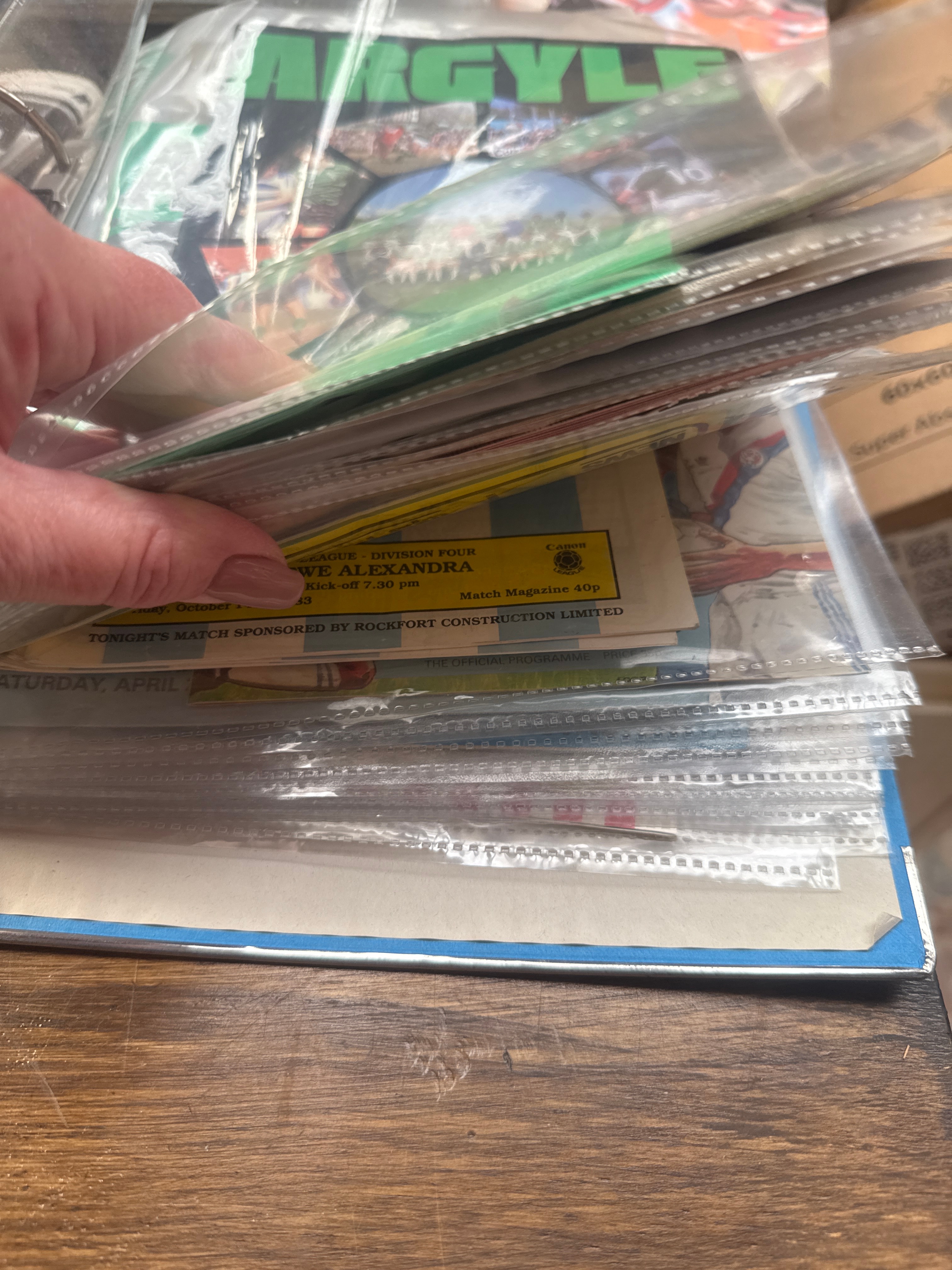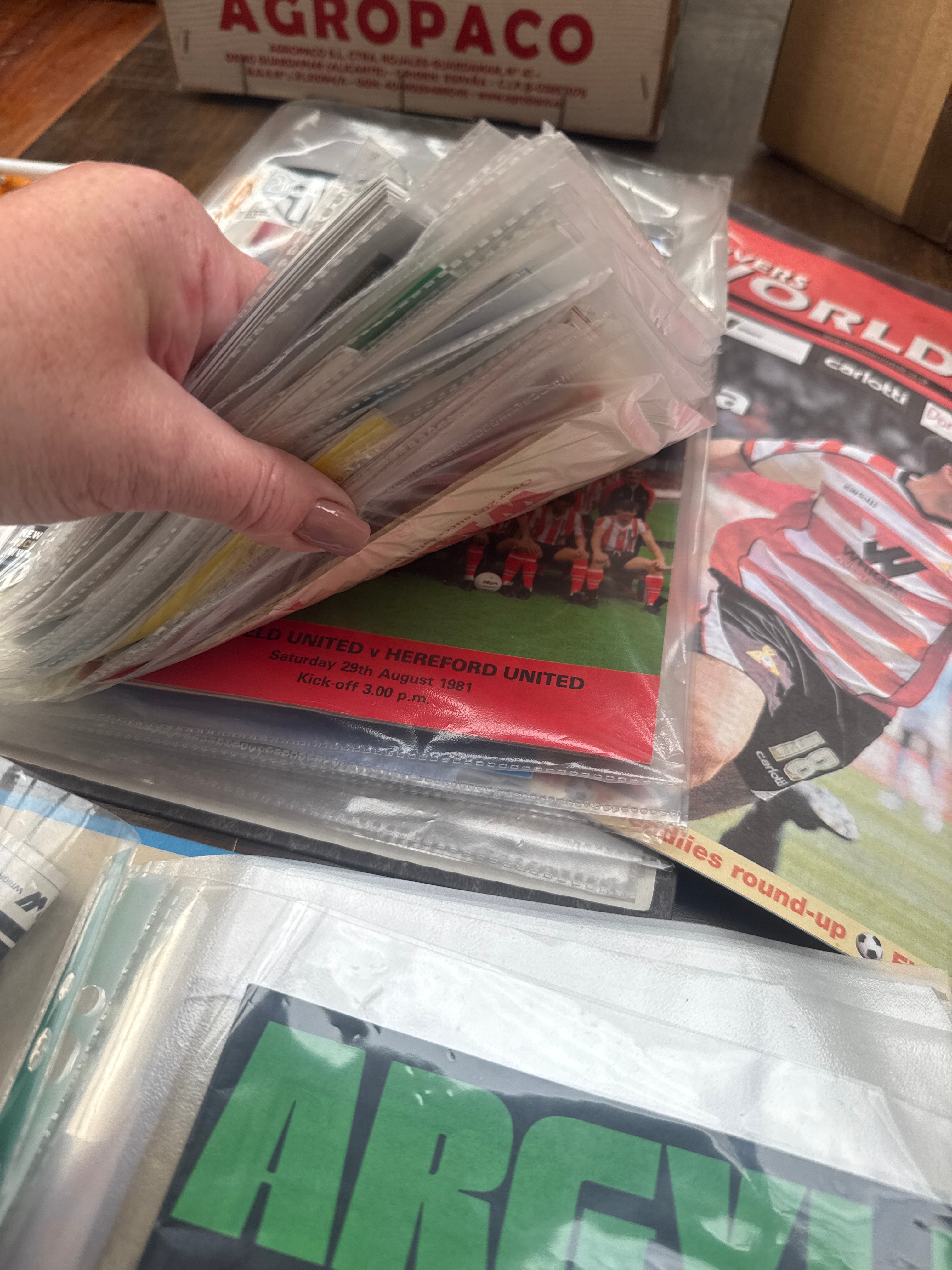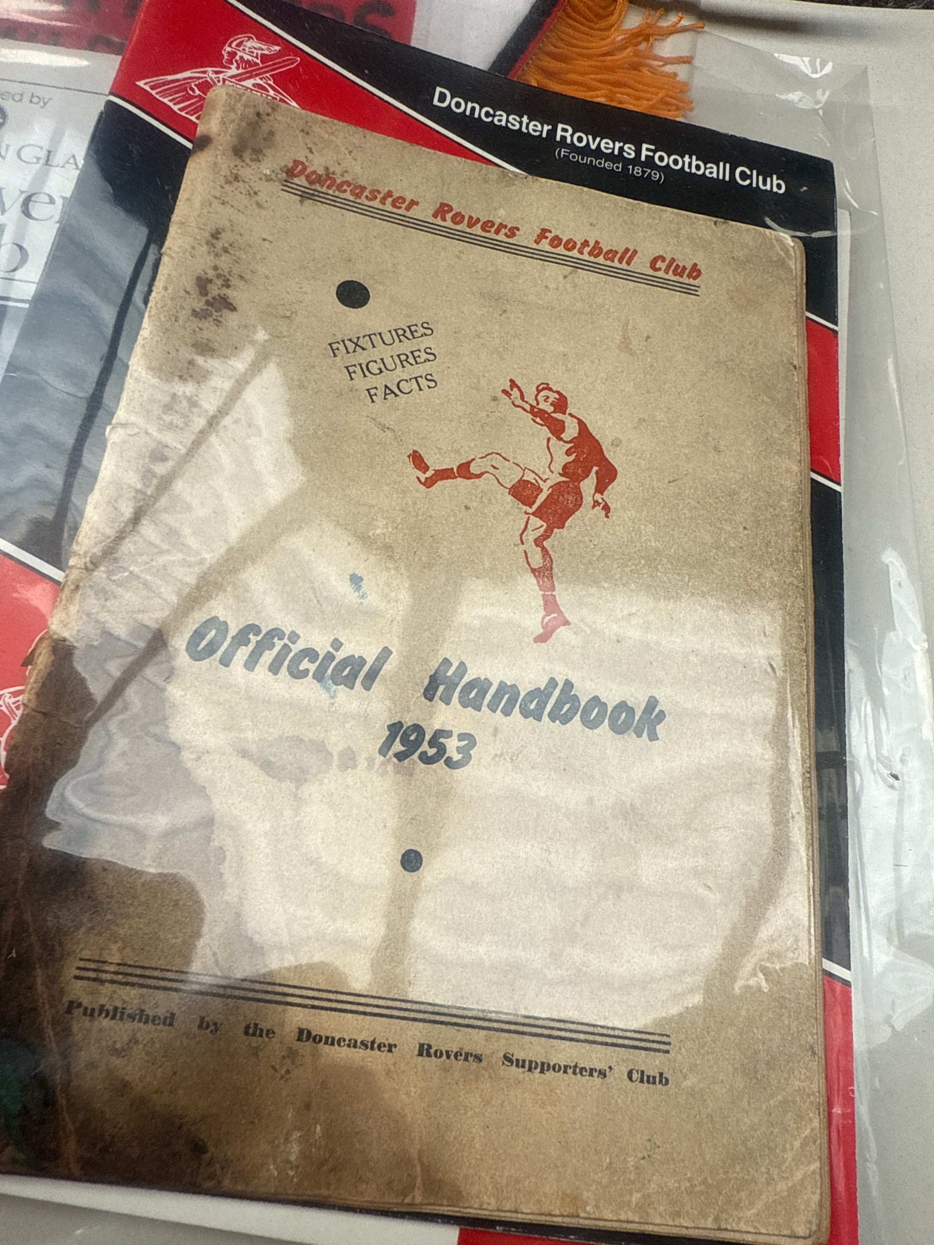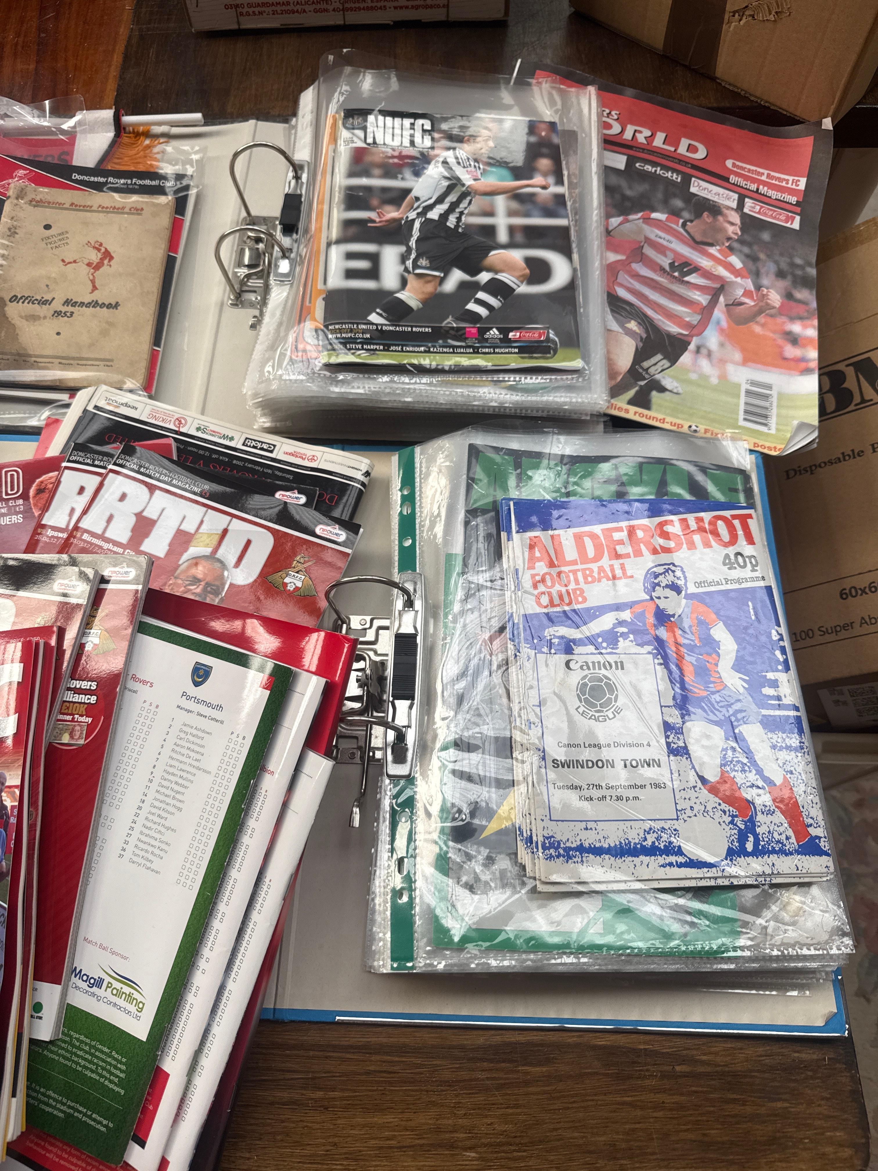 A substantial collection of football memorabilia, primarily focused on Doncaster Rovers F.C., spanning from the mid-20th century to more contemporary pieces. The collection includes a framed commemorative clock displaying “Doncaster Rovers F.C. EST 1879,” “Johnstone’s Paint Trophy Winners April 1st 2007,” and the slogan “Rovers Till I Die.” Also present is an “Official Handbook 1953” for Doncaster Rovers Football Club, featuring “Fixtures Figures Facts.” The majority of the collection comprises numerous matchday programmes, many preserved in plastic sleeves, representing matches involving Doncaster Rovers and various other clubs such as Leeds, Aldershot (dated “Tuesday, 27th September 1963”), Swindon Town, Coventry City (28th October 2006), Leyton Orient (28th October 2007), Newcastle United, Hereford United (29th August 1981), Crewe Alexandra, and Portsmouth. Some programmes promote “Show Racism the Red Card.”