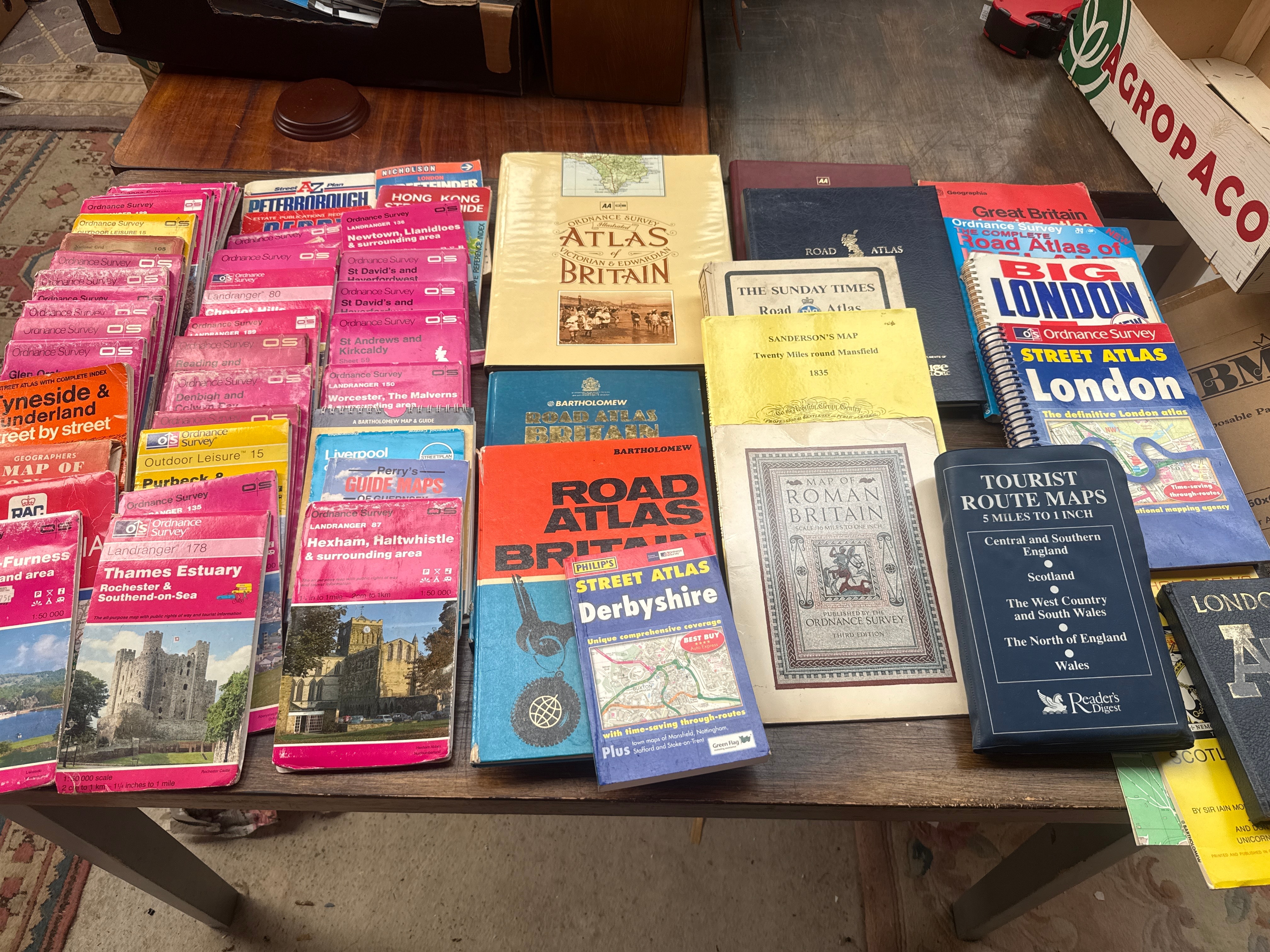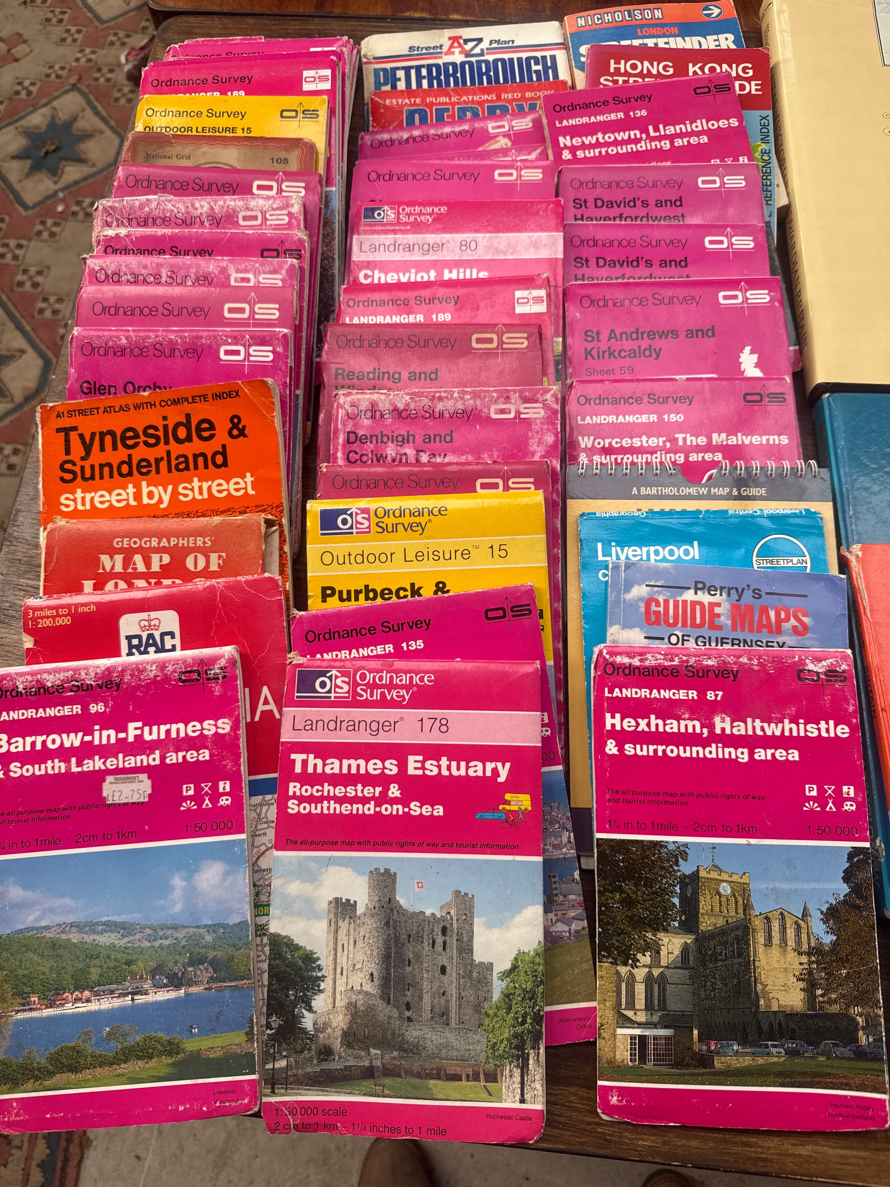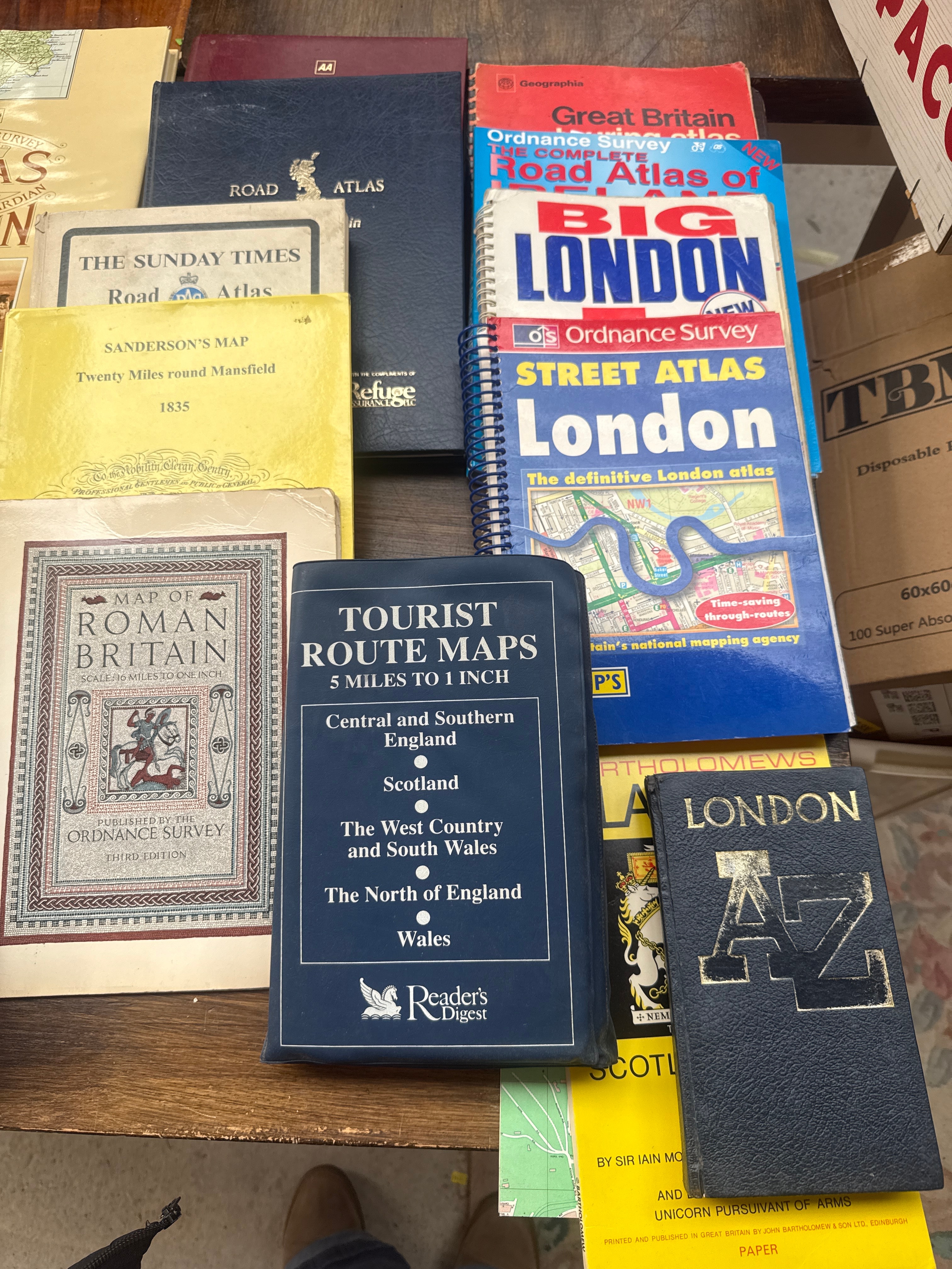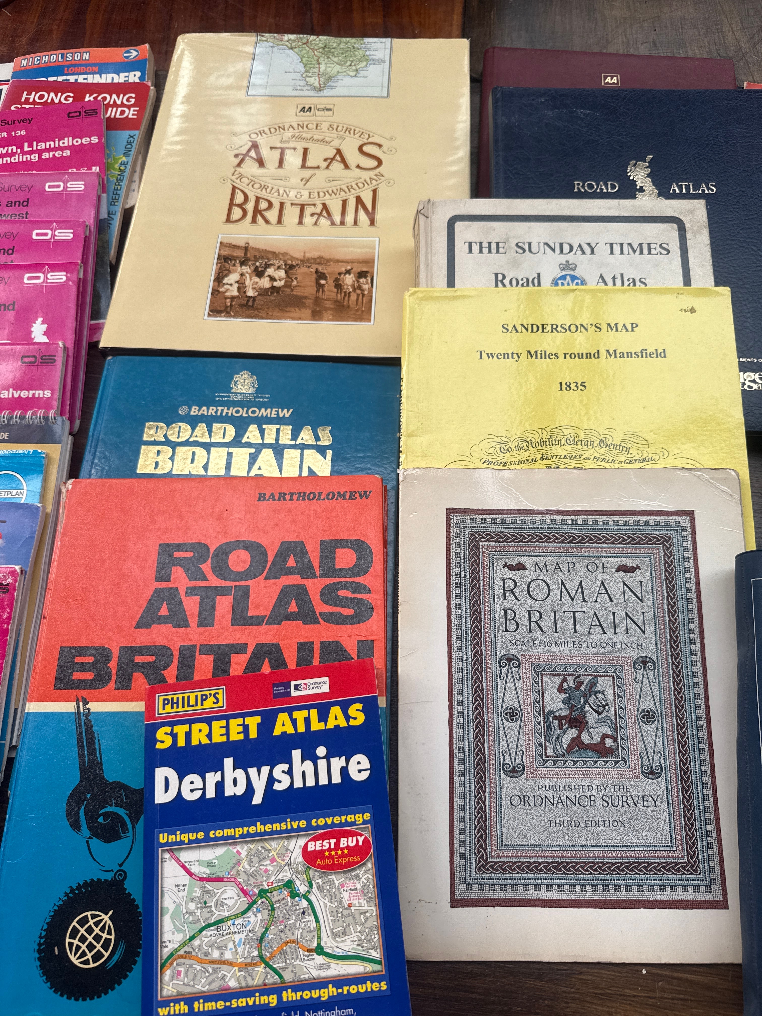 This diverse collection comprises approximately 50-60 maps, atlases, and guidebooks, predominantly focusing on Great Britain and its constituent regions, with one item clearly marked “Hong Kong.” The collection spans a range of styles and periods, from an antique-appearing “Sanderson’s Map” dated 1835 and a “Map of Roman Britain” (Third Edition) to numerous modern, brightly colored paperbacks and spiral-bound street atlases. Prominently featured publishers and series include Ordnance Survey (OS Landranger, Outdoor Leisure), Bartholomew, Philip’s, AA, RAC, and Reader’s Digest. Visible titles include “Road Atlas Britain,” “Street Atlas London,” “Big London,” “Tourist Route Maps,” and specific regional atlases for areas such as Derbyshire, Liverpool, Thames Estuary, and various towns and counties across England, Scotland, and Wales. The collection includes examples consistent with “Bartholomew Road Atlas Britain Hardcover Vintage 1970-71” as identified by web intelligence, alongside other vintage and contemporary examples. The materials are primarily paper and cardstock, with some items featuring glossy, plasticized covers or more robust fabric-covered hardbacks.