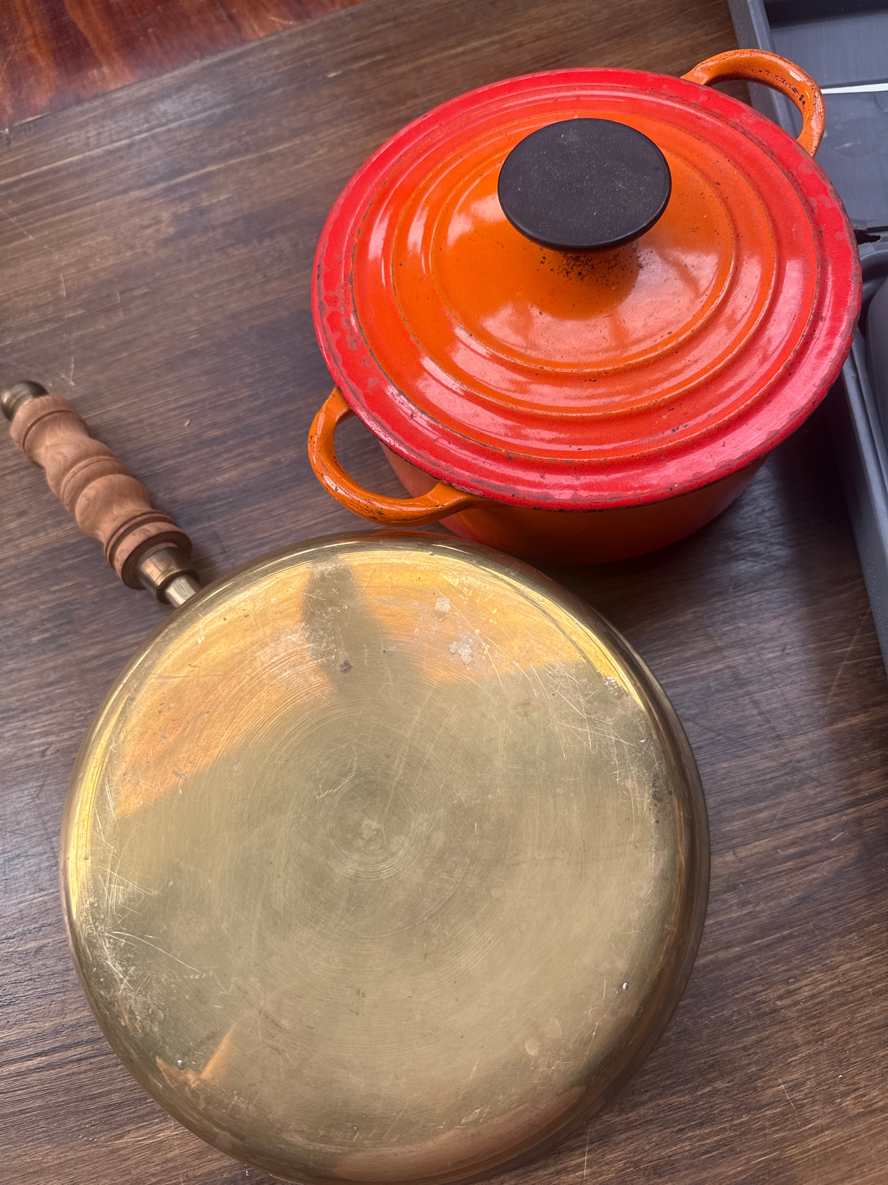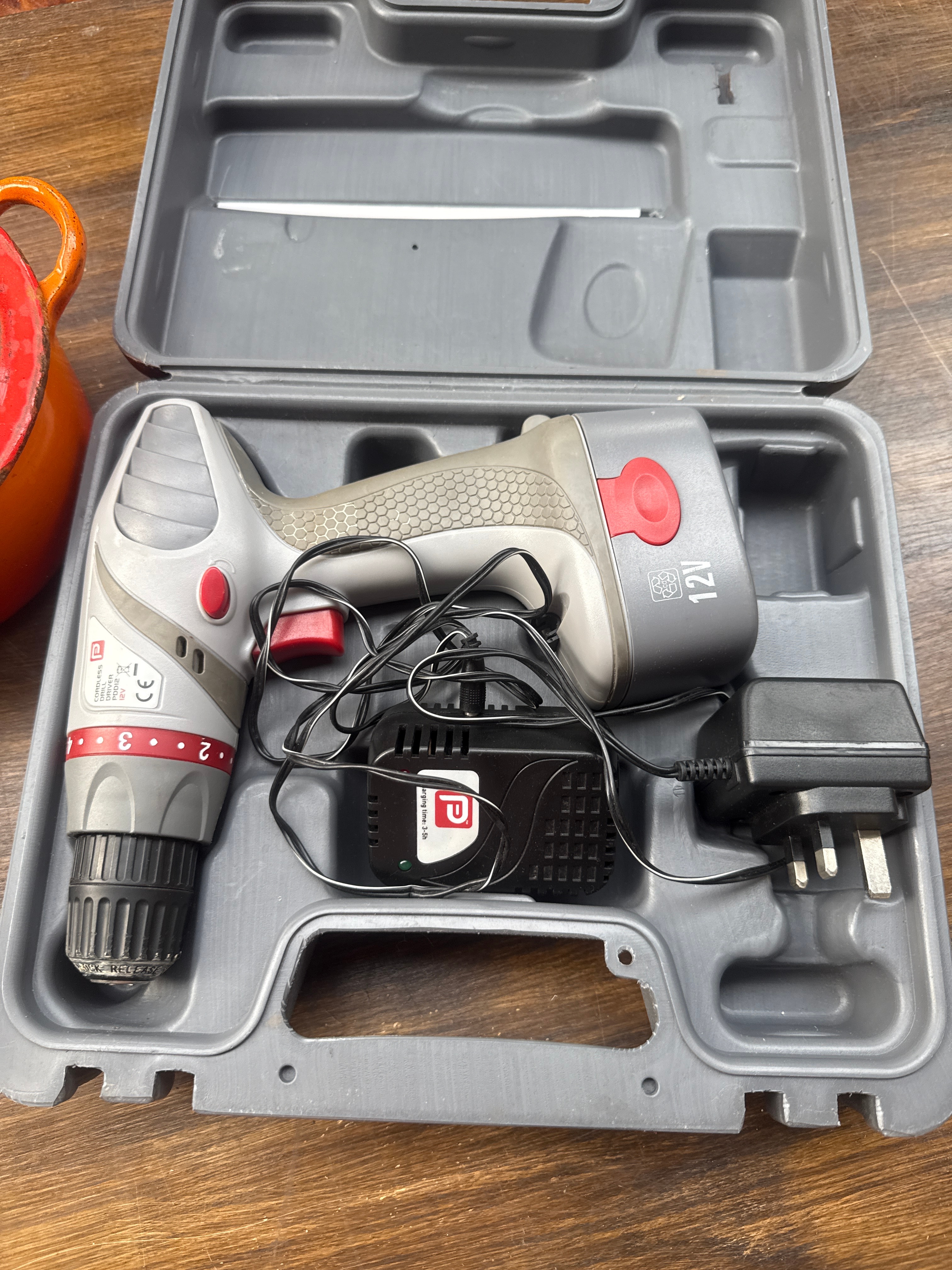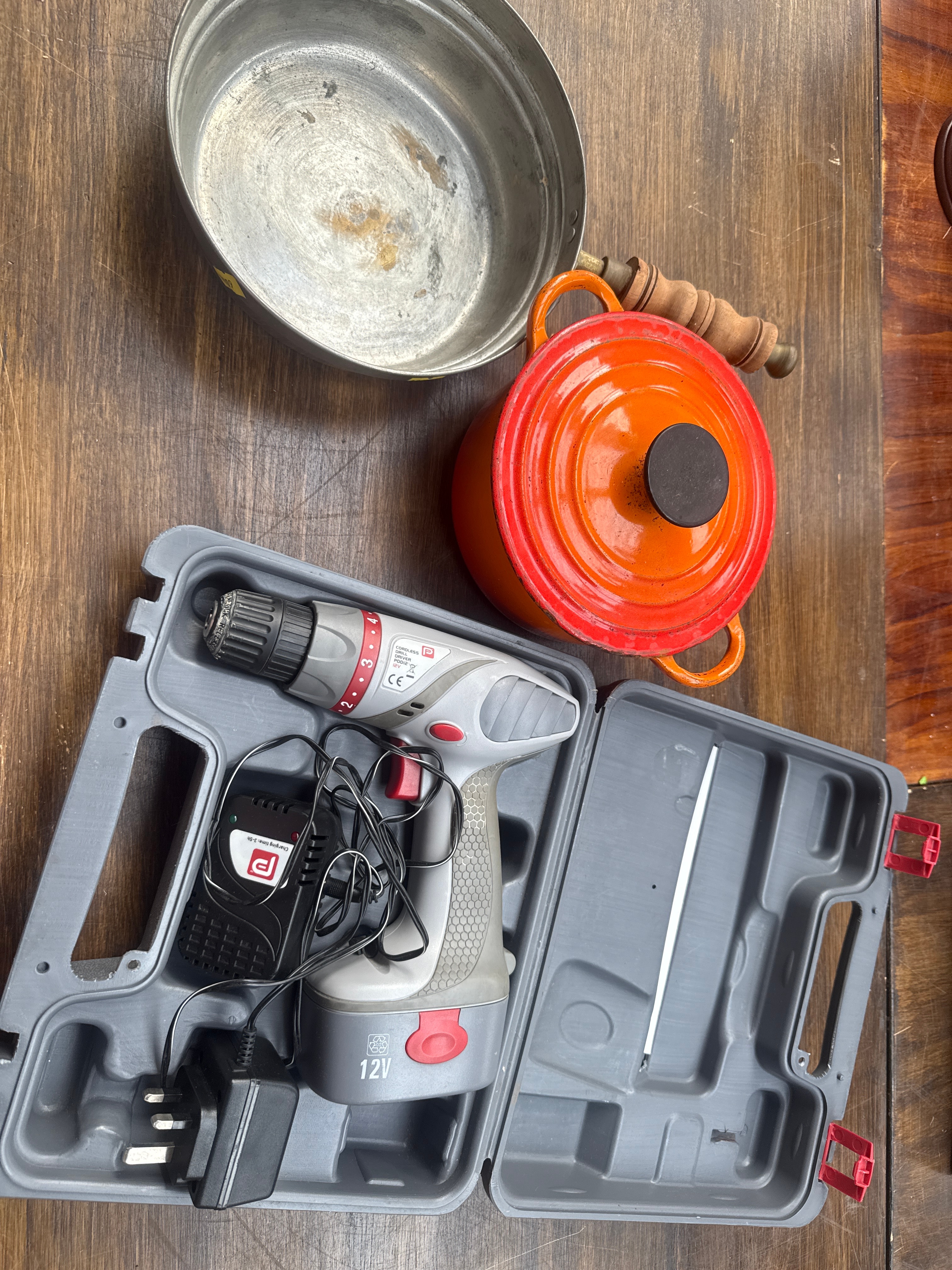 A modern 12V cordless drill/driver kit, set in a grey plastic carrying case, complete with its charger and cable. The drill bears a “CE” conformity mark. Accompanying this is an orange enameled cast iron round casserole dish with a lid. Also included is a brass-toned metal frying pan with a wooden handle.