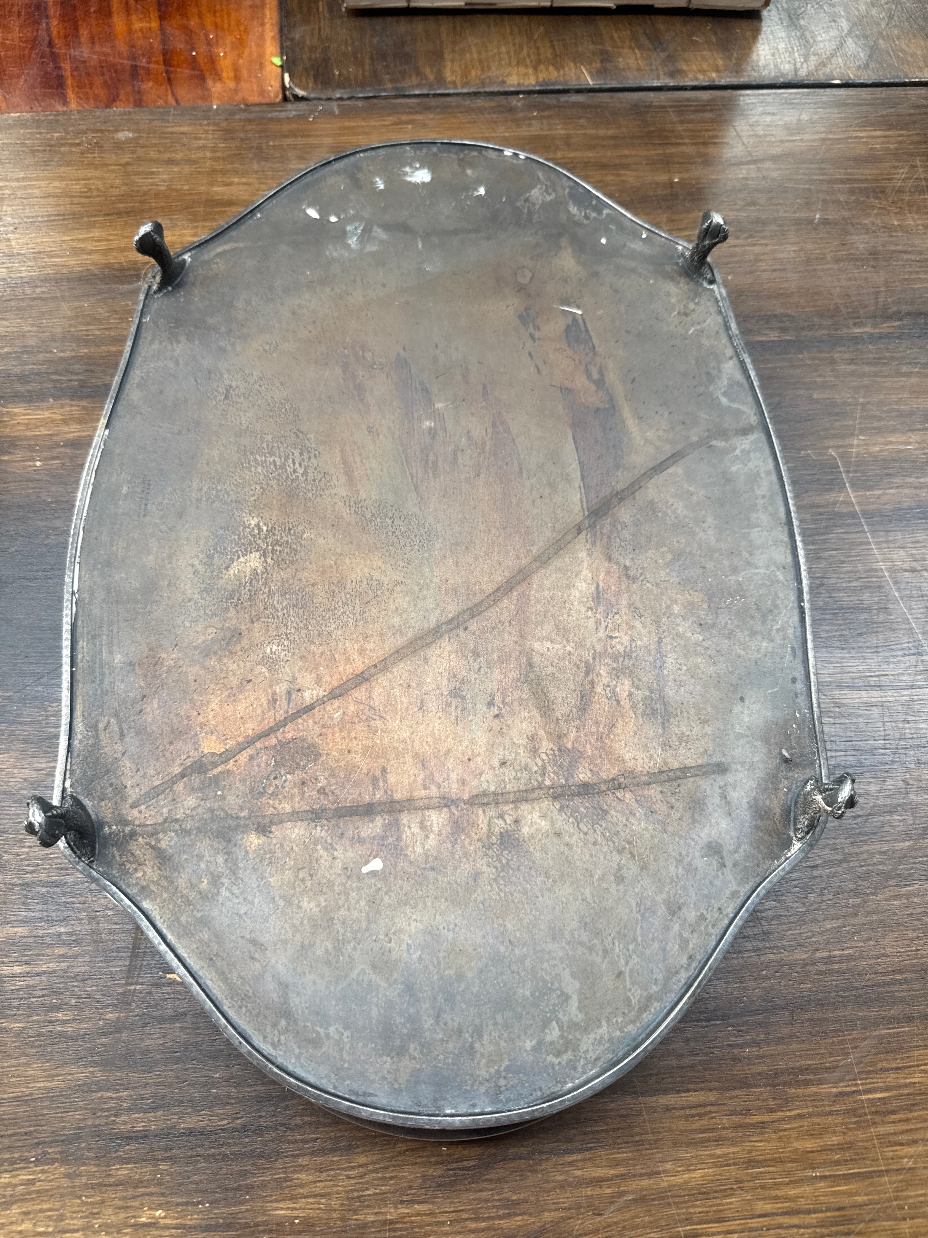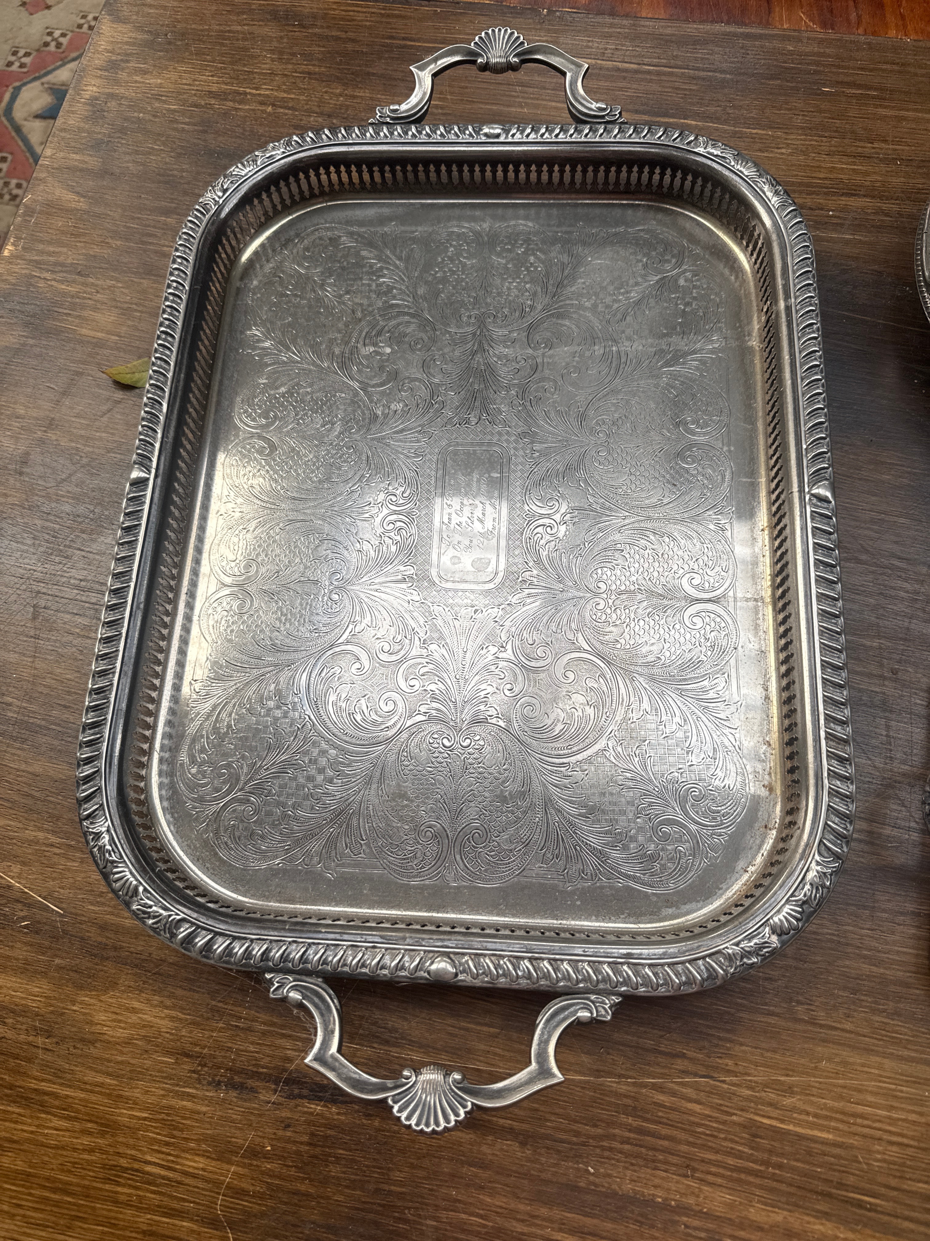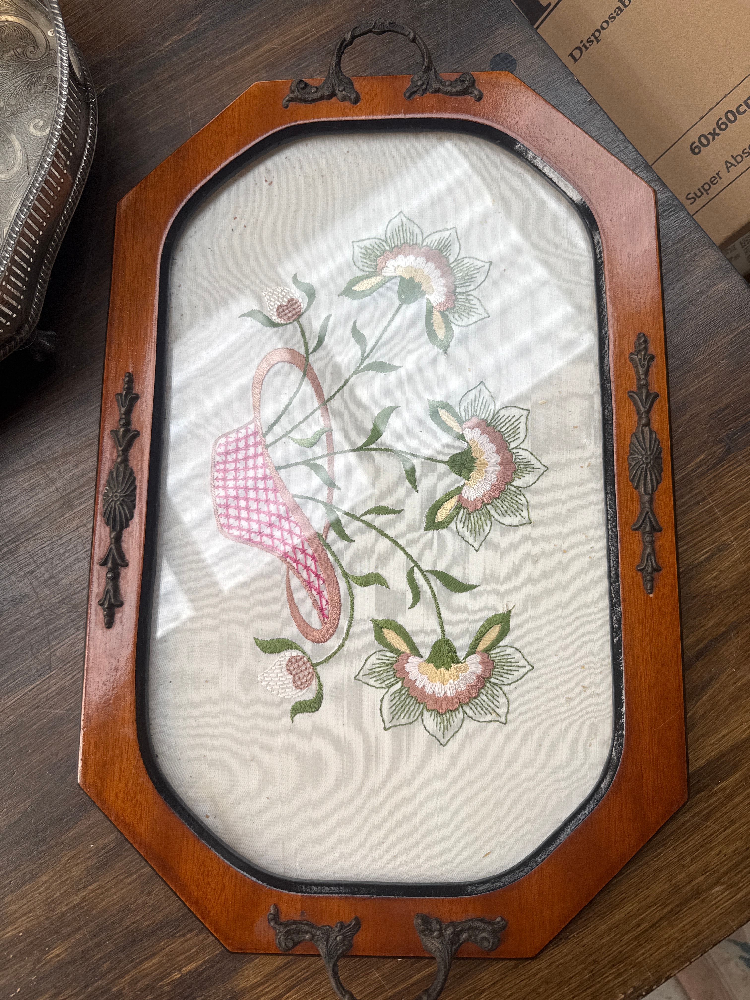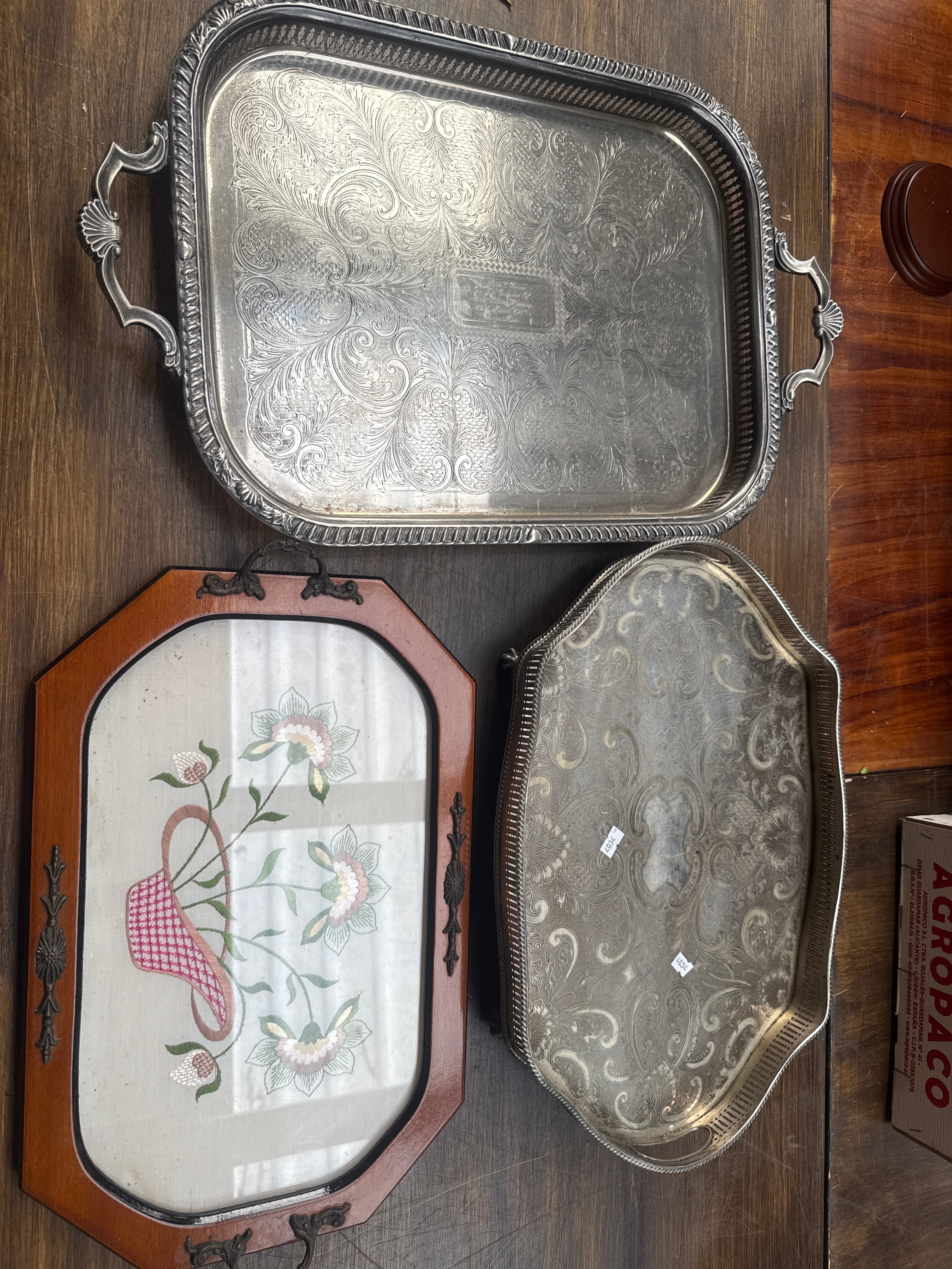 An Oneida silverplate rectangular serving tray, featuring a reeded rim, prominent shell-motif handles, and an elaborately engraved surface with extensive scrollwork surrounding a central cartouche. Also included is an octagonal wooden-framed panel with ornate brass-toned metal handles, enclosing a glass-covered needlework panel depicting a wide-brimmed hat and floral sprigs on a cream fabric. The third item is a smaller, footed shaped silver-colored tray with a rococo-style scalloped edge and engraved scrollwork.