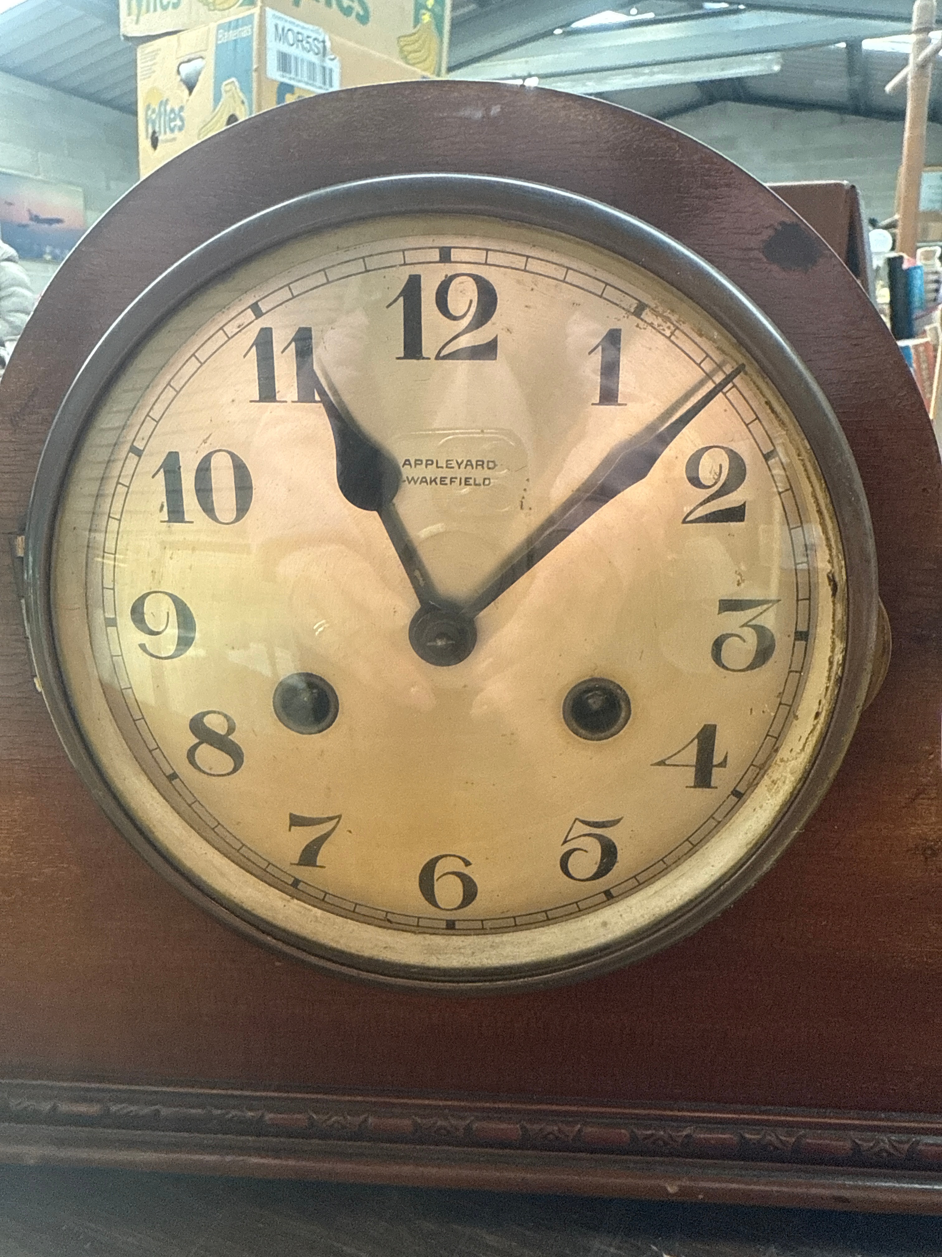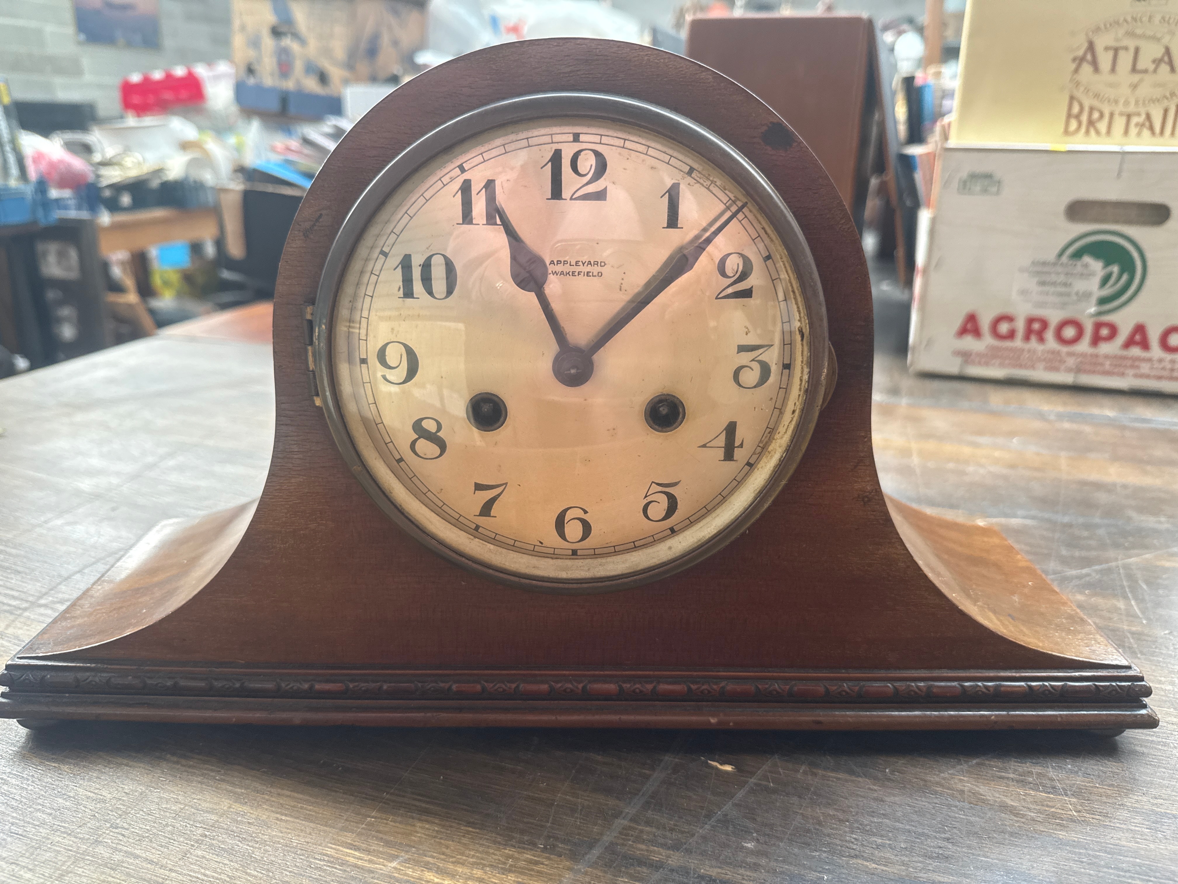 A vintage hardwood mantel clock by Appleyard of Wakefield, crafted in the popular Napoleon Hat style, likely dating to the early to mid-20th century. The clock features a domed top and a stepped plinth base. The stained hardwood case encloses a cream-colored dial, which is protected by a brass bezel. The dial displays black Arabic numerals and spade-style hands. Two winding holes are visible, suggesting a time-and-strike movement.