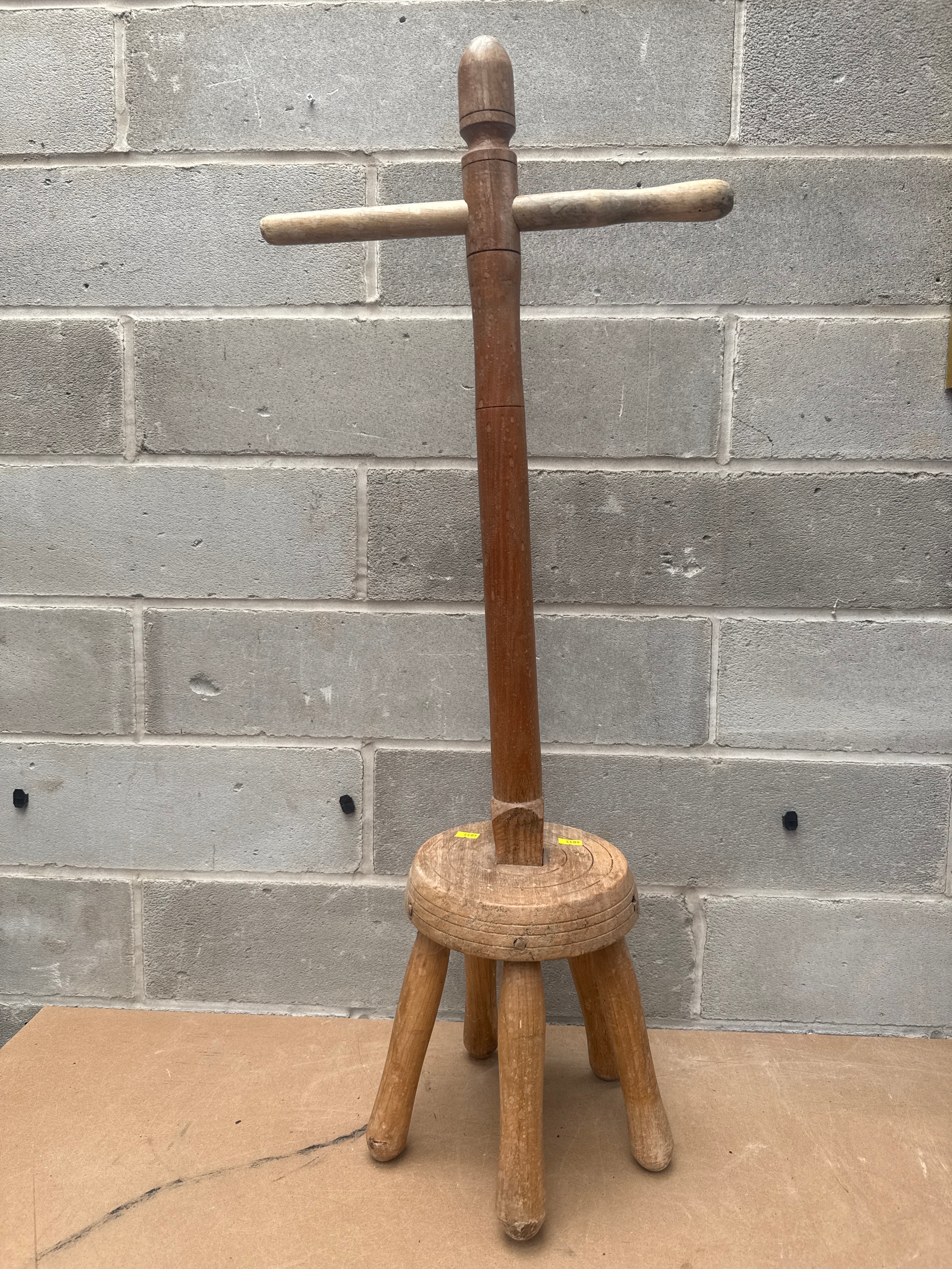 An Antique Wooden Victorian Wash Dolly, also known as a laundry plunger or agitator. Constructed from turned and carved wood, exhibiting a simple, utilitarian style. It features a tall, slender central shaft with a turned finial top, through which a horizontal crossbar is fitted, all mounted on a round, three-legged base. The wood exhibits varying tones, suggesting different types or finishes, with a generally warm brown hue and visible grain. Two small, yellow circular stickers bearing the inventory number ‘5033’ are affixed to the top surface of the base.