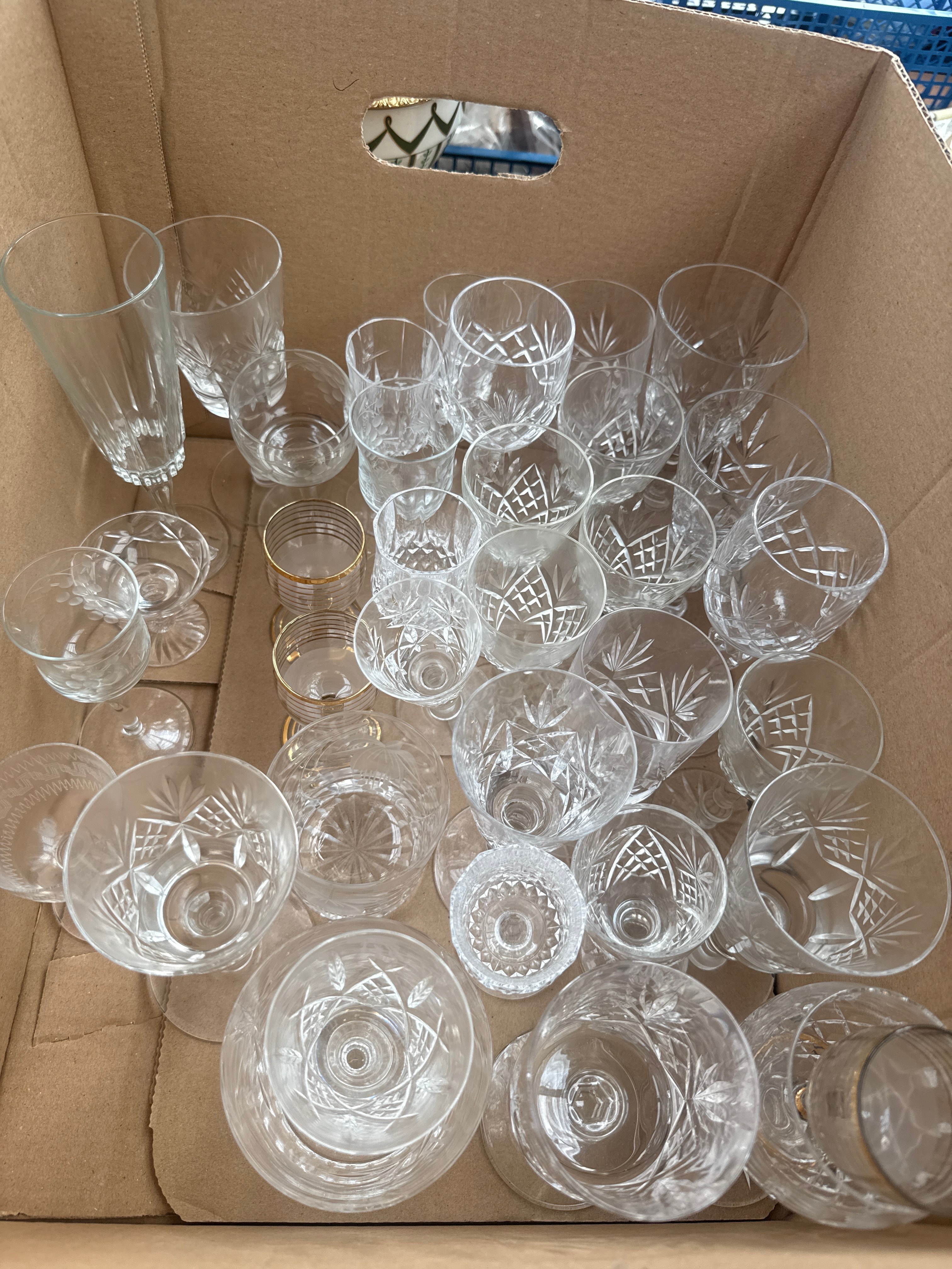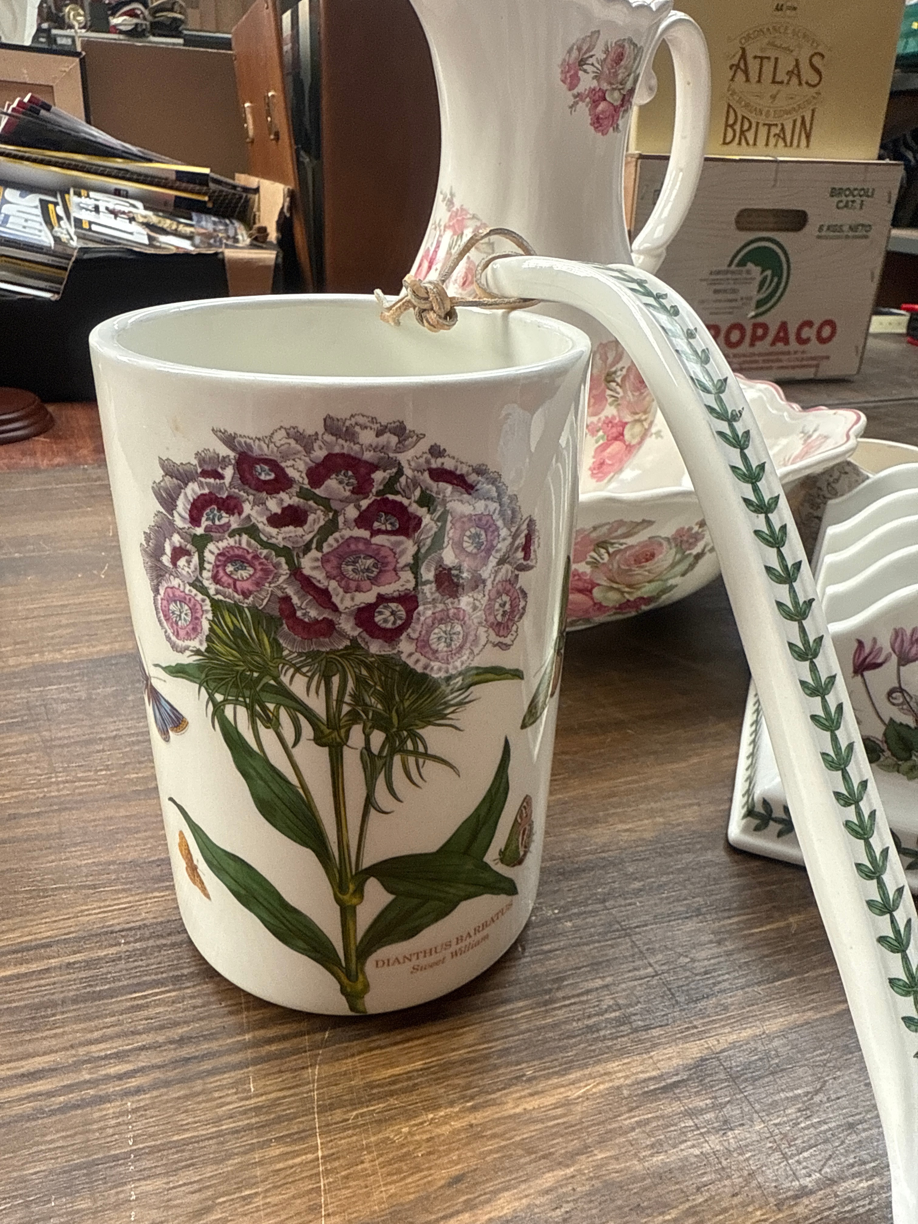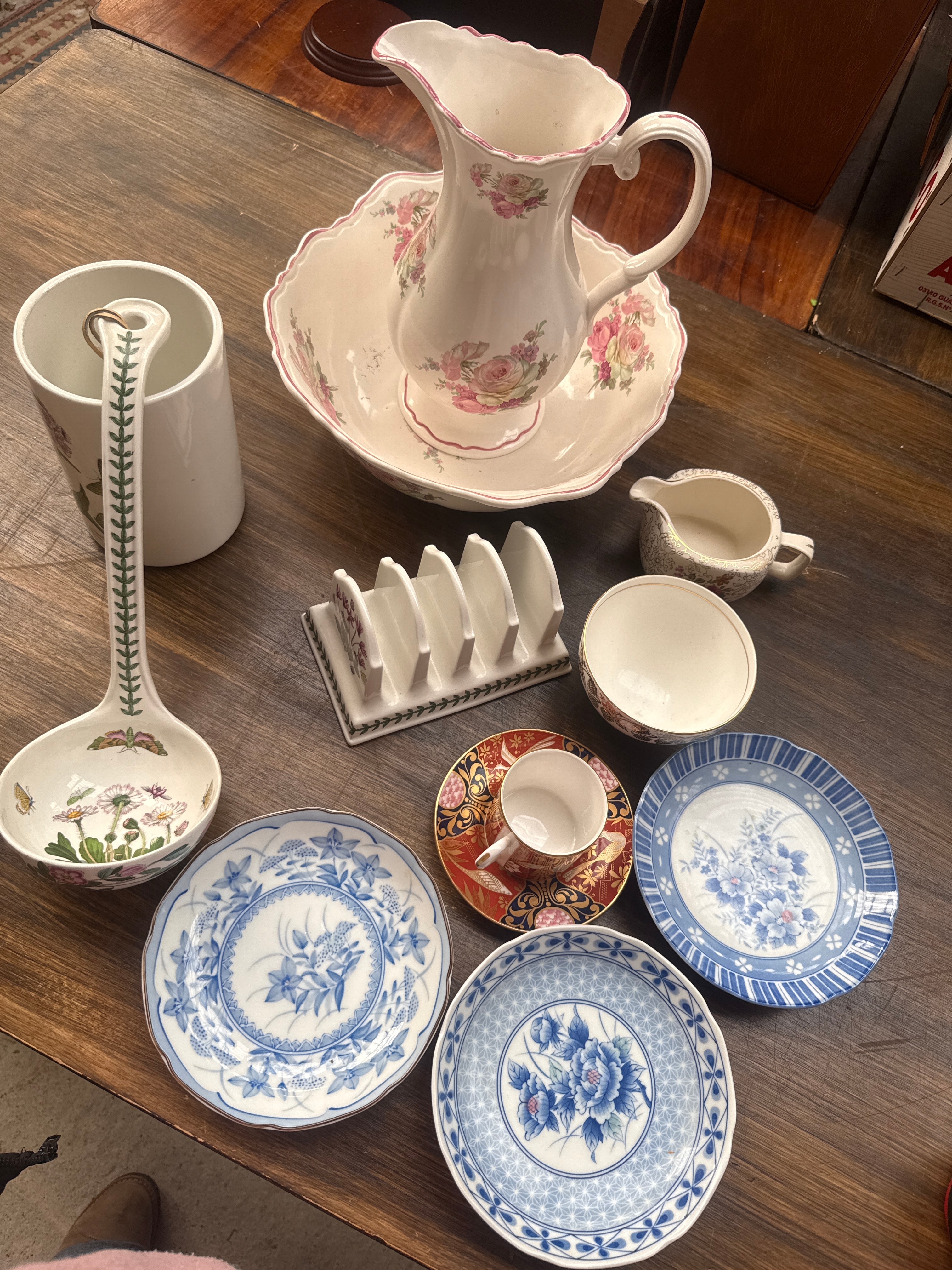 A diverse collection of ceramic and glass items. The ceramic group features a cylindrical holder illustrating ‘Dianthus Barbatus Sweet William’ and a large handled ladle with botanical imagery, both consistent with Portmeirion designs. Also included are a pink floral-patterned wash jug and basin set, a small cream-colored creamer, a white toast rack, a teacup and saucer with an intricate red, gold, and black pattern, and four various decorative plates, predominantly in blue and white floral or geometric designs. The glassware consists of a quantity of clear drinking glasses, tumblers, and stemware, many exhibiting cut glass or crystal patterns.