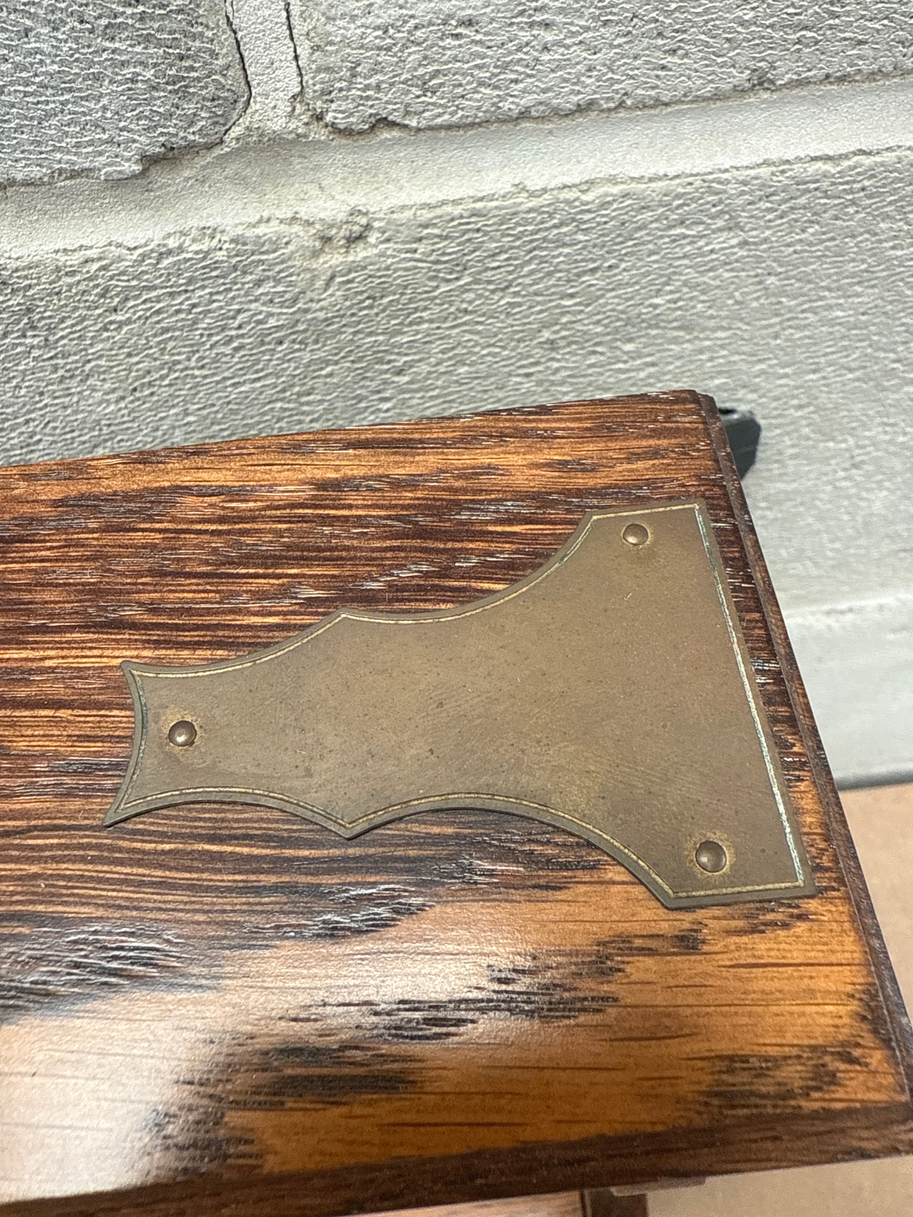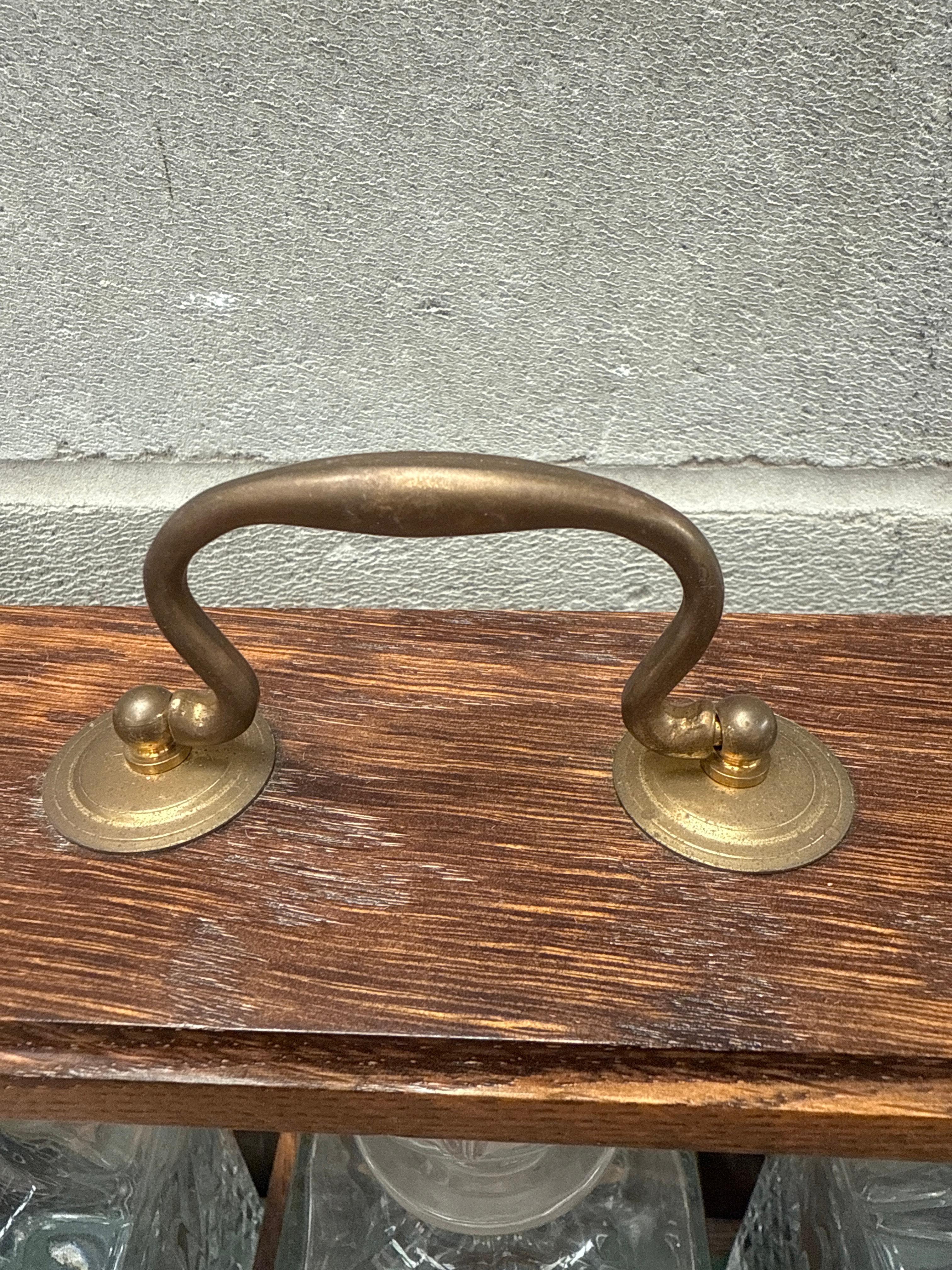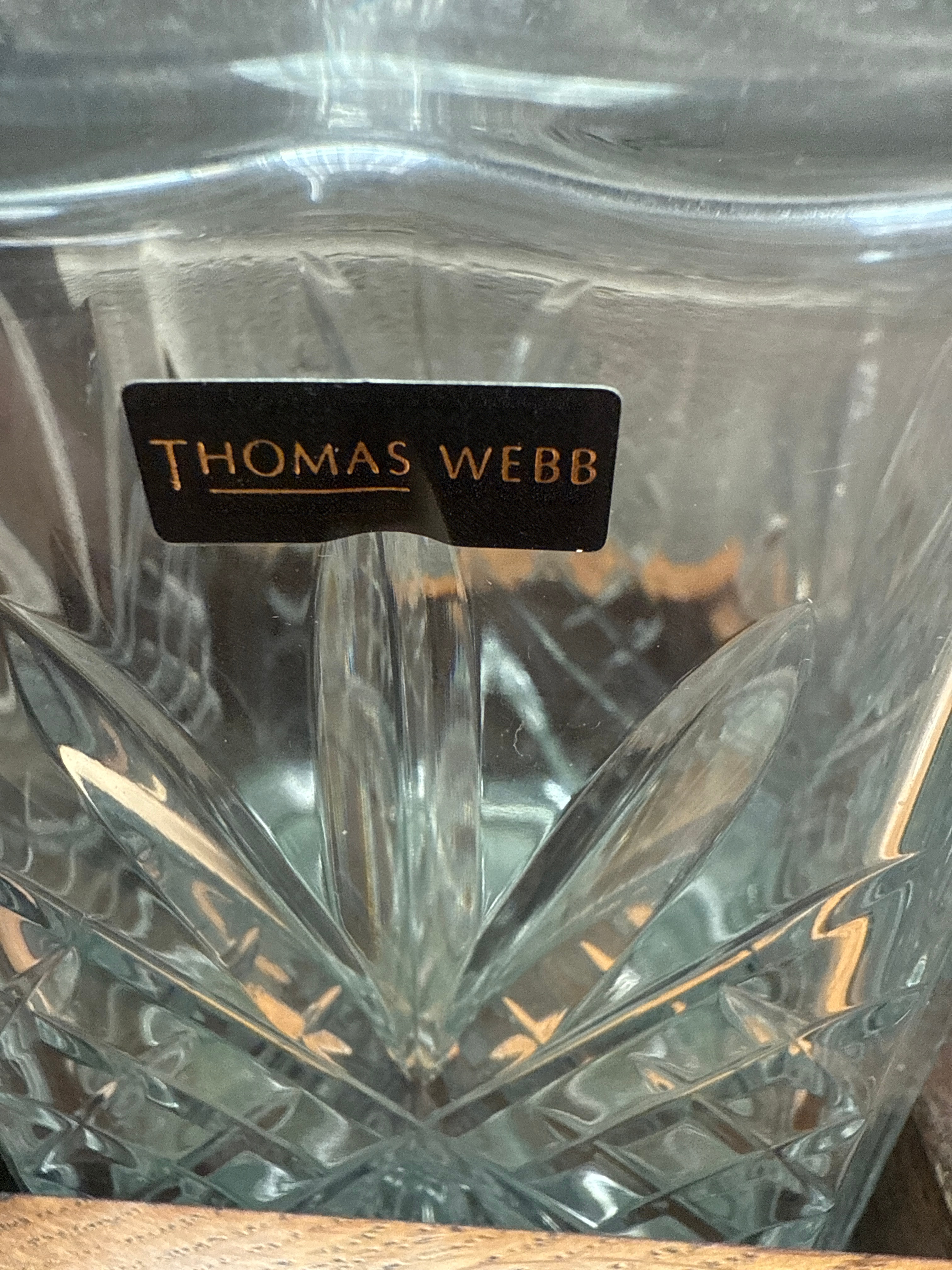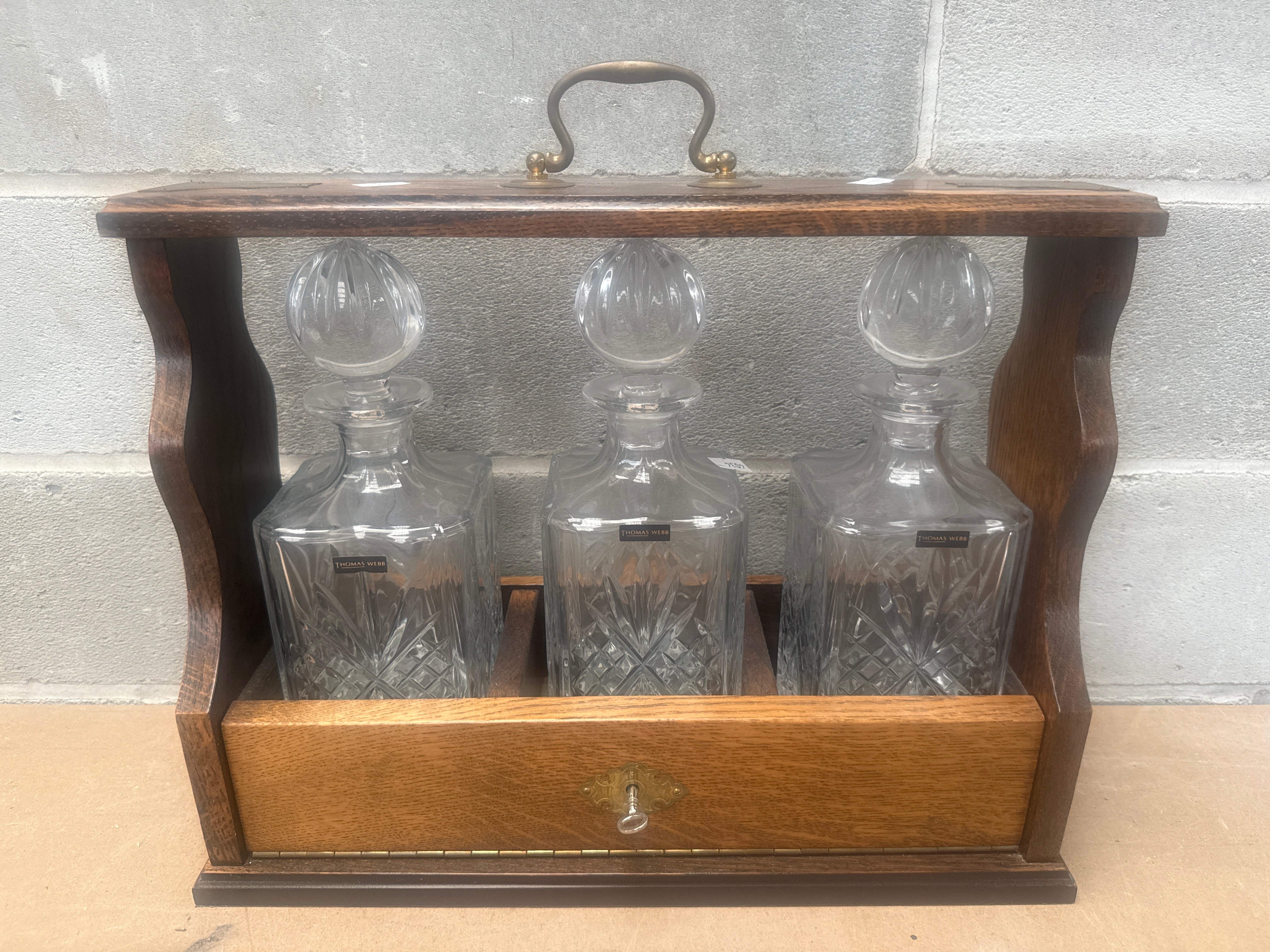 A three-bottle tantalus decanter set, the clear glass decanters by Thomas Webb, each with a faceted, cut-glass pattern on the lower half and a fluted spherical stopper. The decanters are housed within a dark-stained wooden tantalus-style stand, which features an arched brass-toned carrying handle, a brass-toned decorative key escutcheon with a silver-toned key inserted, and other brass fittings securing a hinged front panel.
