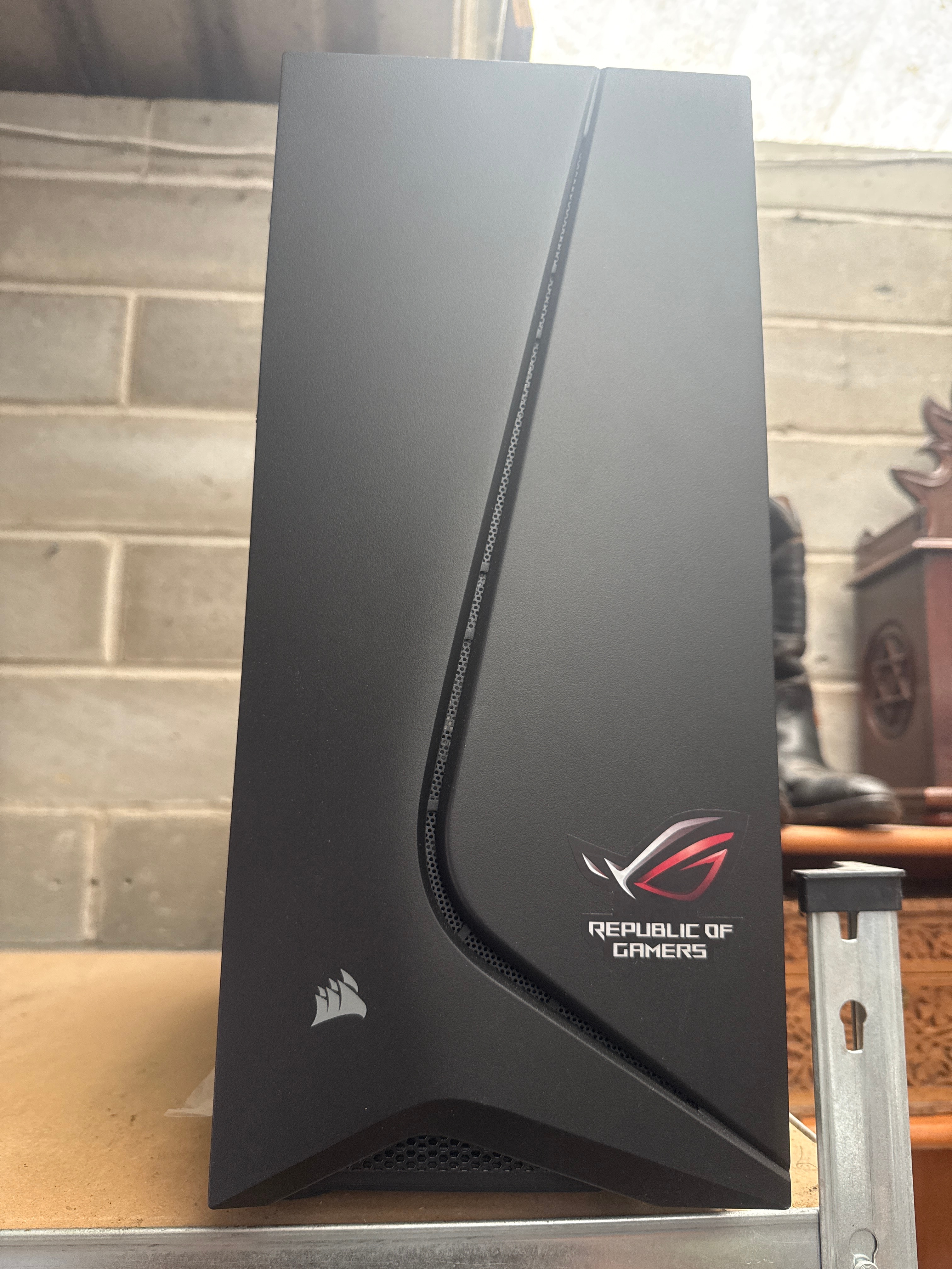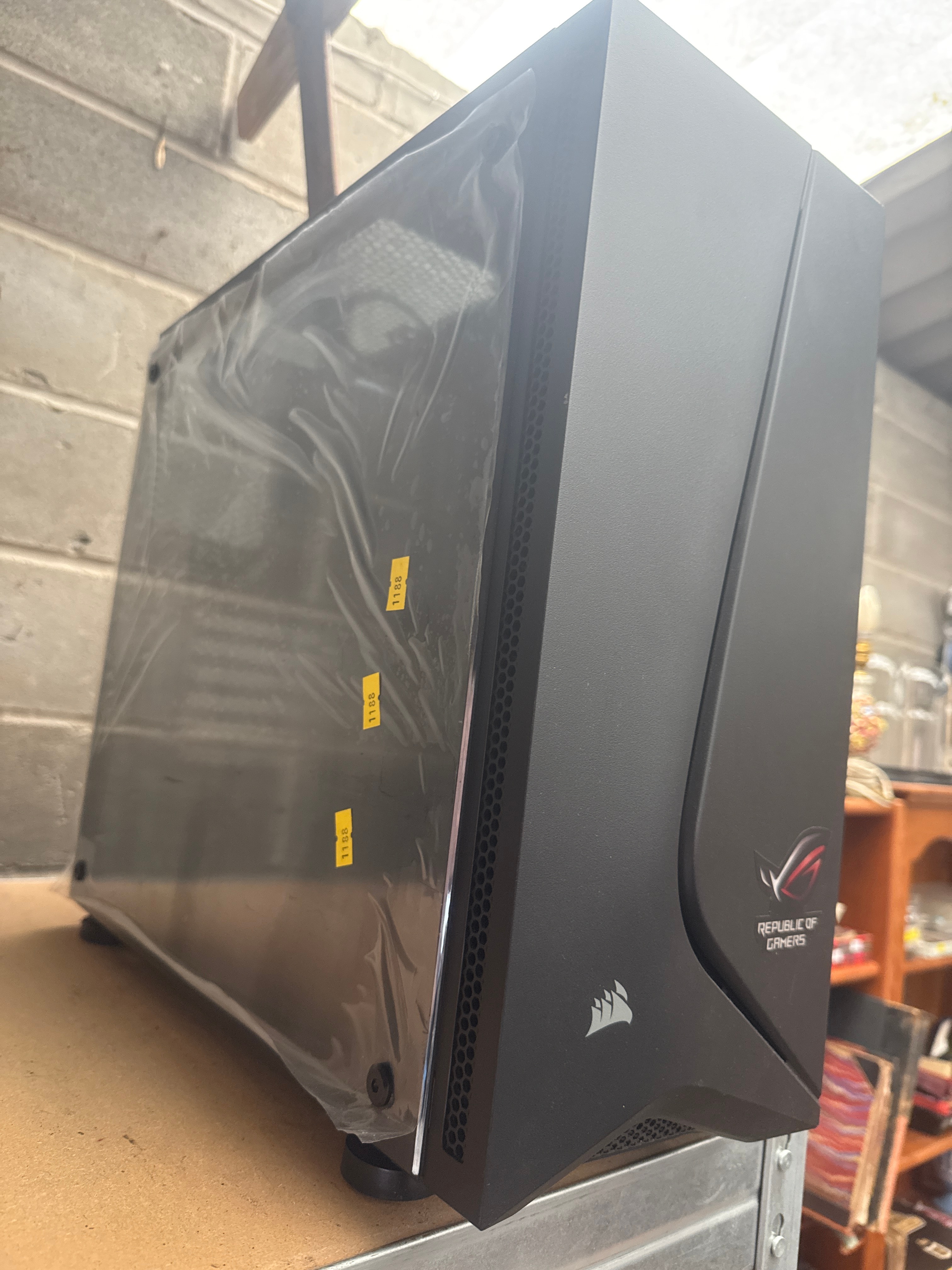 A Corsair Carbide Series SPEC-05 Black Mid-Tower Gaming Case, featuring Republic of Gamers (ROG) branding. Constructed from a combination of metal and plastic, the case presents a modern black finish. The front panel prominently displays a “REPUBLIC OF GAMERS” (ROG) logo and text, alongside a “CORSAIR” logo. A vertical design element on the front incorporates repeating, small-font “REPUBLIC OF GAMERS” text. The side panel is tempered glass, which retains its original protective film. Three yellow stickers marked “110L” are visible on the side panel.