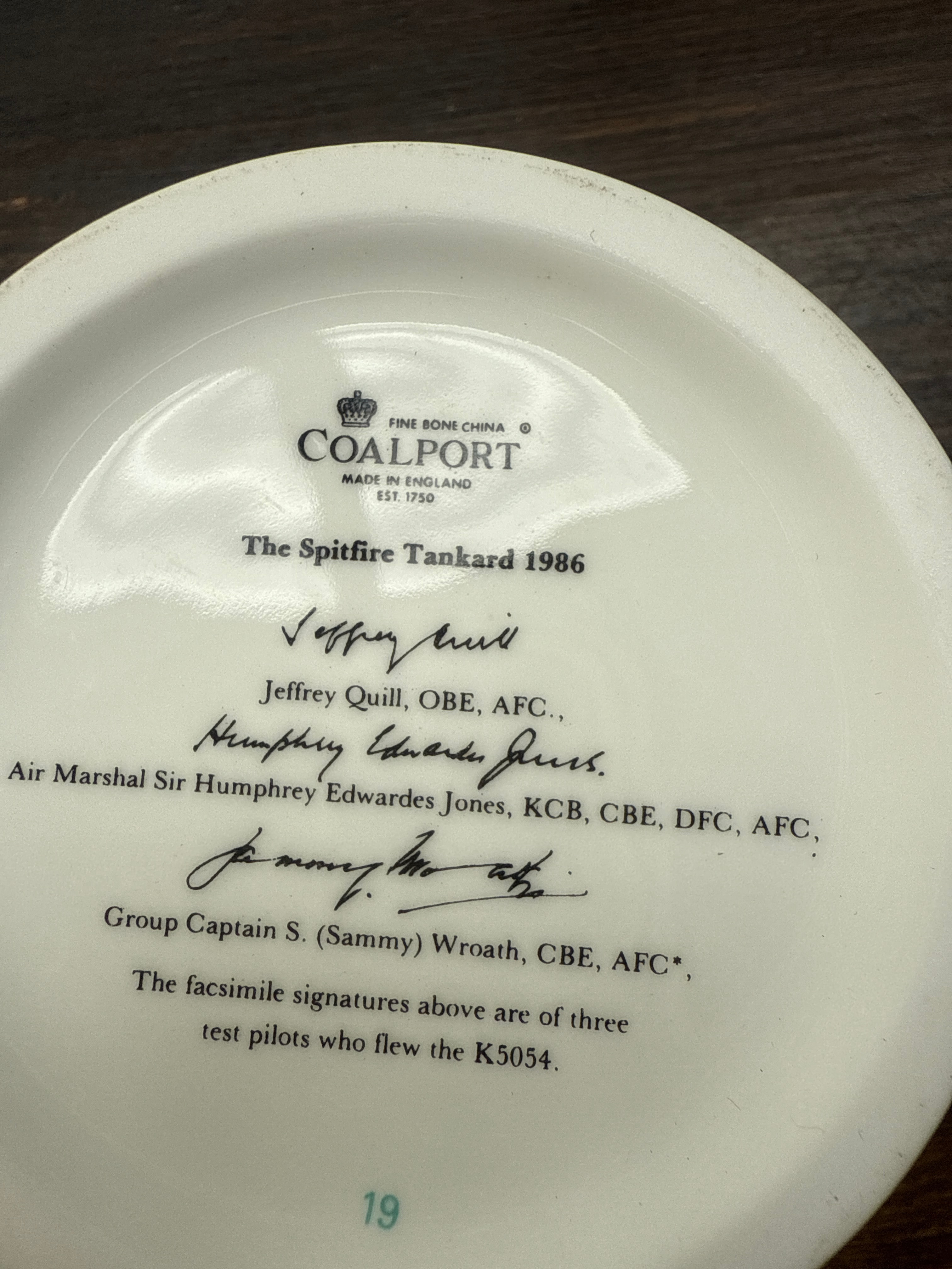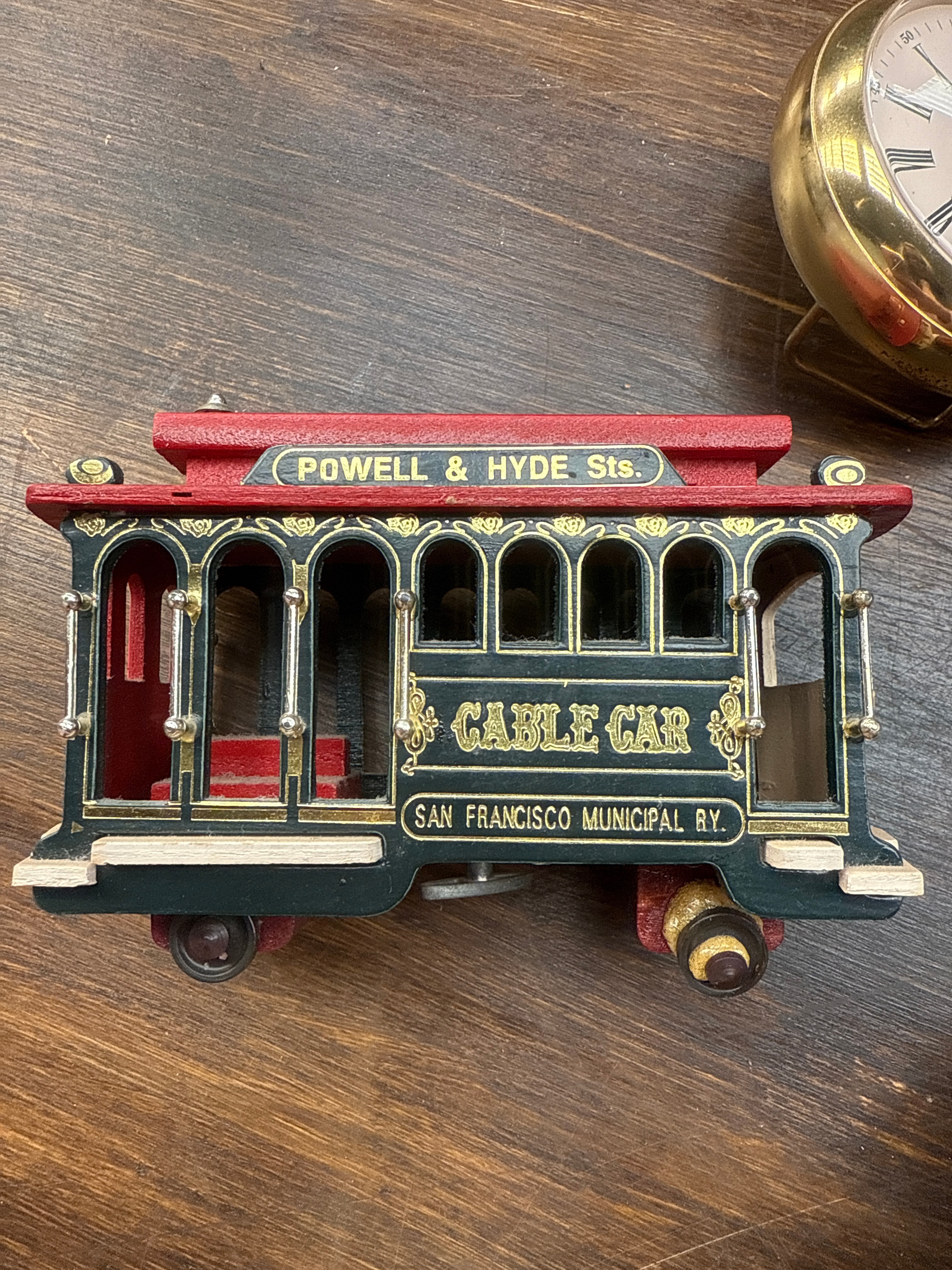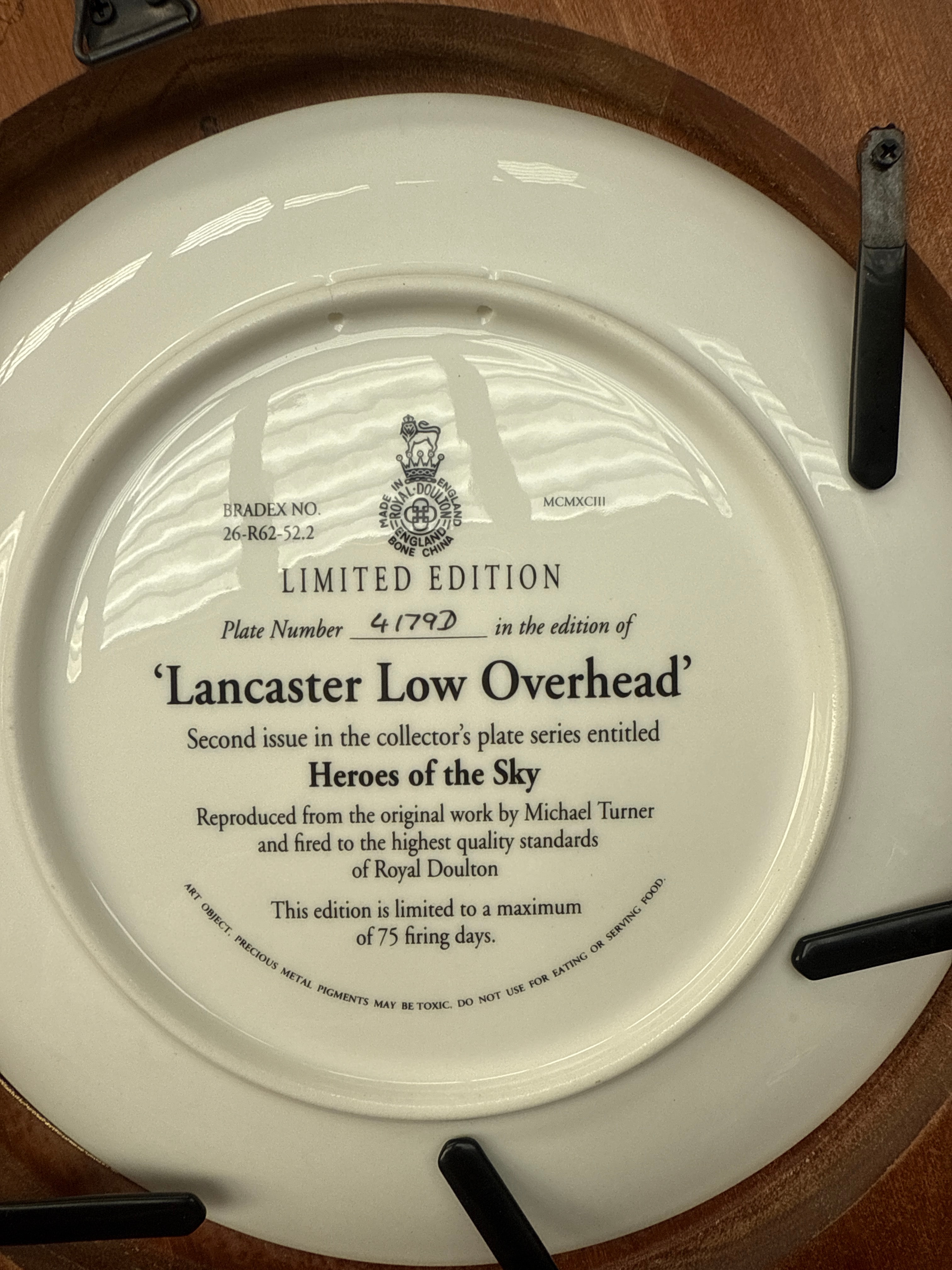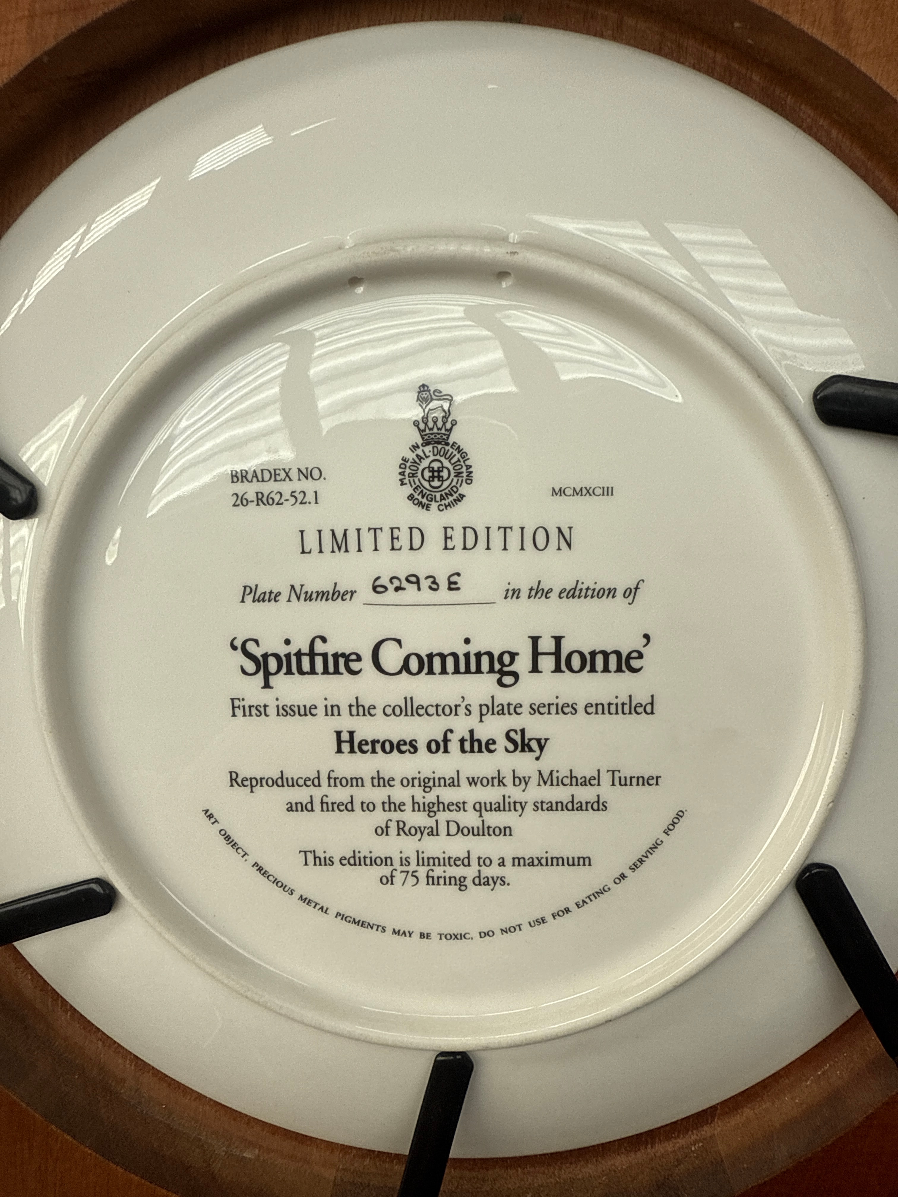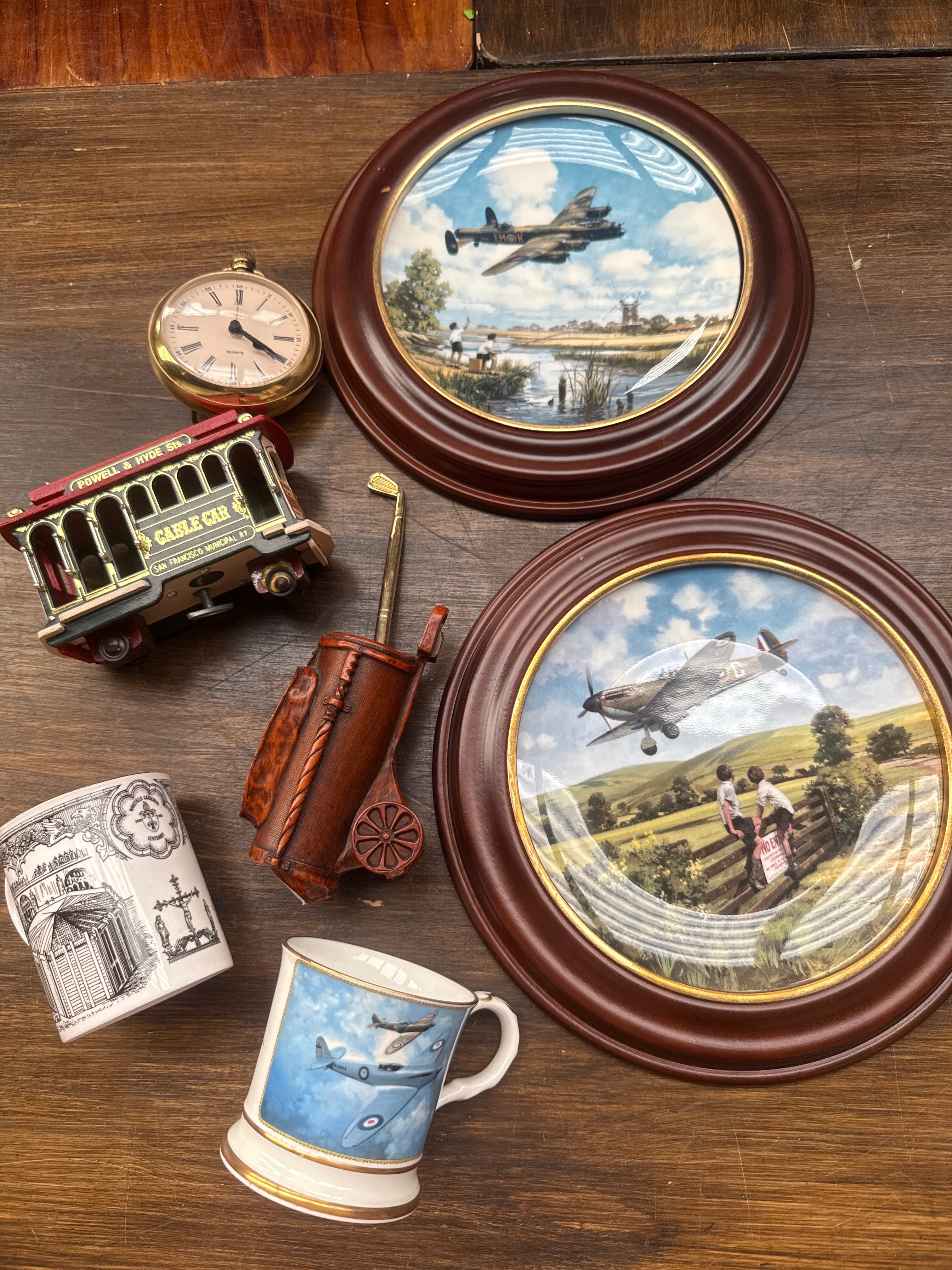 A collection of eight items, including a pair of Royal Doulton ‘Heroes of the Sky’ limited edition fine bone china collector’s plates from 1993. These plates feature aviation art by Michael Turner and are titled ‘Lancaster Low Overhead’ (plate 4179D) and ‘Spitfire Coming Home’ (plate 6293E), presented in simple wooden frames. Also included is a Coalport ‘The Spitfire Tankard 1986’ in fine bone china, decorated with Spitfire aircraft and bearing facsimile signatures of test pilots Jeffrey Quill, Sir Humphrey Edwardes Jones, and Group Captain S. Wroath. The collection further comprises a brass-toned ‘Quartz’ pocket watch-style desk clock, a painted wood and metal model San Francisco cable car marked “POWELL & HYDE Sts.”, “CABLE CAR”, and “SAN FRANCISCO MUNICIPAL RY.”, a small wood-look resin golf bag figurine with a metal club, and a ceramic tankard with black and white historical architectural motifs.