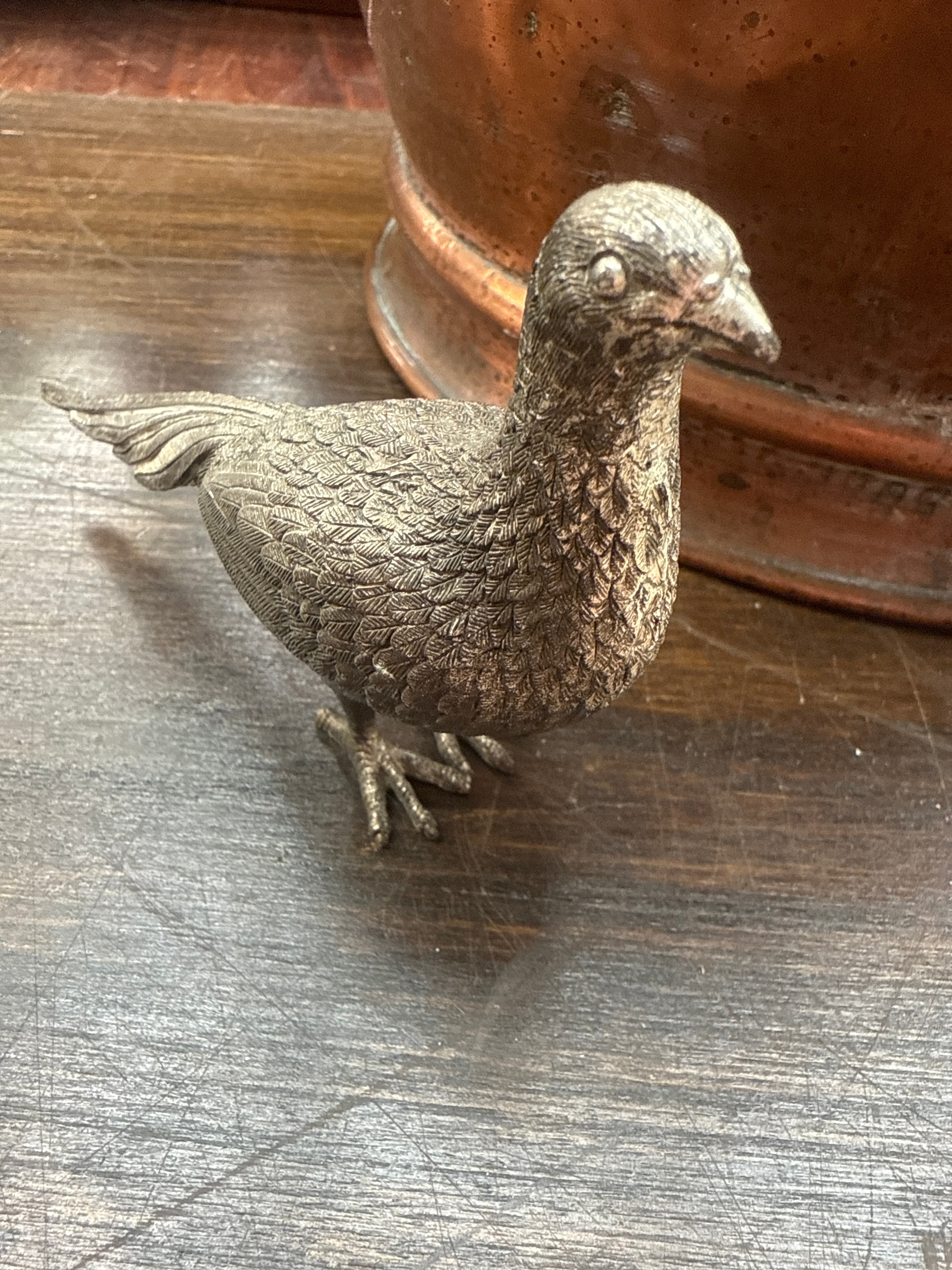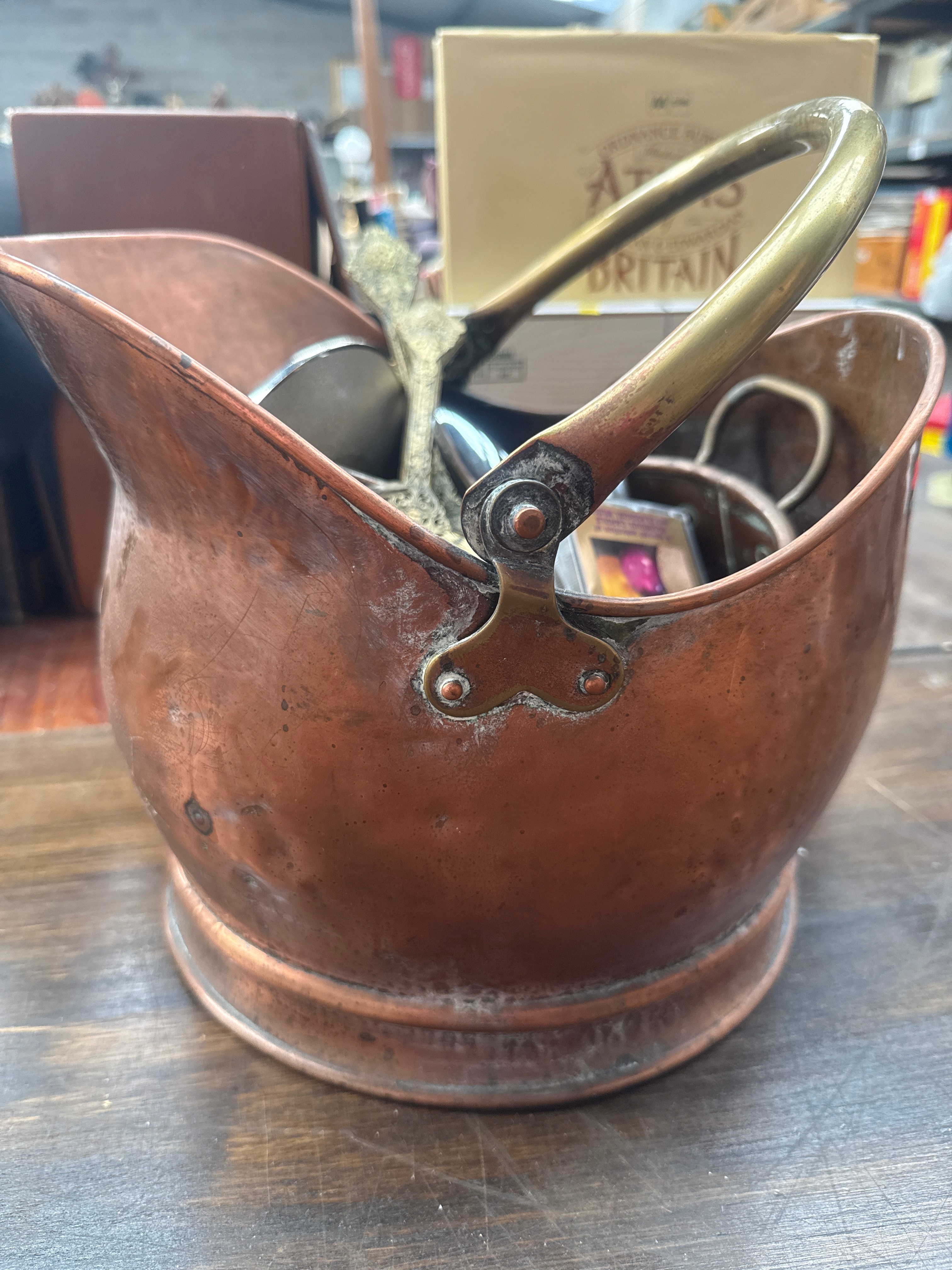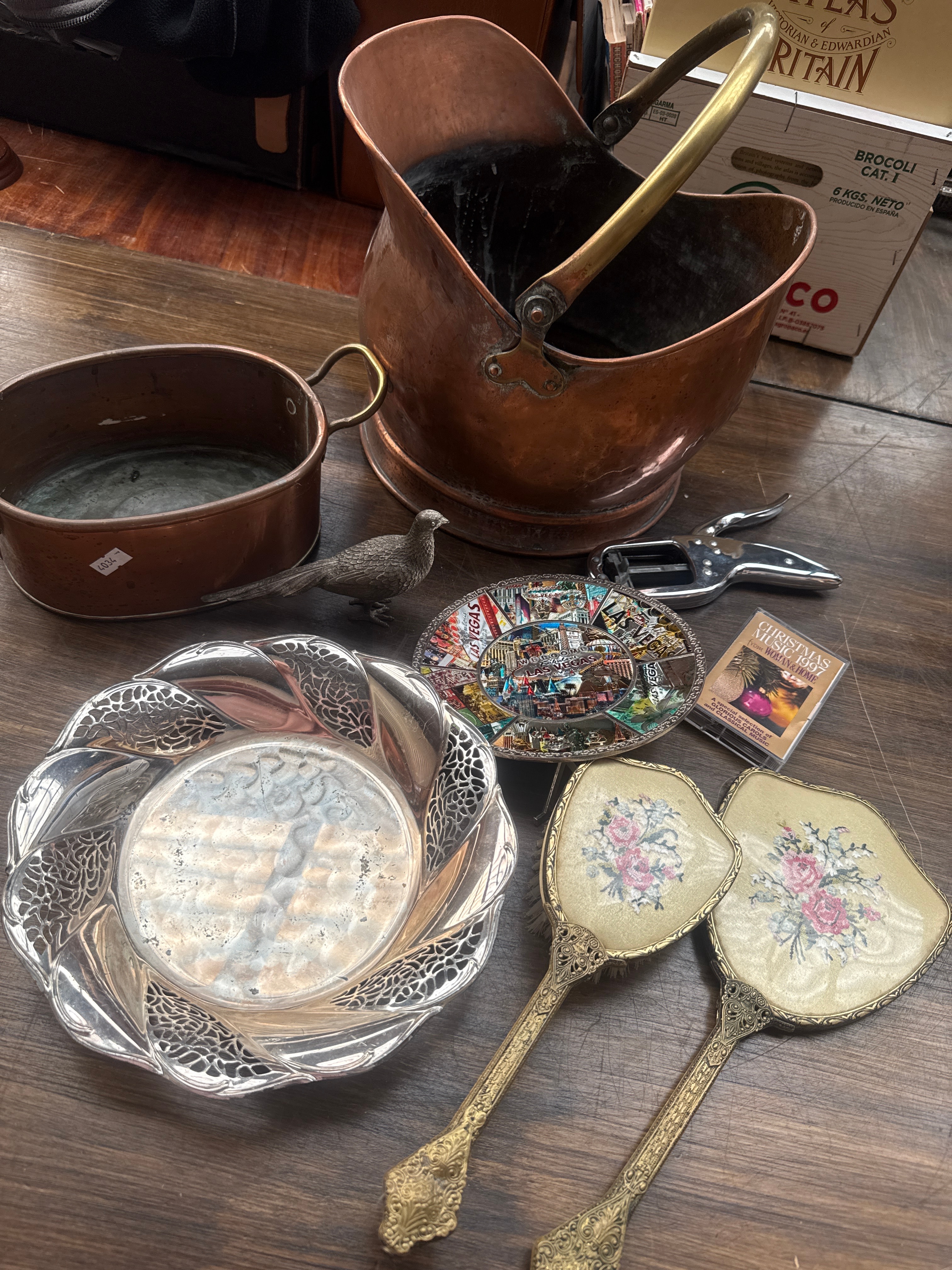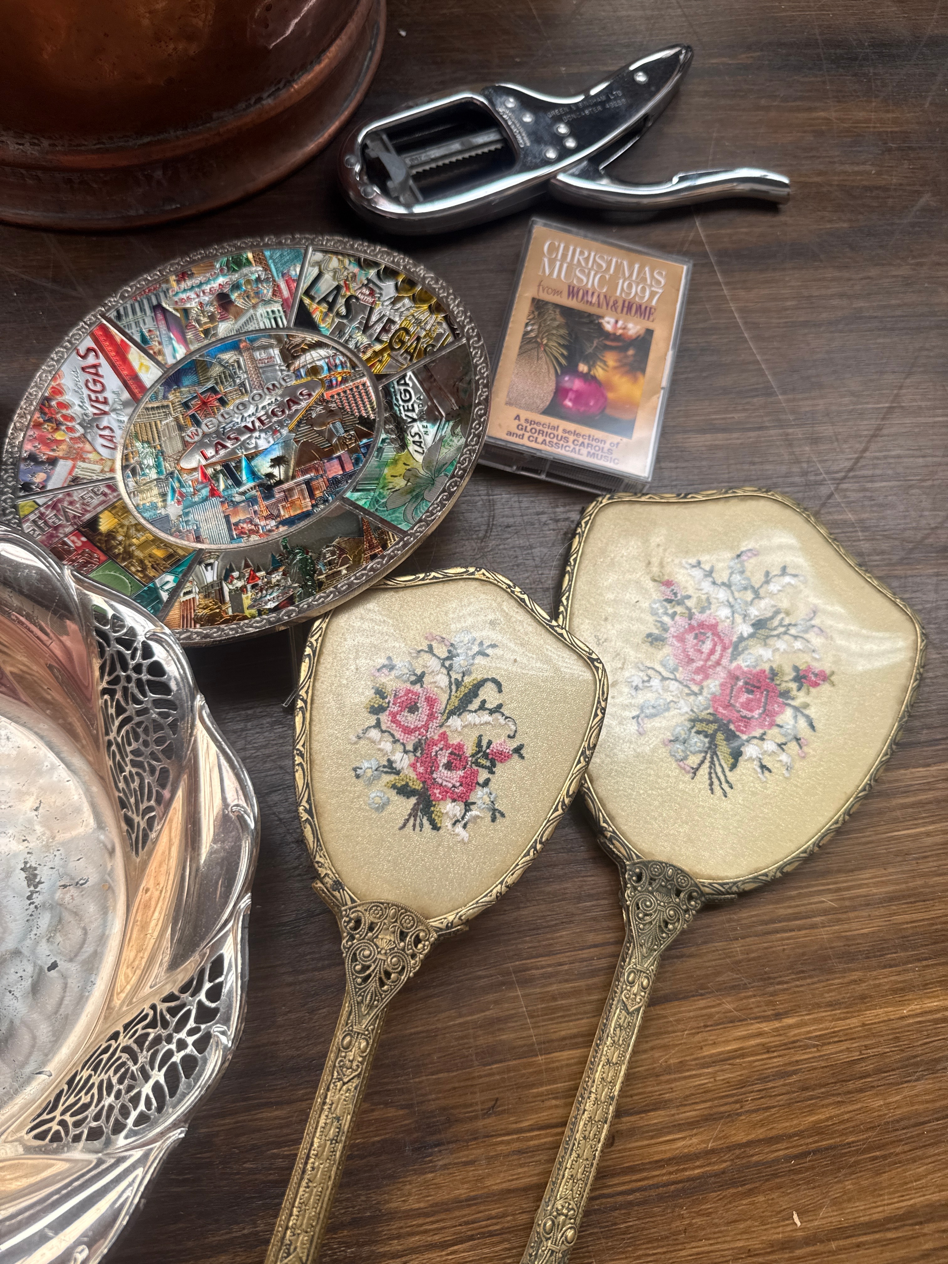 This lot comprises a diverse collection of household and decorative objects. The most prominent items include a pair of vintage vanity mirrors, likely dating from the Pre-War period, possibly 1890s, as suggested by web intelligence. These mirrors feature ornate gold-toned metal handles and embroidered floral (rose) fabric inserts. The collection also includes a large copper coal scuttle with a brass handle and a smaller copper saucepan, the latter bearing an “£8.00” sticker. Further items consist of a silver-toned pierced metal bowl, a small, detailed cast metal bird figurine, a chrome-plated nutcracker, and a Las Vegas-themed souvenir metal plate. An audio cassette titled “CHRISTMAS MUSIC 1997 from HOLLAND & HOME,” described as “A selection of GLORIOUS CHORAL MUSIC for the YULETIDE SEASON,” completes the lot.