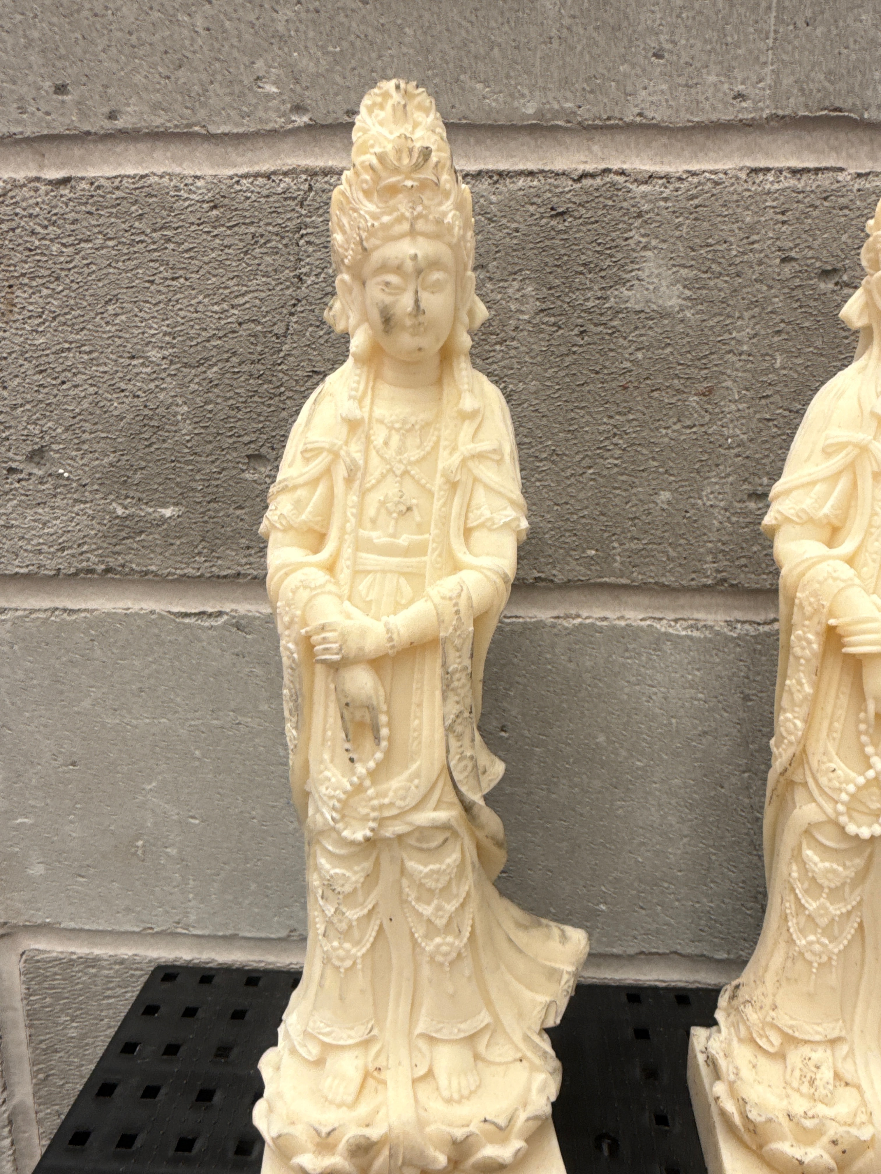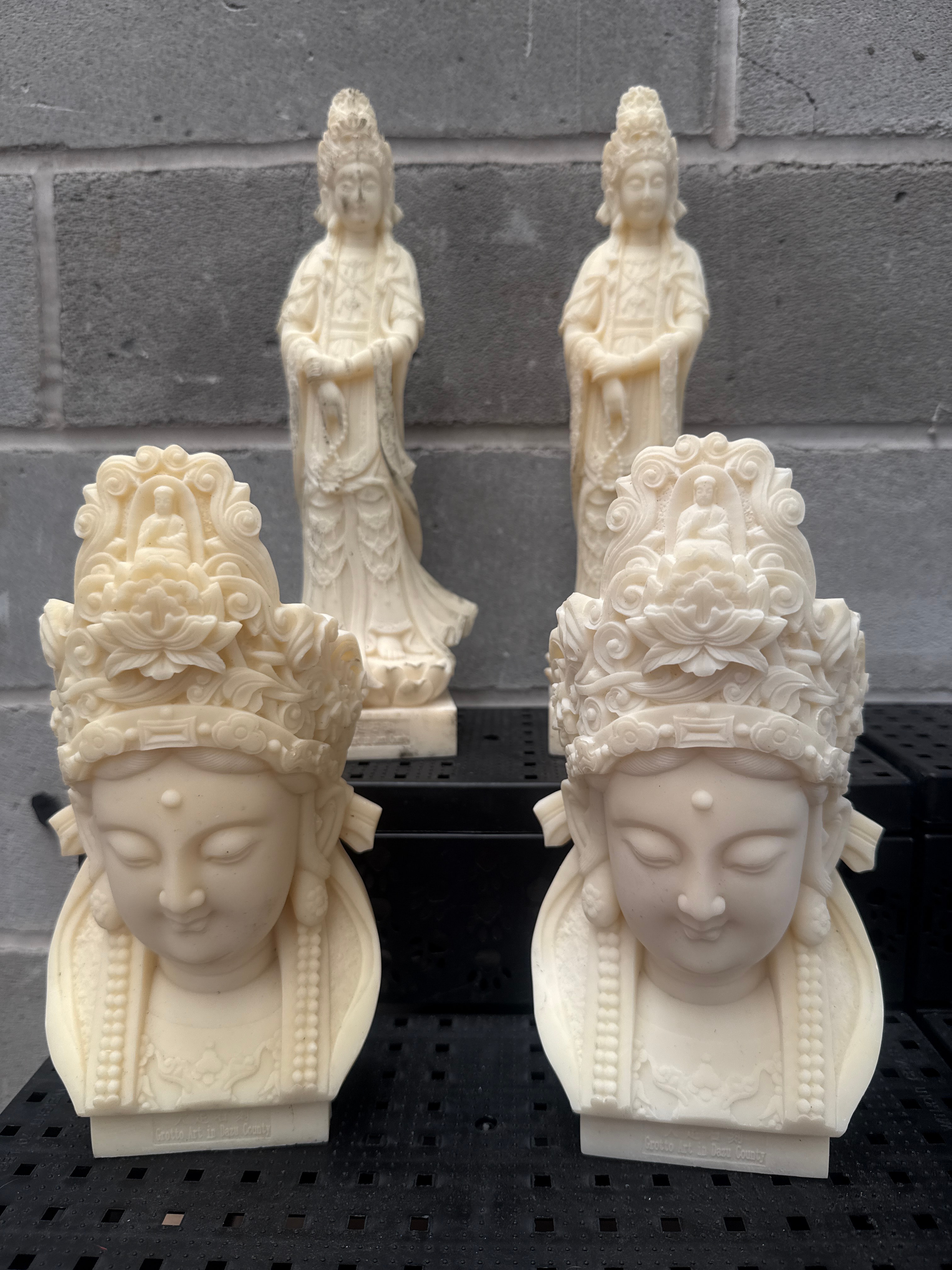 A collection of four resin figures depicting Guanyin, the Bodhisattva of Compassion. The group includes two full-body standing statues and two matching busts. Each figure is rendered in an East Asian, likely Buddhist, style, characterized by serene expressions, elaborate headdresses, and flowing robes. The material presents a smooth, off-white, bone-like texture. The bases of the two busts are inscribed “Praxis Re Dei Guan Yin.”