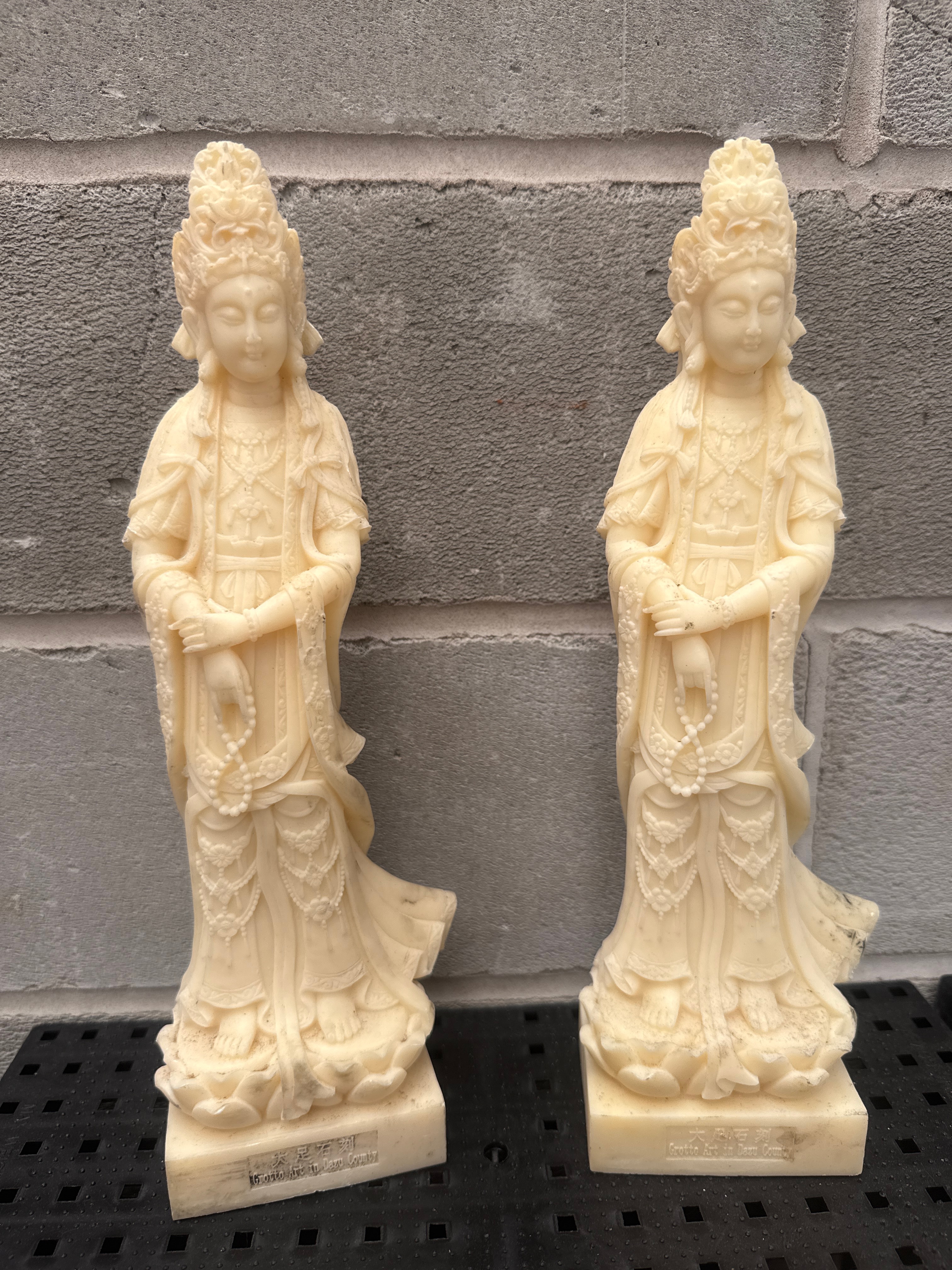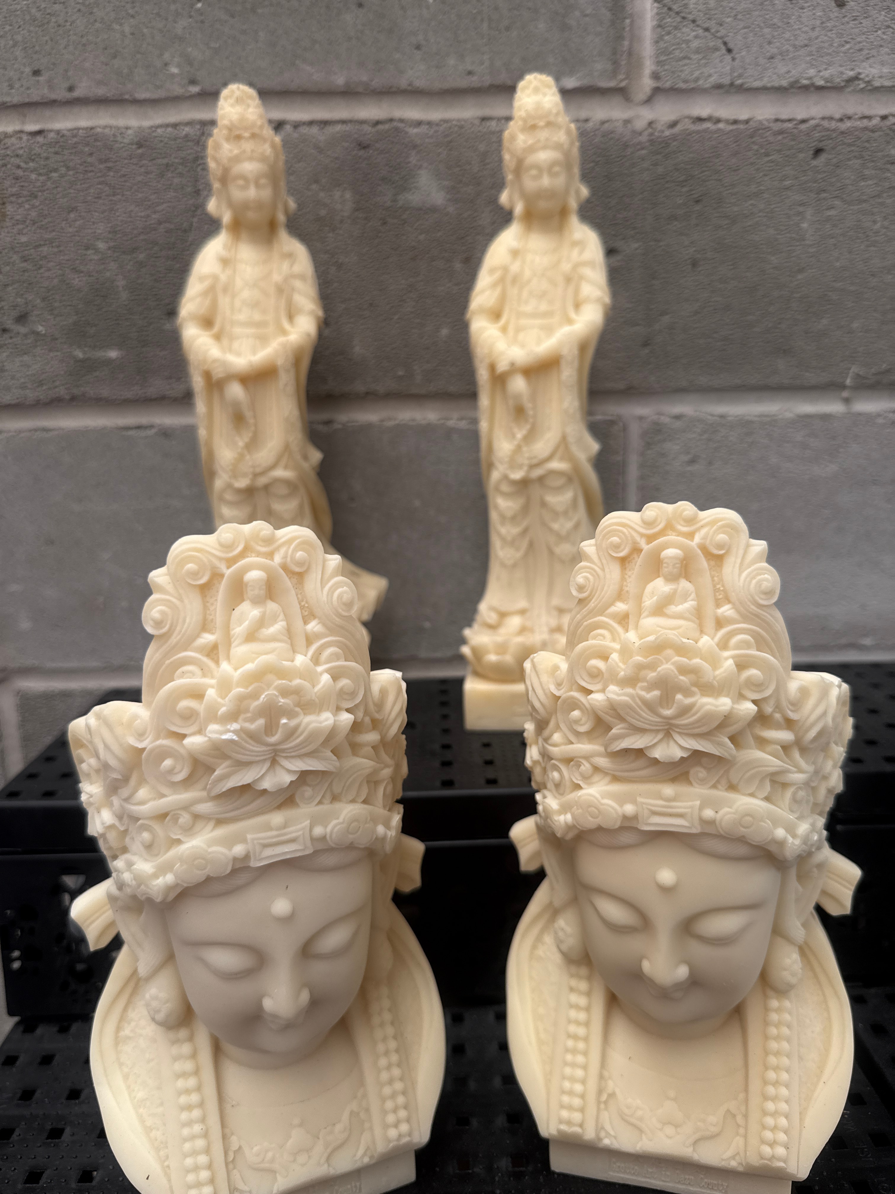 A group of four ornamental figurines depicting Guanyin Bodhisattva in a traditional East Asian style, crafted from resin. The off-white material exhibits intricate details, mimicking carved work, in the flowing robes, elaborate headdresses (each featuring a small Buddha figure), and prayer beads held by the two standing figures. The two full-length figures rest on rectangular bases bearing impressed Chinese characters which translate to “Jingdezhen Porcelain Carving Guanyin Bodhisattva,” indicating the design origin or inspiration. The items appear to be of modern production.