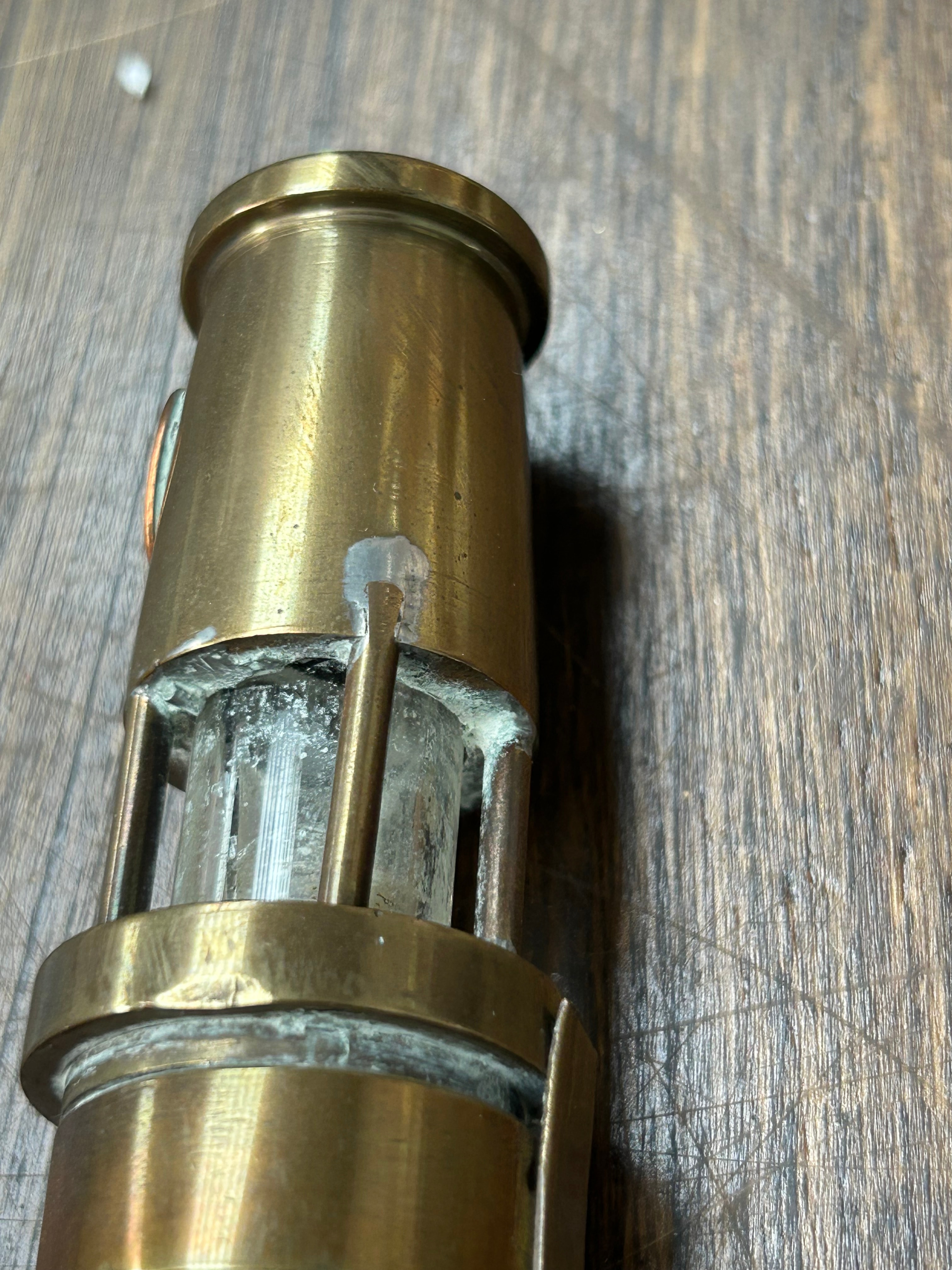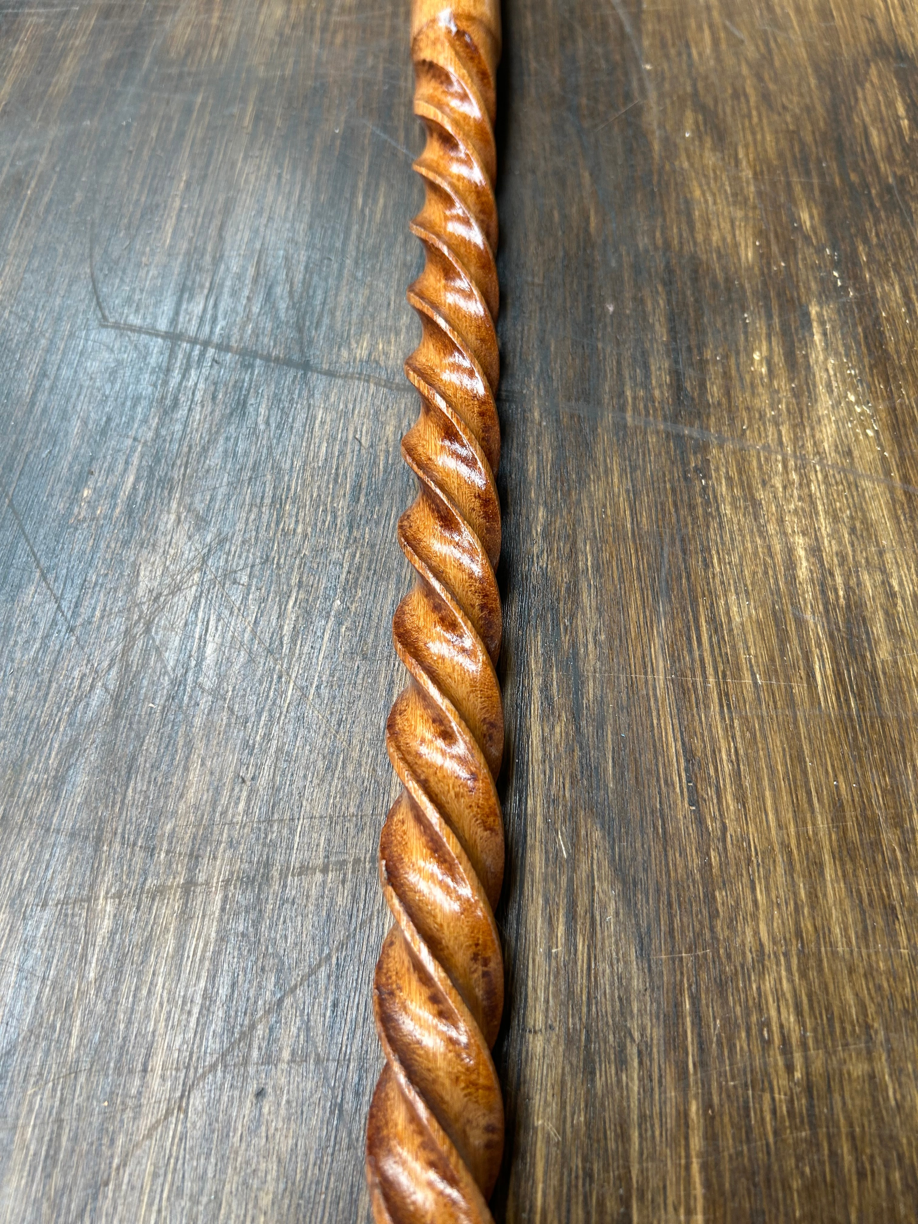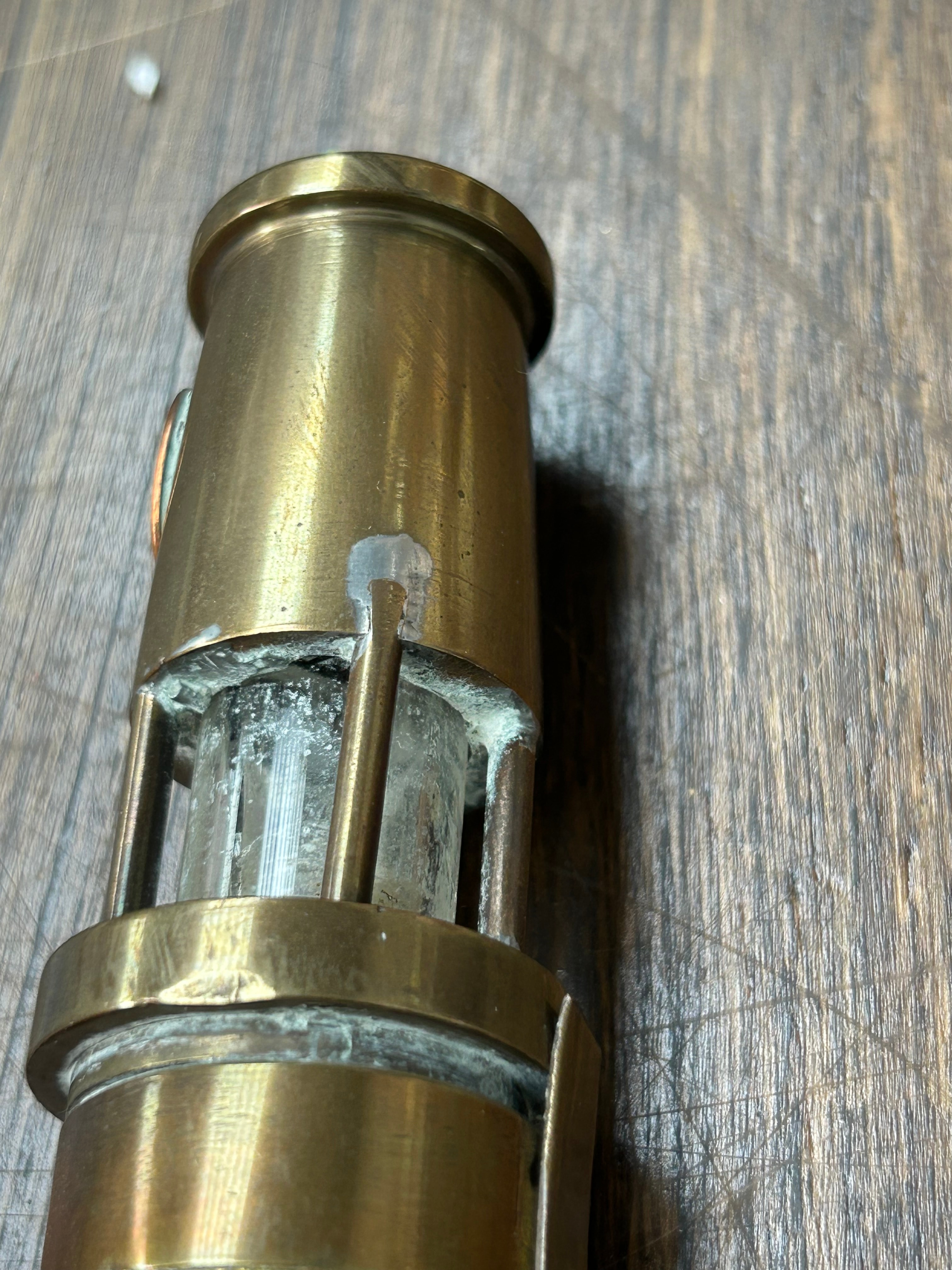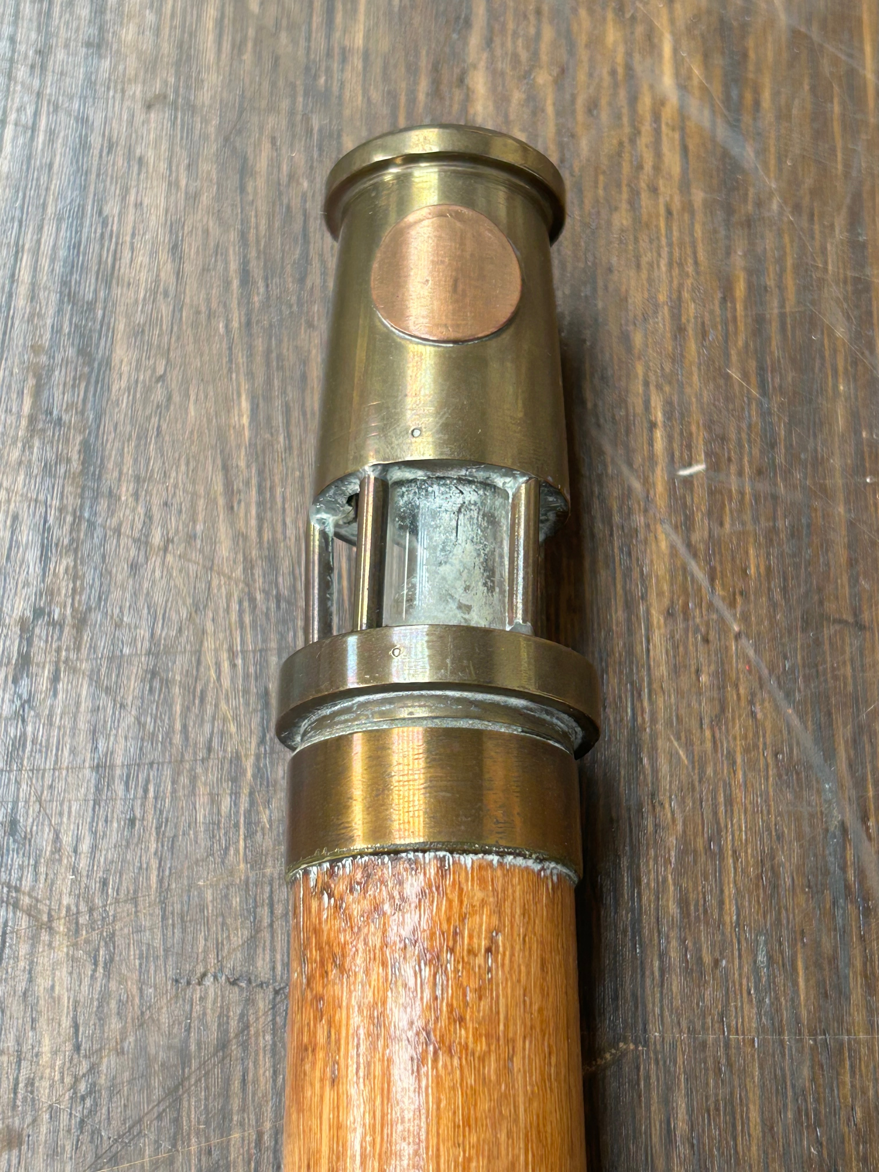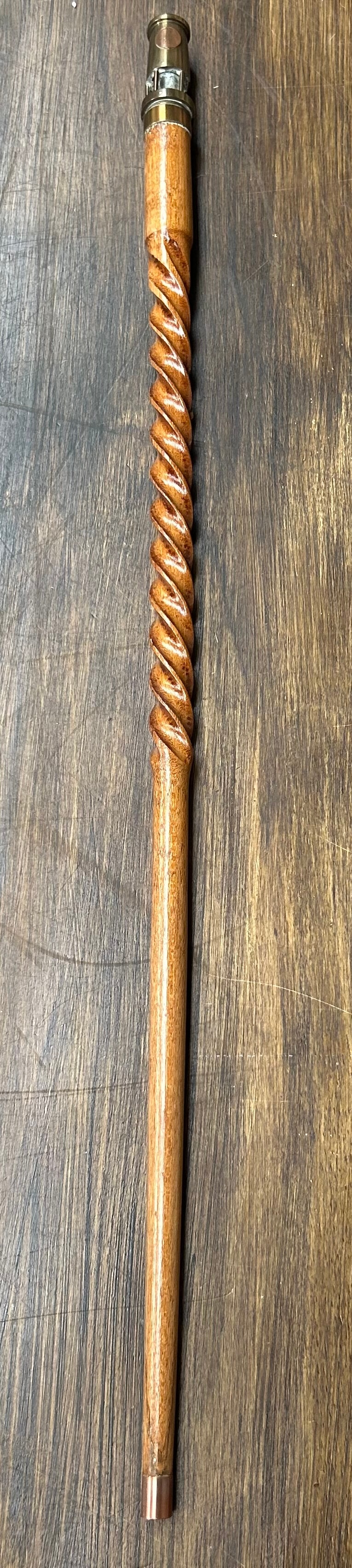 A decorative walking stick or staff, primarily constructed from a light-colored, polished wood. The upper half features a deeply carved helical or spiral design, transitioning to a smooth, cylindrical lower section. The handle comprises an elaborate brass assembly resembling a miniature miner’s safety lamp, with a cylindrical body, a domed top, a small circular copper inlay on one side, and a cage-like structure protecting a cloudy, clear cylindrical insert, likely glass. A copper-toned ferrule caps the bottom tip of the stick.