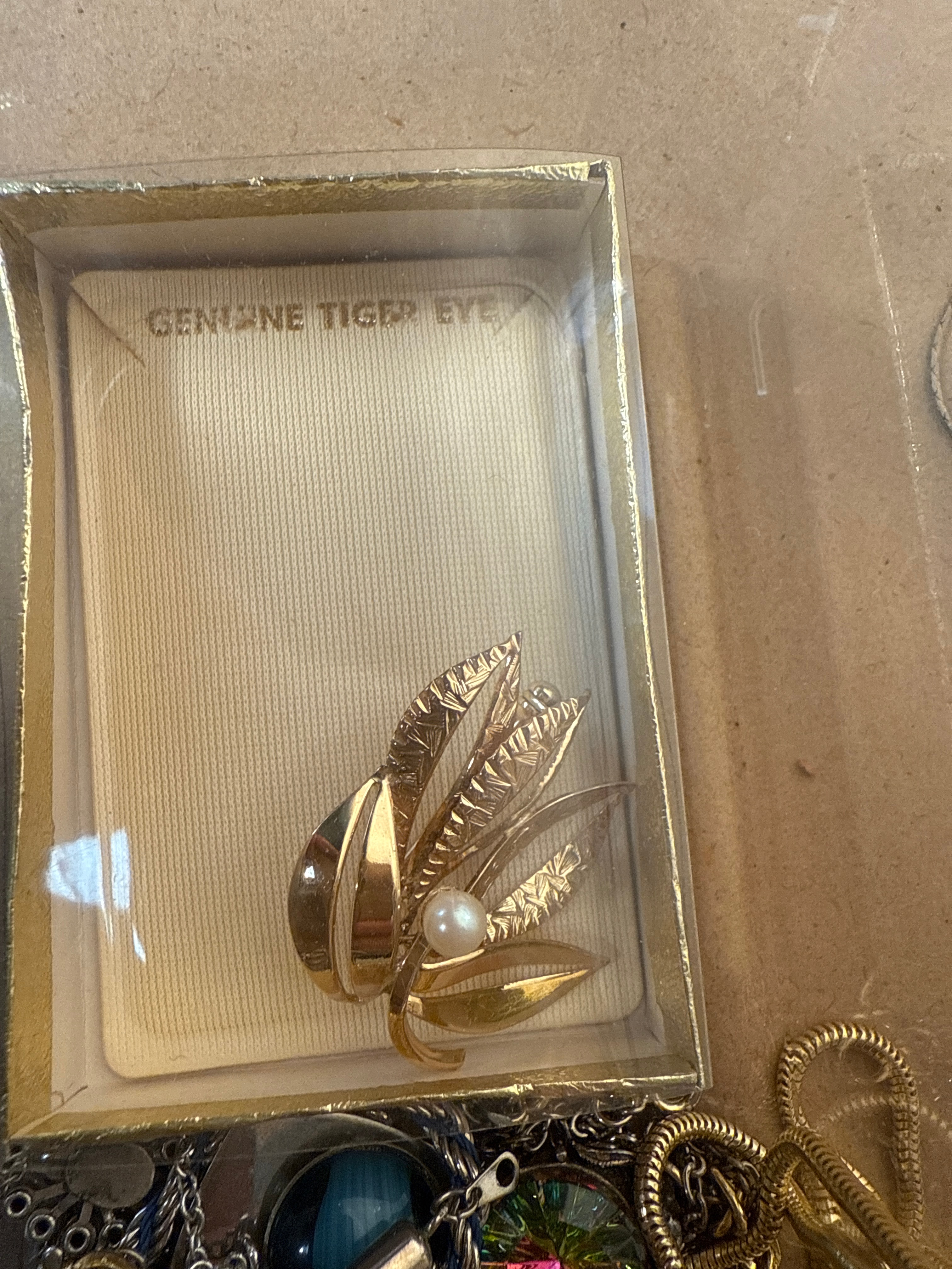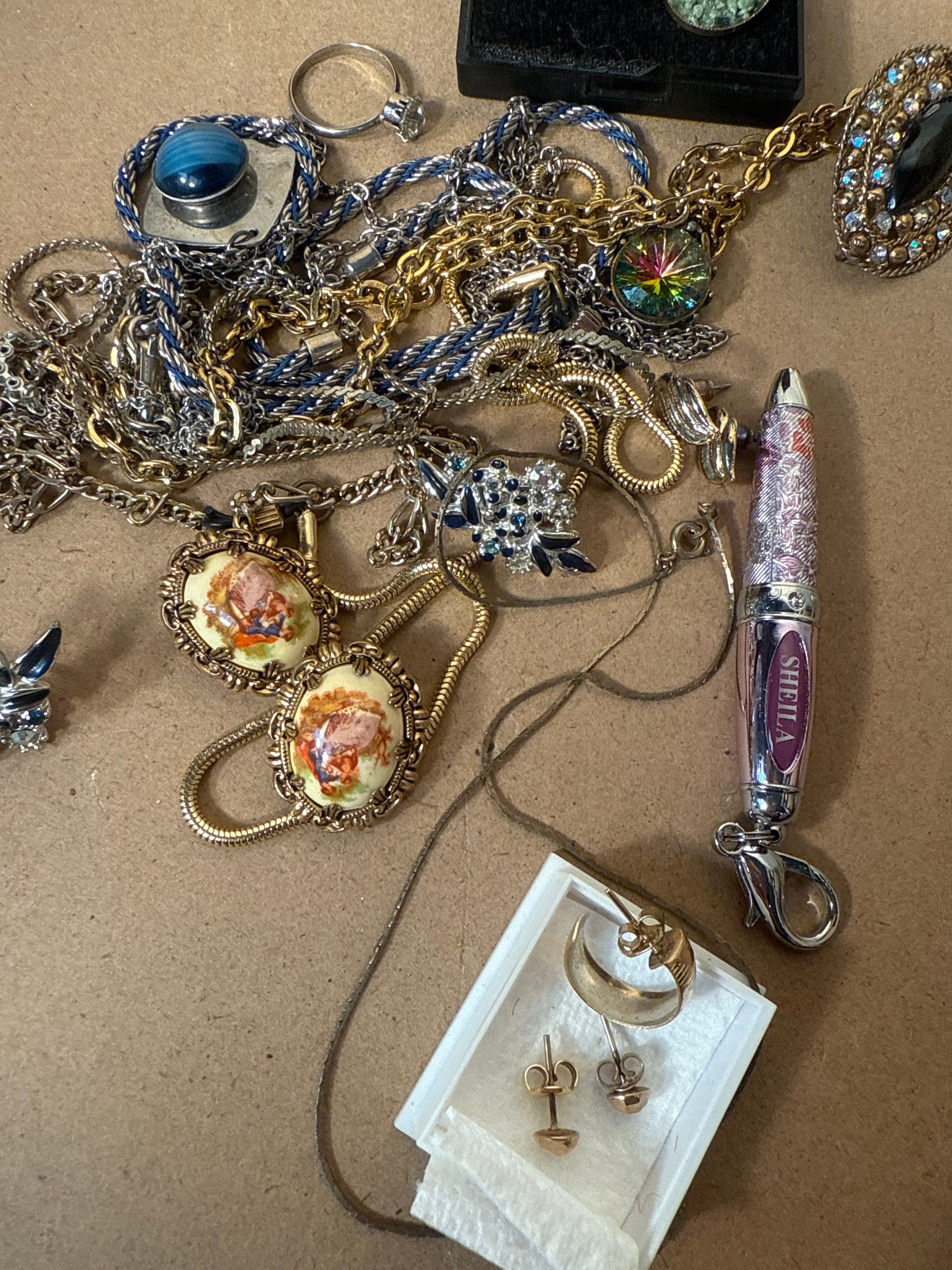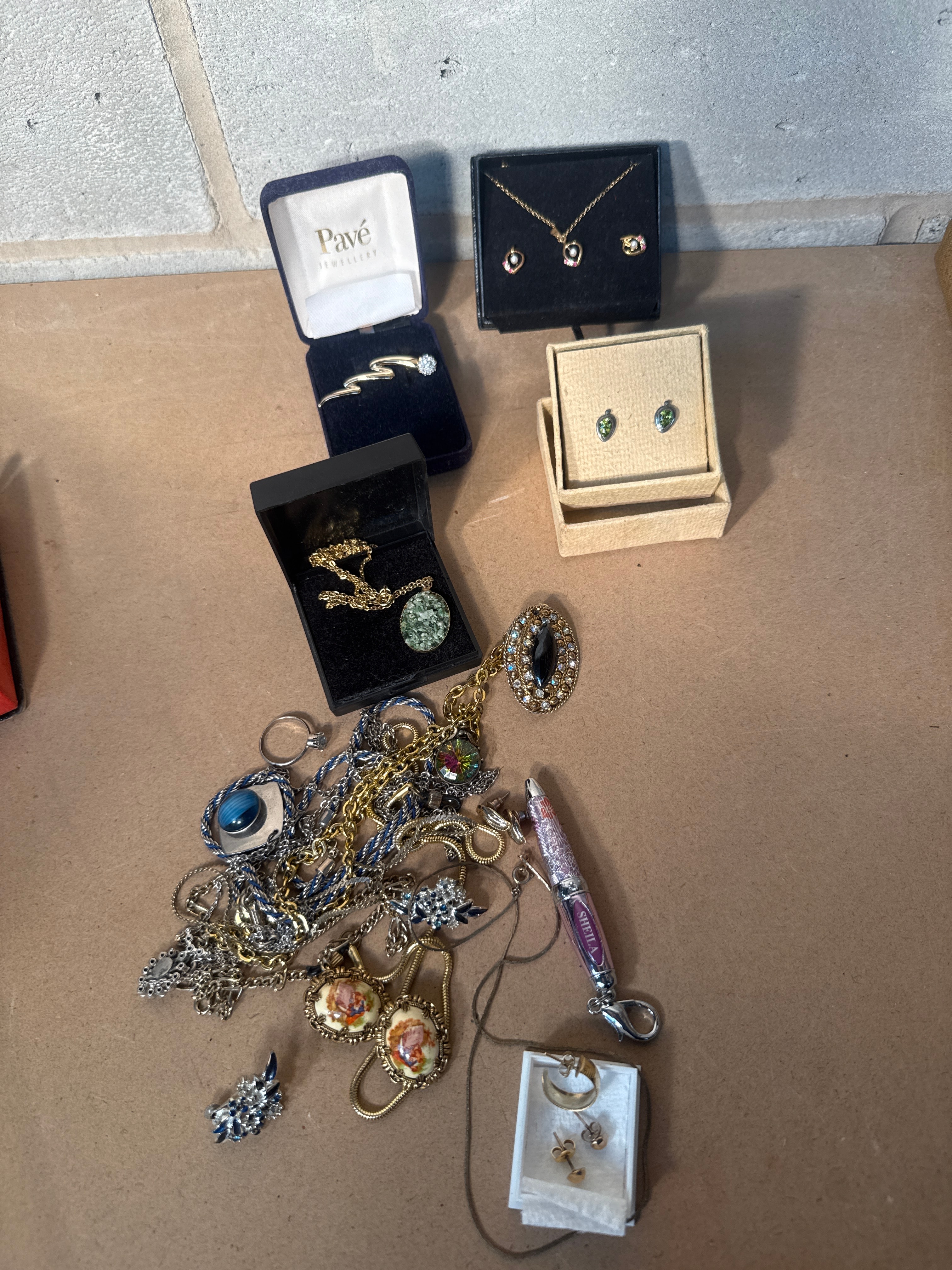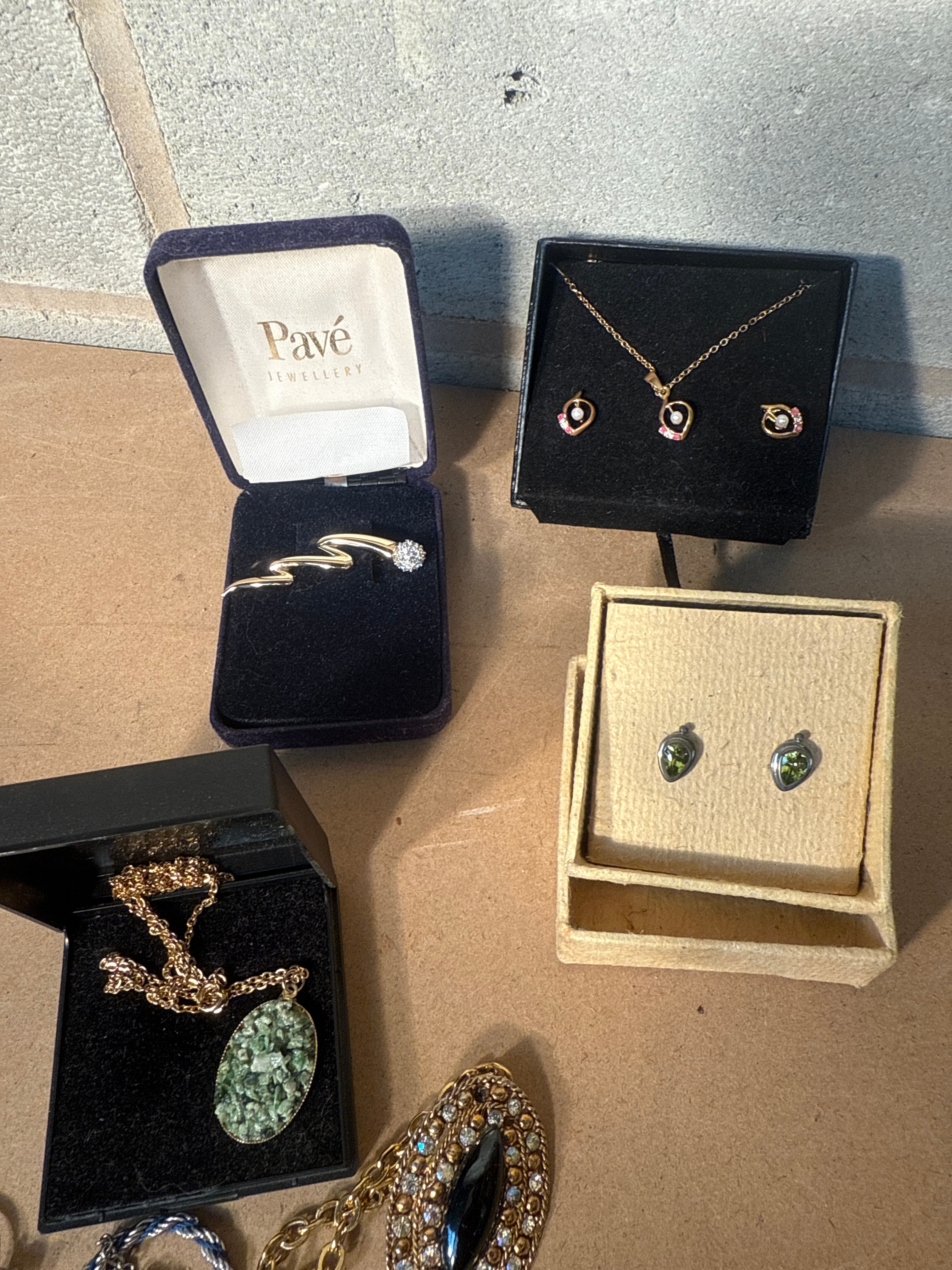 A collection of assorted costume jewelry, prominently featuring a gold-tone necklace with a green jade-like pendant, consistent with ‘Vintage Gold Tone Jade Pendant Necklace’ as identified by web intelligence. The collection includes various necklaces, rings, stud and drop earrings, and brooches, crafted from apparent gold-tone and silver-tone metals. Decorative elements feature diverse imitation stones such as faceted green, pink, and iridescent gems, alongside cabochon black and blue stones, faux pearls, and enamel on cameo pendants. Items are presented both in original boxes and as a loose, tangled grouping. Visible branding includes “Pavé JEWELLERY” on a blue velvet box containing a ring, and “SHEILA” on a decorative pen-like object. A clear and gold box is marked “GENUINE TIGER EYE” but contains a gold-tone brooch with a pearl.