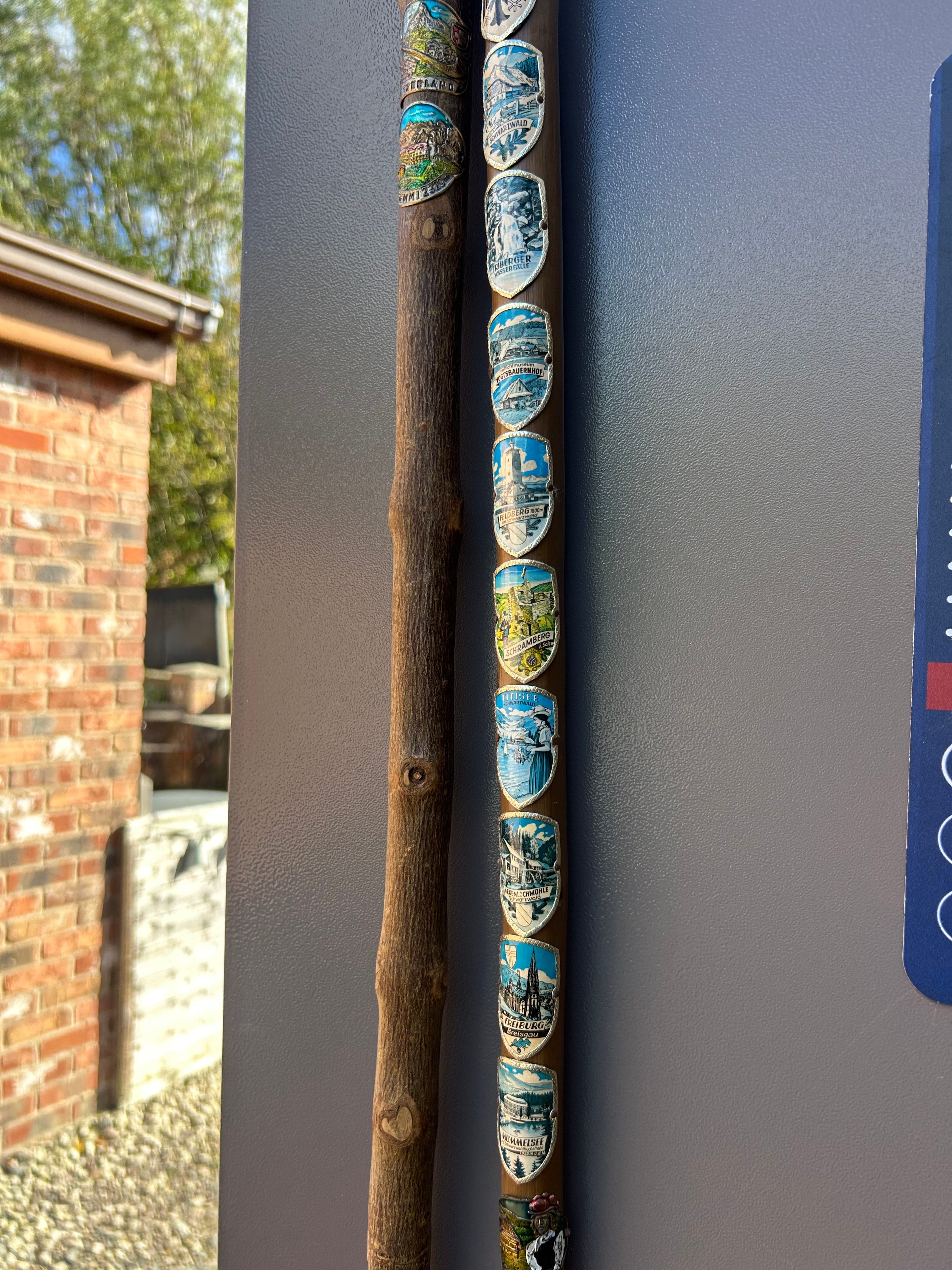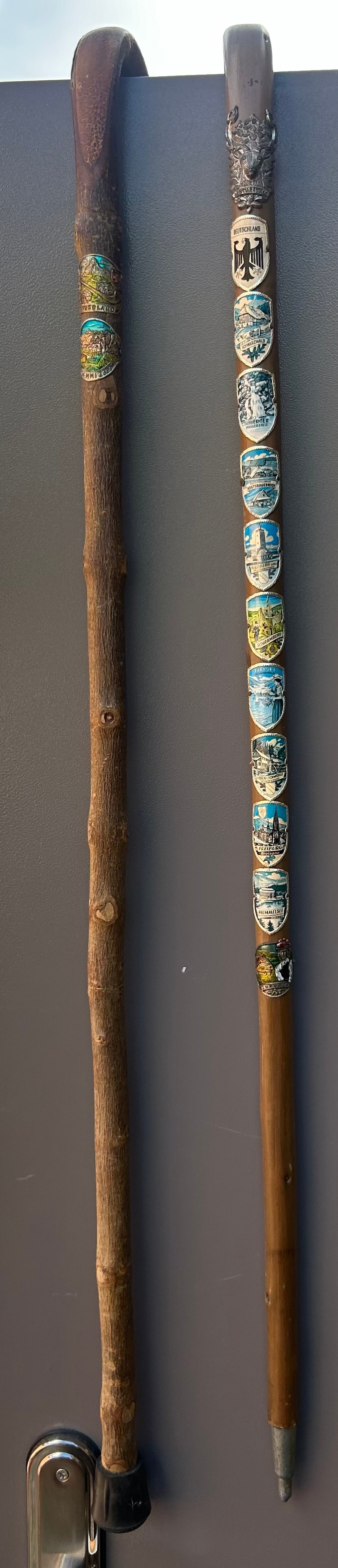 A pair of vintage German souvenir walking sticks. The staff on the left features a natural, gnarled wooden shaft and a leather loop handle, decorated with several colored metal souvenir badges, one of which reads “RHEIN.” The staff on the right has a smoother wooden shaft, topped with a decorative metal fitting depicting an eagle, and fitted with a metal ferrule at its base. This staff is extensively adorned with approximately 30 enamel or painted metal badges. The uppermost badge clearly reads “DEUTSCHER WANDERVERBAND” (German Hiking Association), with many others denoting German geographical locations and cities including “BROCKEN,” “HARZ,” “RÜGEN,” “SCHWARZWALD,” “BAYERISCHE ALPEN,” “MÜNCHEN,” and “BERLIN.” Both items exhibit a traditional, souvenir-decorated style.